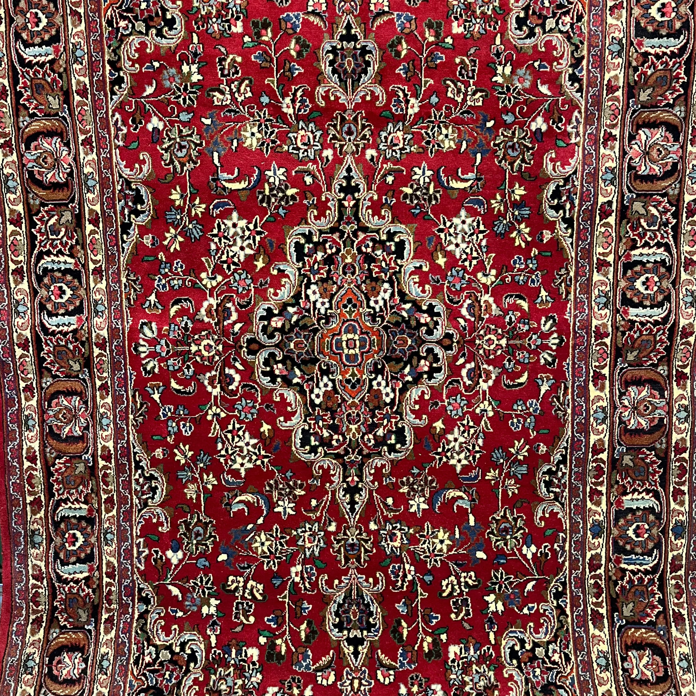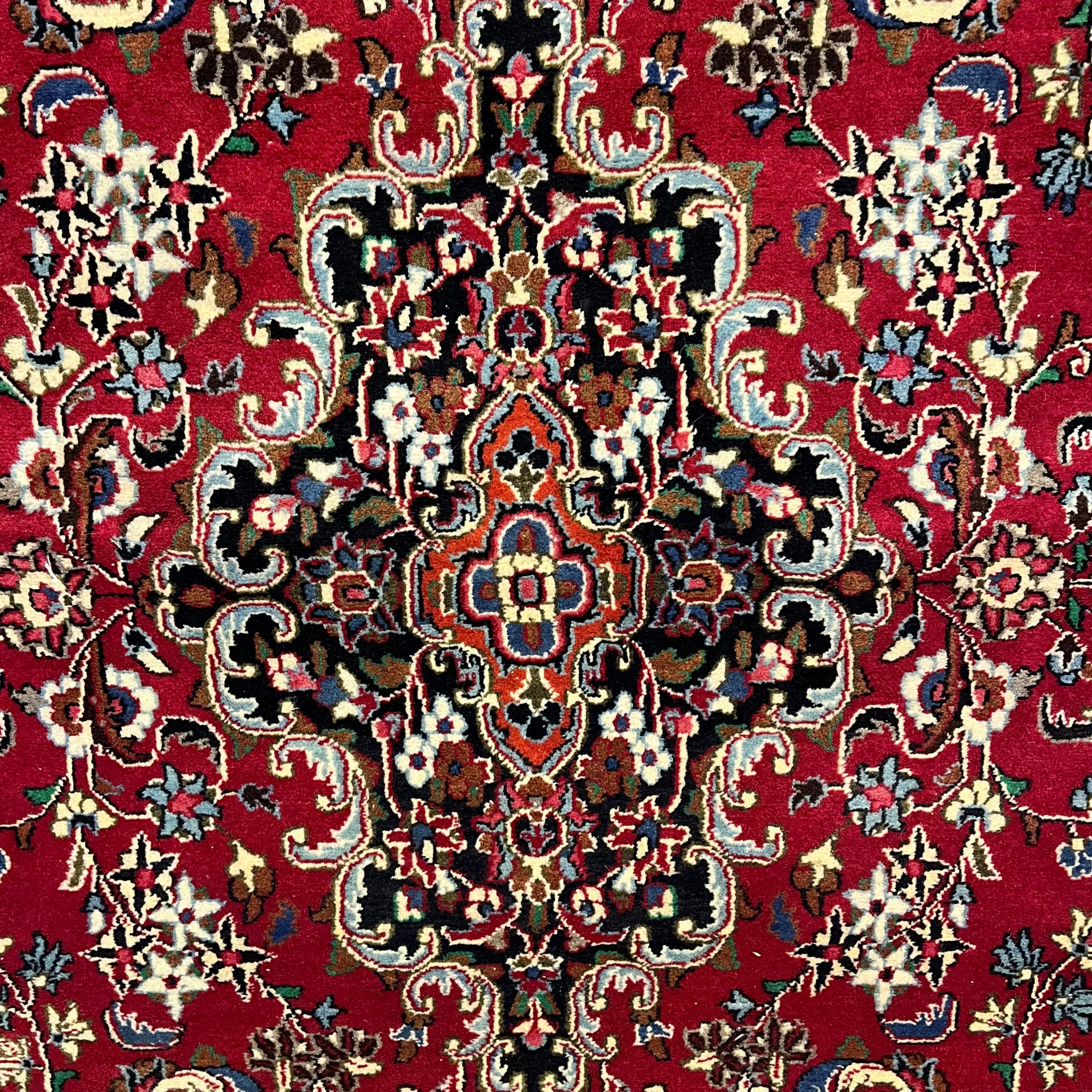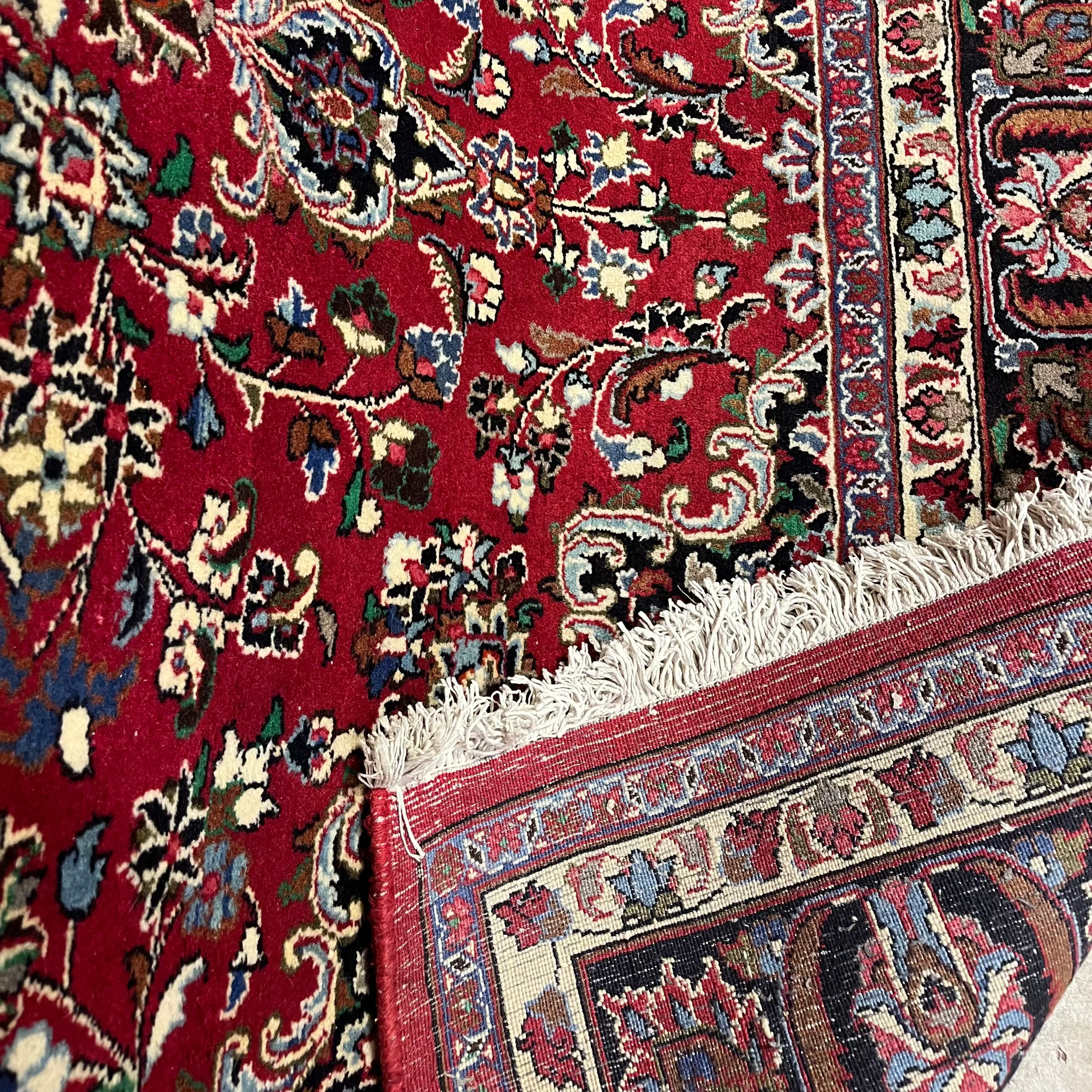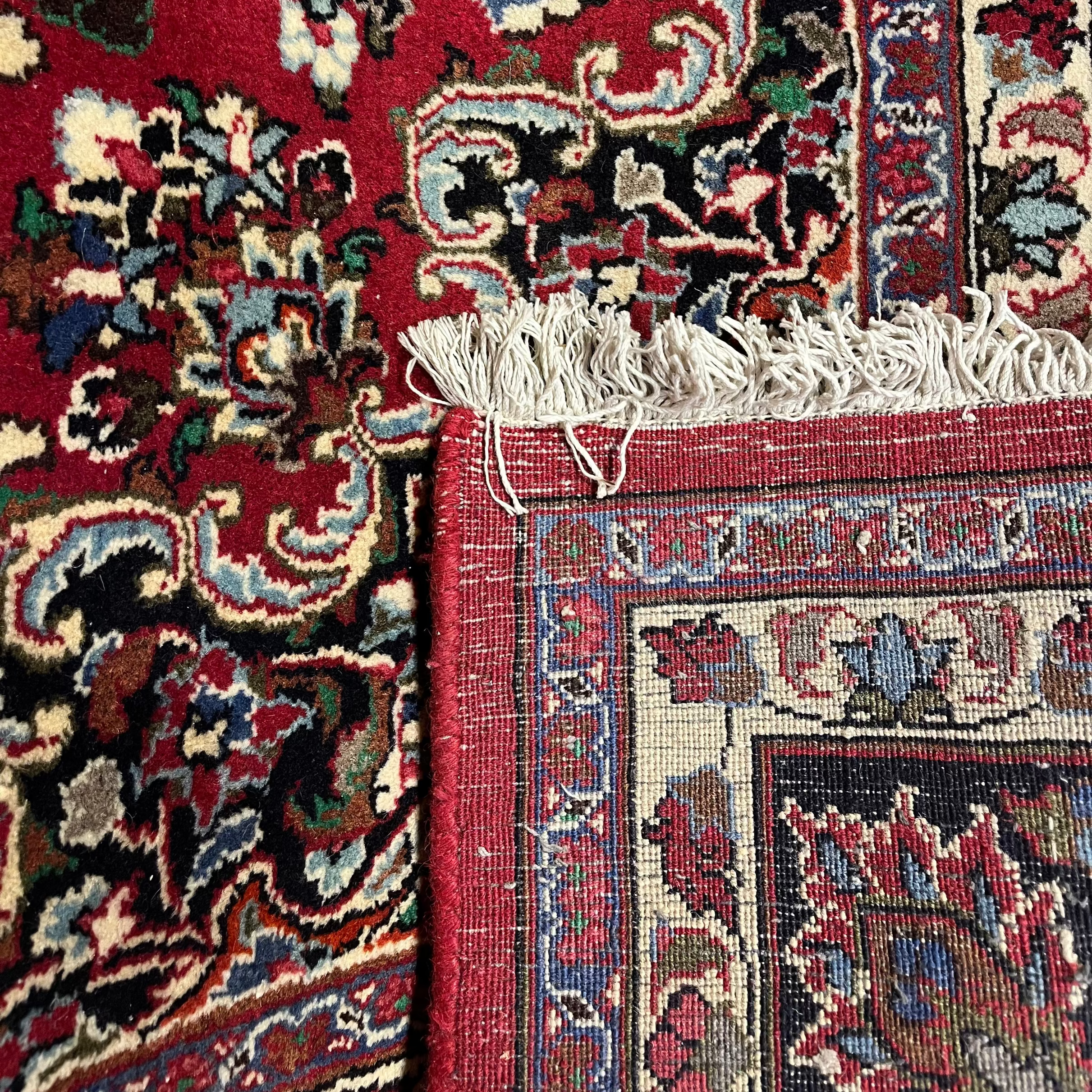 Beautiful forty-year-old Iranian Kirman rug, preserved in excellent condition. It features a traditional design with a large central medallion surrounded by combinations of reddish and deep navy blue tones. Handmade.