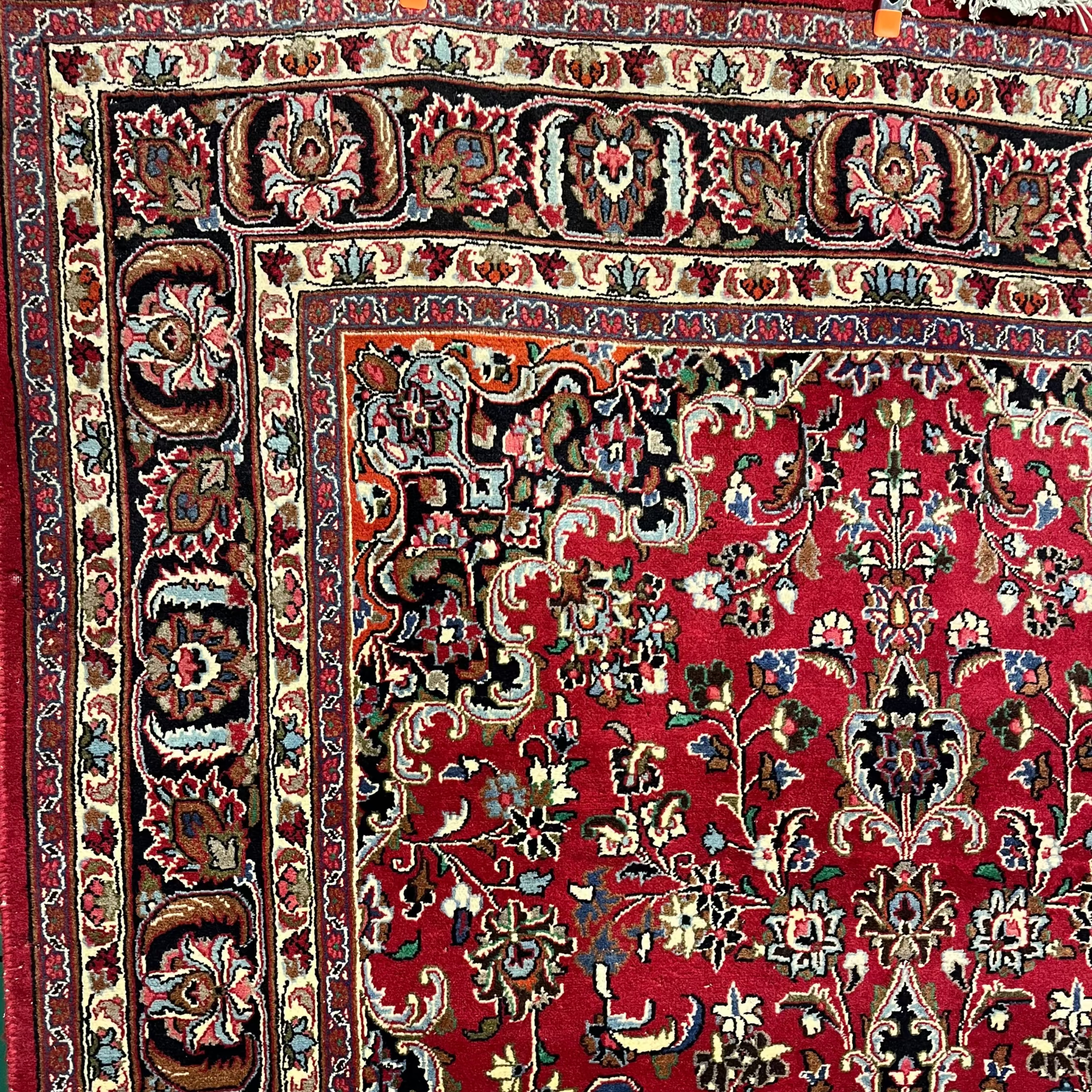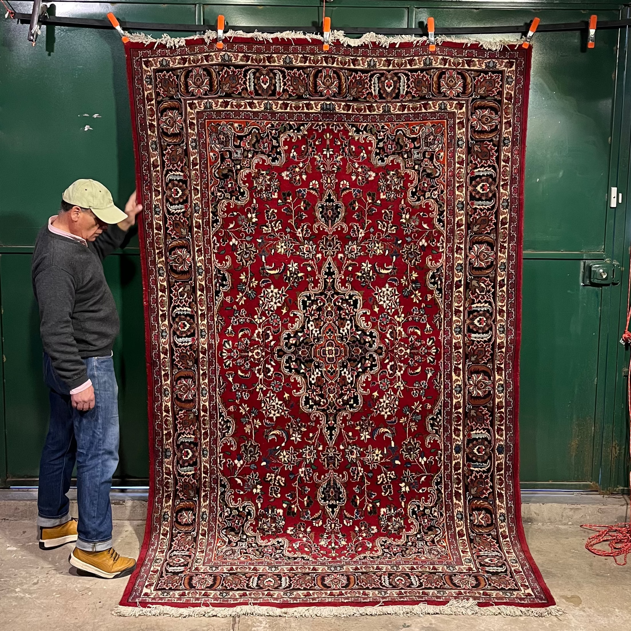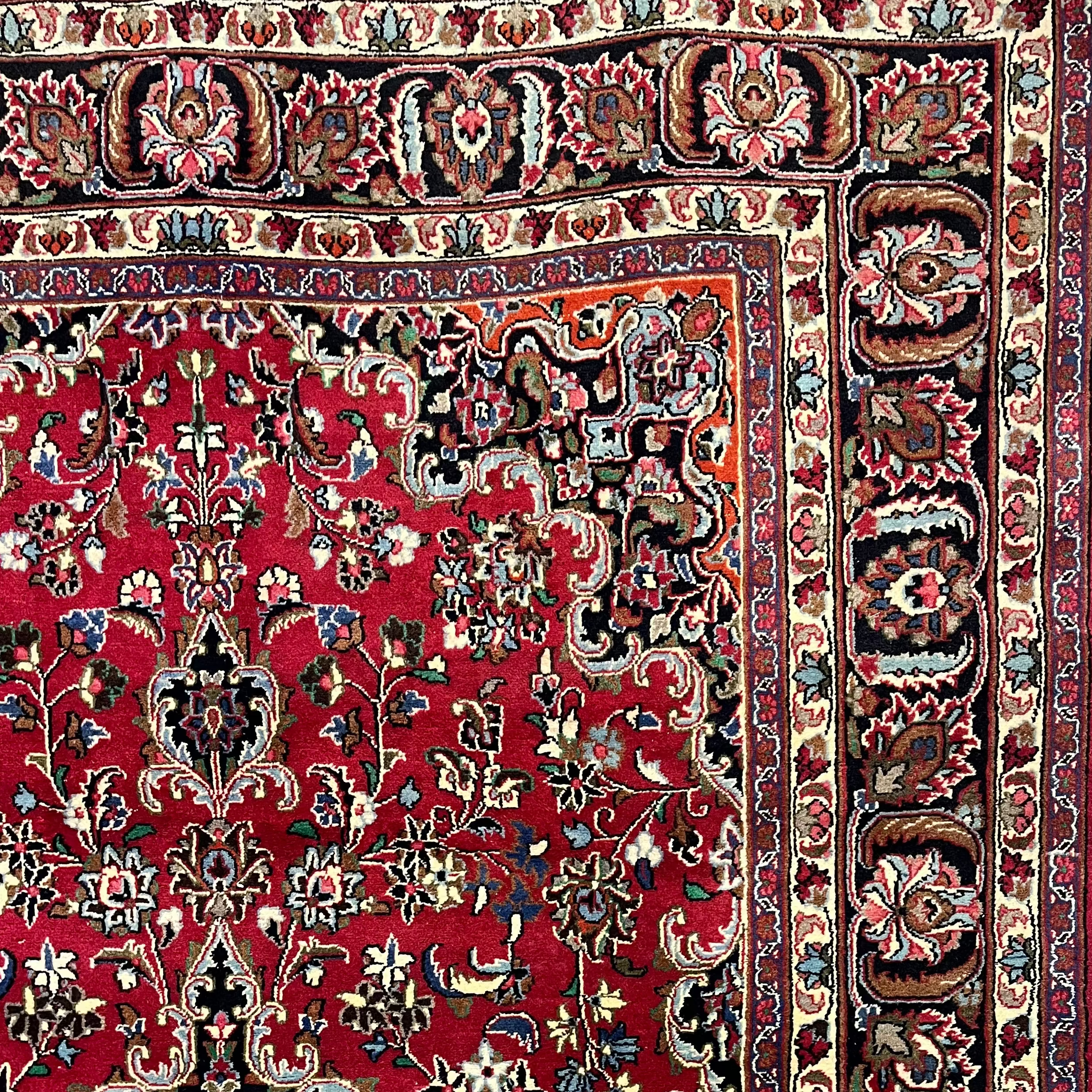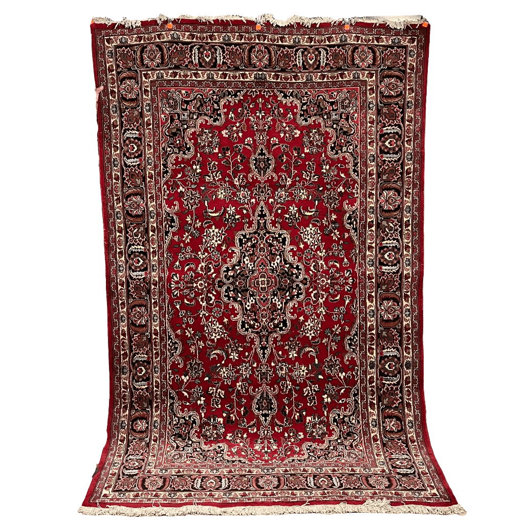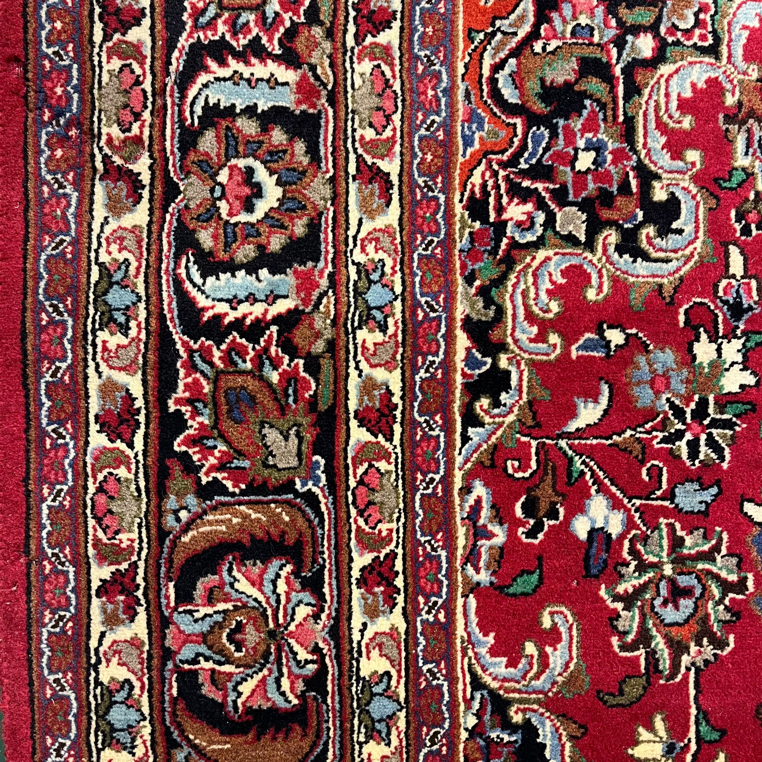 Beautiful forty-year-old Iranian Kirman rug, preserved in excellent condition. It features a traditional design with a large central medallion surrounded by combinations of reddish and deep navy blue tones. Handmade.