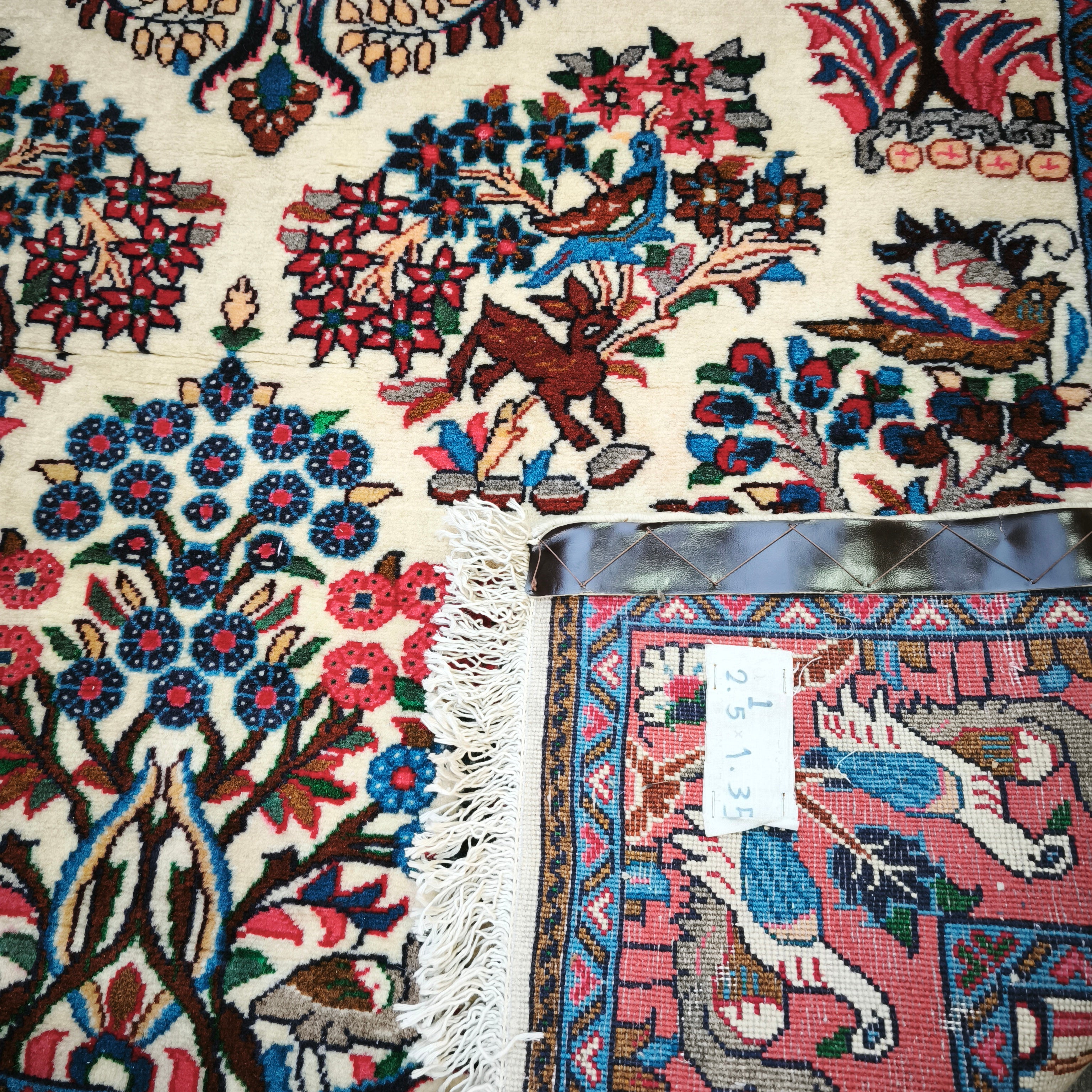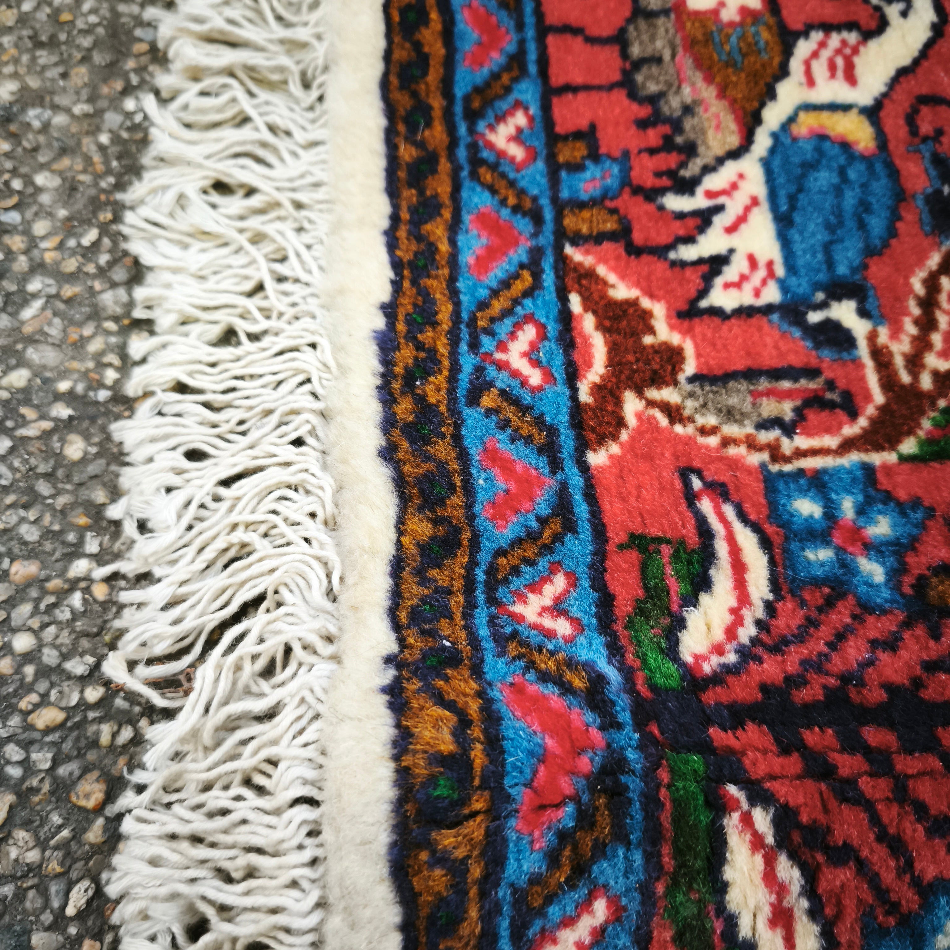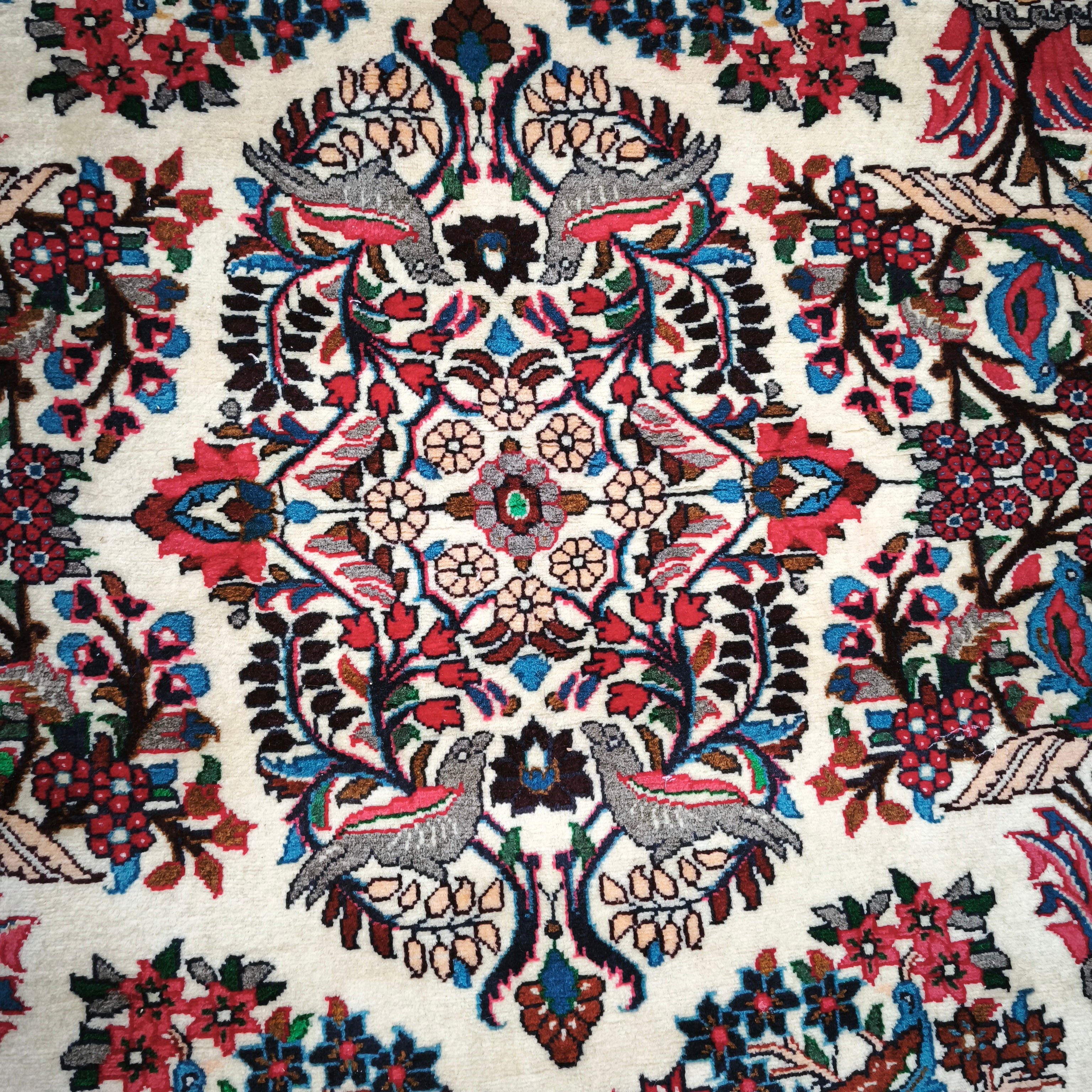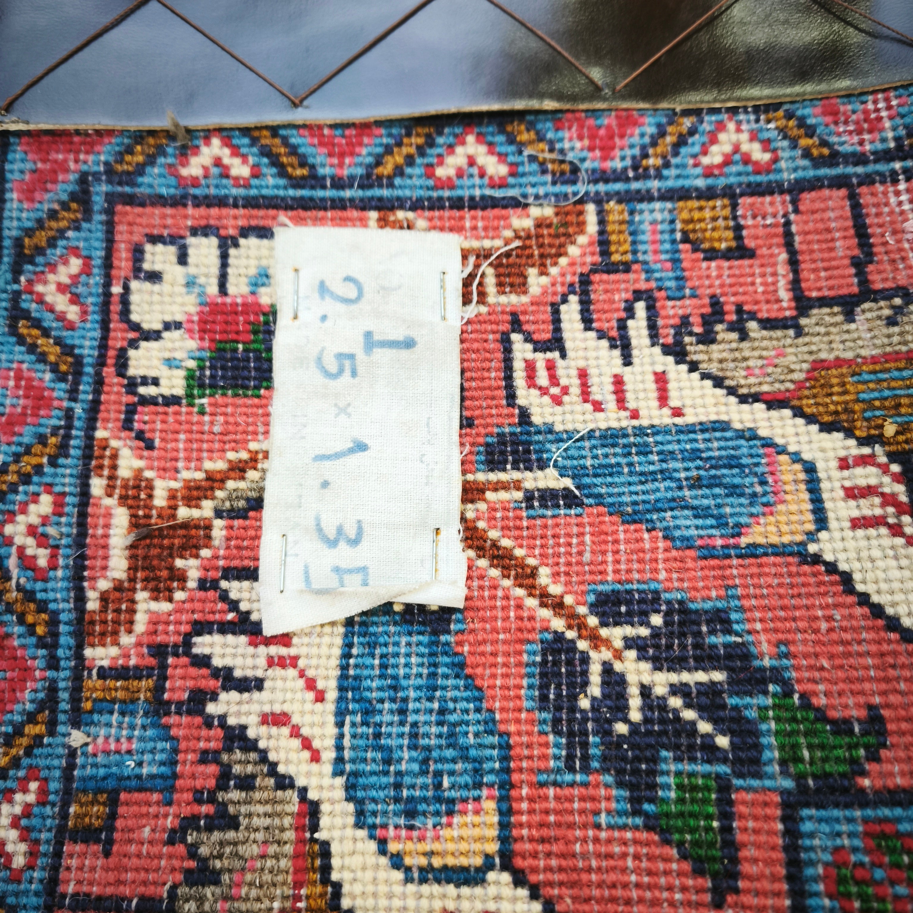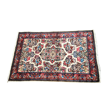Beautiful hand-knotted rug with a floral design and classic-style strokes on a white background that highlight the red and blue tones.