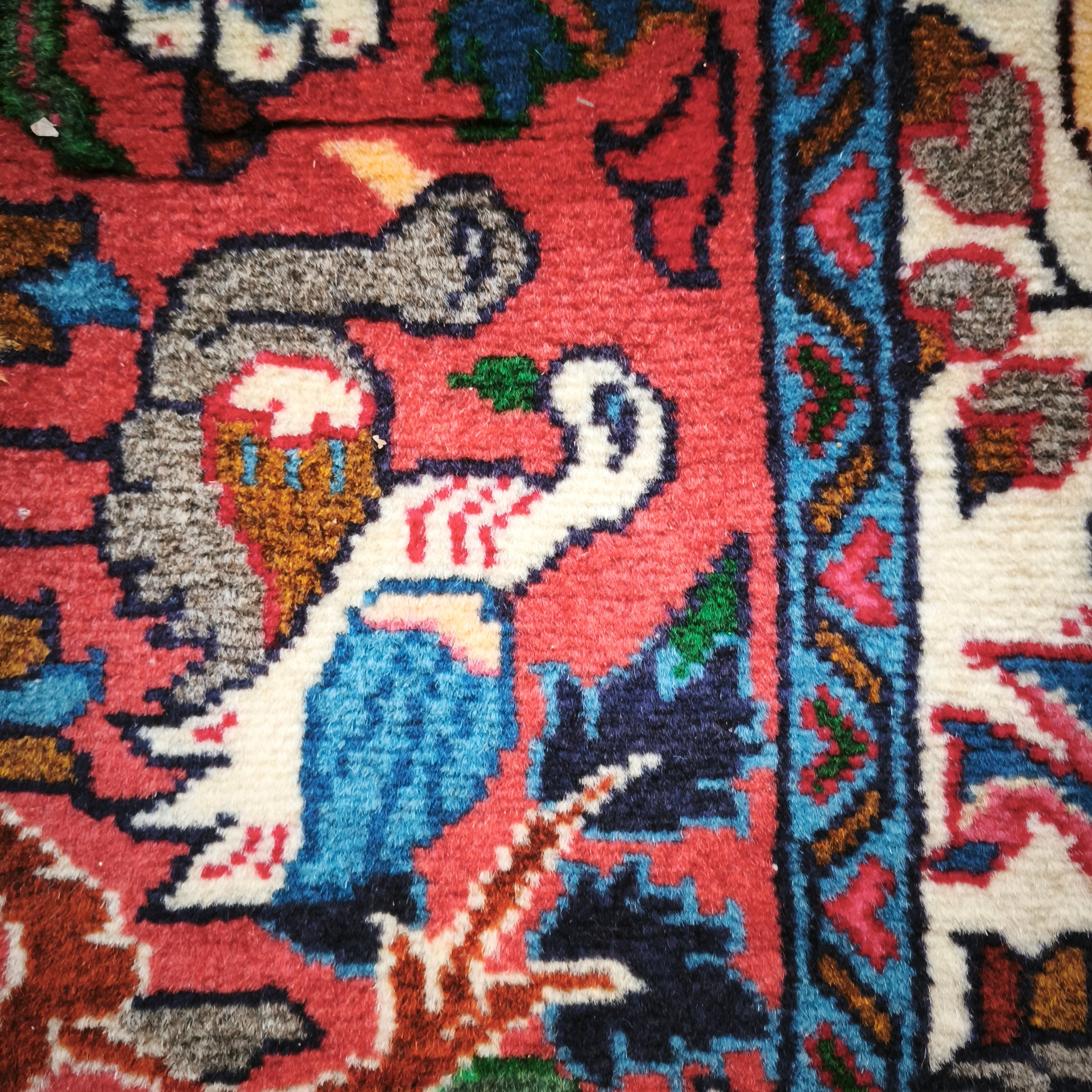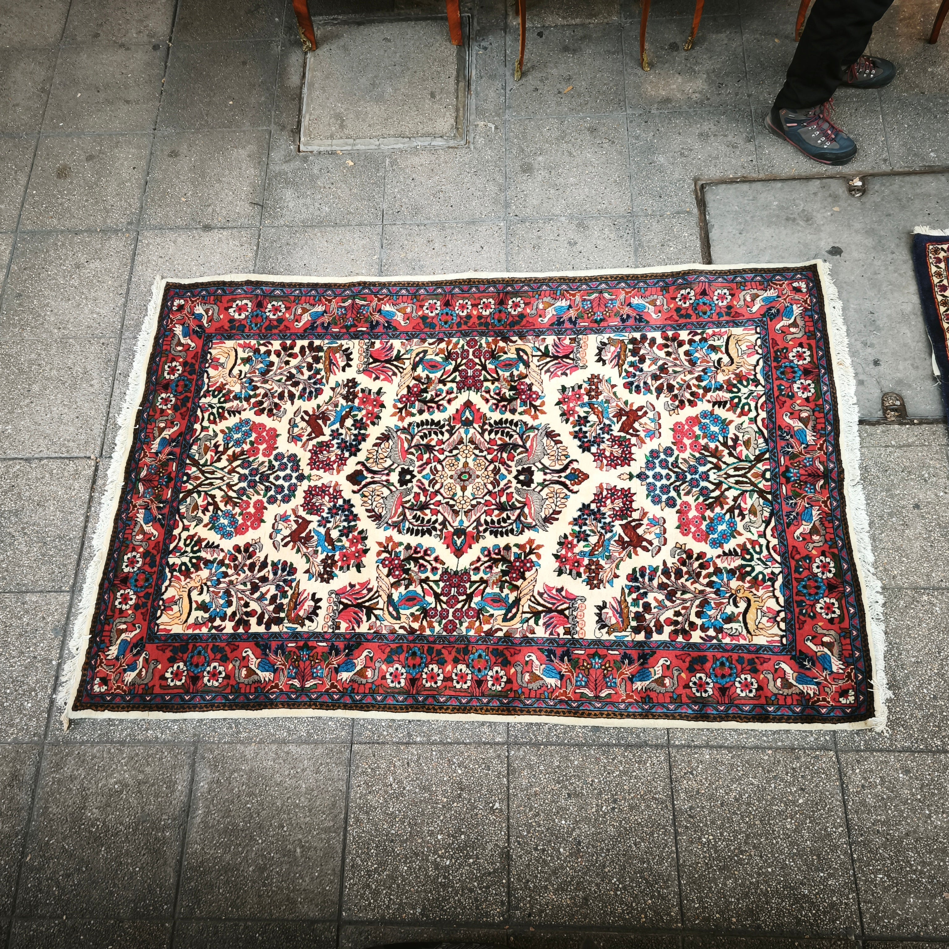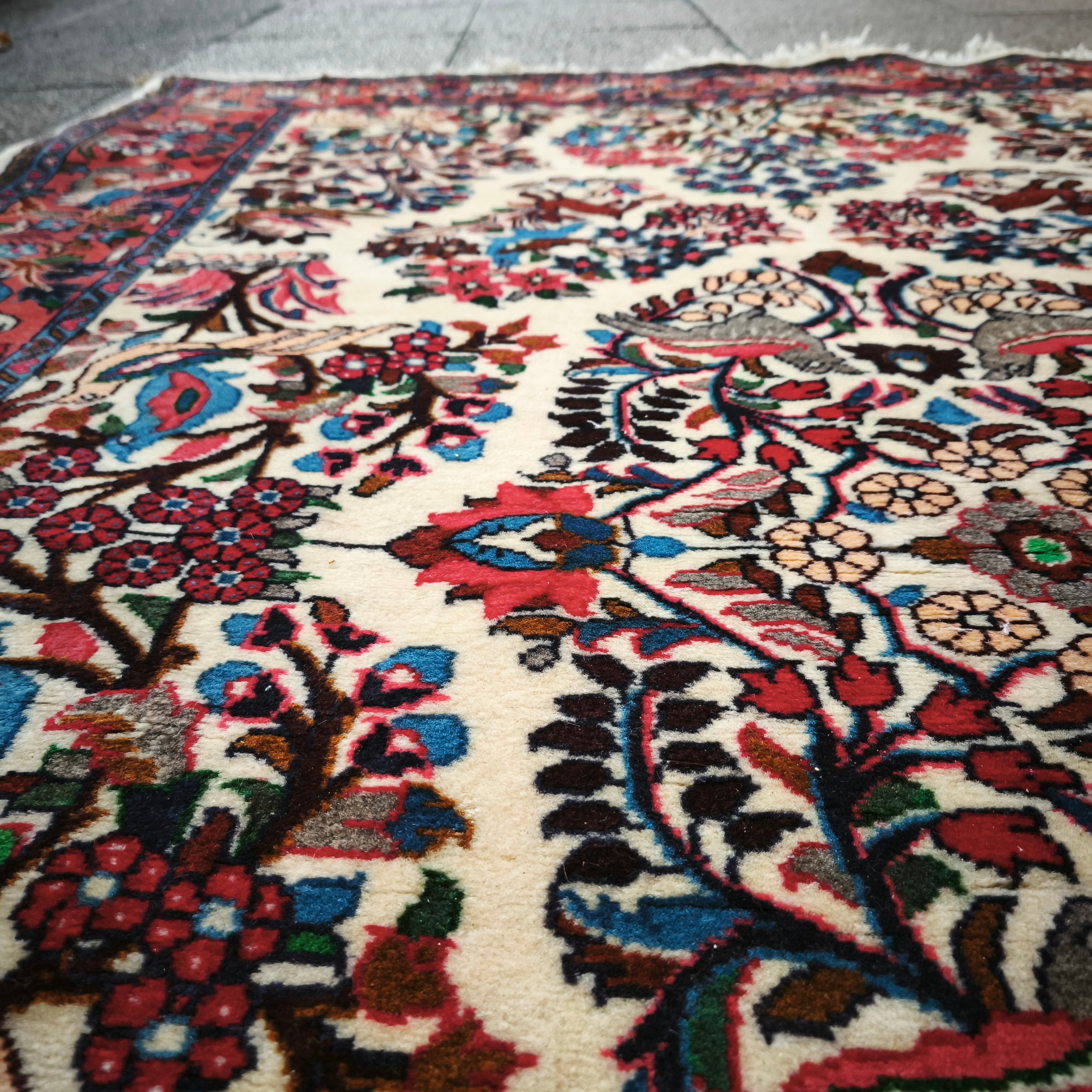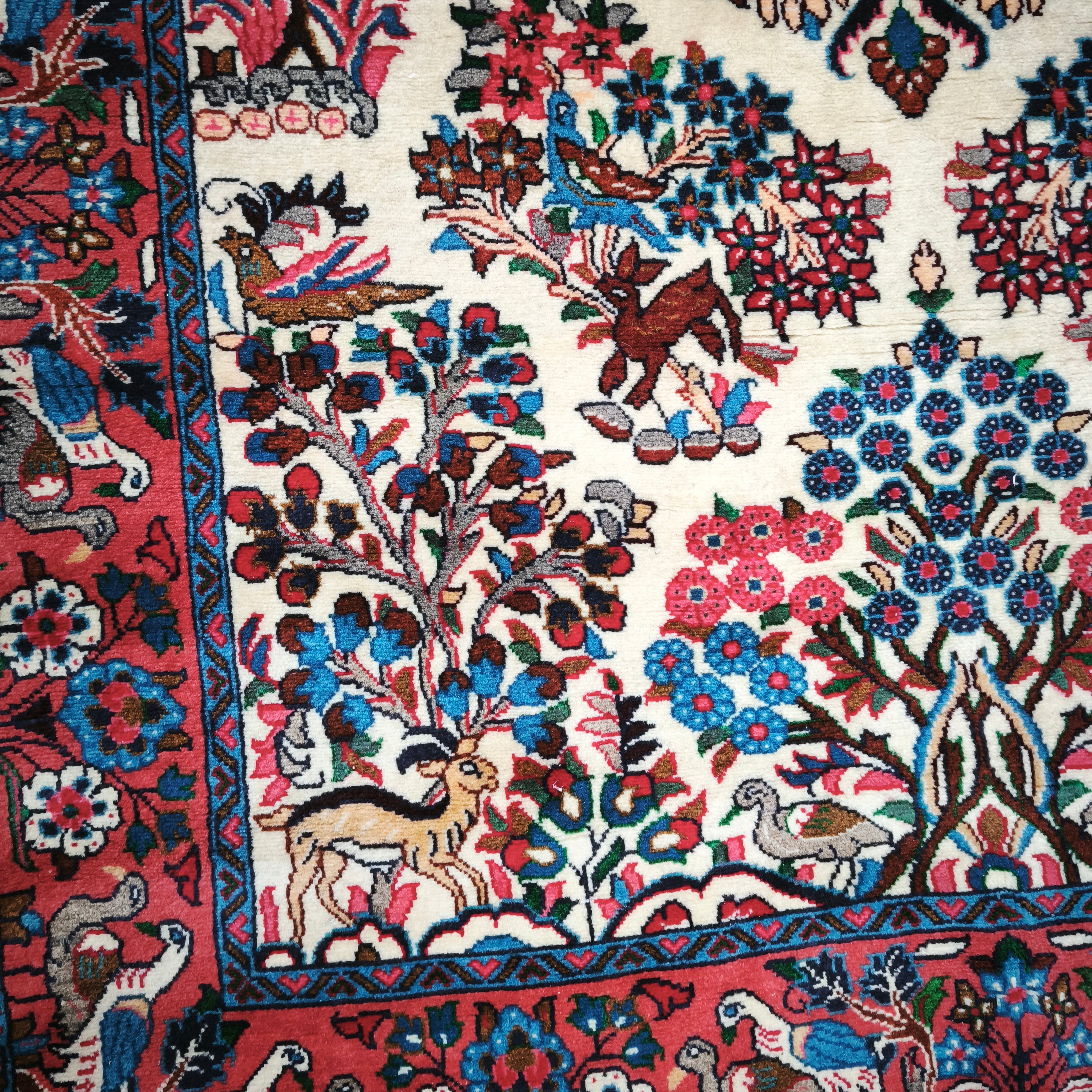 Beautiful hand-knotted rug with a floral design and classic-style strokes on a white background that highlight the red and blue tones.