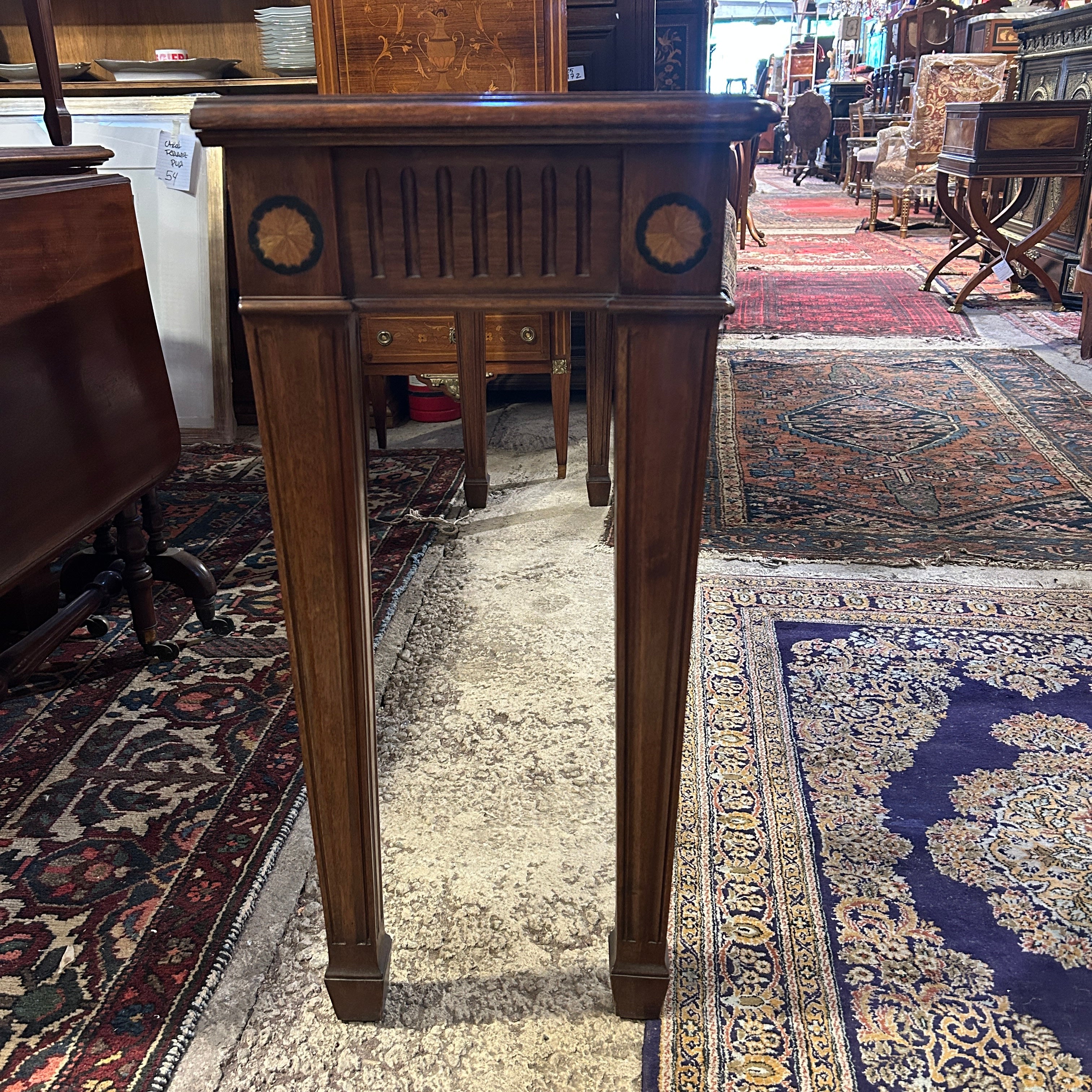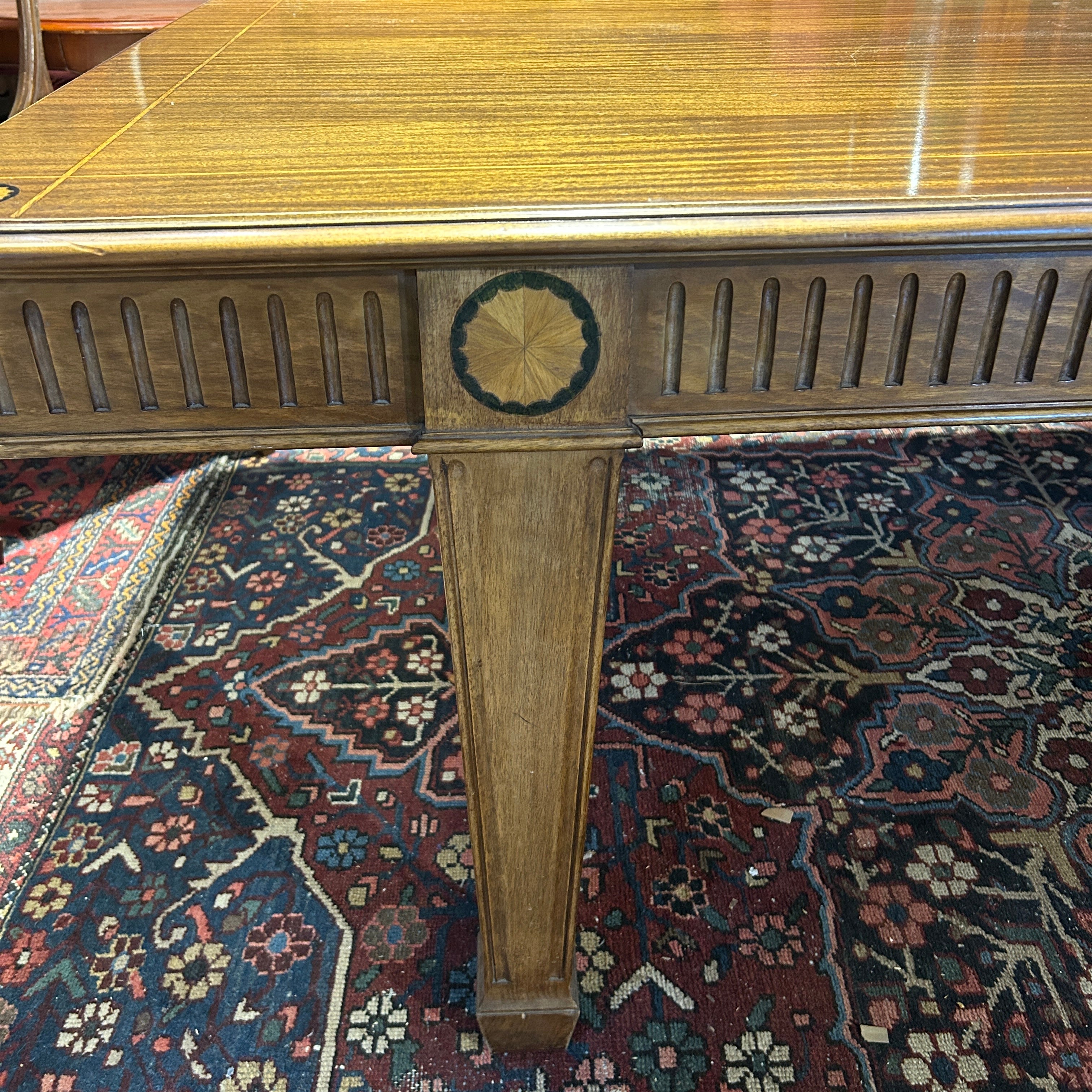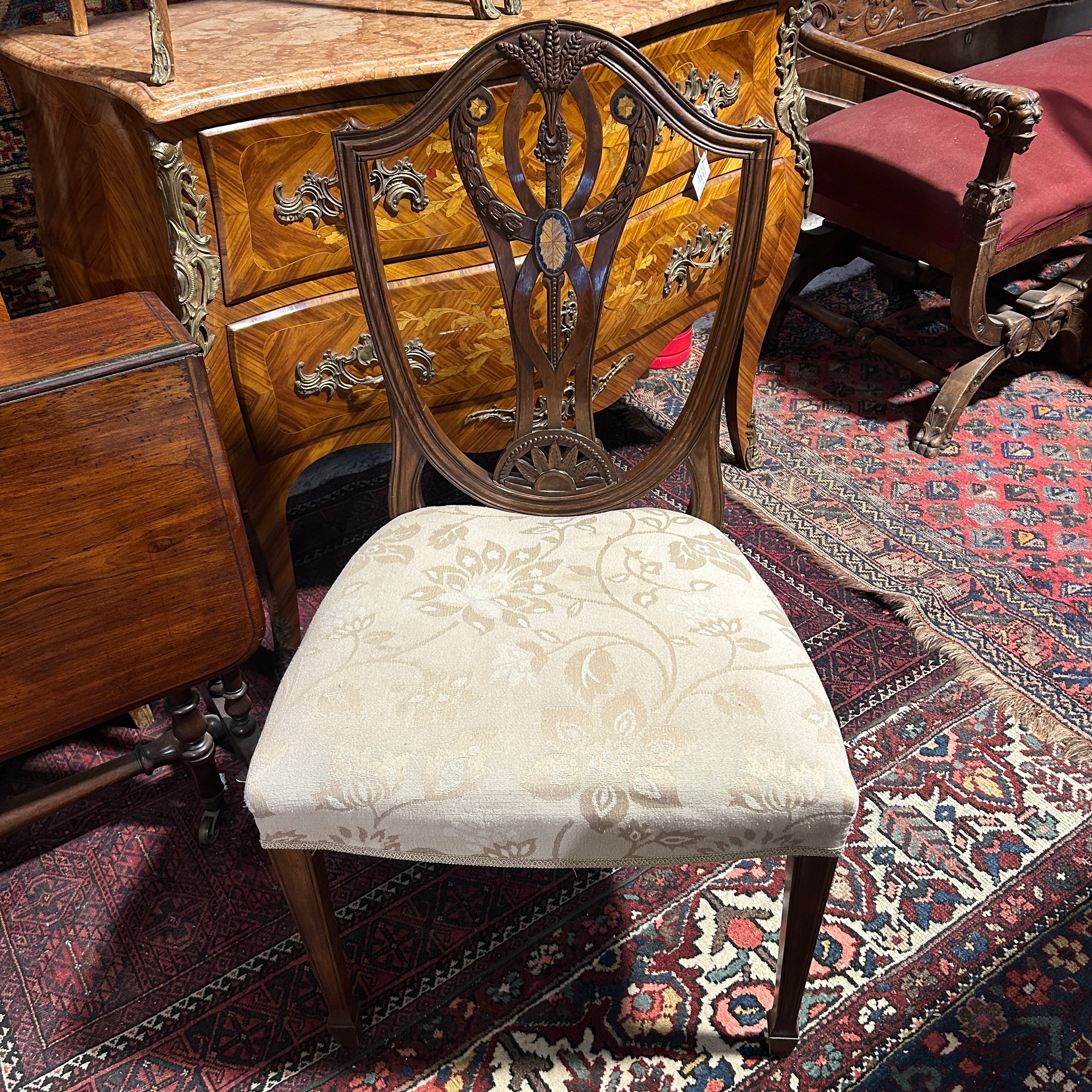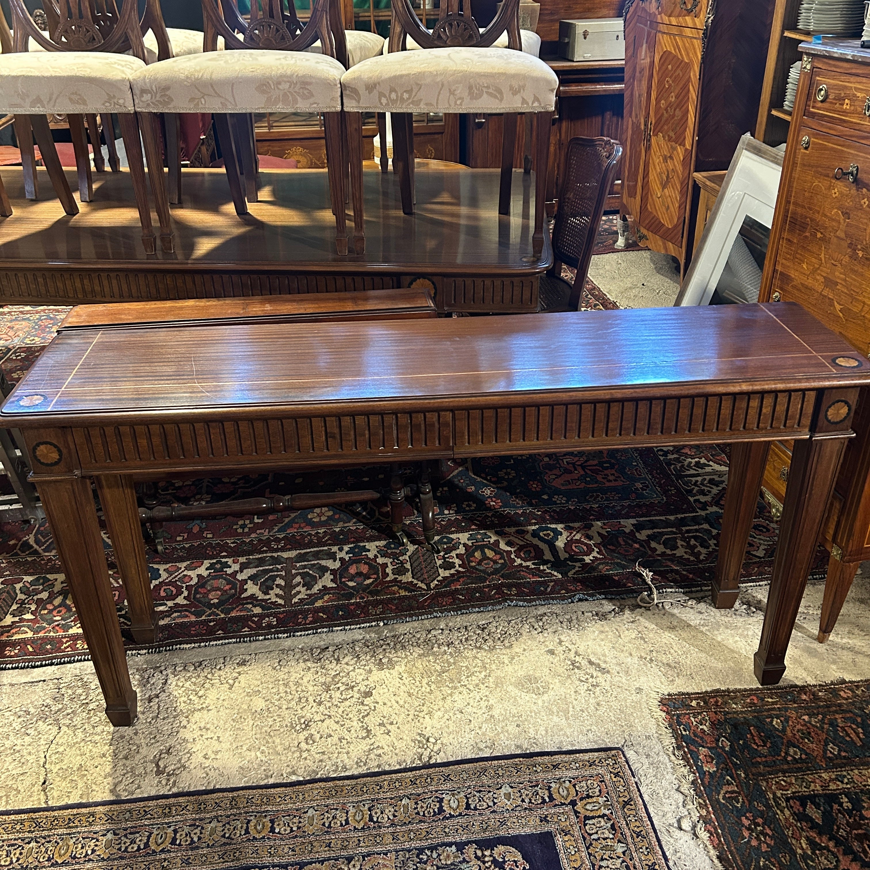 Bello amoblado compuesto de amplia mesa de comedor estilo inglés, Hepplwhite, en caoba rubia satinada, barniz original, con filetes y marqueteria, tallado a mano. Trae ocho sillas con respaldo tallado y asiento tapizado en tono crudo y motivos florales y además una mesa arrimo estilo inglés, Hepplwhite, en caoba satinada con dos amplios cajones.