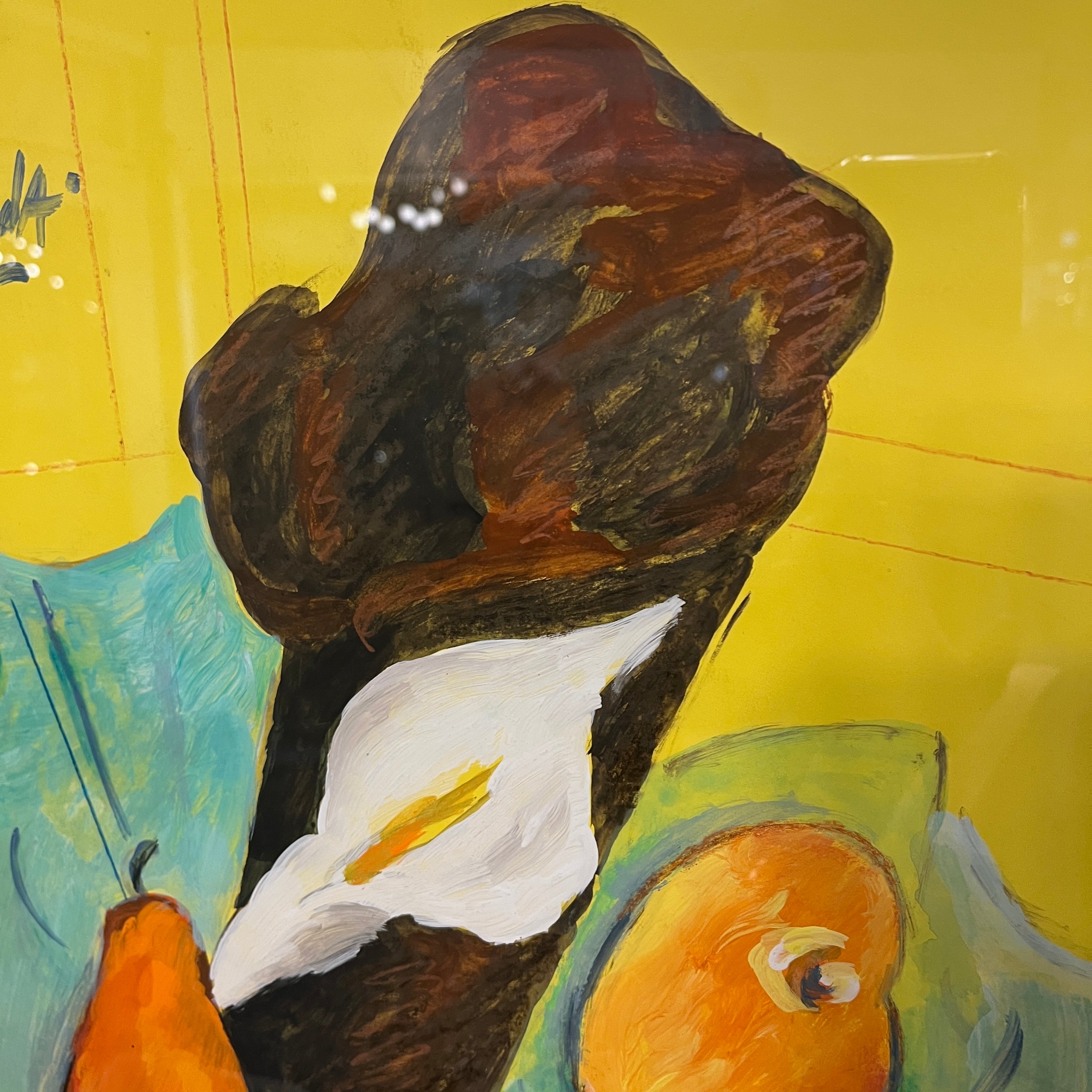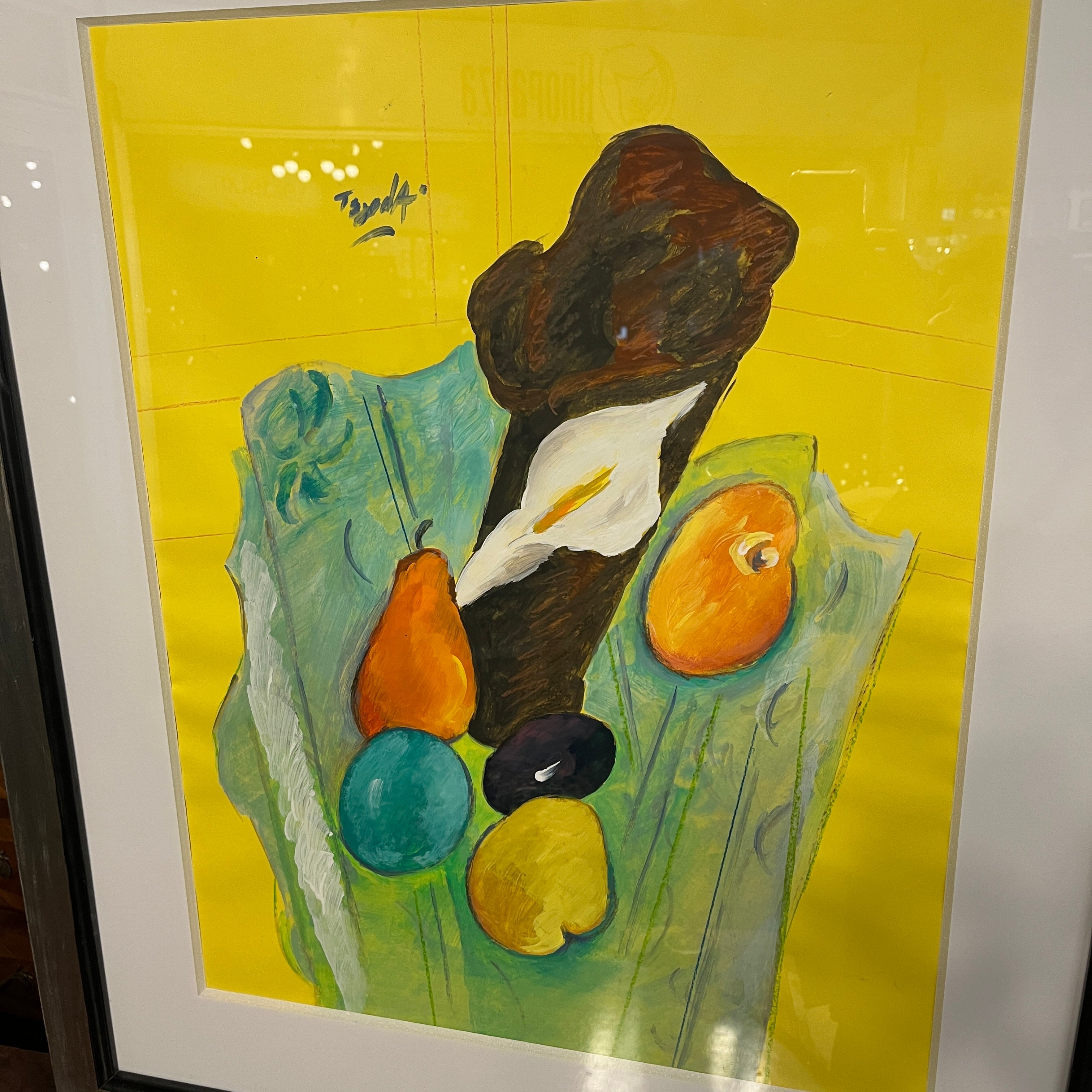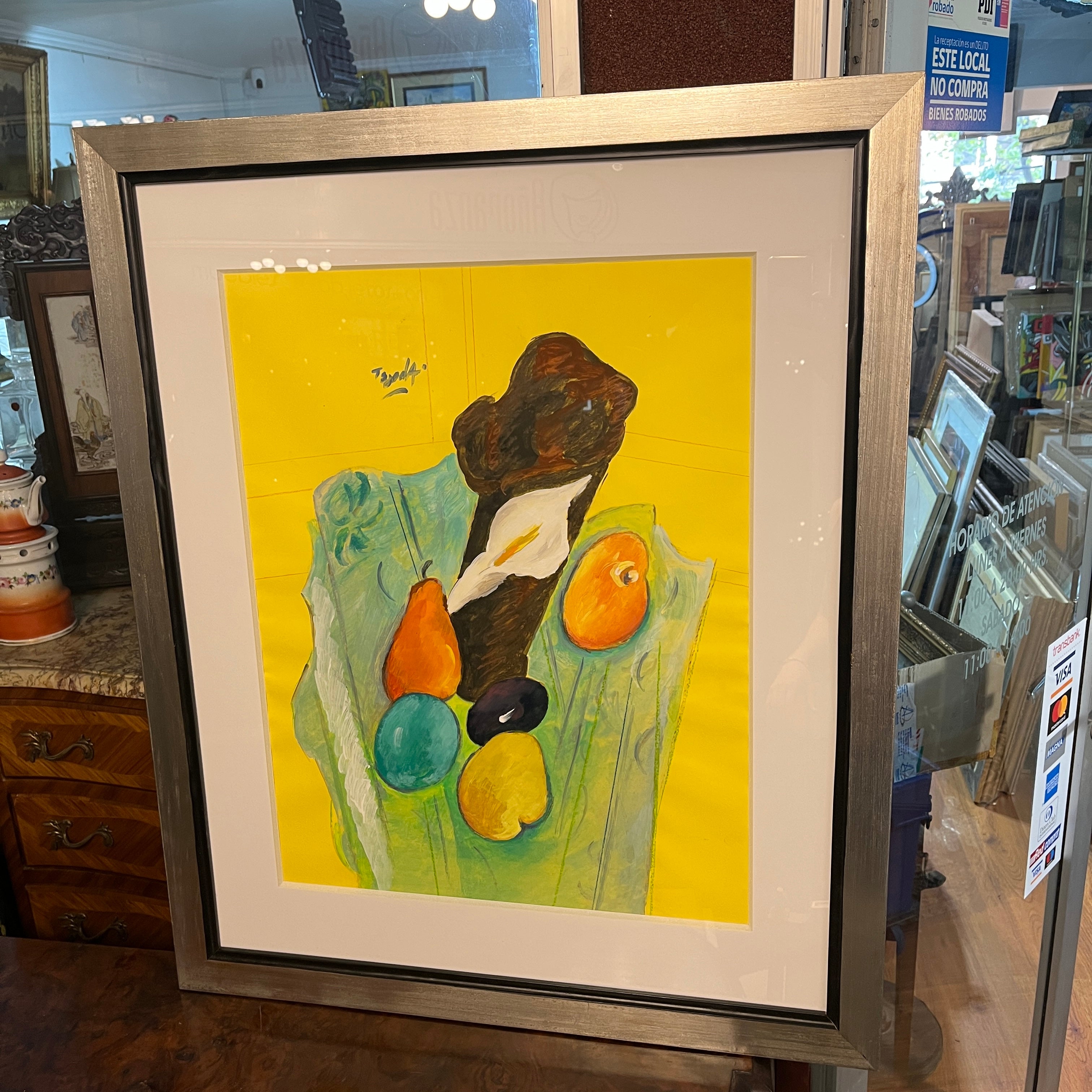 Óleo sobre papel del artista chileno Luis Tejada, representando un bodegón de frutas sobre un mantel en tonos verdes y azules, con un llamativo fondo amarillo. En el centro de la composición hay también una cala. La obra es una interpretación del artista de una temática tan tradicional en la historia del arte, como es el bodegón, dándole su característica impronta de color y geometría. Otro elemento interesante es la proyección de líneas desde el dibujo, sugiriendo una especie de boceto o estudio de perspectiva existente debajo de la pintura. La obra está enmarcada en madera, de diseño sobrio y terminación plateada.