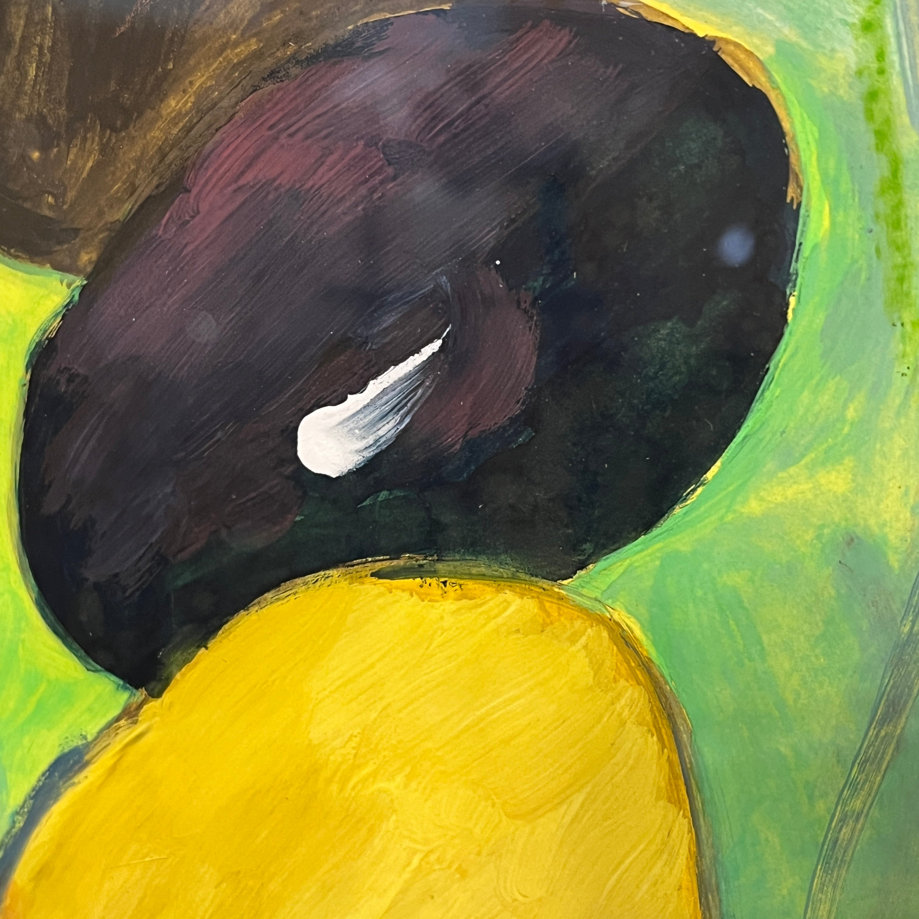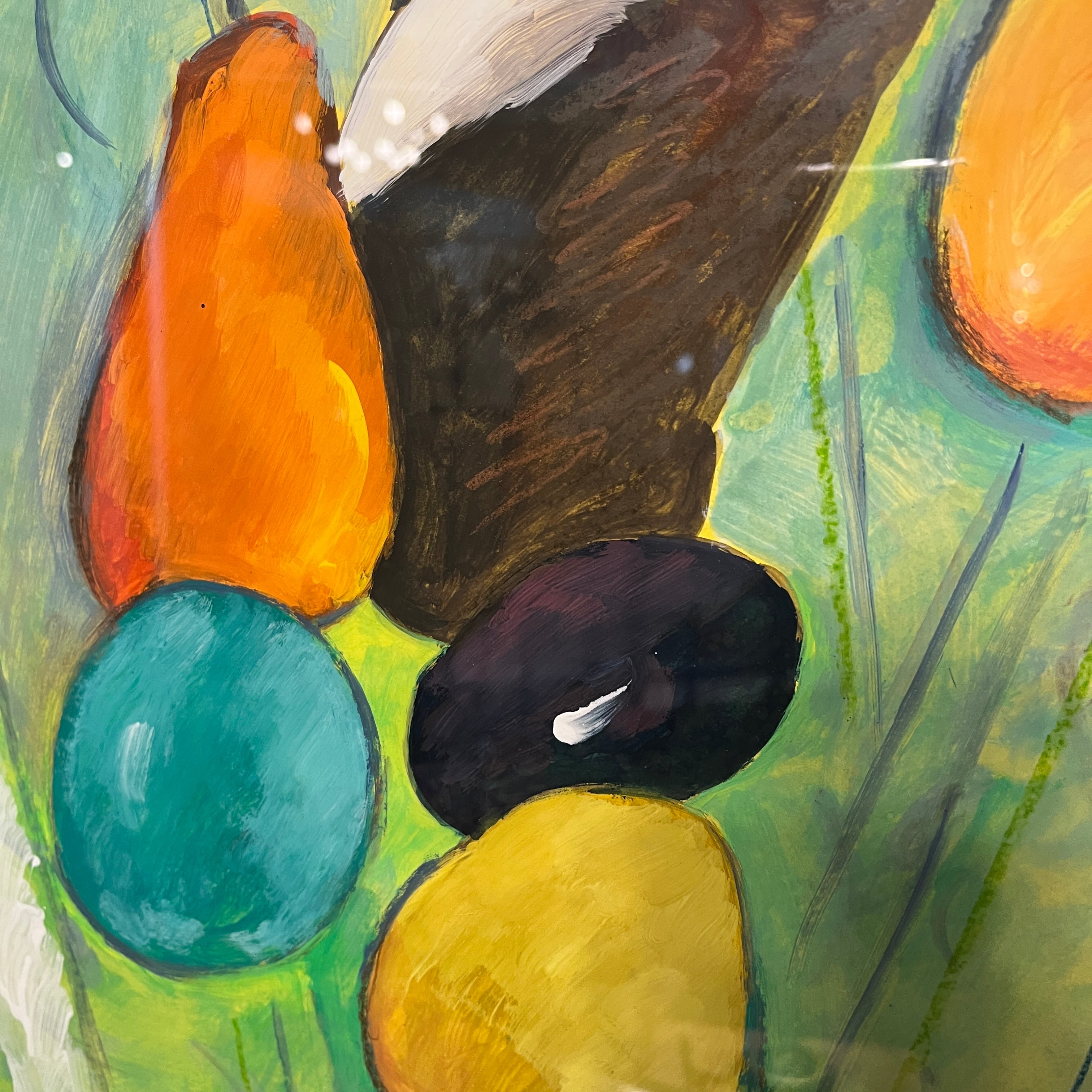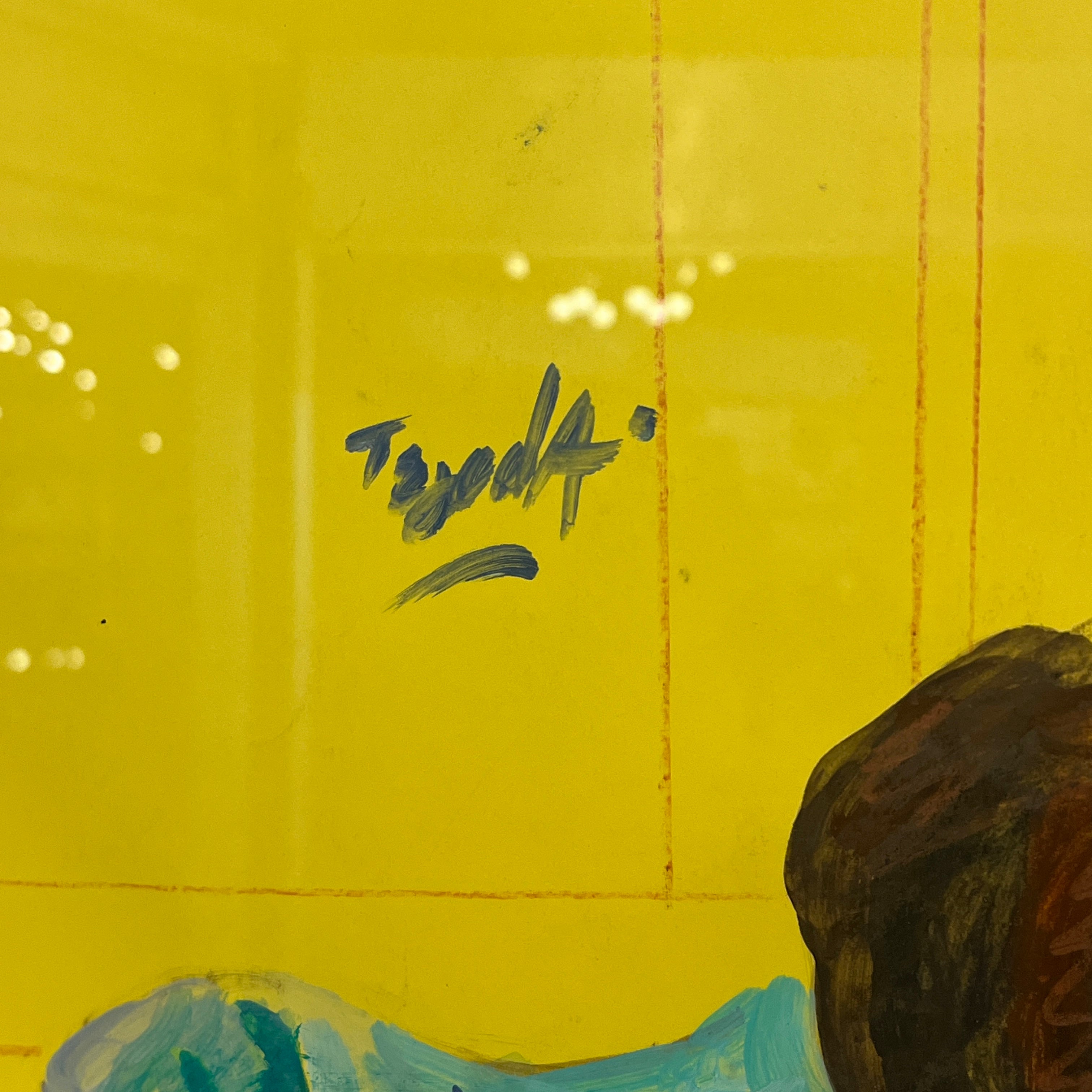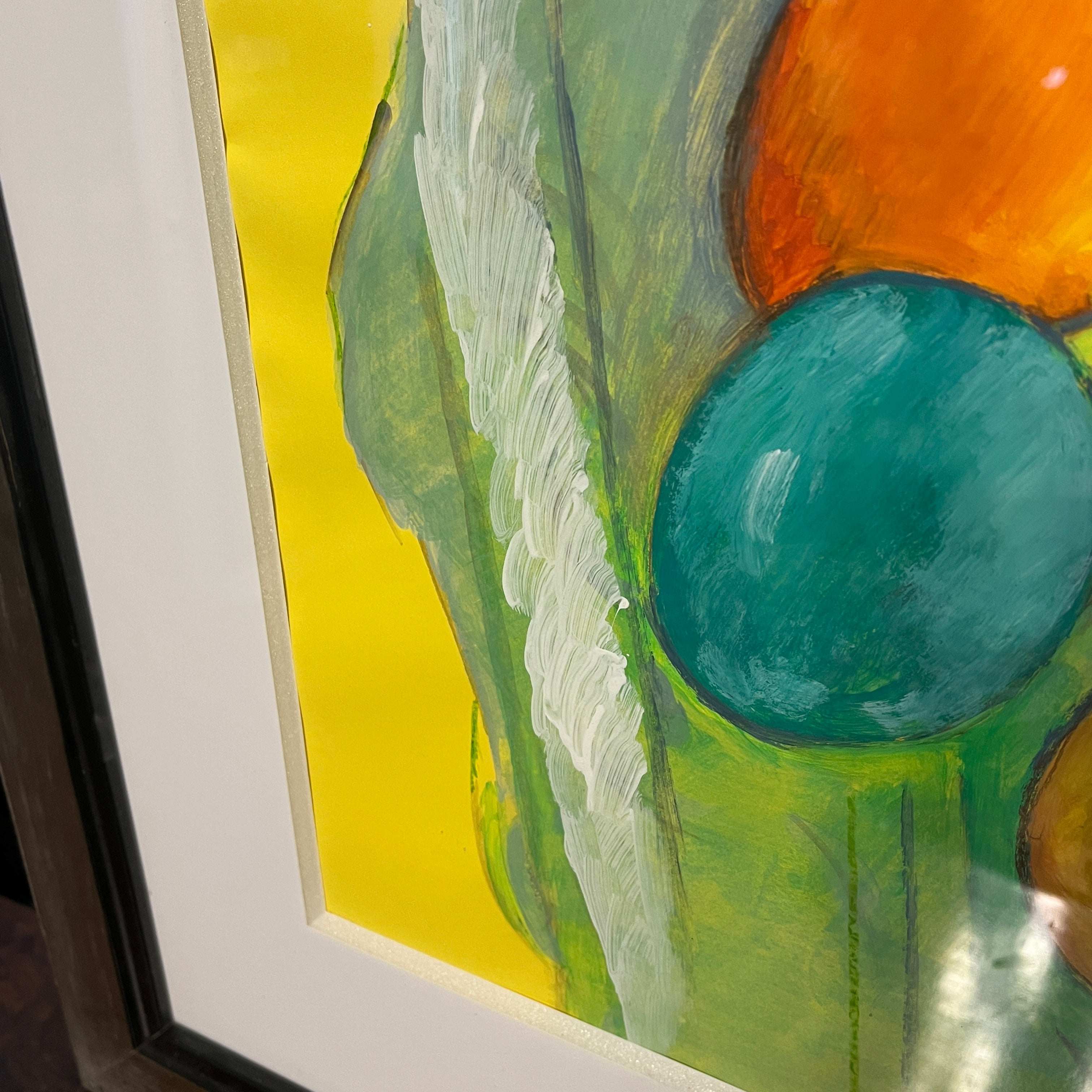 Óleo sobre papel del artista chileno Luis Tejada, representando un bodegón de frutas sobre un mantel en tonos verdes y azules, con un llamativo fondo amarillo. En el centro de la composición hay también una cala. La obra es una interpretación del artista de una temática tan tradicional en la historia del arte, como es el bodegón, dándole su característica impronta de color y geometría. Otro elemento interesante es la proyección de líneas desde el dibujo, sugiriendo una especie de boceto o estudio de perspectiva existente debajo de la pintura. La obra está enmarcada en madera, de diseño sobrio y terminación plateada.