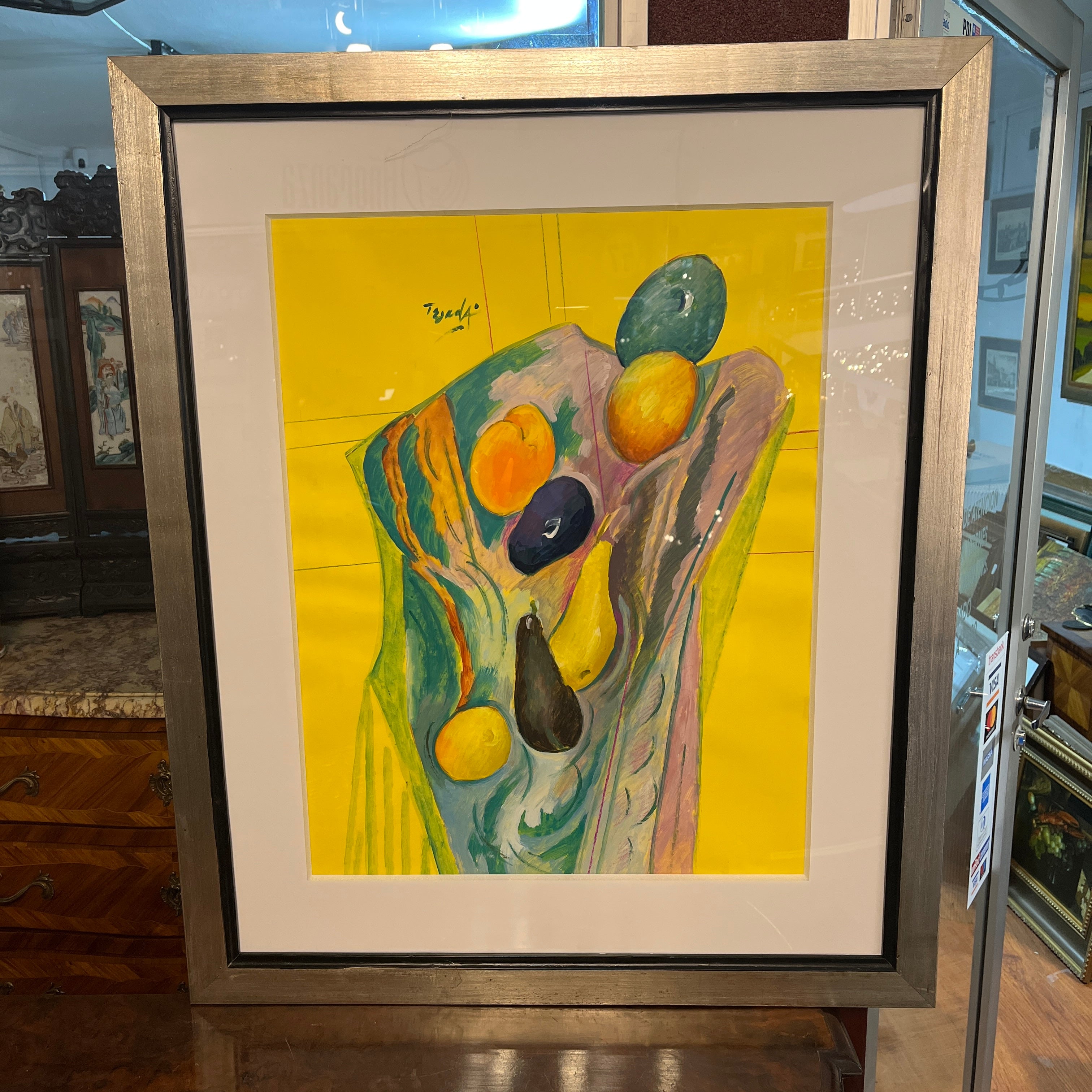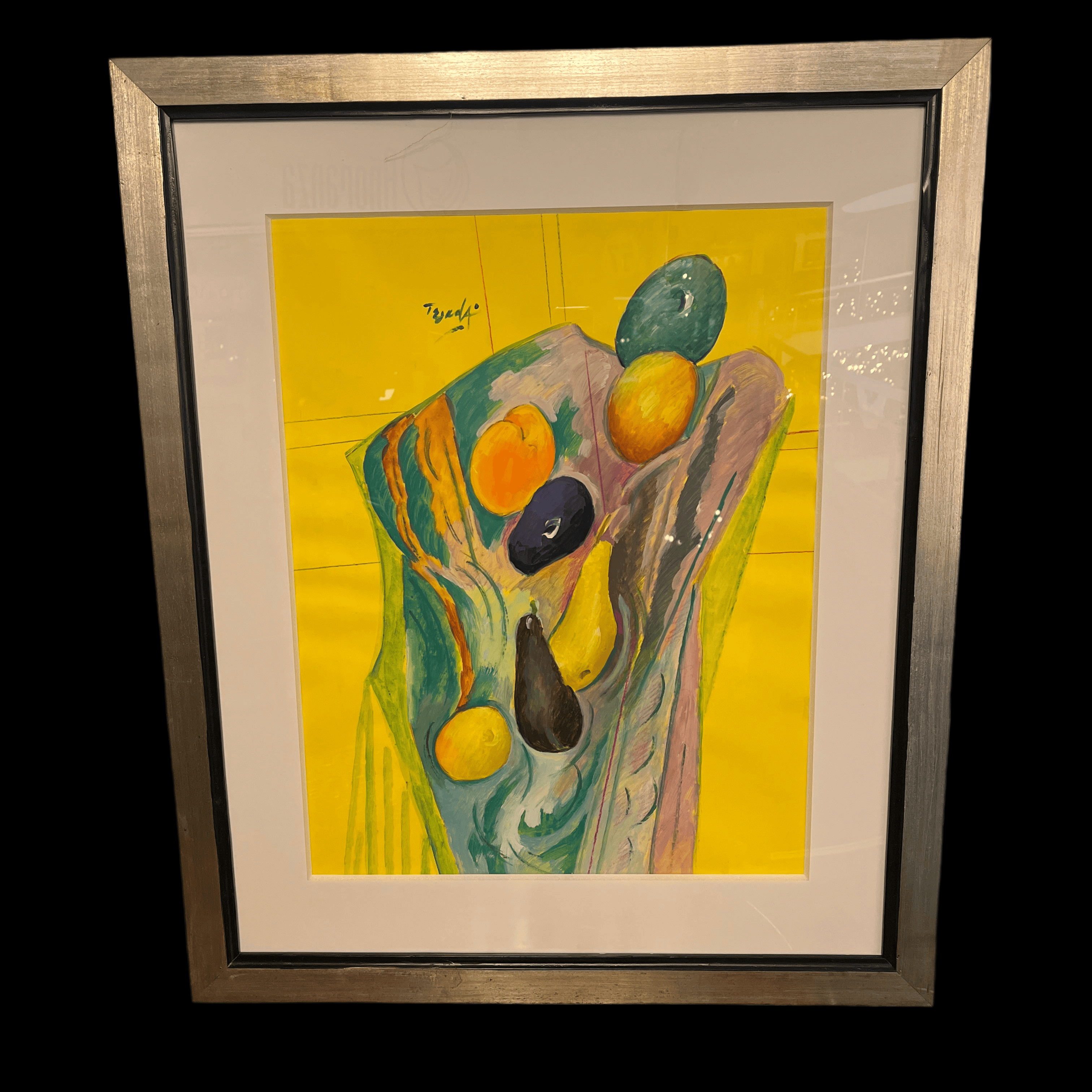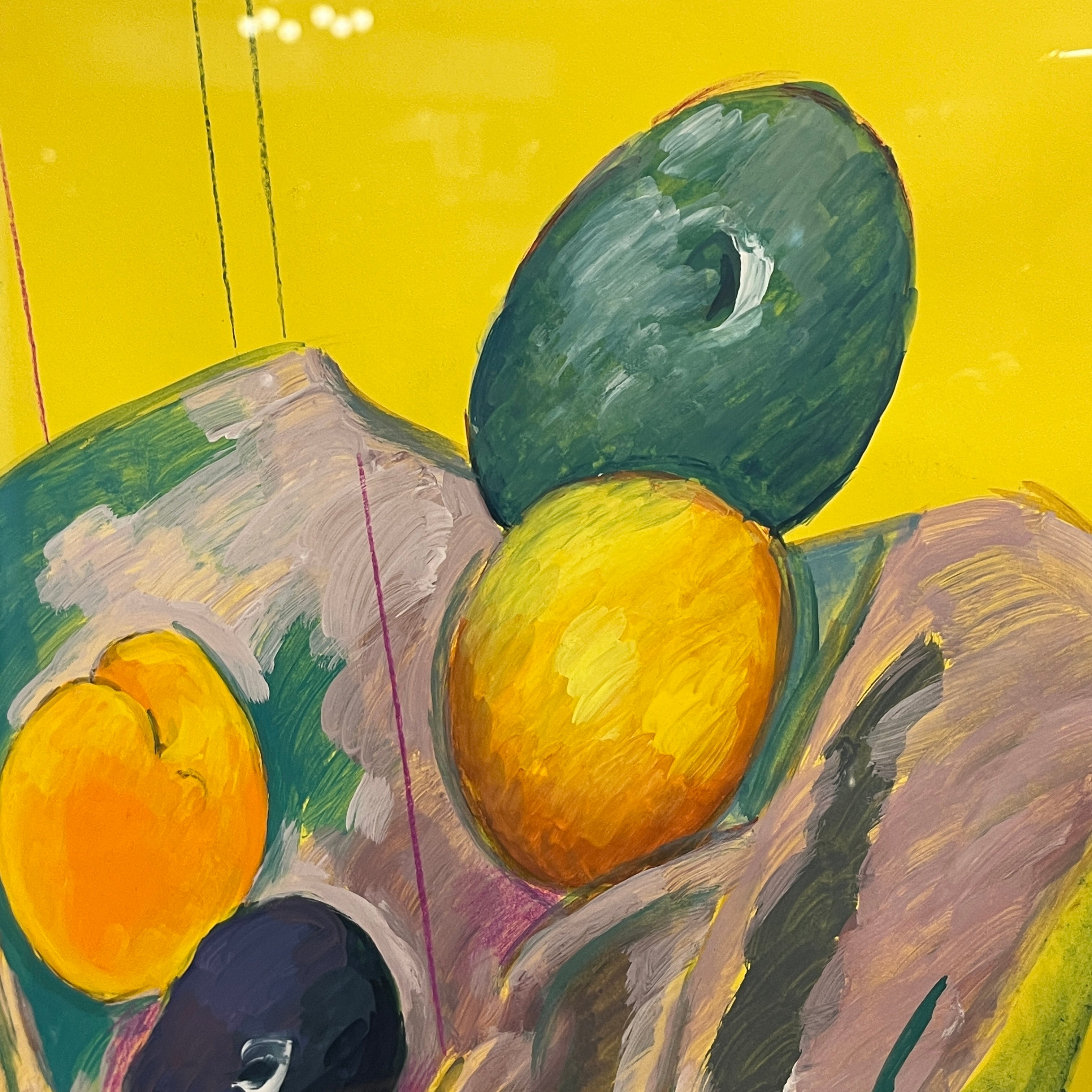 Óleo sobre papel del artista chileno Luis Tejada, representando un bodegón de frutas sobre un mantel en tonos verdes y morados con un llamativo fondo amarillo. La obra es una interpretación del artista de una temática tan tradicional en la historia del arte, como es el bodegón, dándole su característica impronta de color y geometría. Otro elemento interesante es la proyección de líneas desde el dibujo, sugiriendo una especie de boceto o estudio de perspectiva existente debajo de la pintura. La obra está enmarcada en madera, de diseño sobrio y terminación plateada.