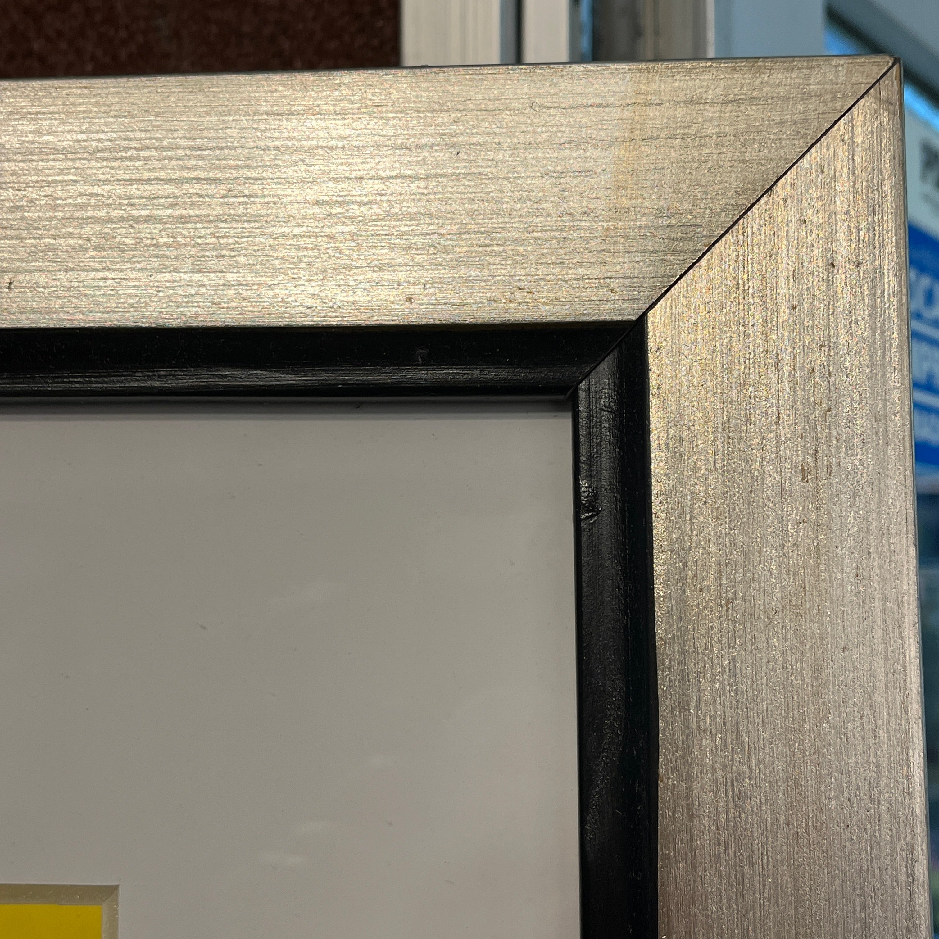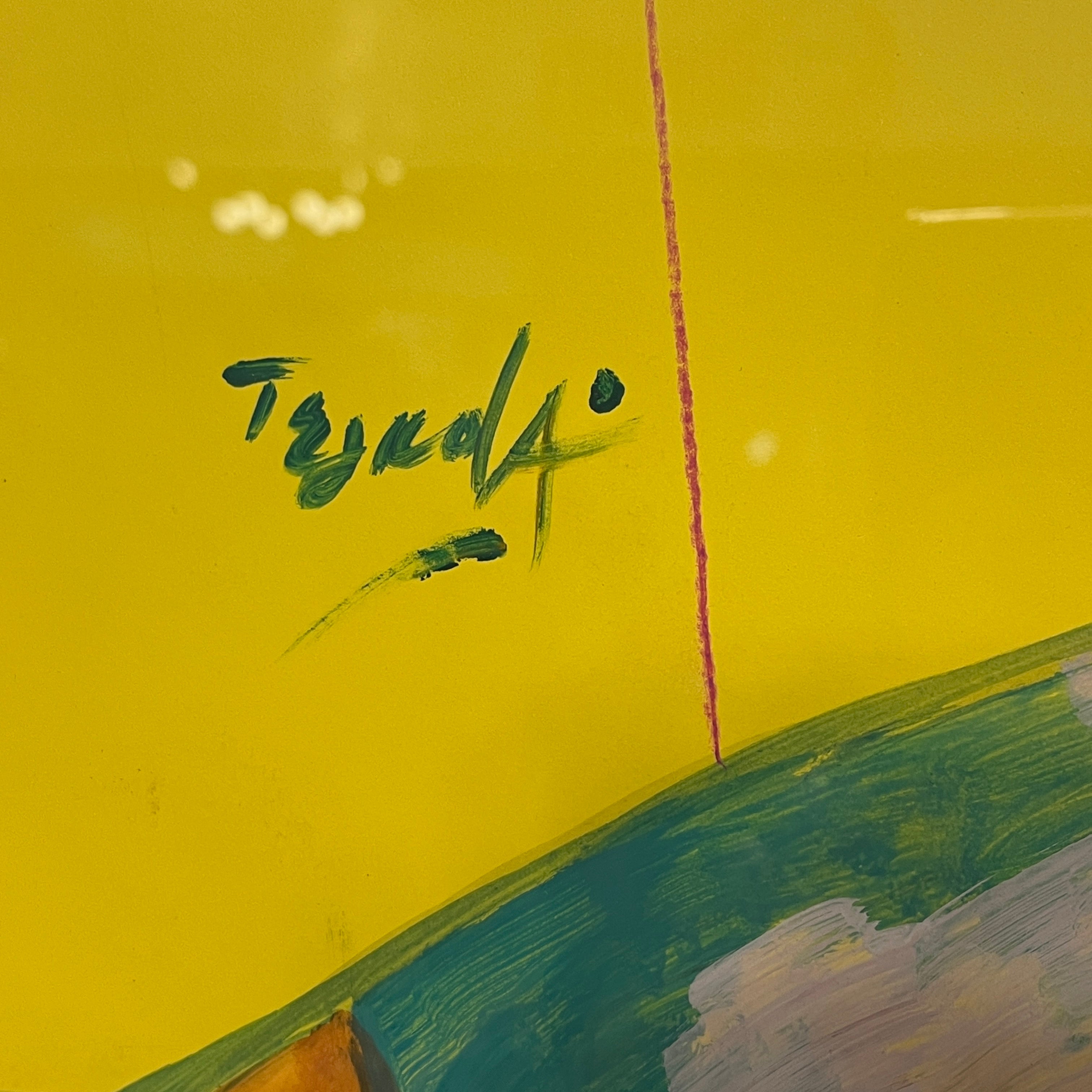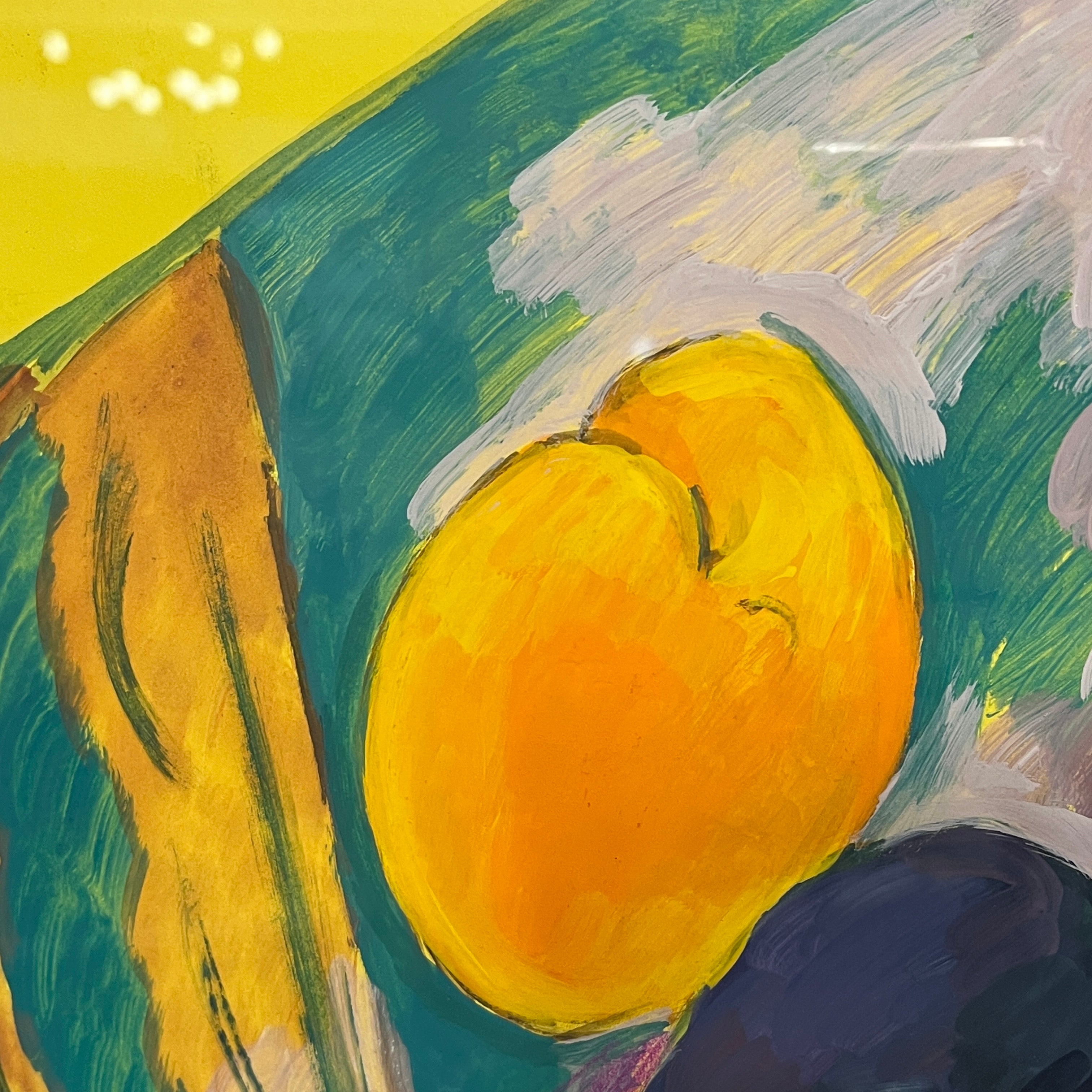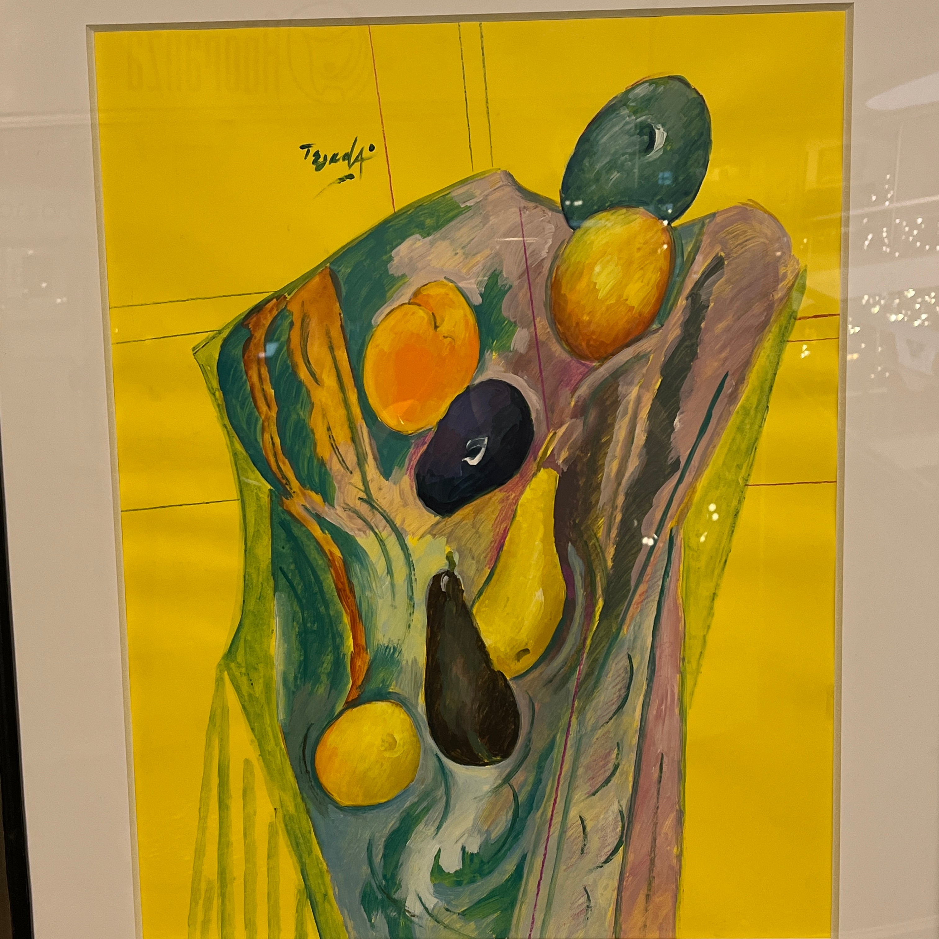 Óleo sobre papel del artista chileno Luis Tejada, representando un bodegón de frutas sobre un mantel en tonos verdes y morados con un llamativo fondo amarillo. La obra es una interpretación del artista de una temática tan tradicional en la historia del arte, como es el bodegón, dándole su característica impronta de color y geometría. Otro elemento interesante es la proyección de líneas desde el dibujo, sugiriendo una especie de boceto o estudio de perspectiva existente debajo de la pintura. La obra está enmarcada en madera, de diseño sobrio y terminación plateada.