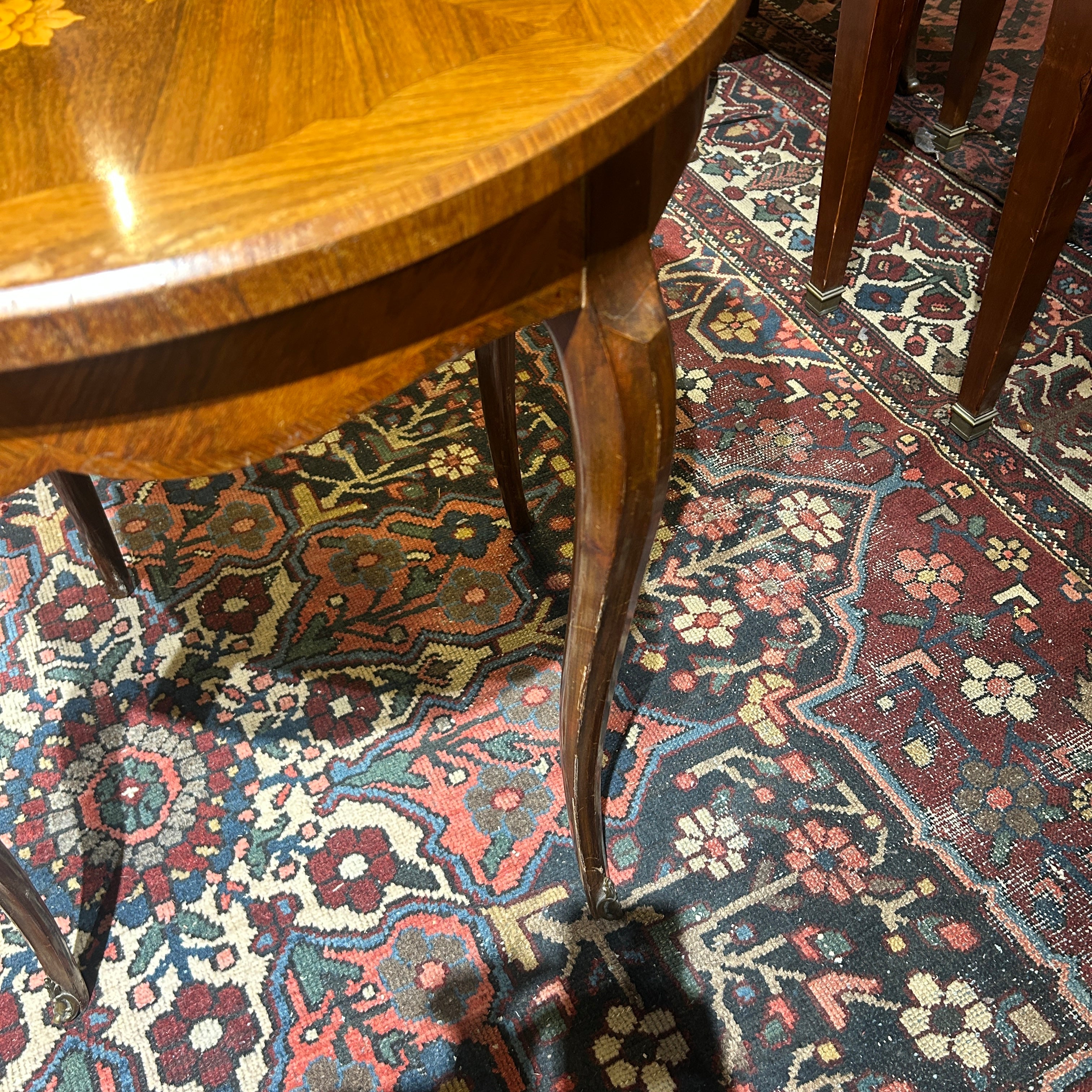 Beautiful French Guéridon table in Louis XV style, in veneered wood, central marquetry with beautiful floral motifs, cabriole legs and bronze plugs.