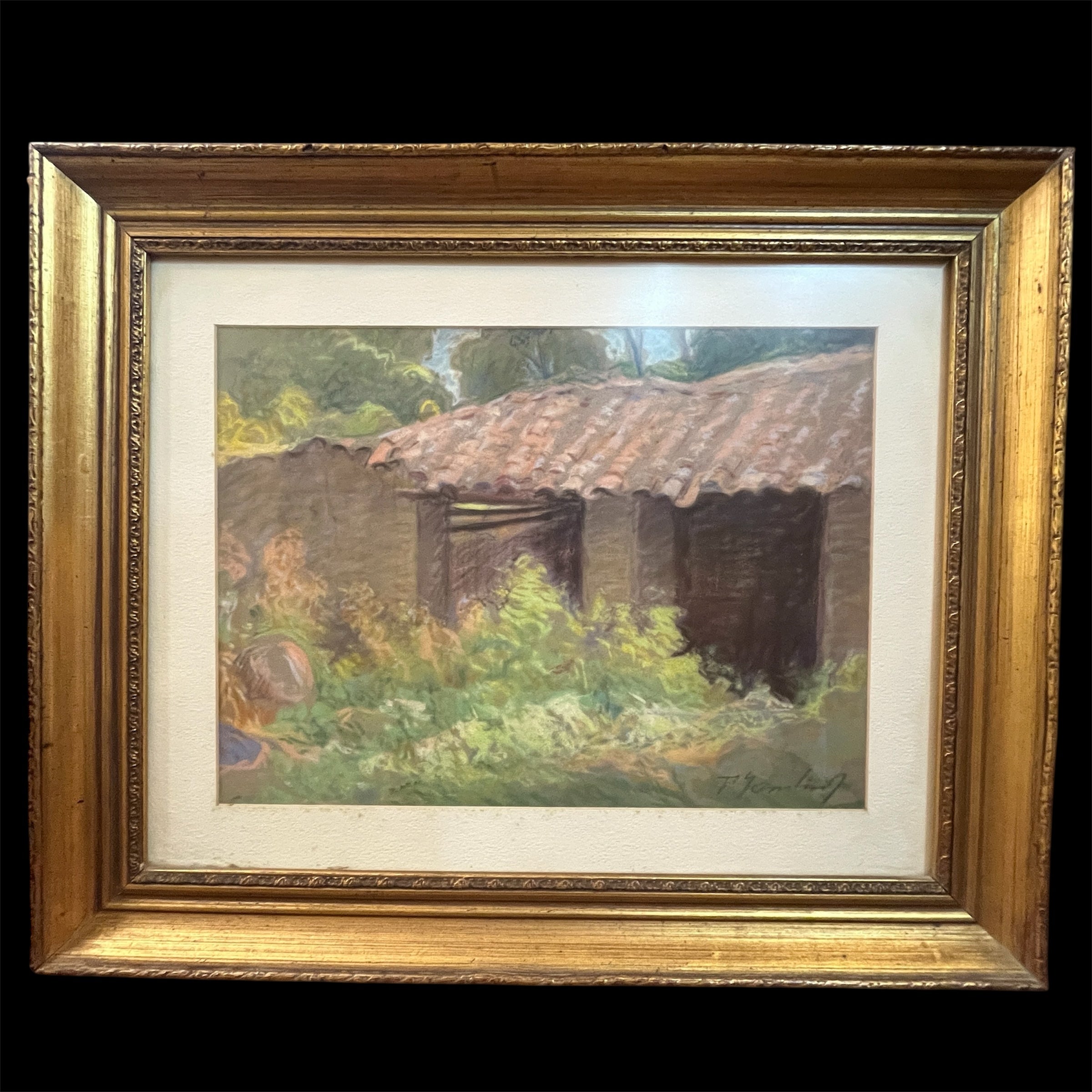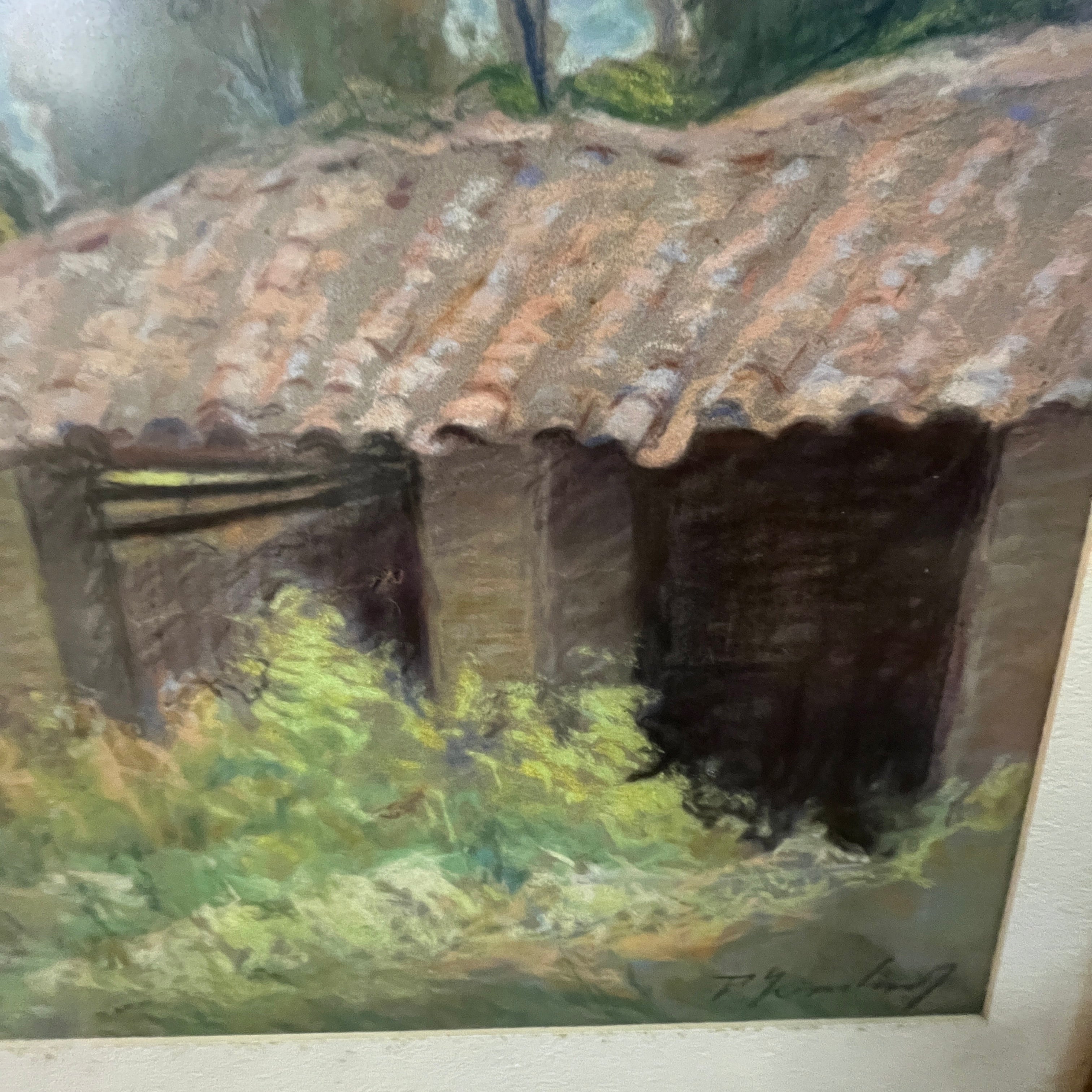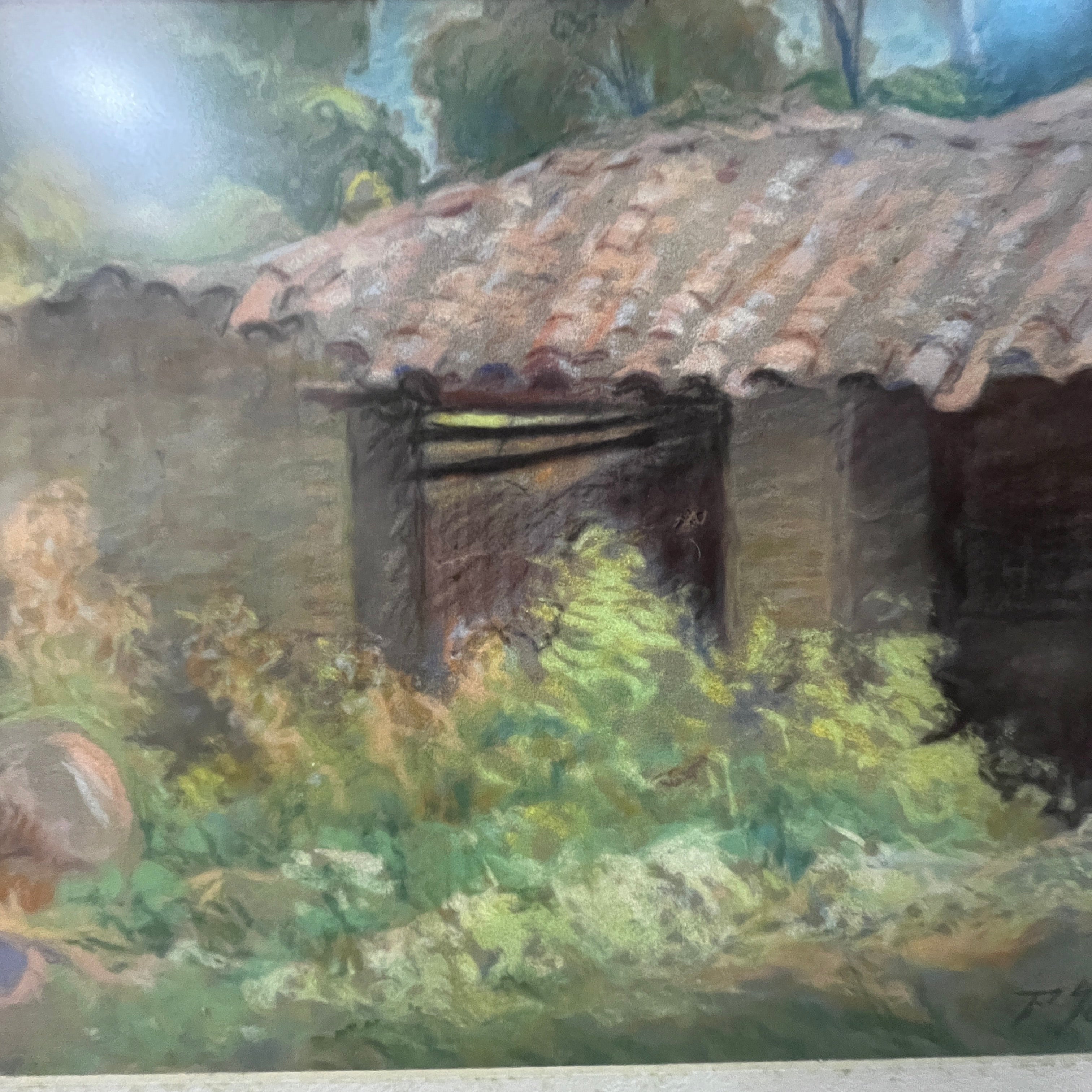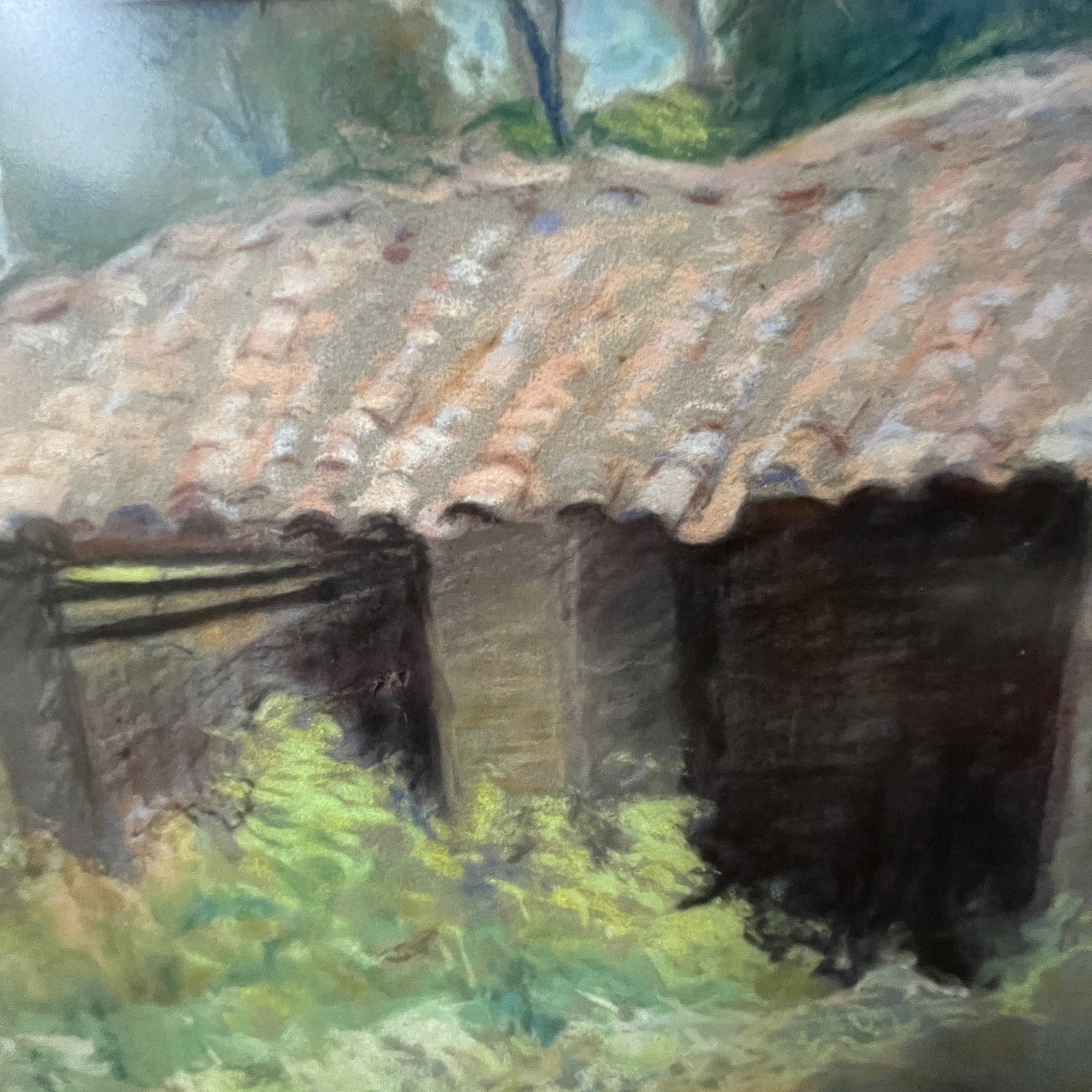 A beautiful pastel work by the Uruguayan-Chilean artist Pascual Gambino, a departure from his usual themes of portraits, nudes, and flowers. Here we see the facade of what is possibly a stable or barn on a farm. The uneven and neglected roof is visible, covered with tall wildflowers and vegetation that lend the scene a unique beauty in its abandonment.