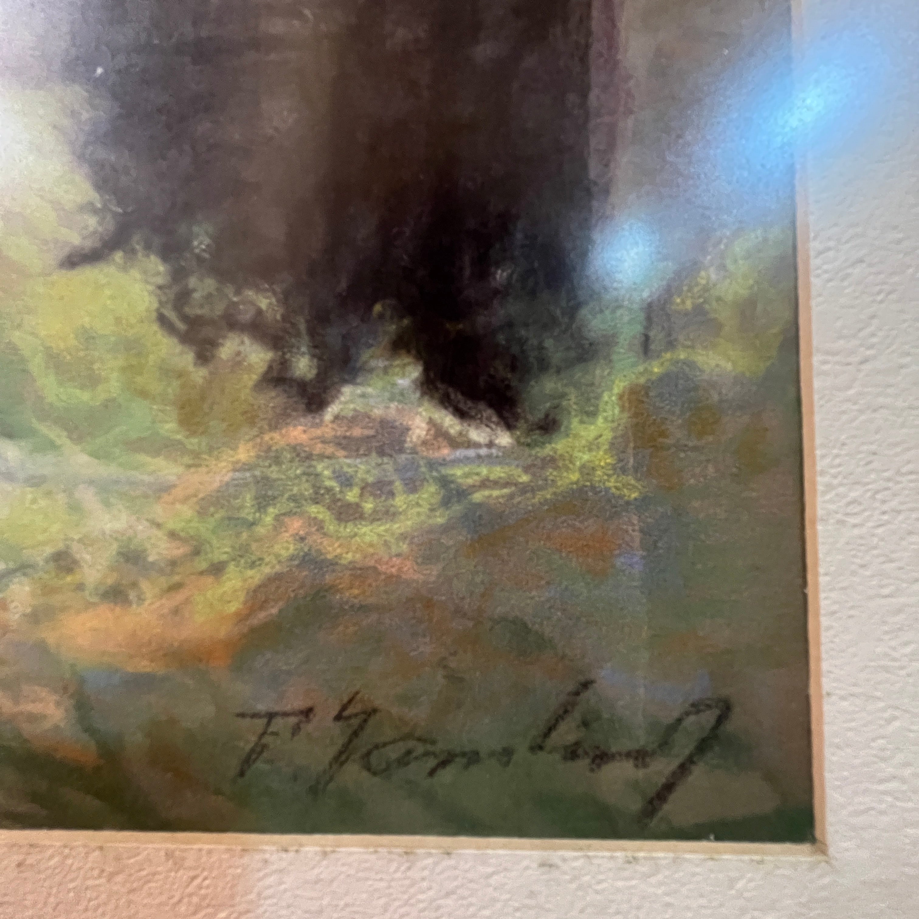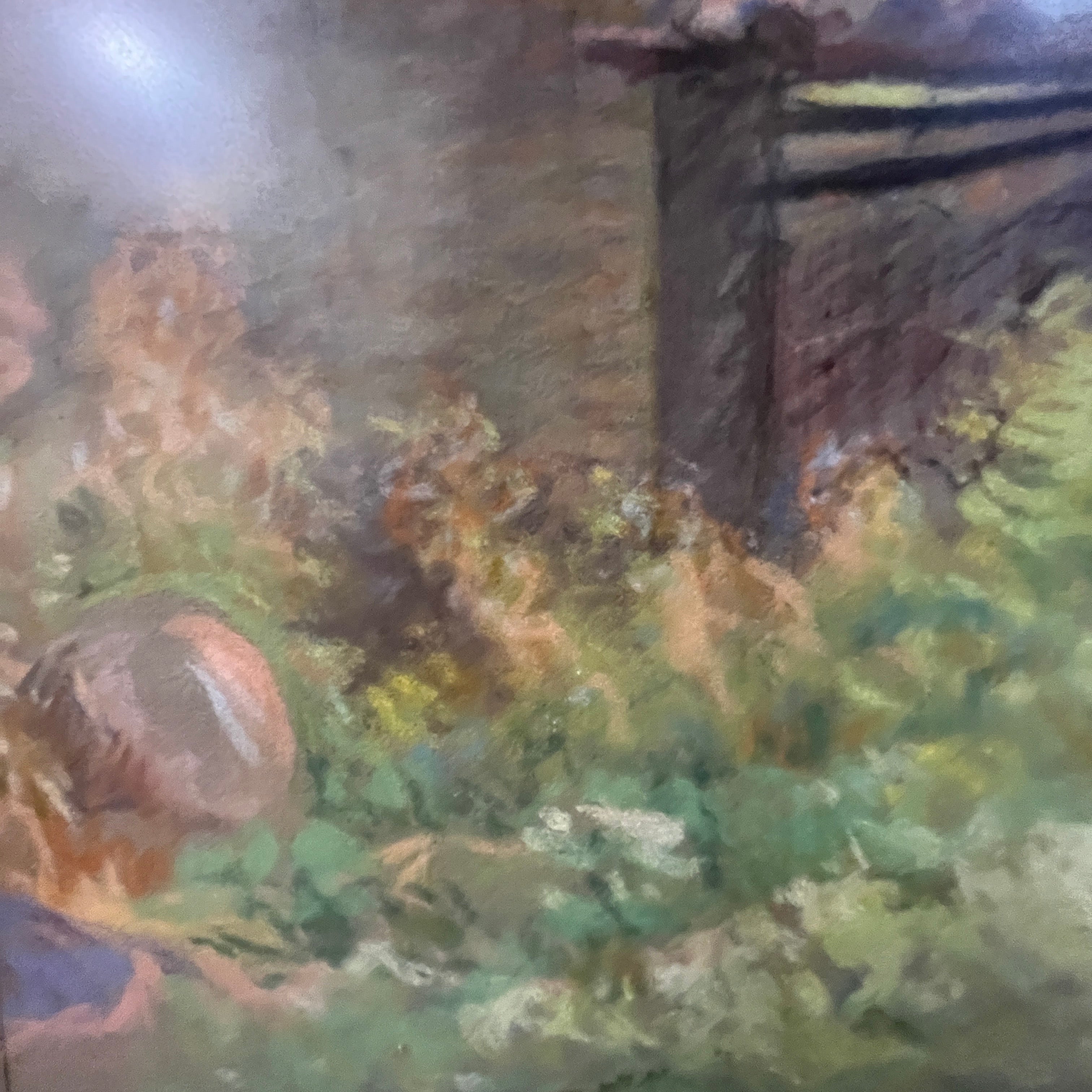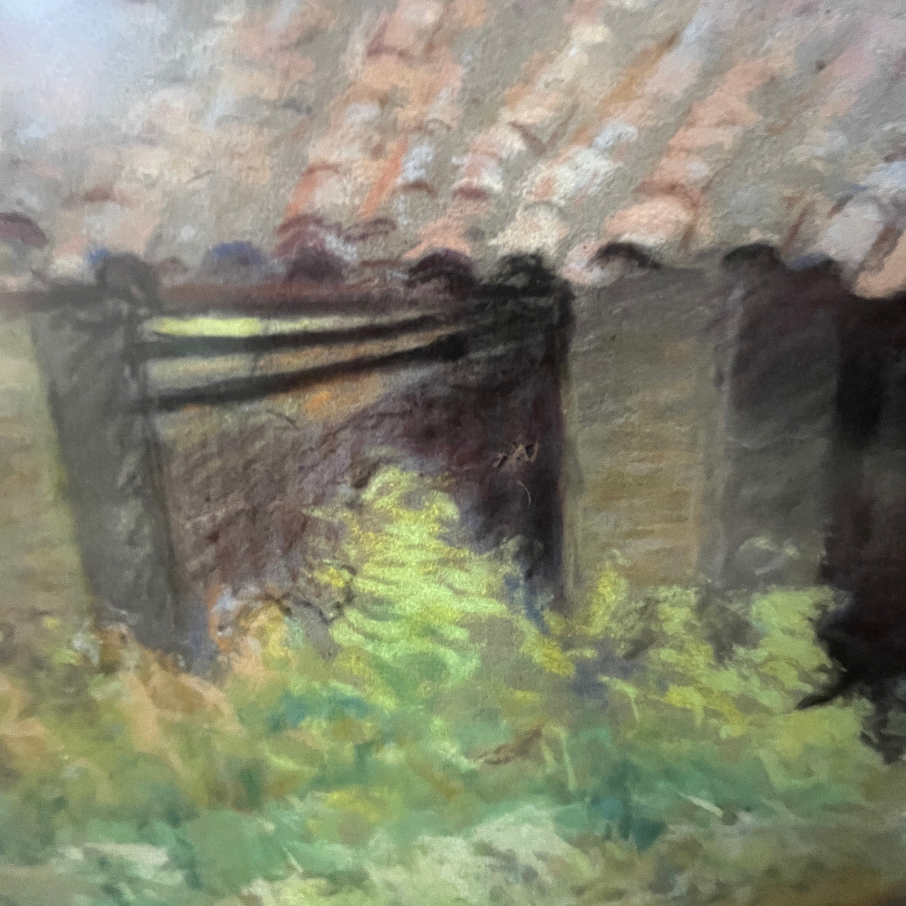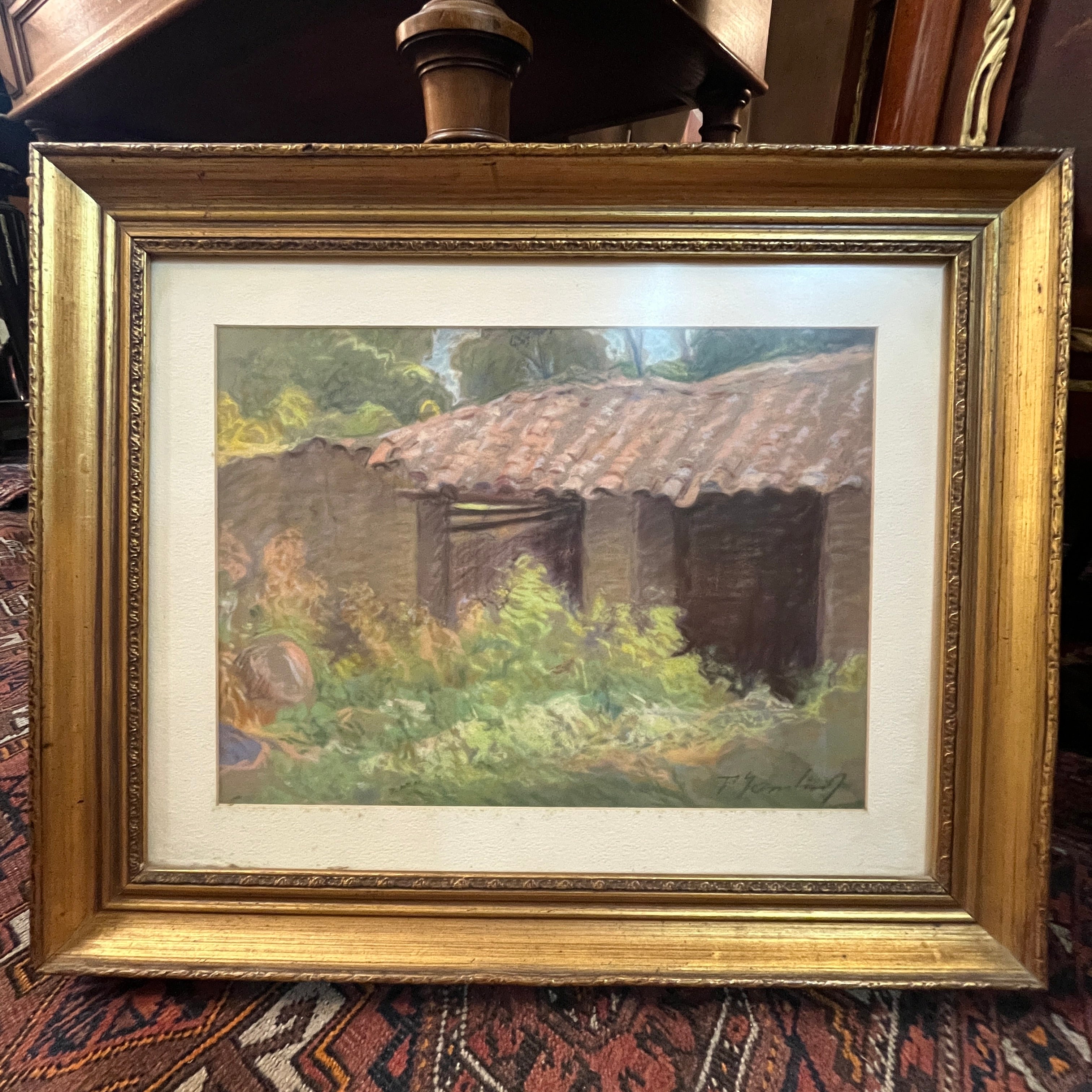 A beautiful pastel work by the Uruguayan-Chilean artist Pascual Gambino, a departure from his usual themes of portraits, nudes, and flowers. Here we see the facade of what is possibly a stable or barn on a farm. The uneven and neglected roof is visible, covered with tall wildflowers and vegetation that lend the scene a unique beauty in its abandonment.