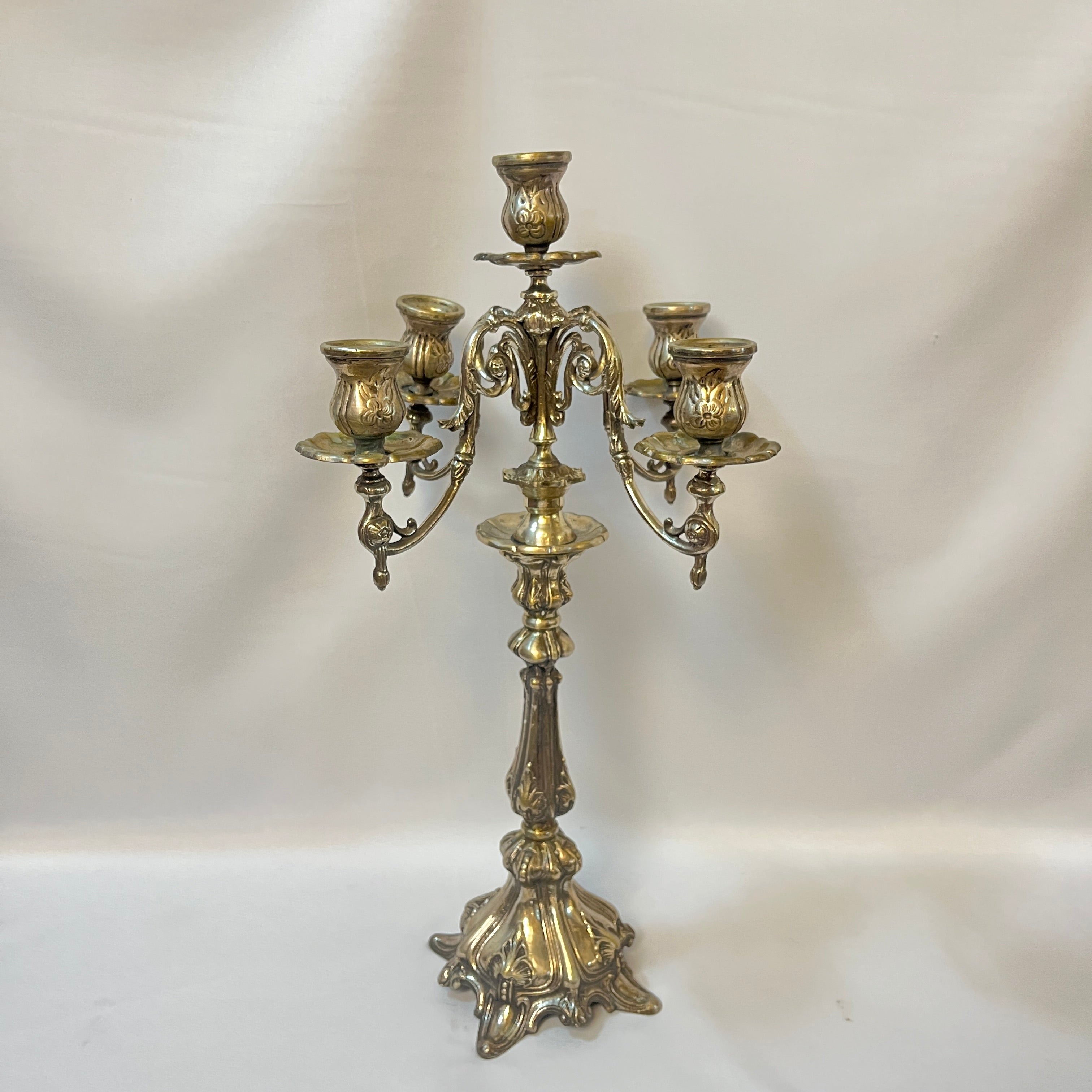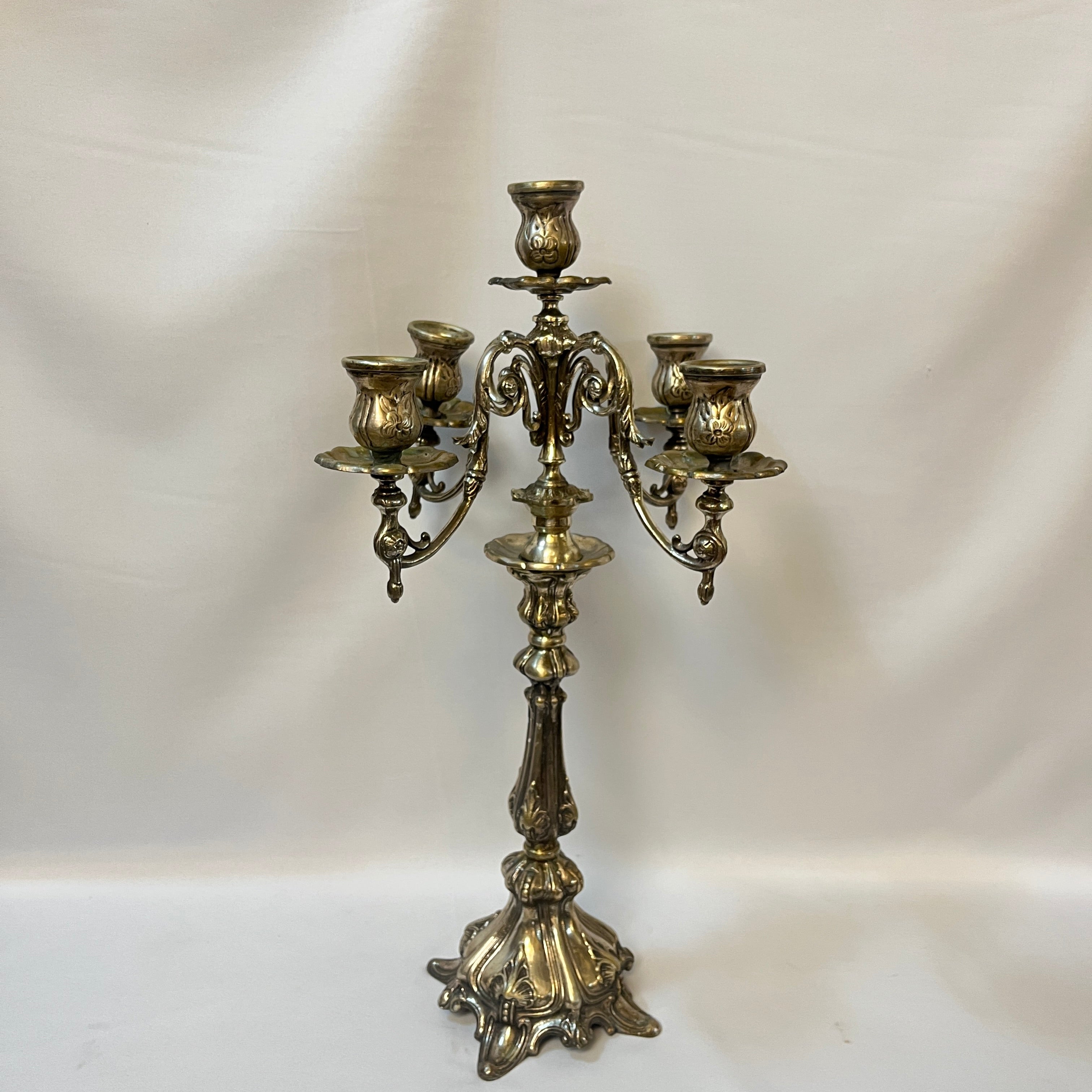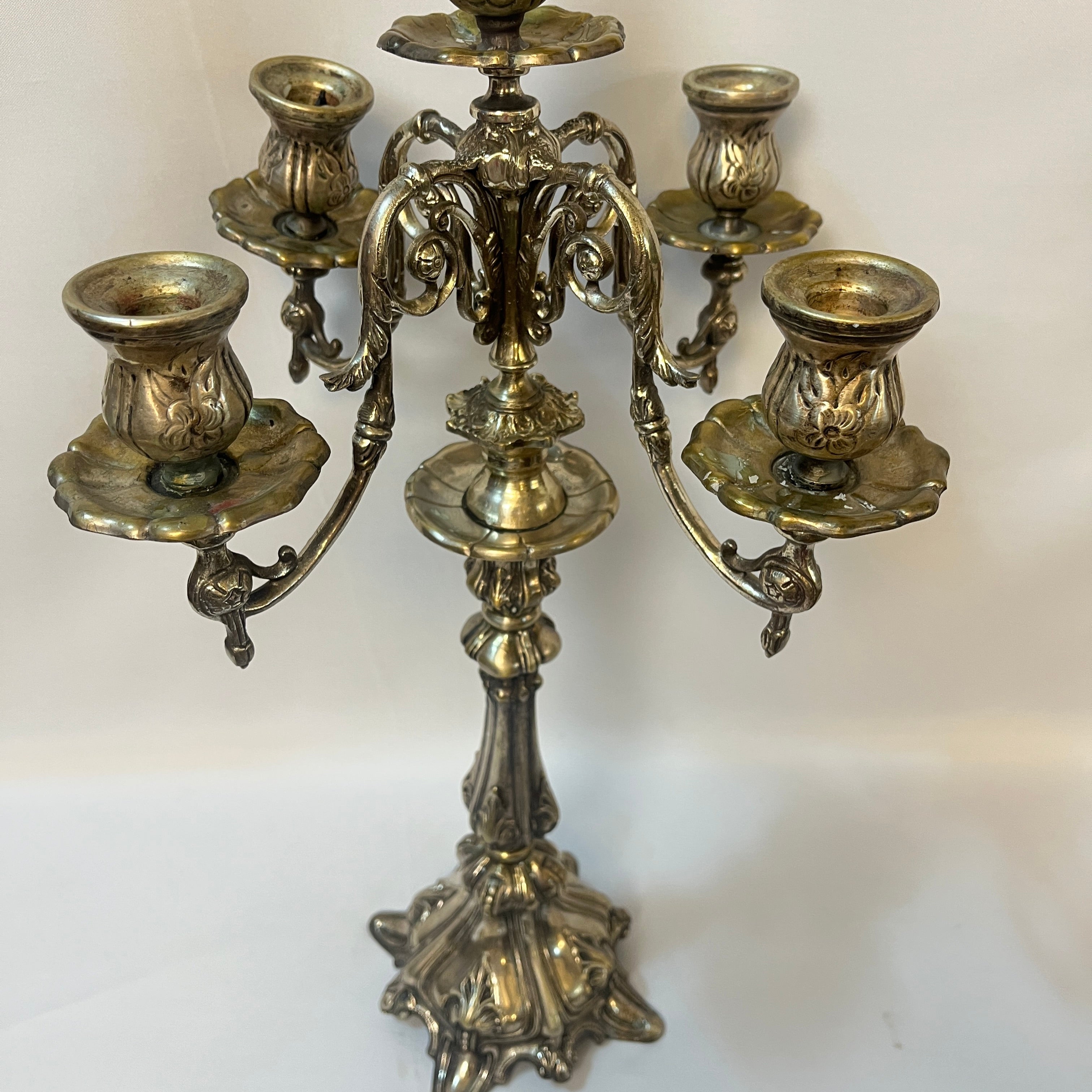 Five-light chandelier and pair of silver-plated candlesticks with rocaille decoration. 20th century.