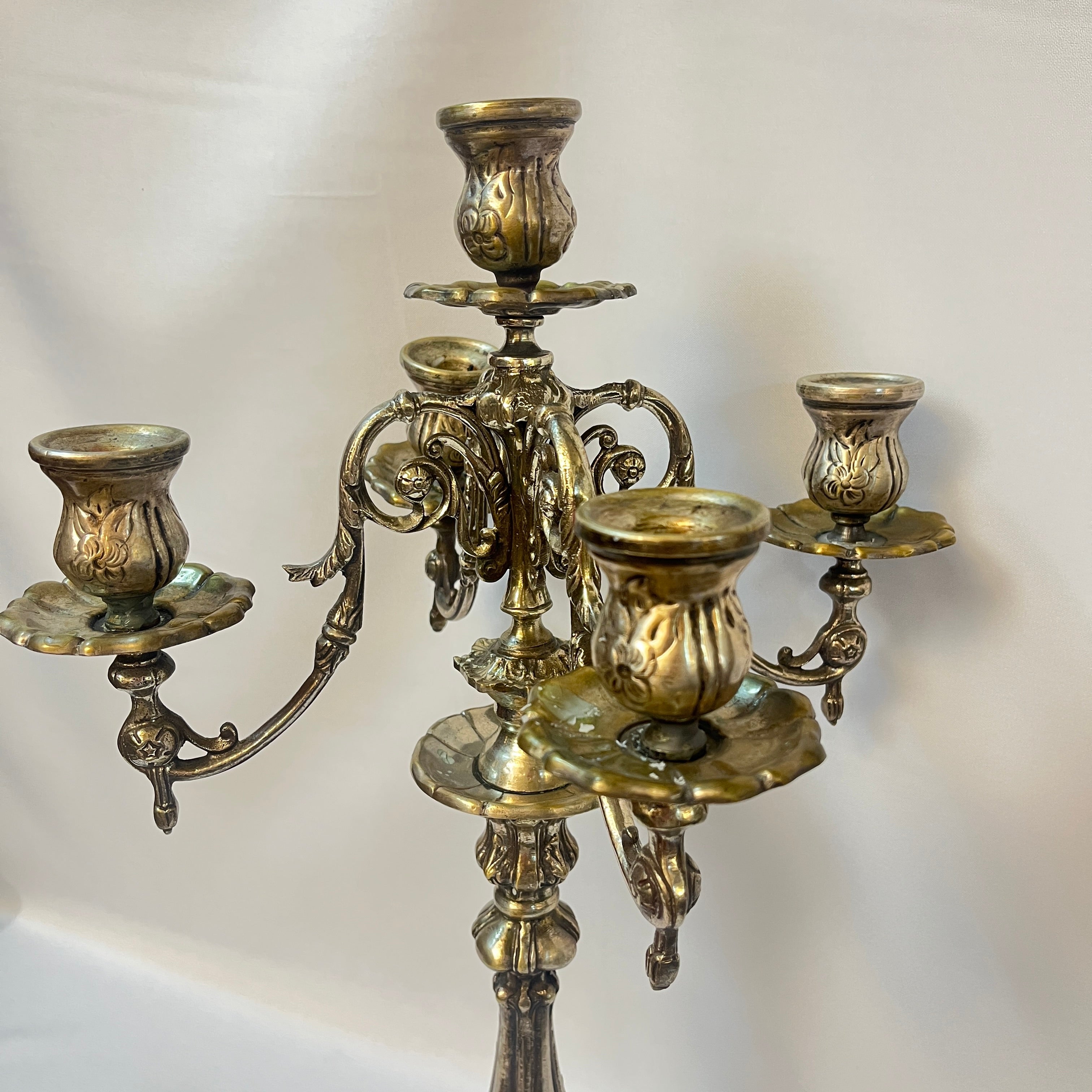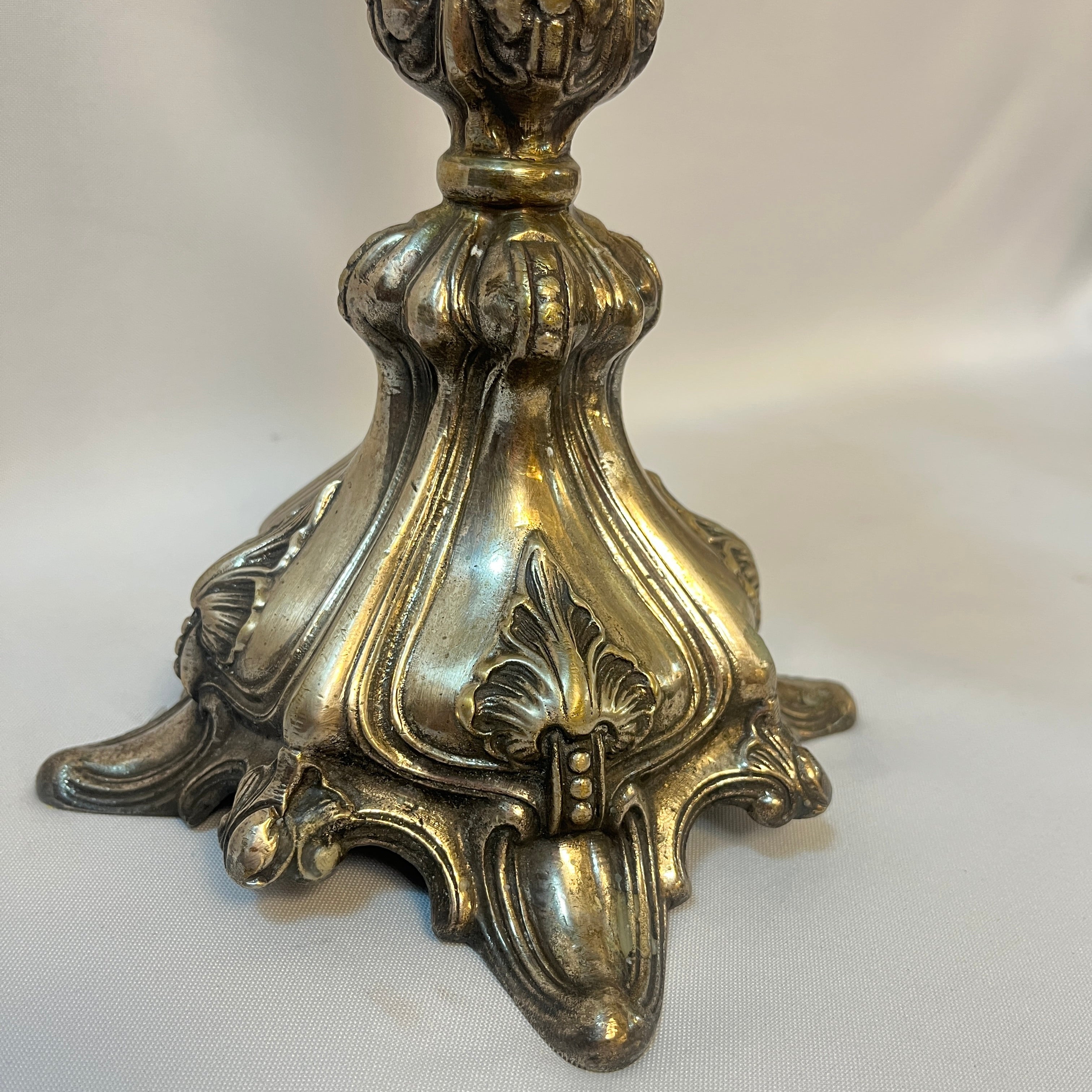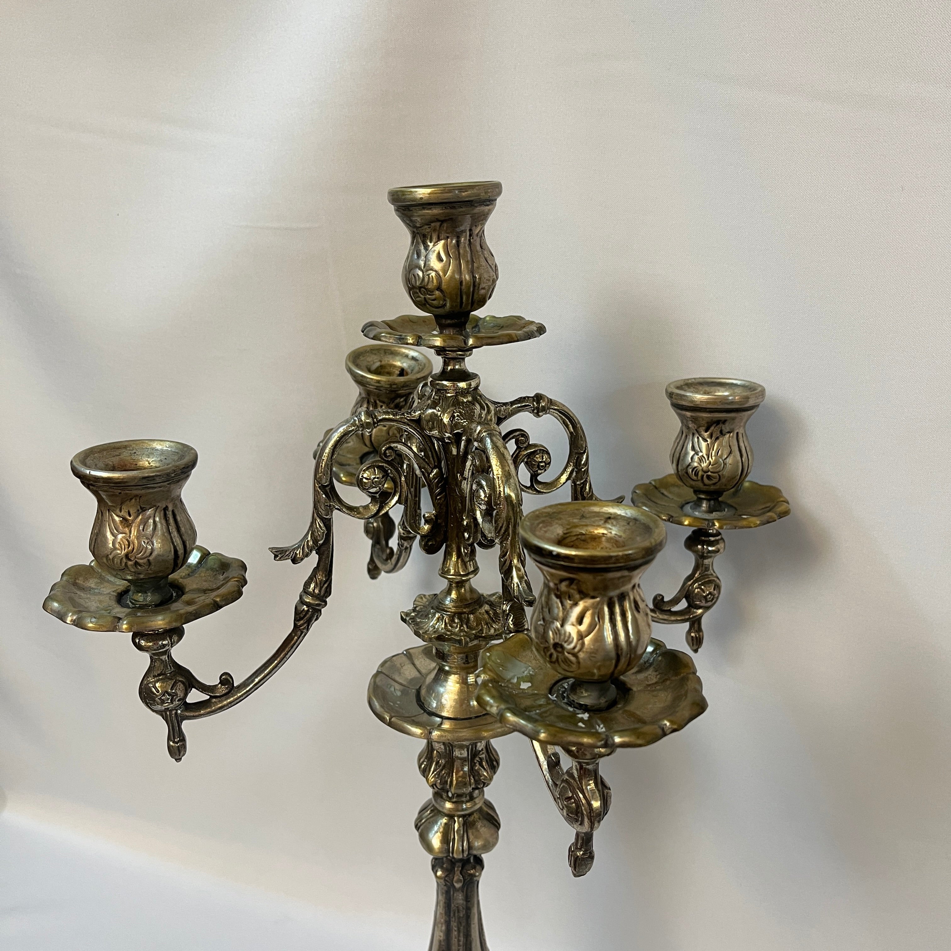 Five-light chandelier and pair of silver-plated candlesticks with rocaille decoration. 20th century.