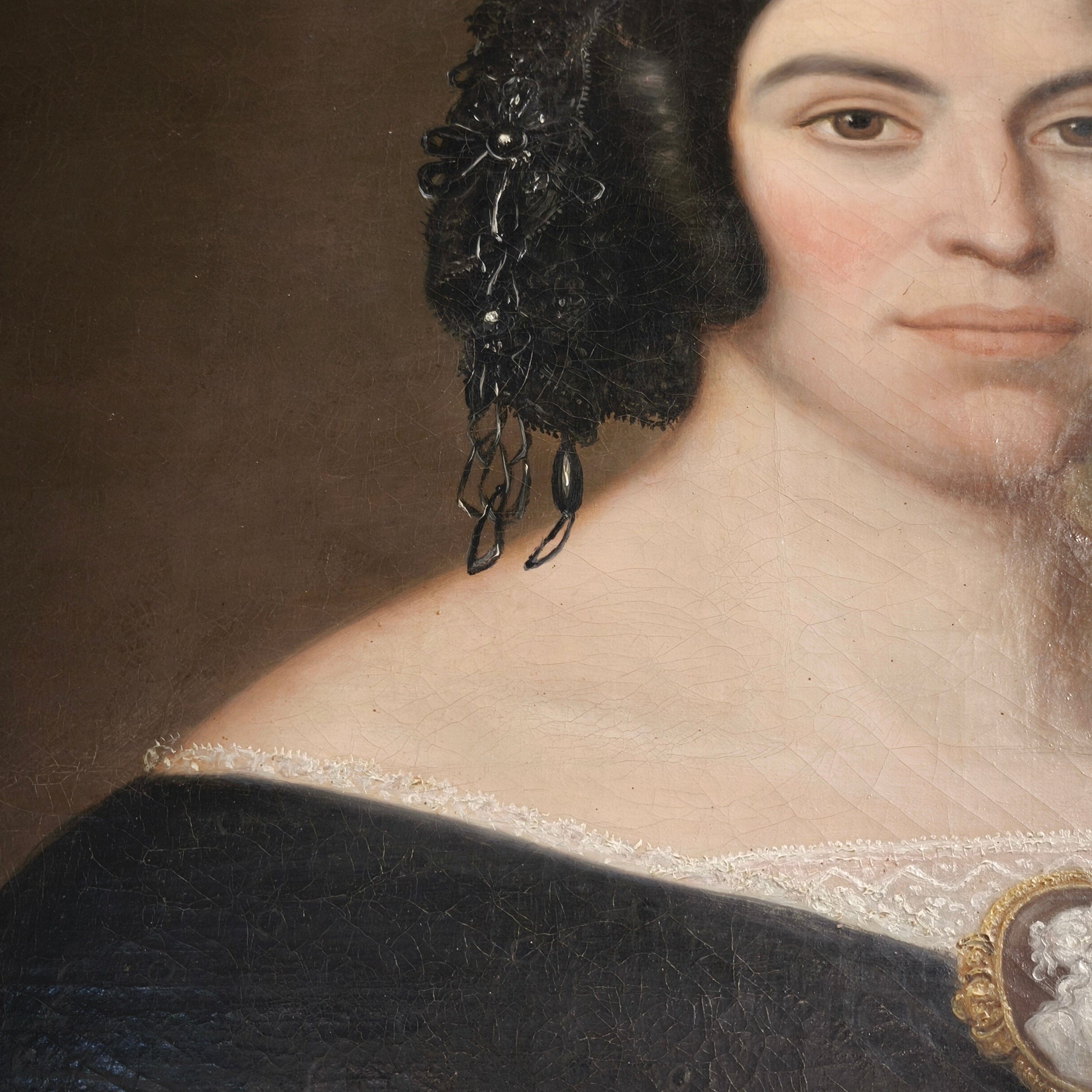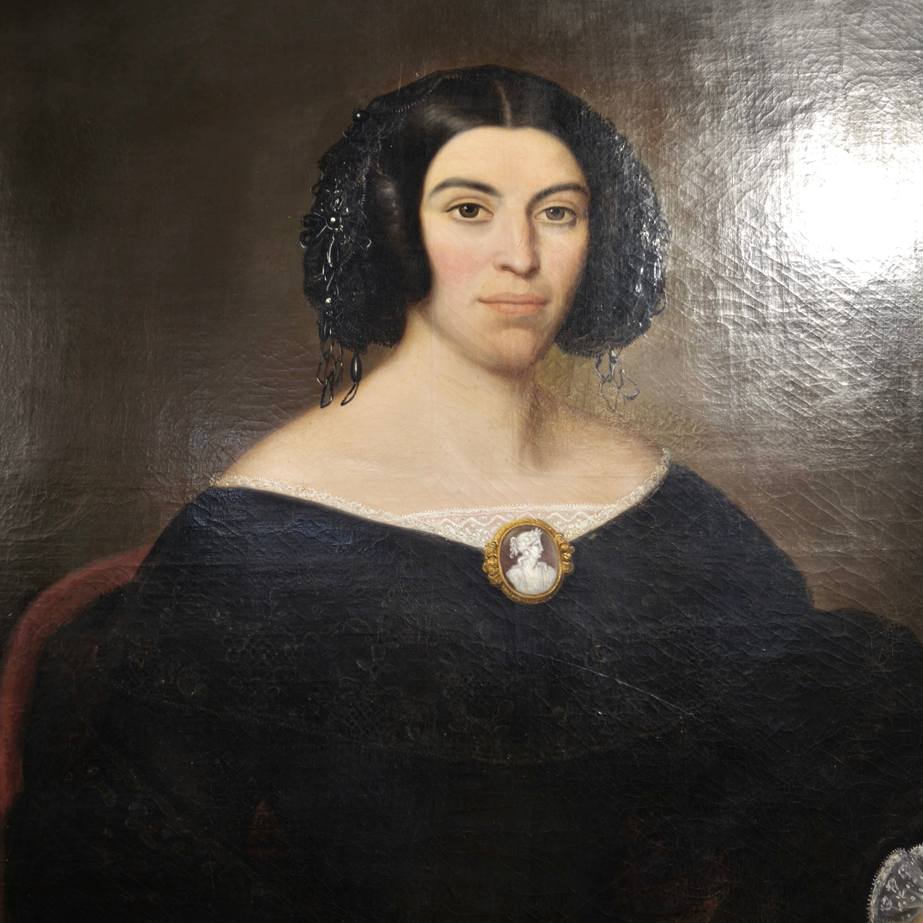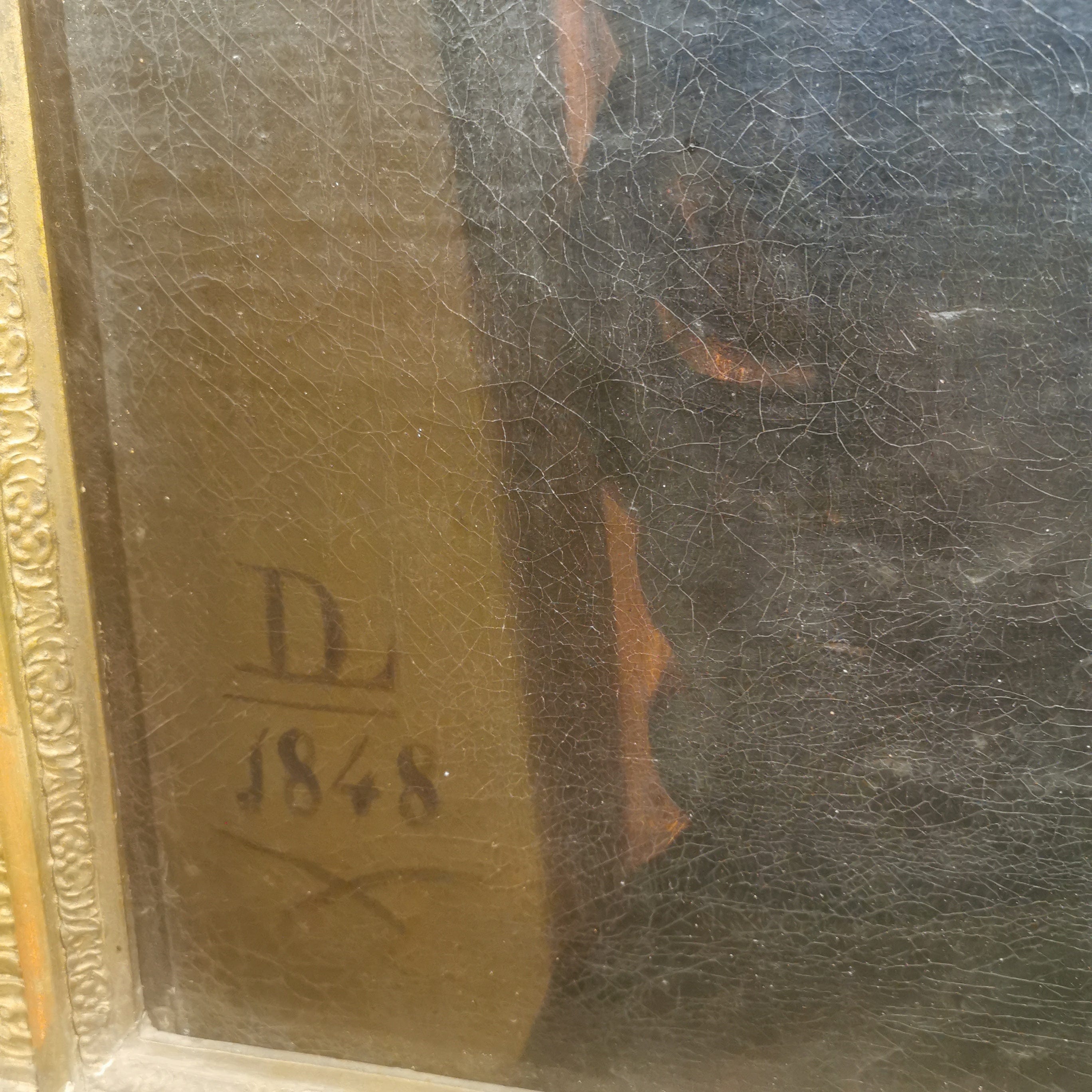 Elegant portrait of a British noblewoman. English School, 19th century. Painting signed DL 1848. It shows a seated woman with a calm and communicative expression.