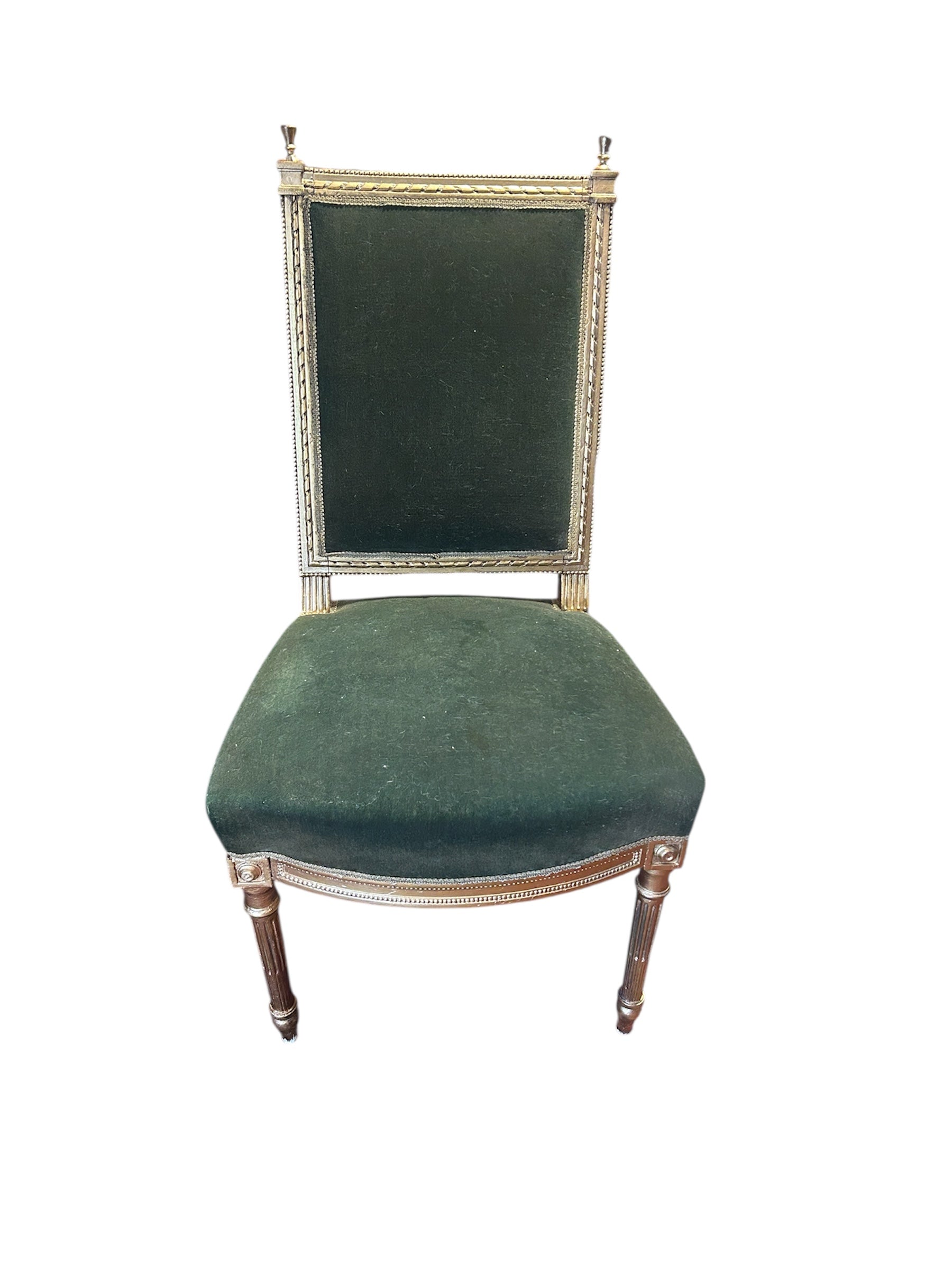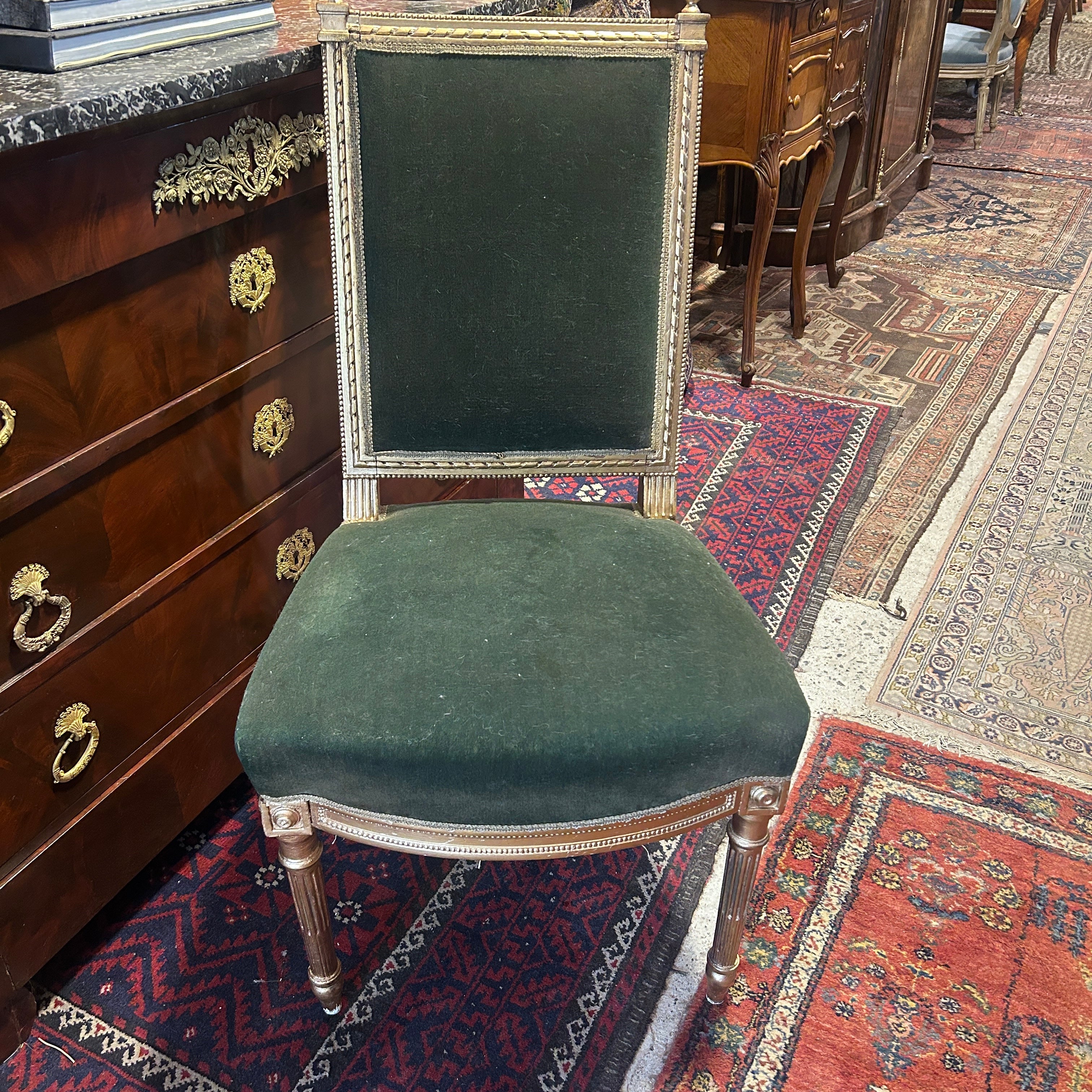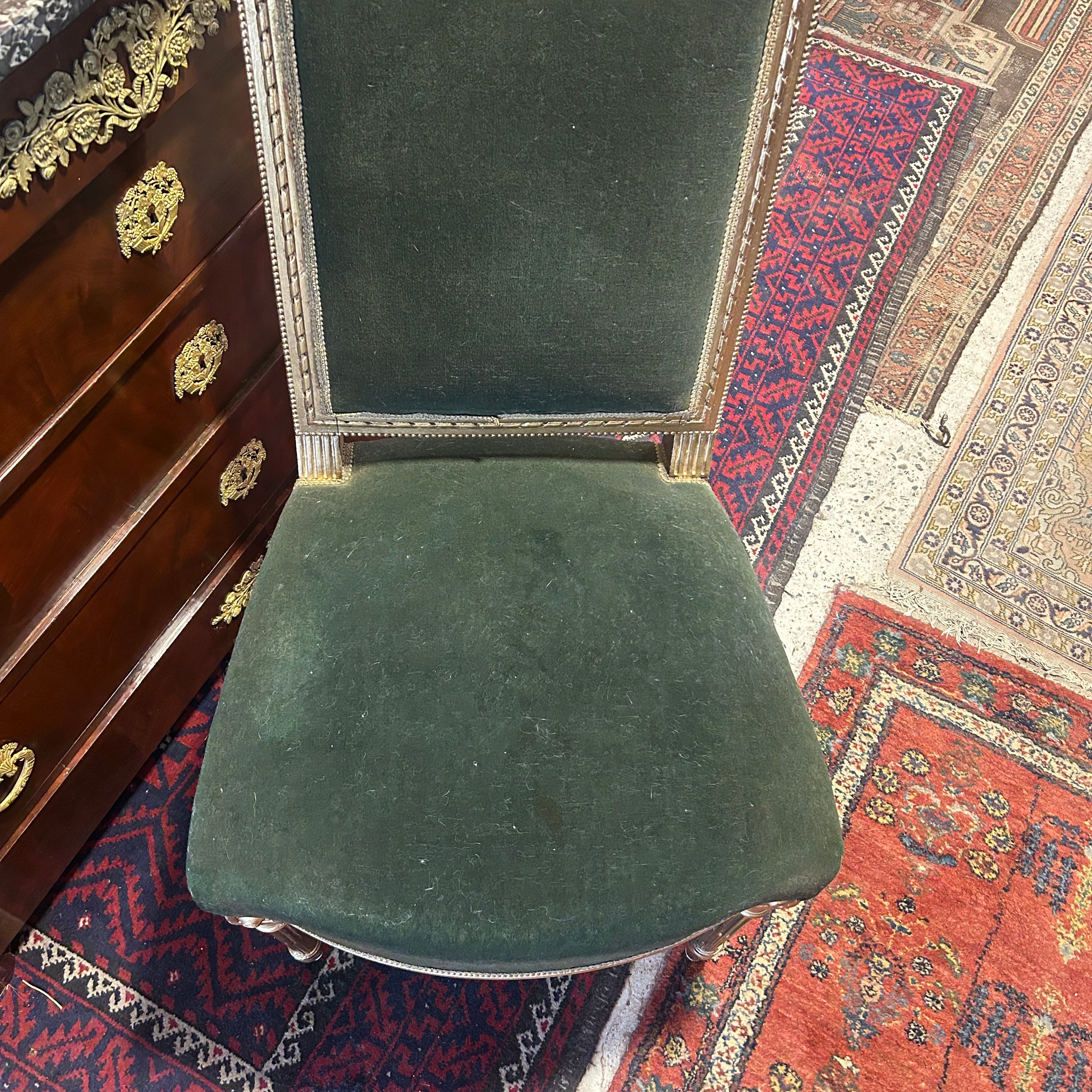 Preciosa silla estilo Luis XVI, de madera tallada y asiento y respaldo tapizados en felpa verde y asiento de resortes. El color dorado de la madera fue retocado.