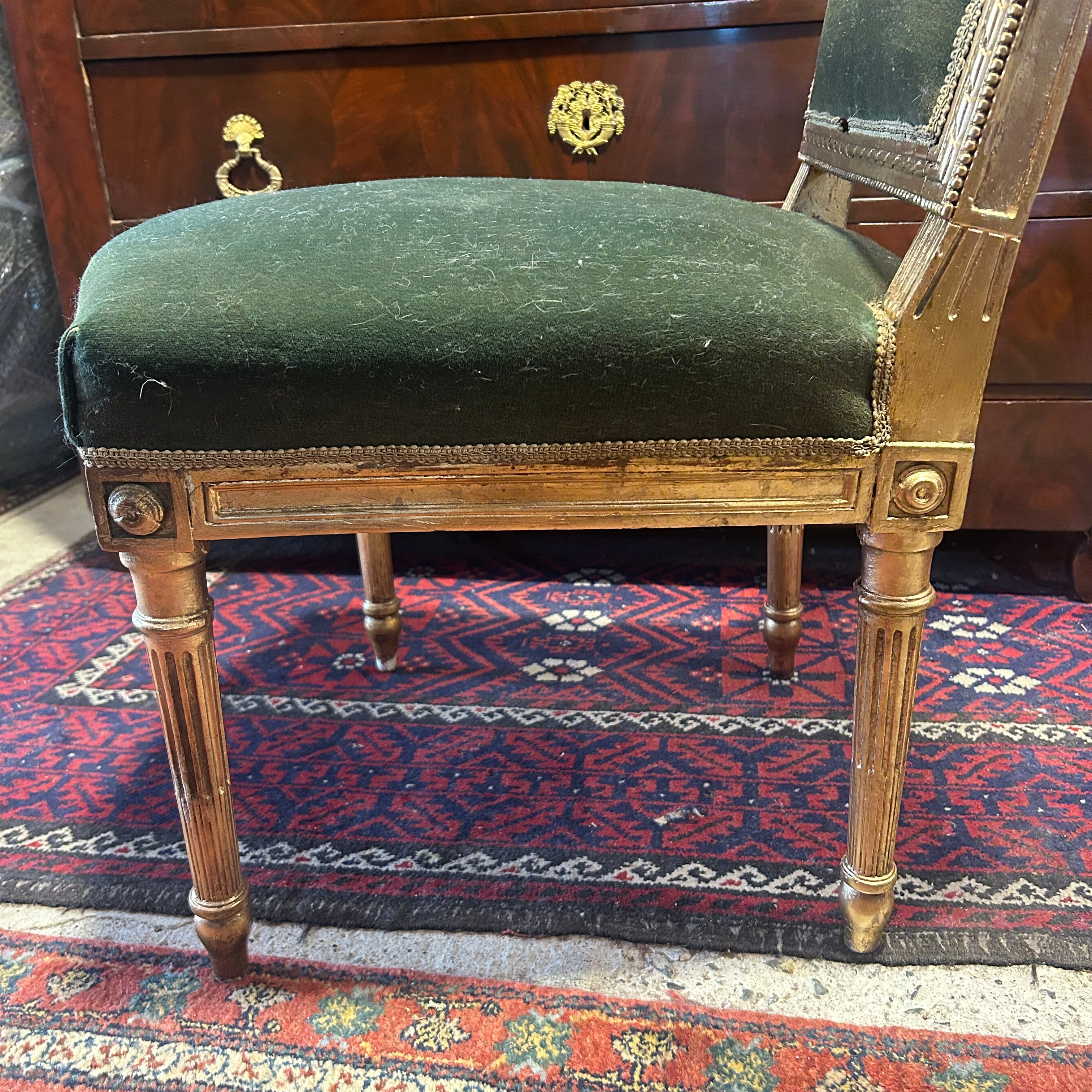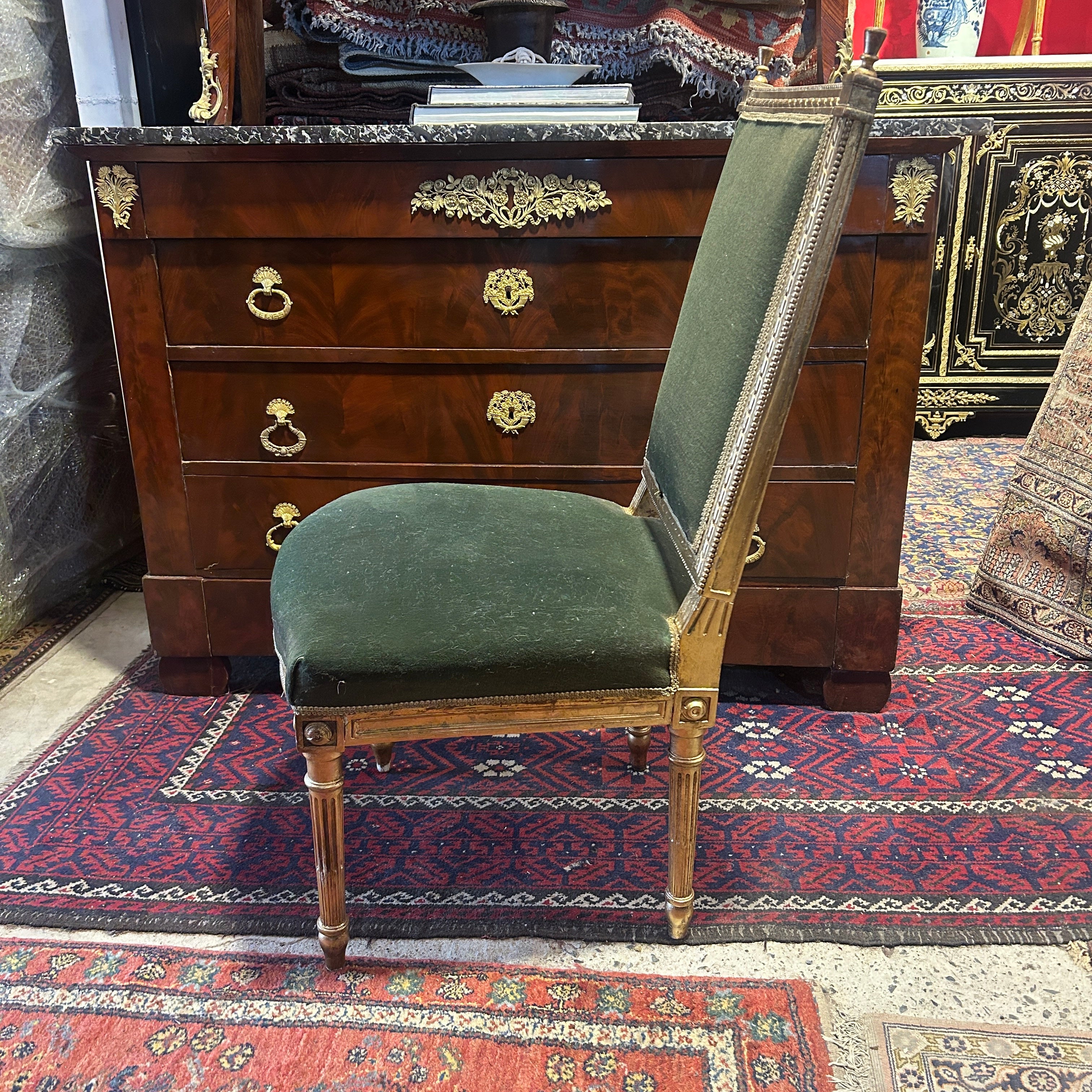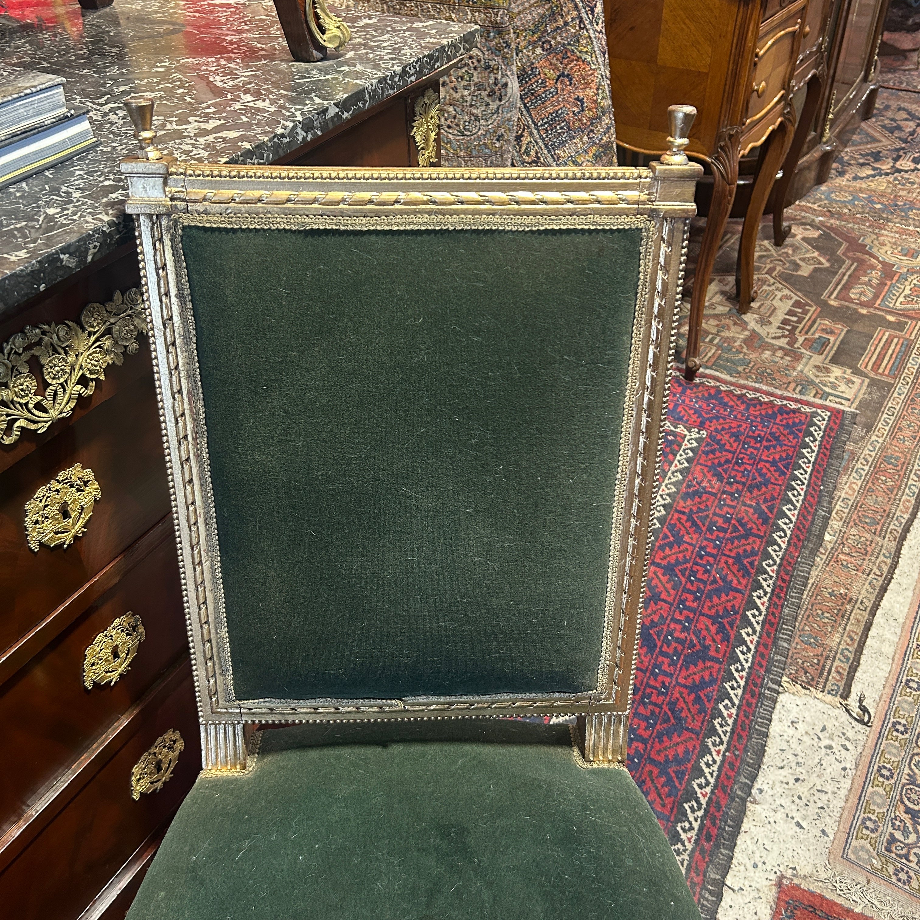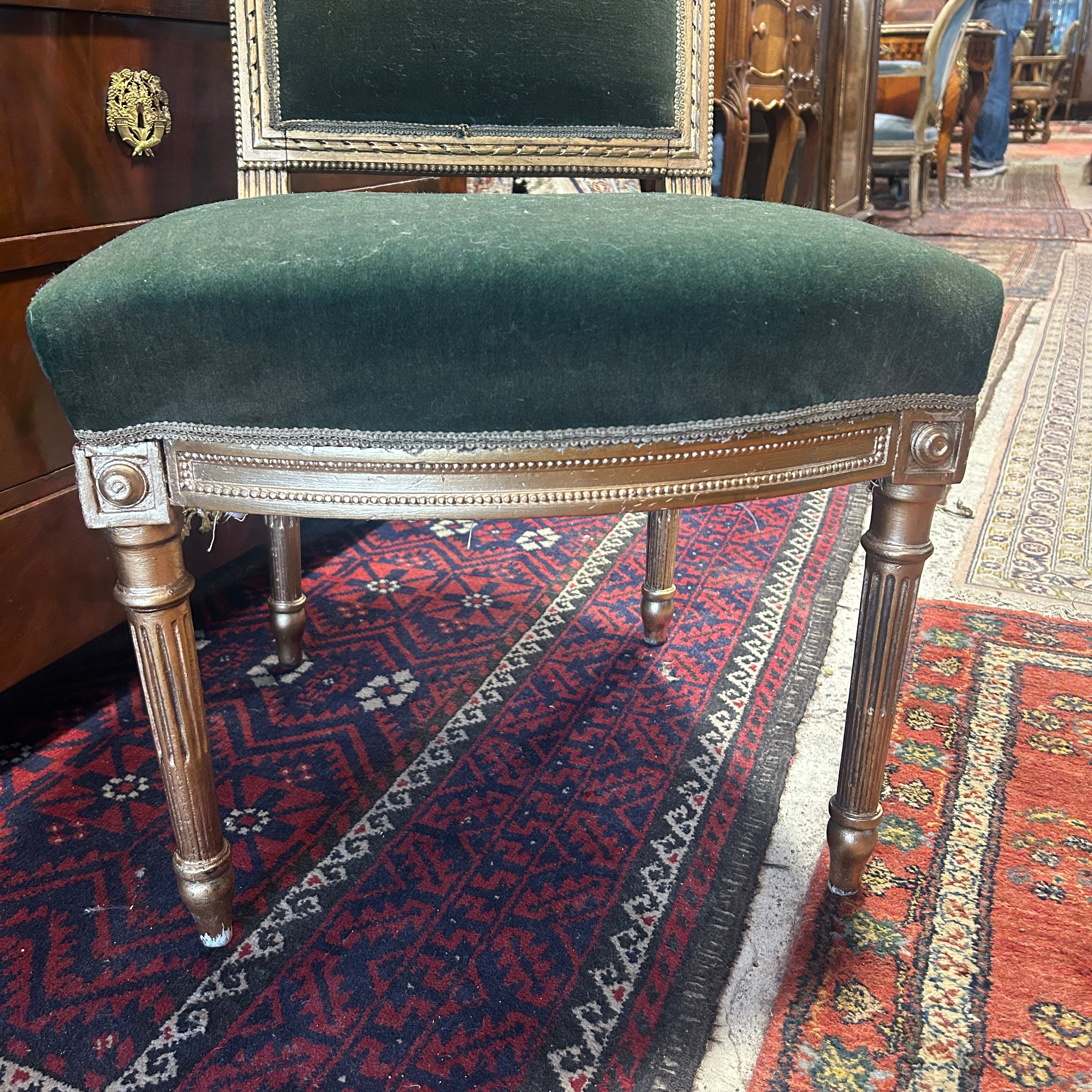 Preciosa silla estilo Luis XVI, de madera tallada y asiento y respaldo tapizados en felpa verde y asiento de resortes. El color dorado de la madera fue retocado.