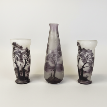 Conjunto de jarrones franceses en vidrio esmaltado Paisaje lacustre atribuido a Legras