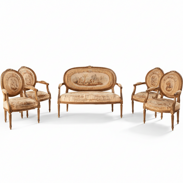 Conjunto compuesto por un sofá y cuatro sillones con respaldo medallón. Molduras con cintas y lazos; apoyabrazos con decoración de hojas de acanto; patas estriadas. Tapicería con escenas aldeanas y animales.