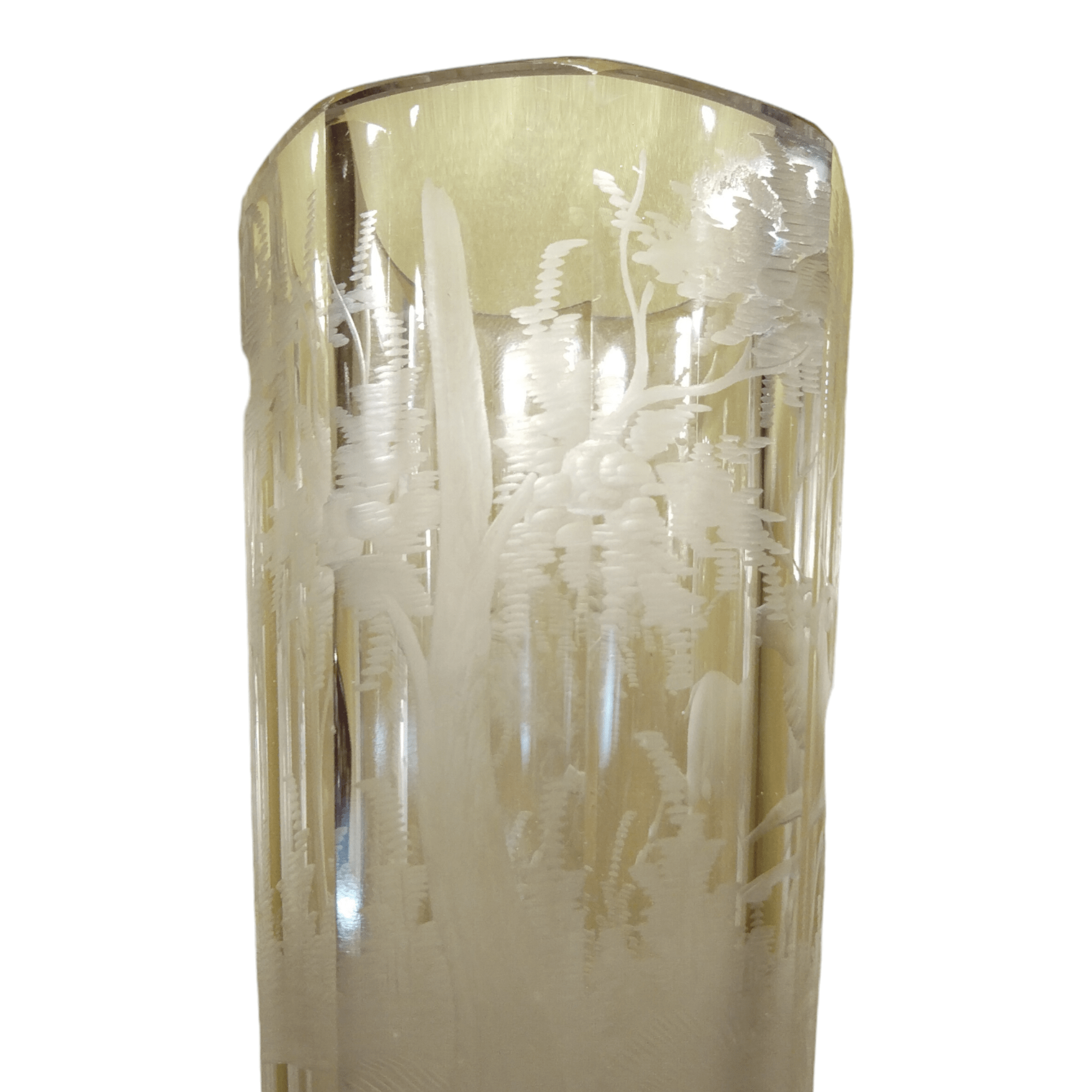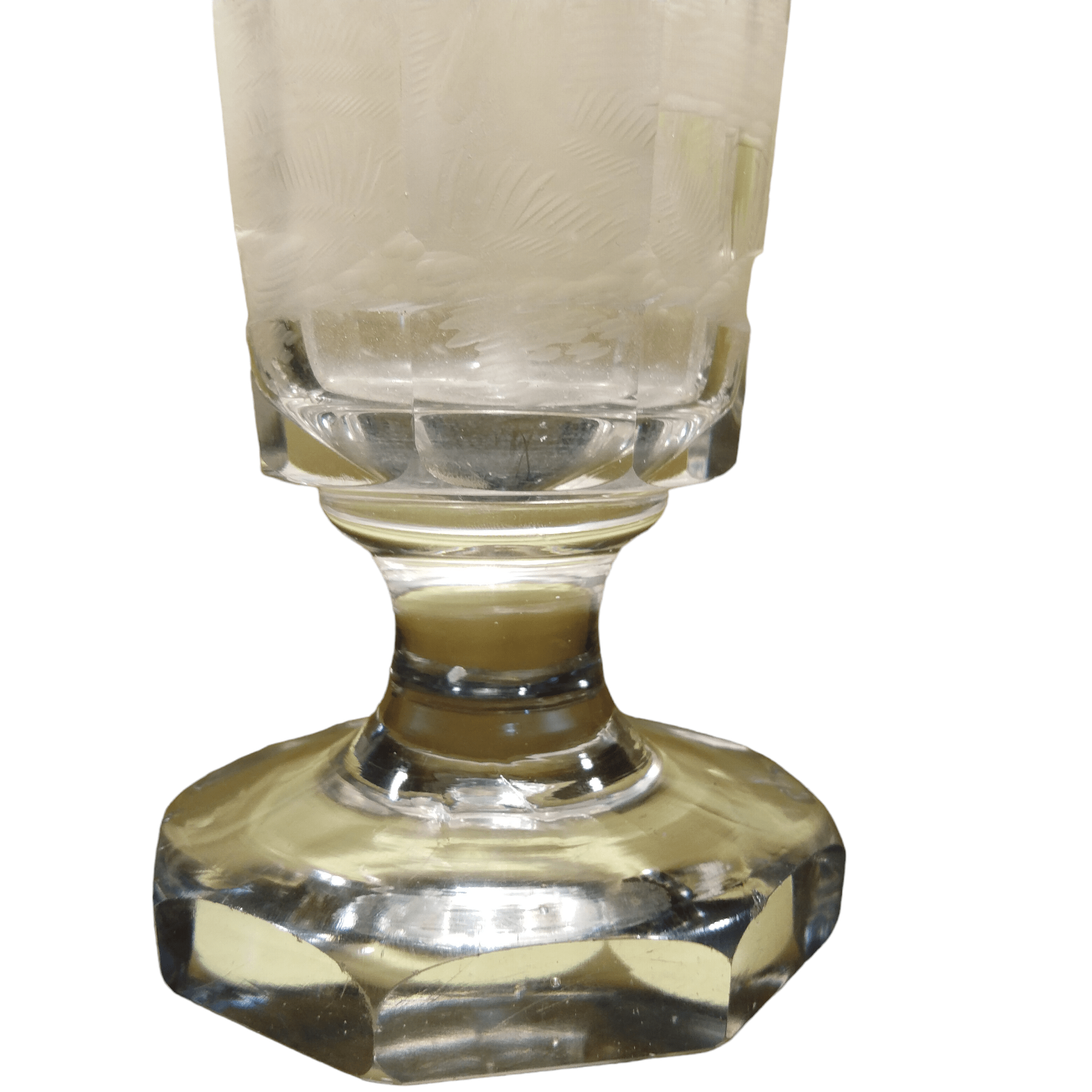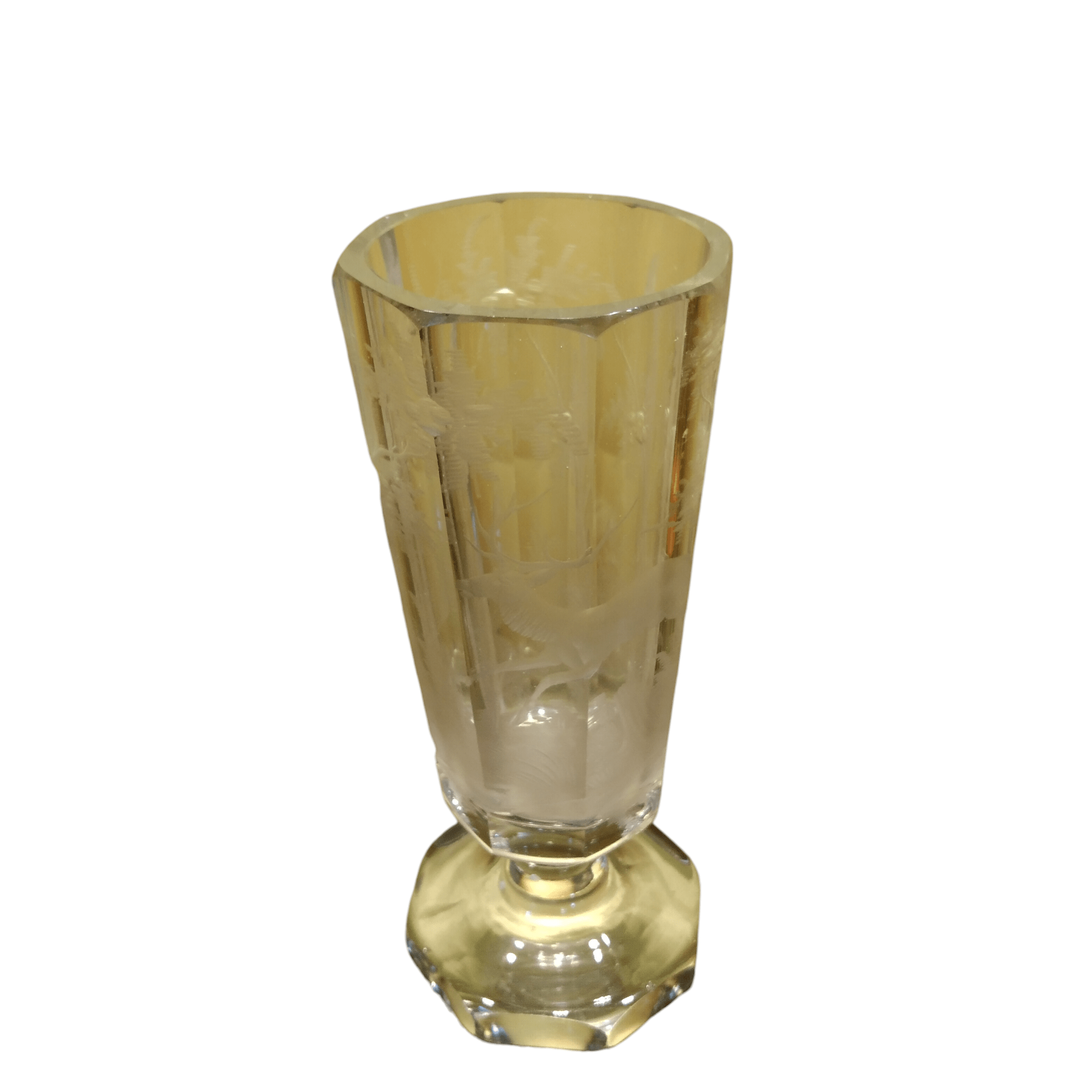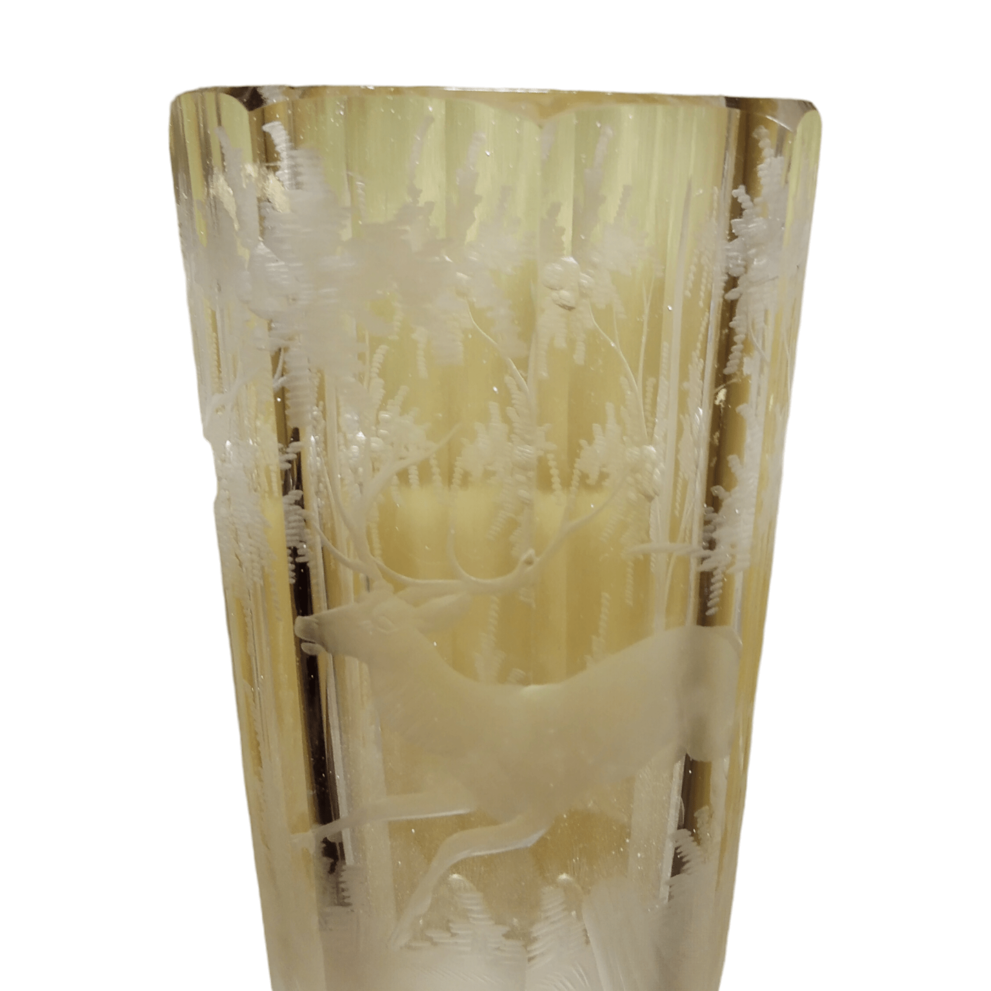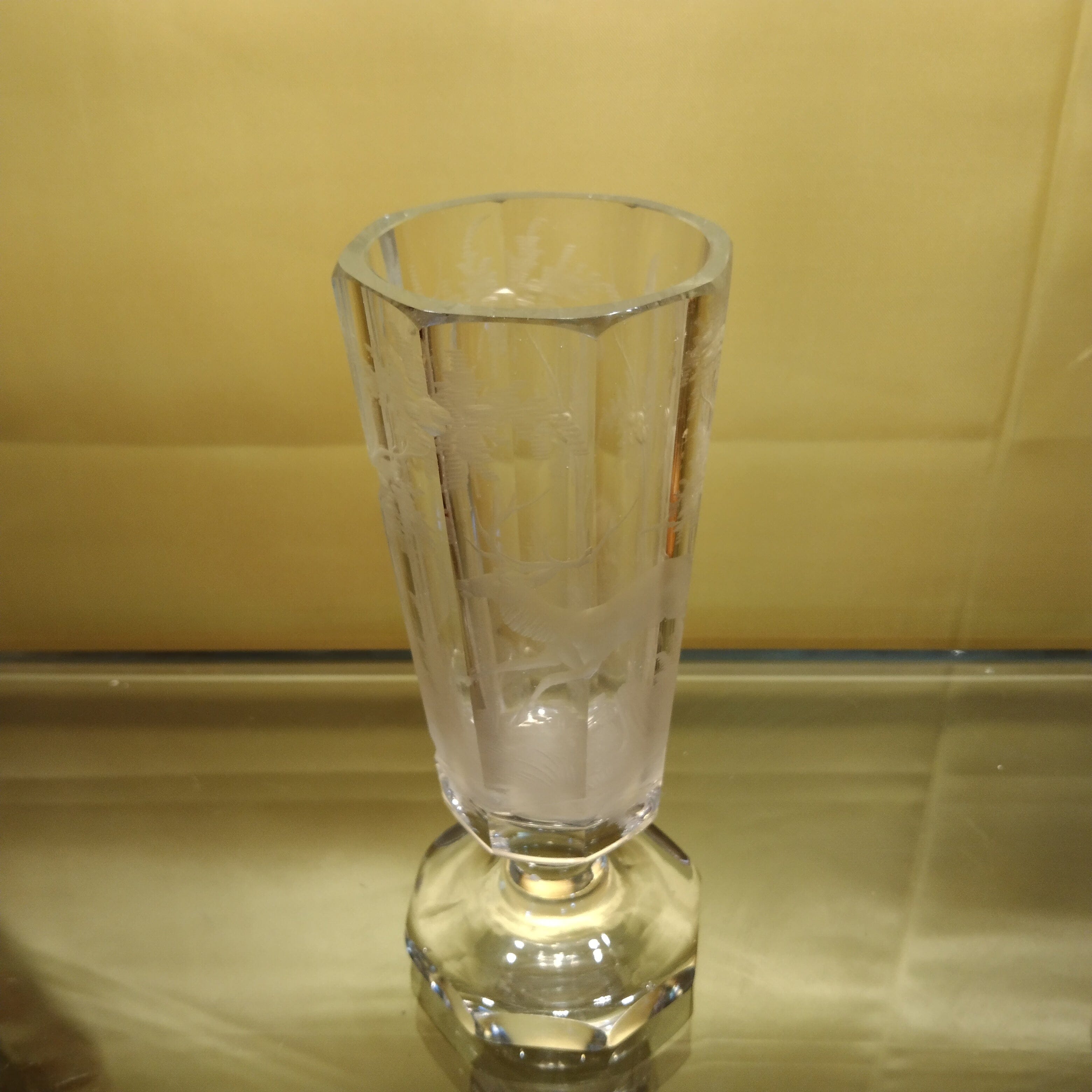 Bella copa de vidrio transparente, tratado al ácido, con diseños tallados representando a un mangnífico ciervo en un bosque.