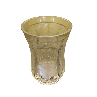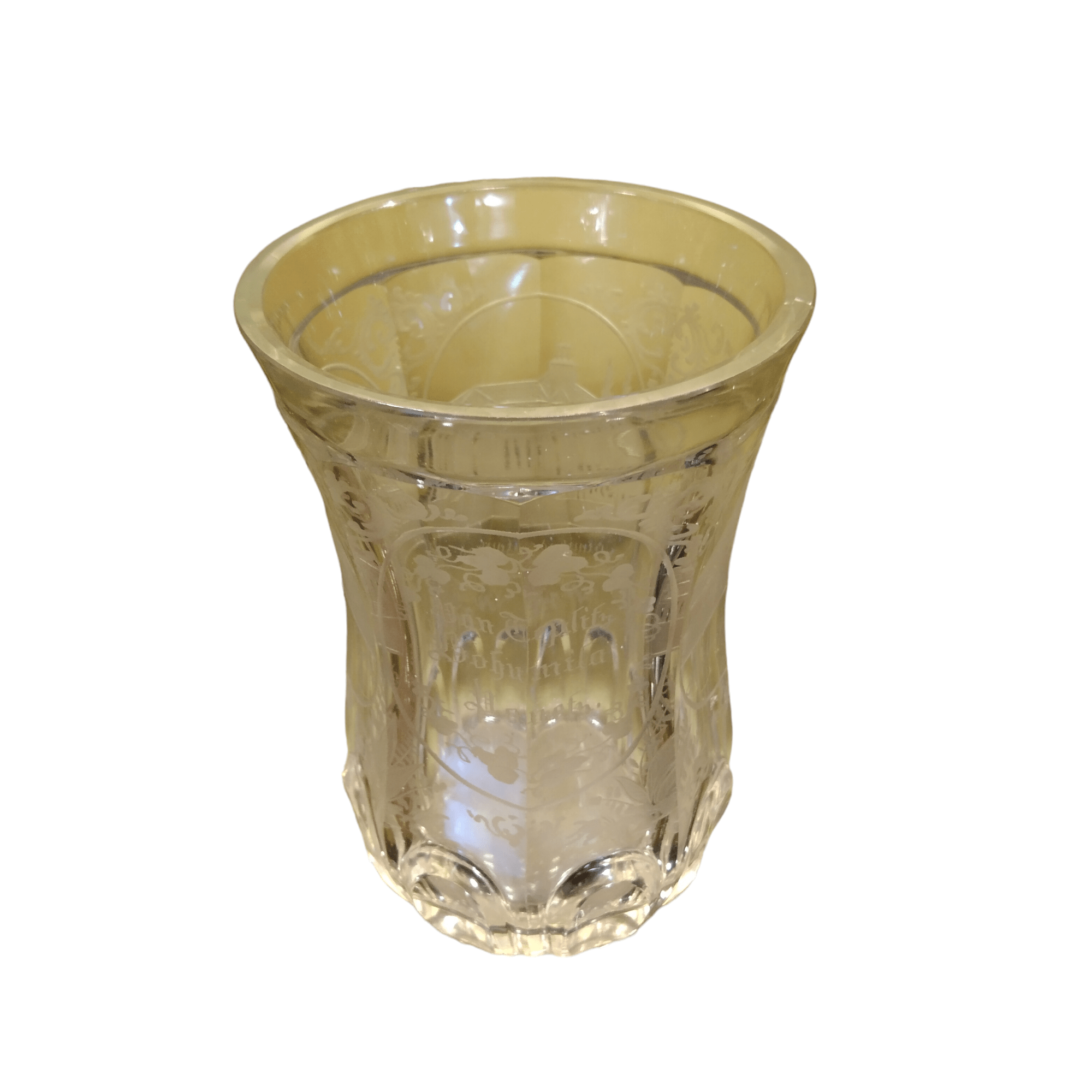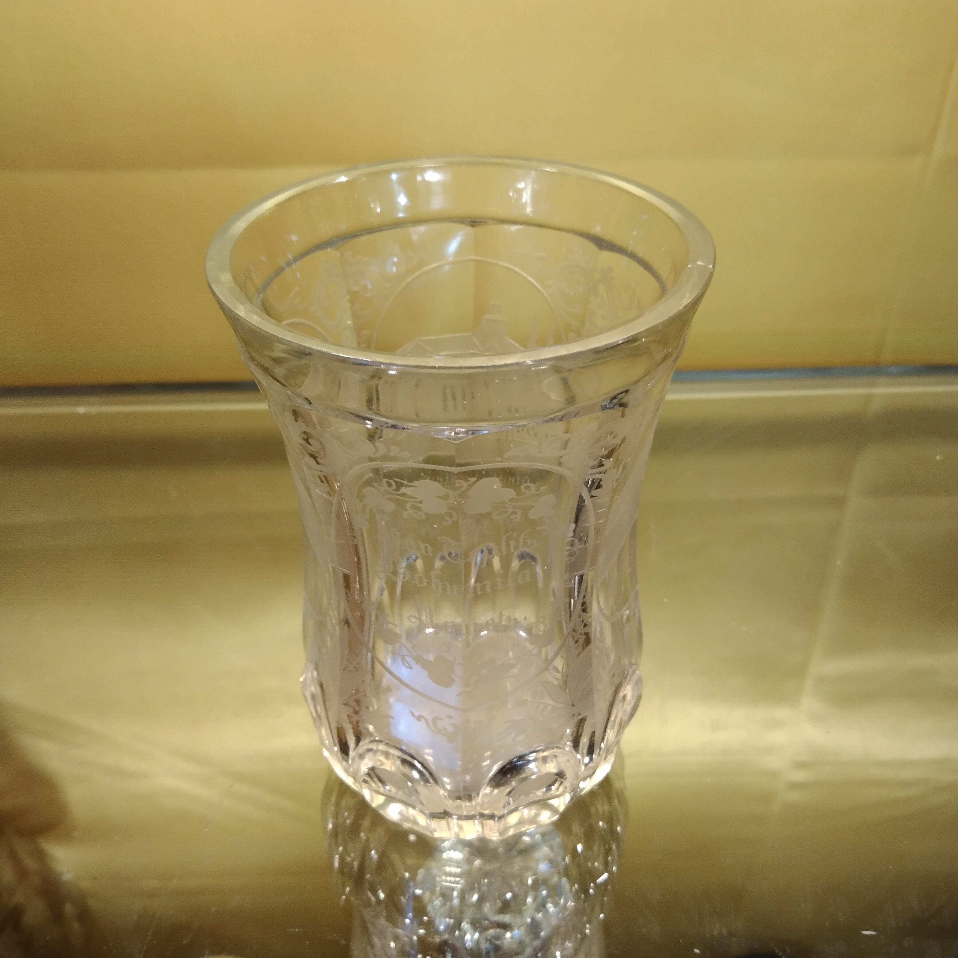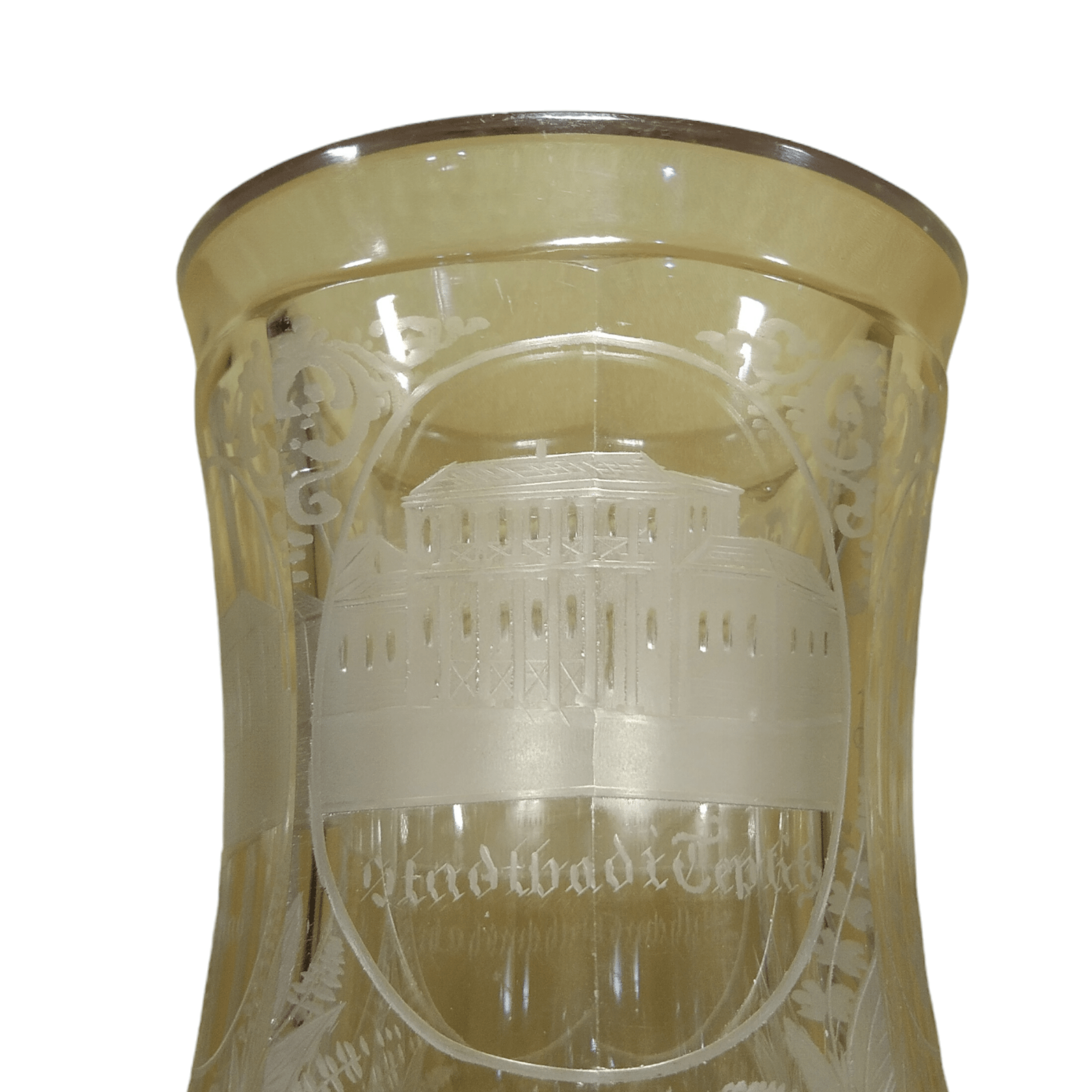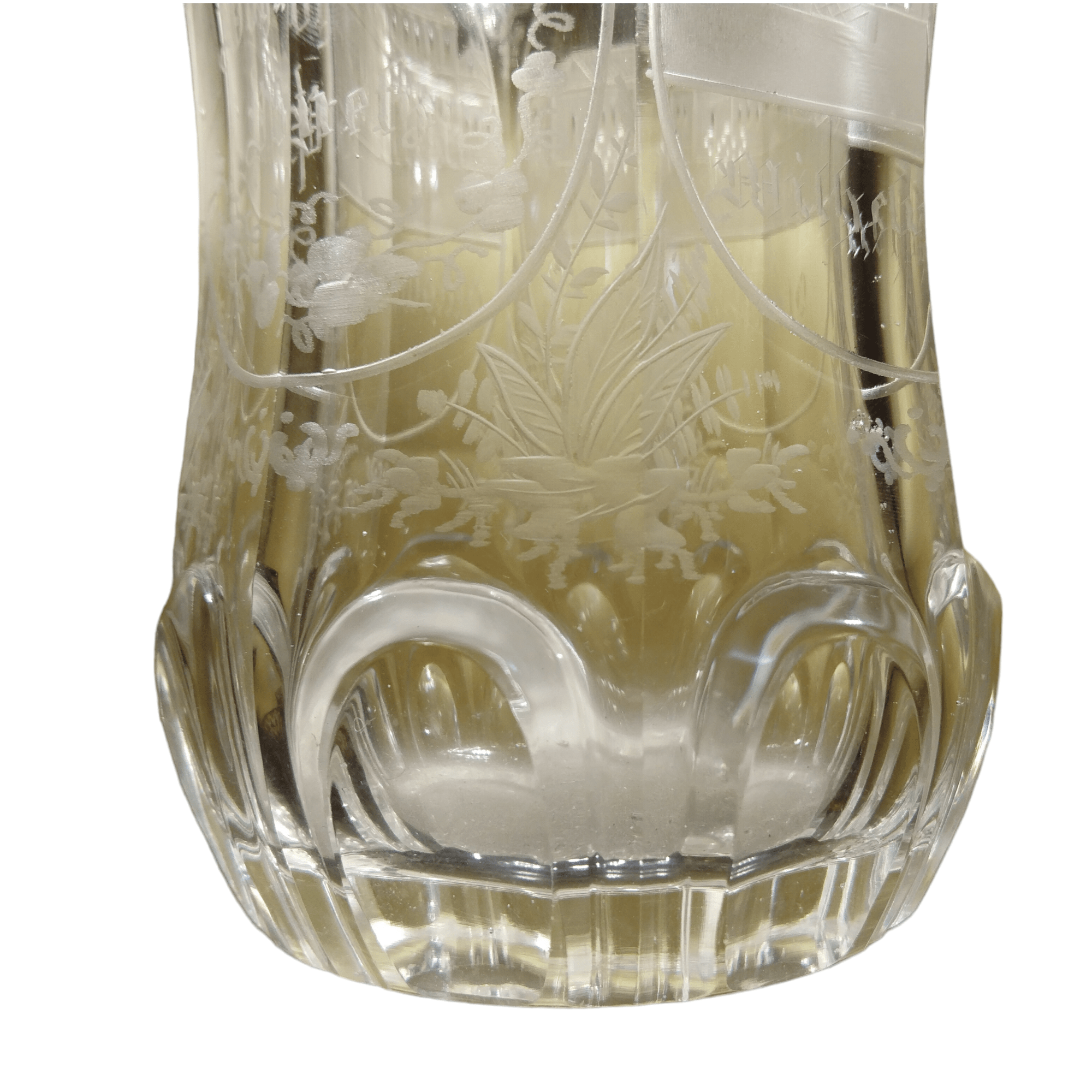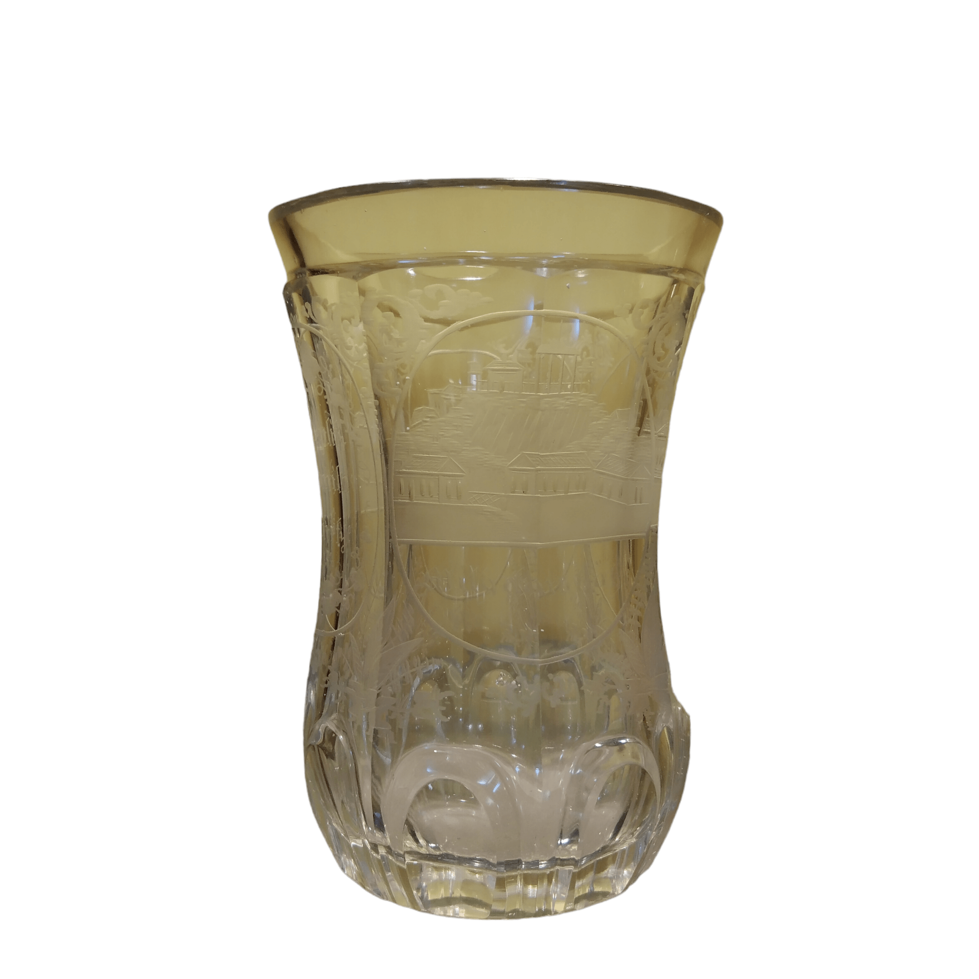 Elegante florero de vidrio transparente, de origen Checo, con bellos diseños tallados con diversos edificios y casas, junto a algunas aplicaciones y motivos vegetales.