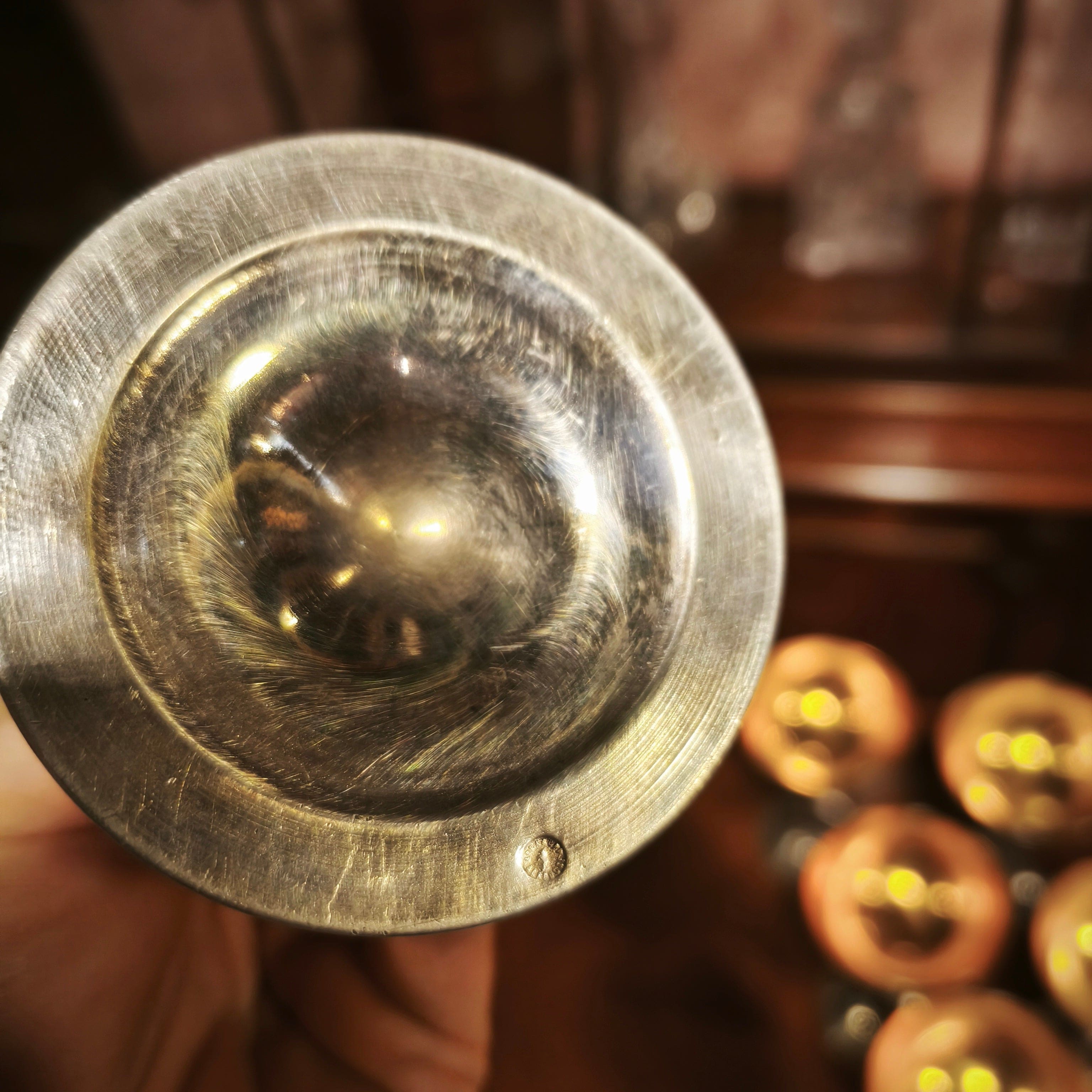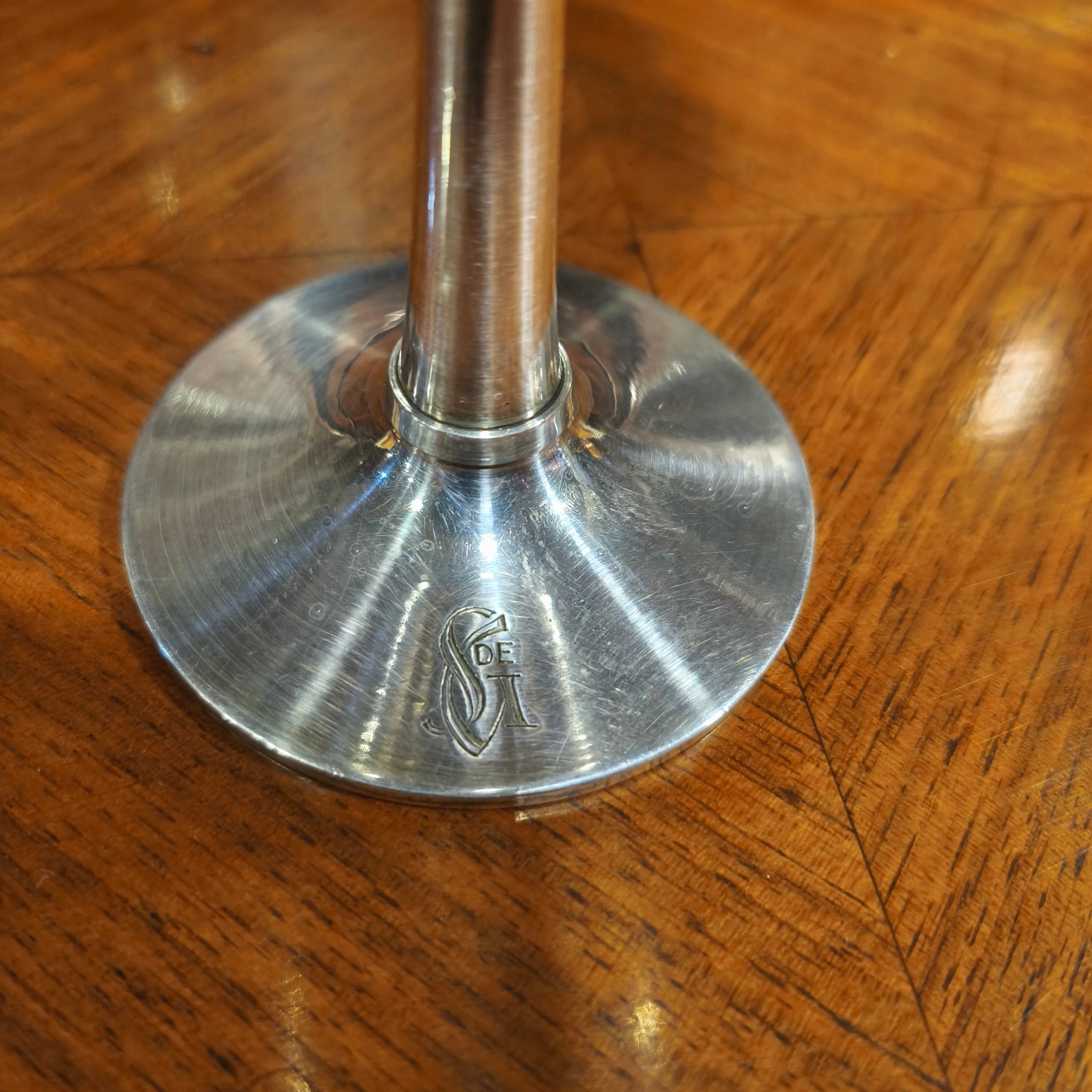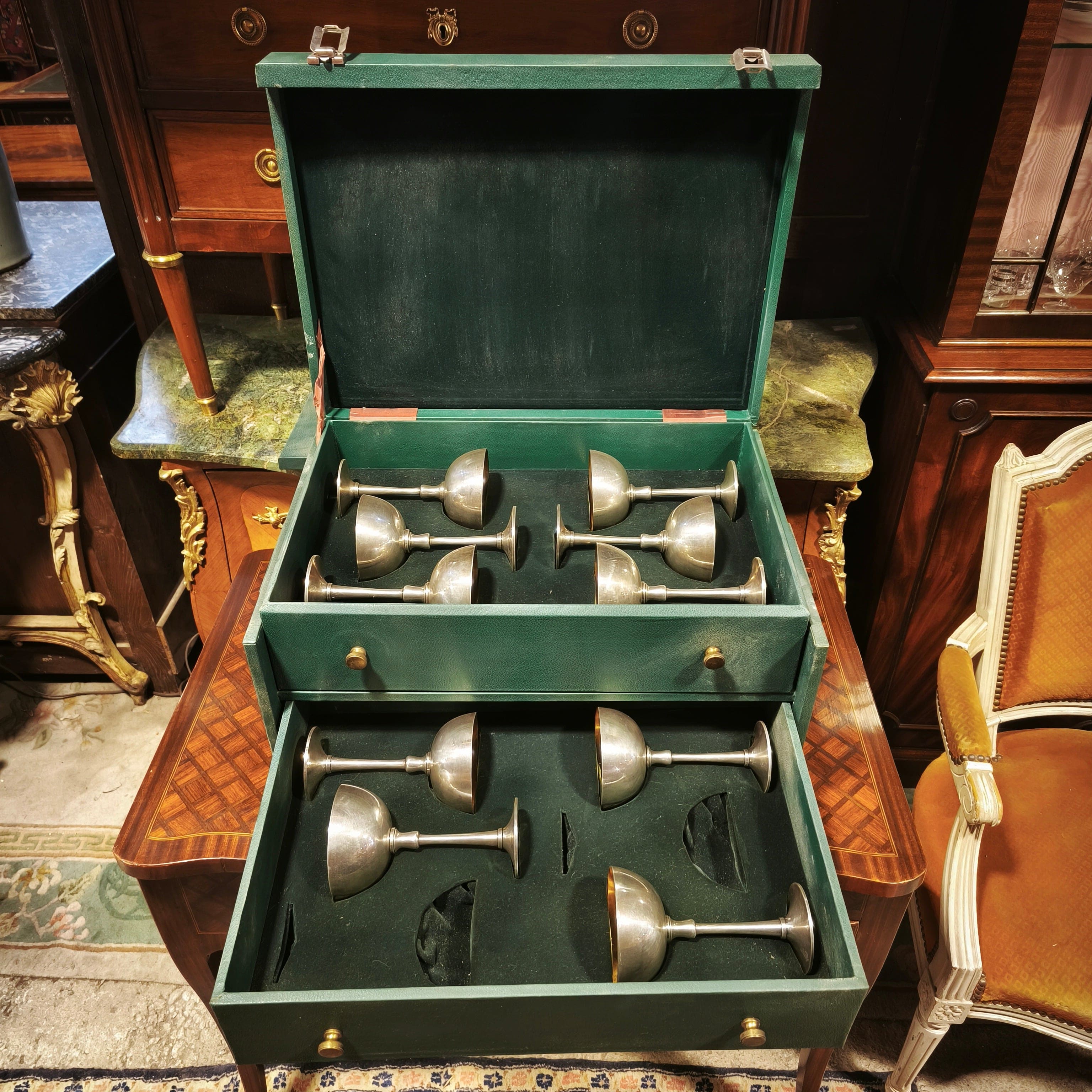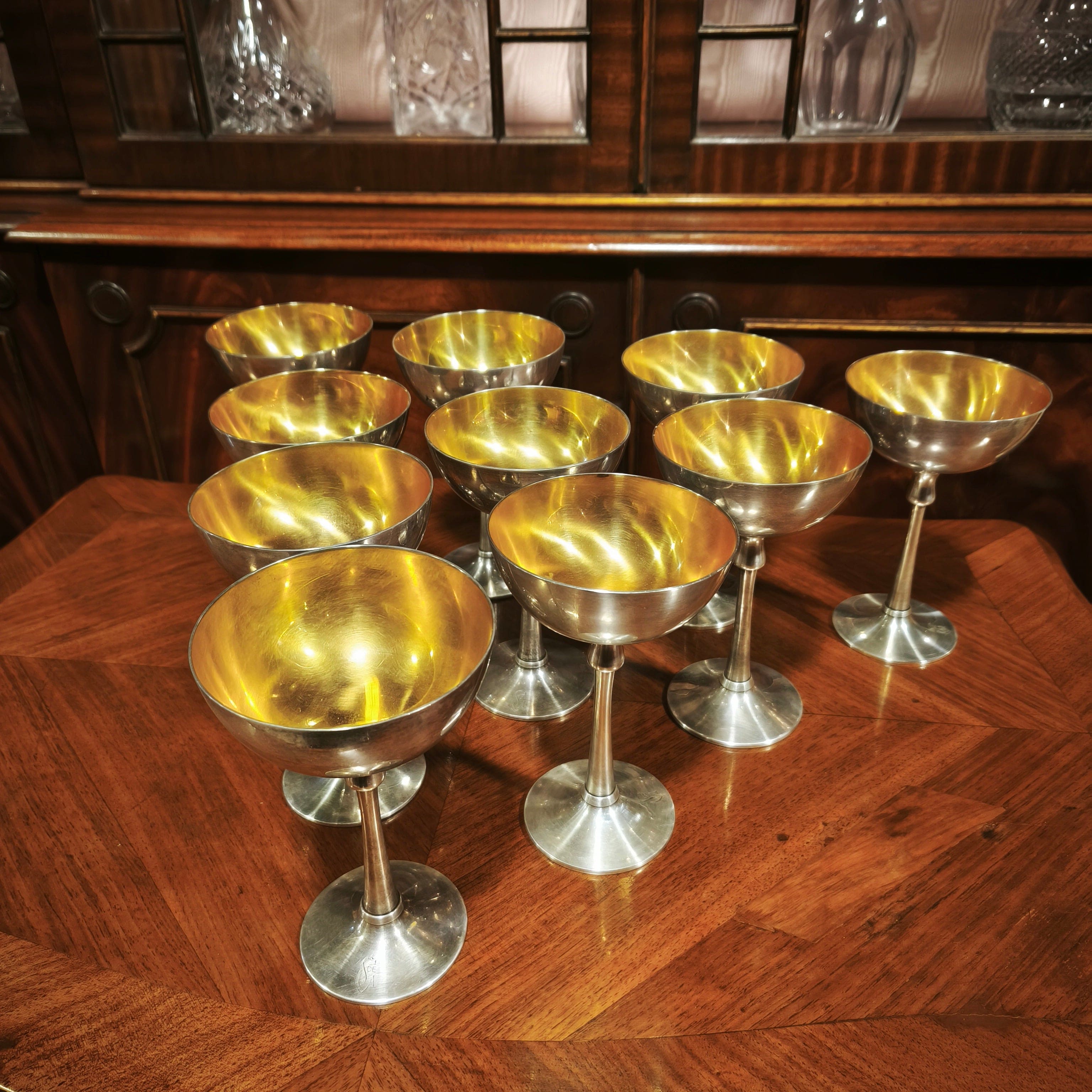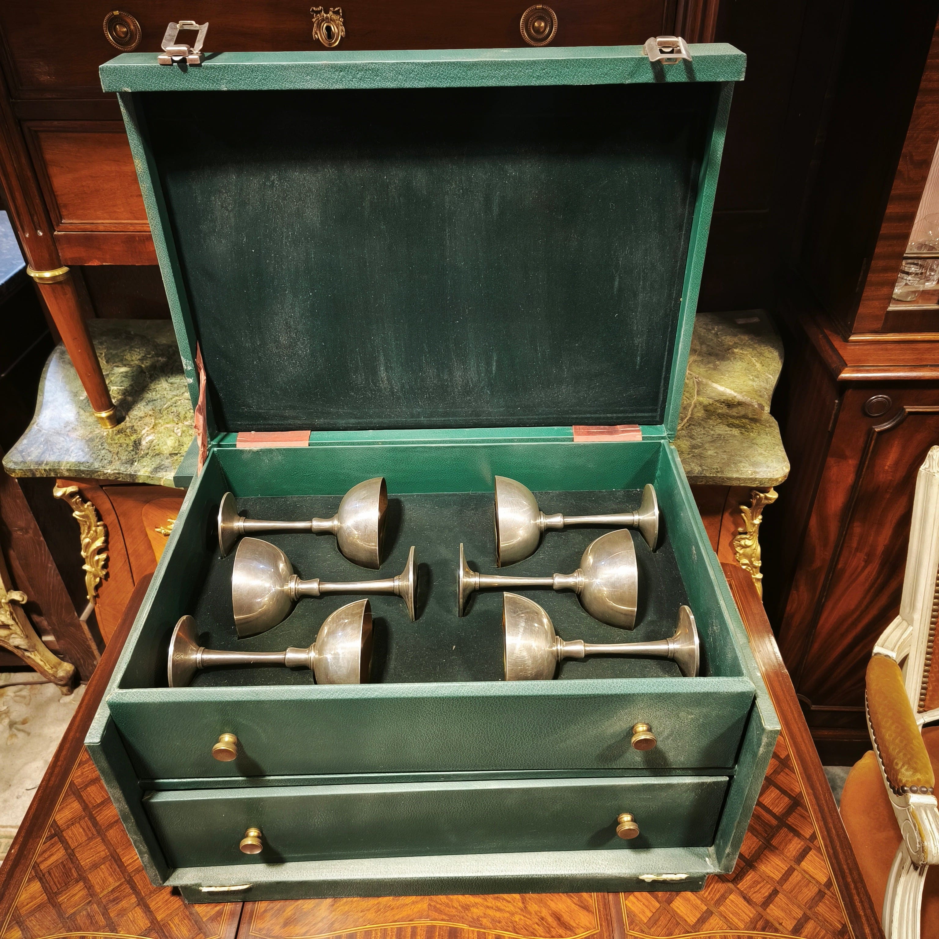 Juego de 10 copas de plaqué vermeil, de la reconocida marca metalúrgica de origen Austriaco Art Krupp Berndorf, con un elegante y sobrio diseño con el interior de la copa en baño de oro y las iniciales S de G en su base. El copon es desmontable de su mango para la limpieza. El juego viene con su cofre original de madera y recubrimiento de cuero verde, de dos cajones para almacenar las copas.