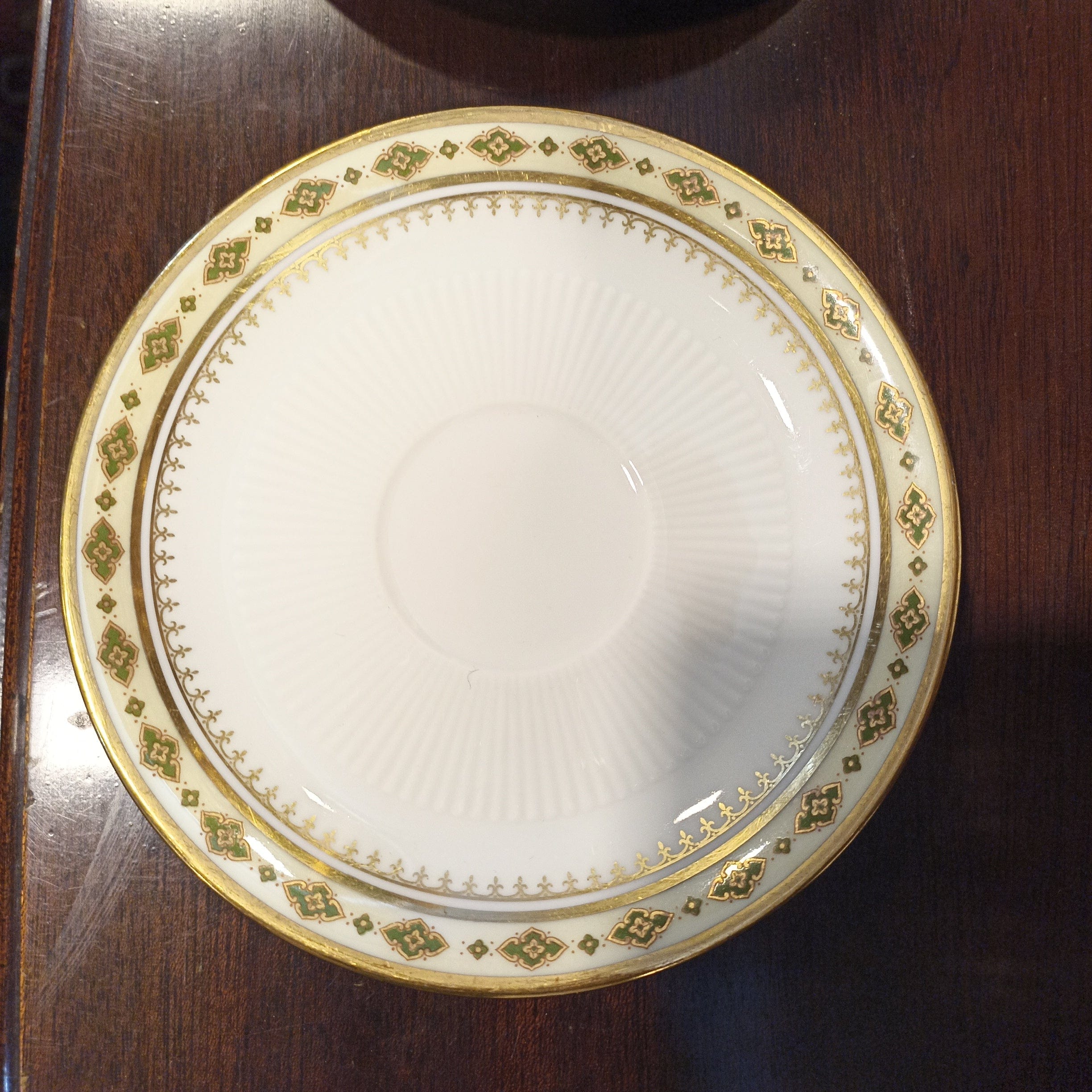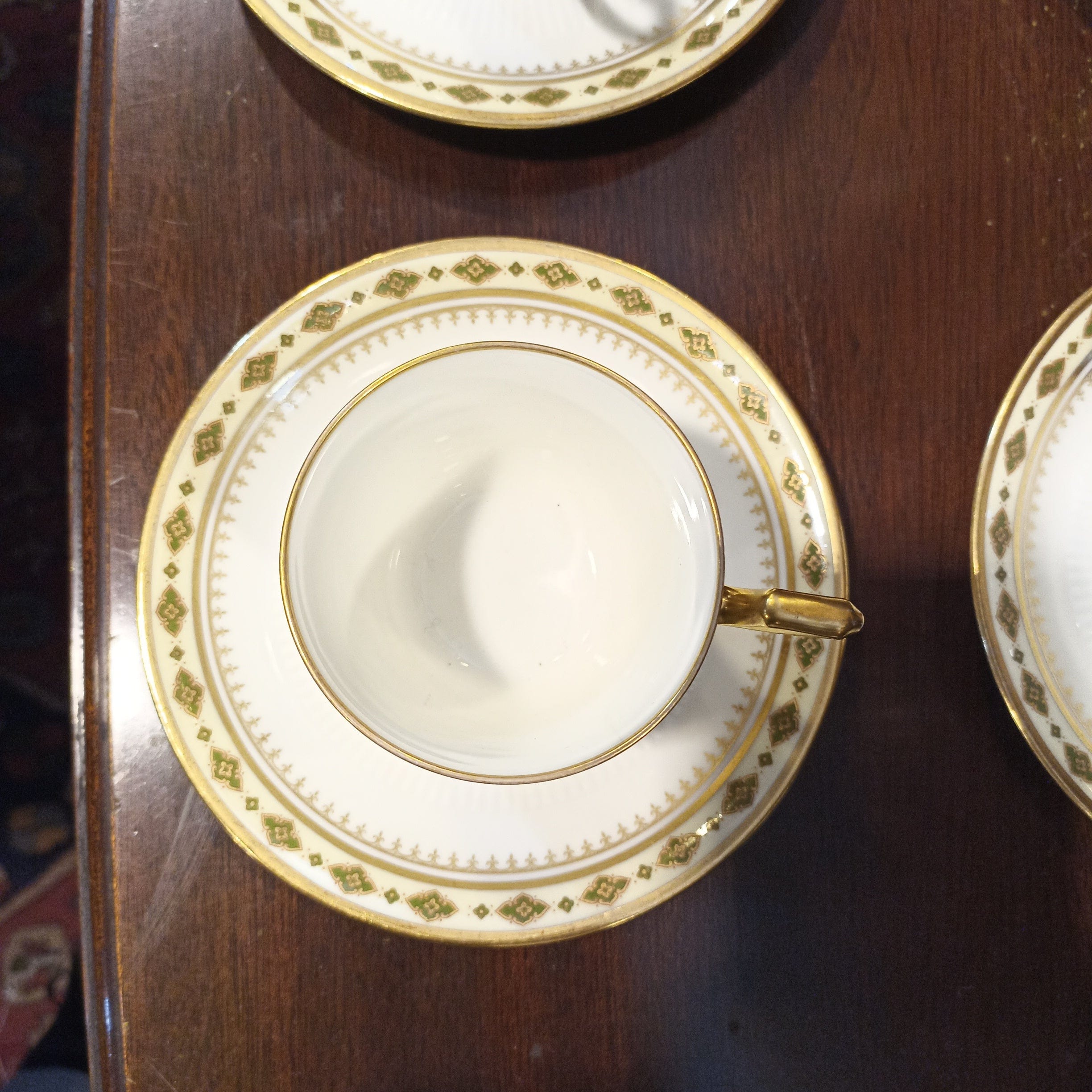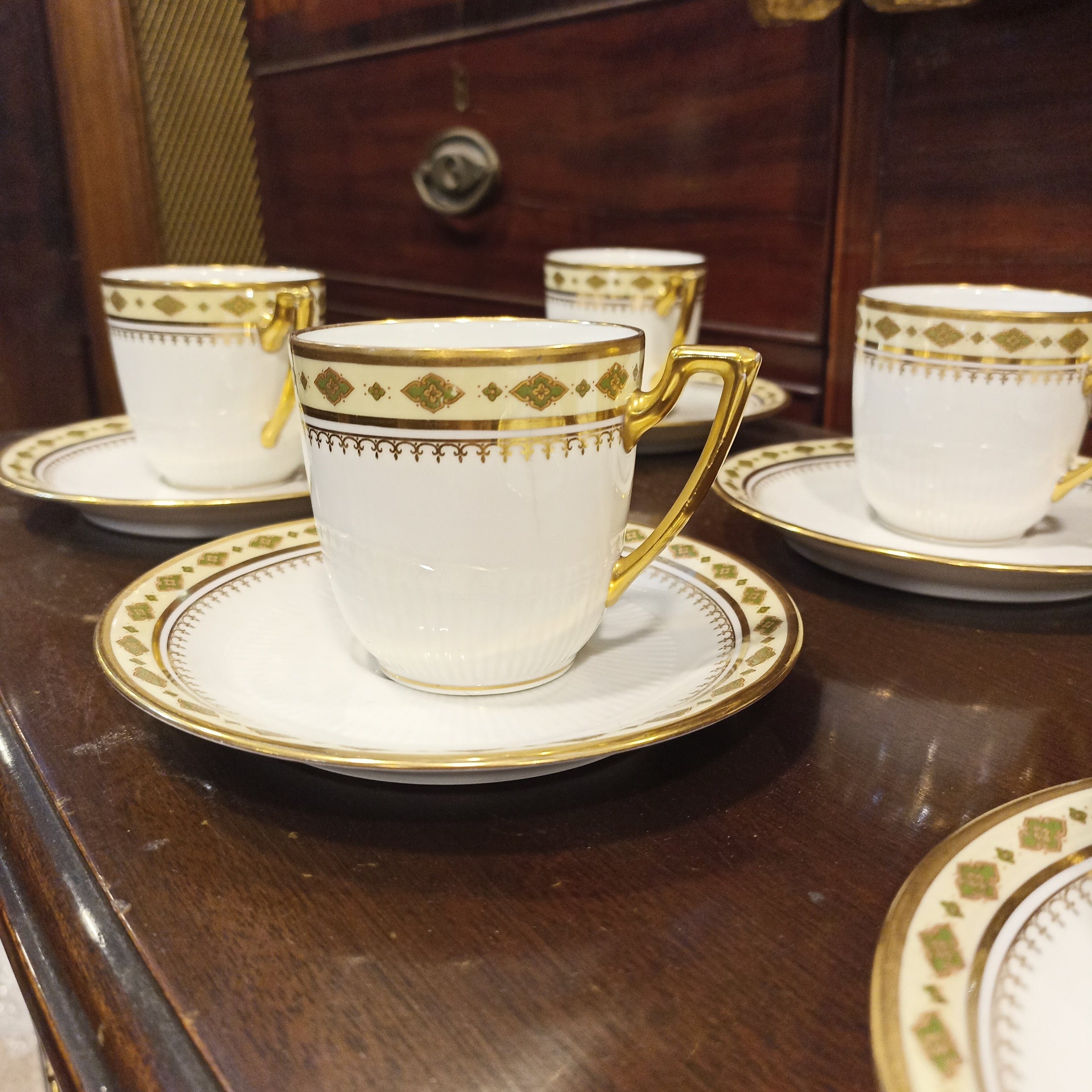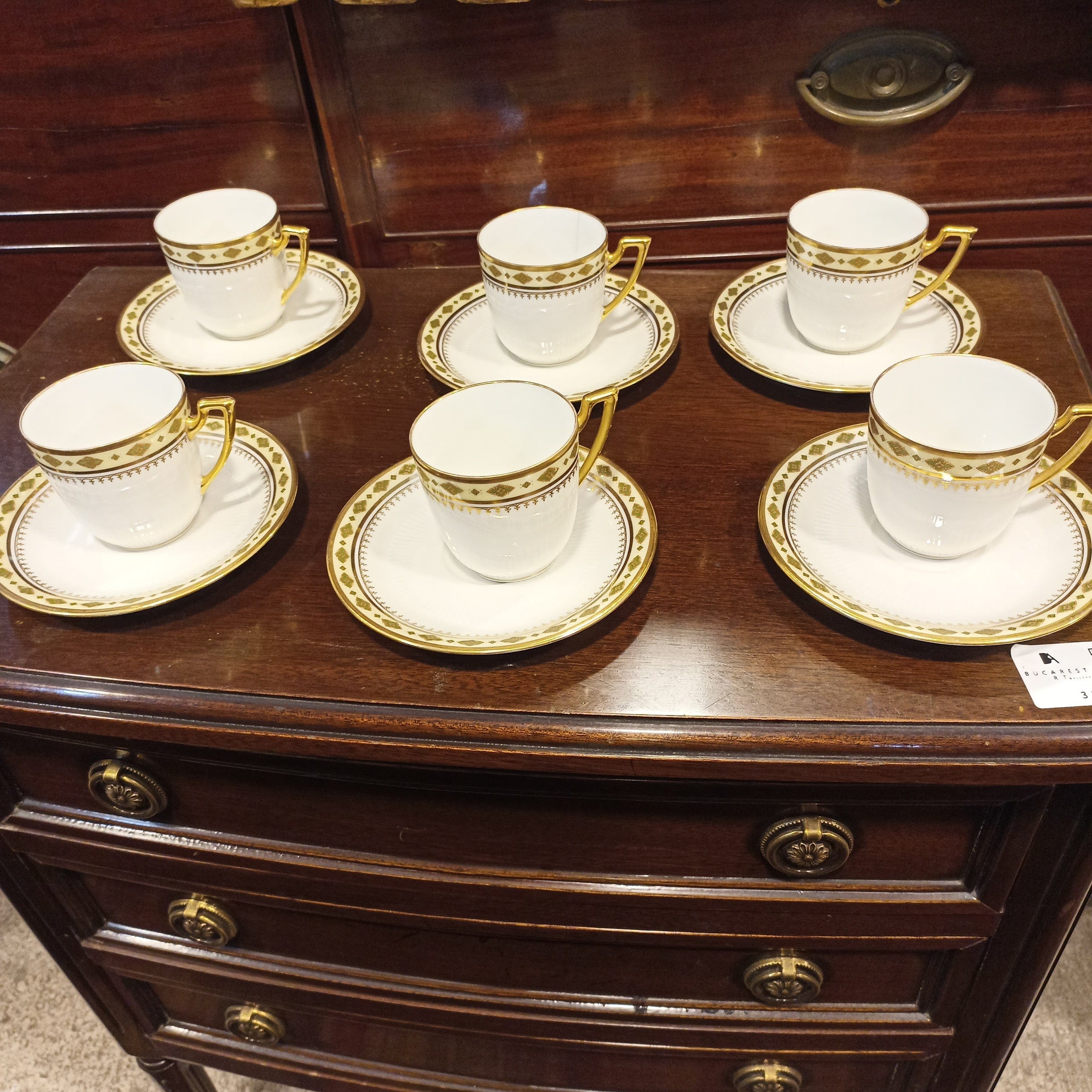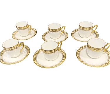 Fino juego de porcelana de seis tazas de café, de la renombrada Limoges, P. P. Guarda con diseño en dorado y otros colores.