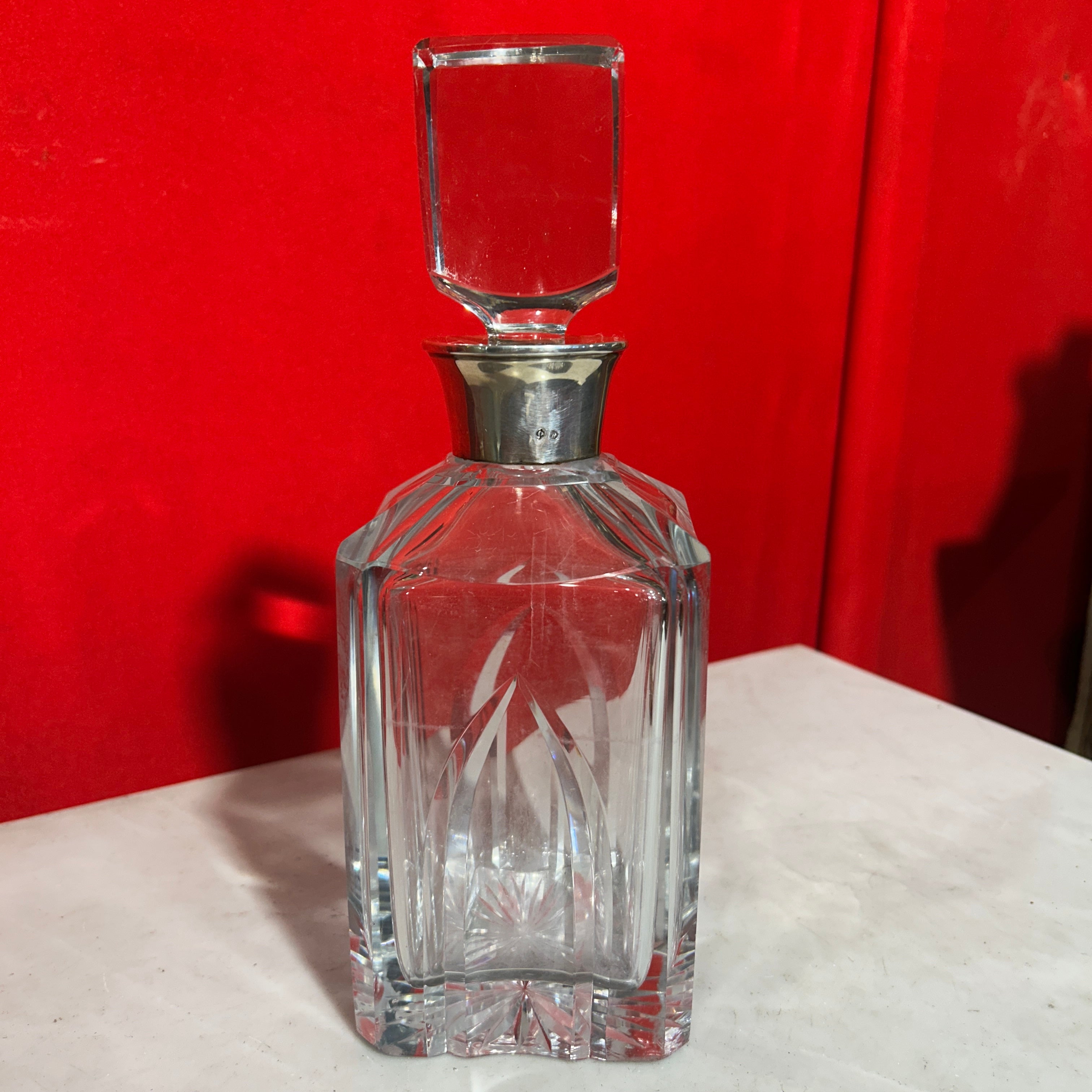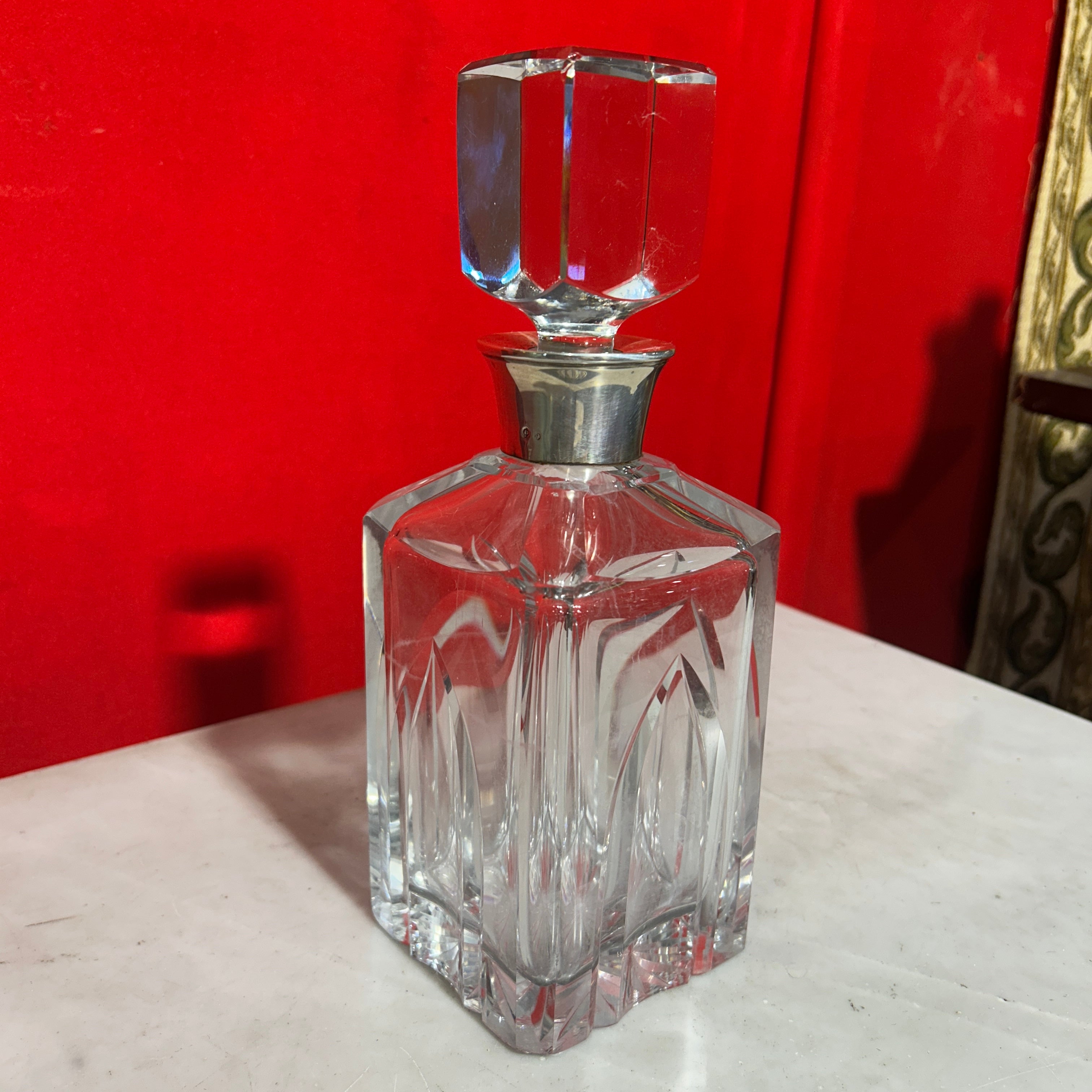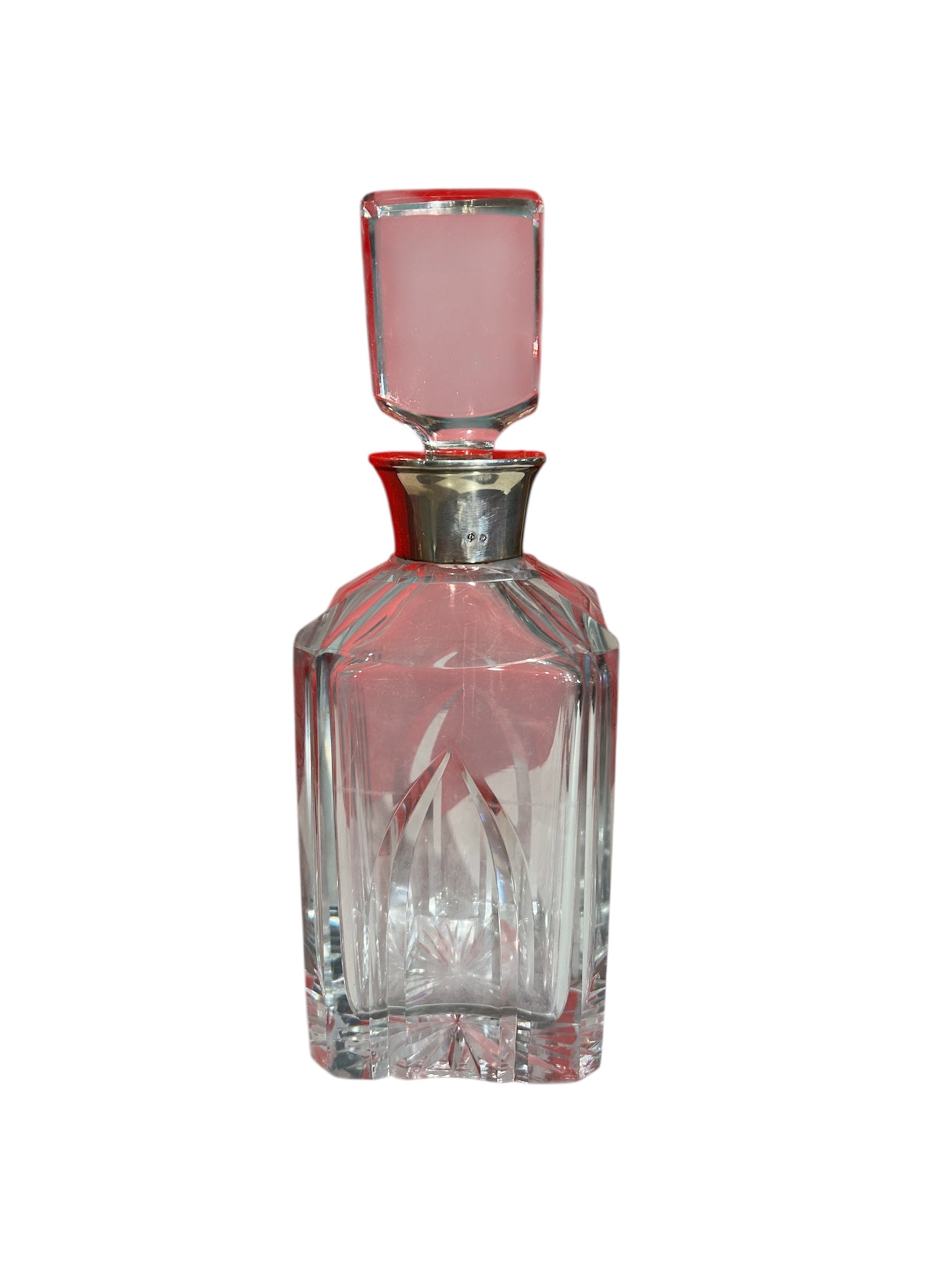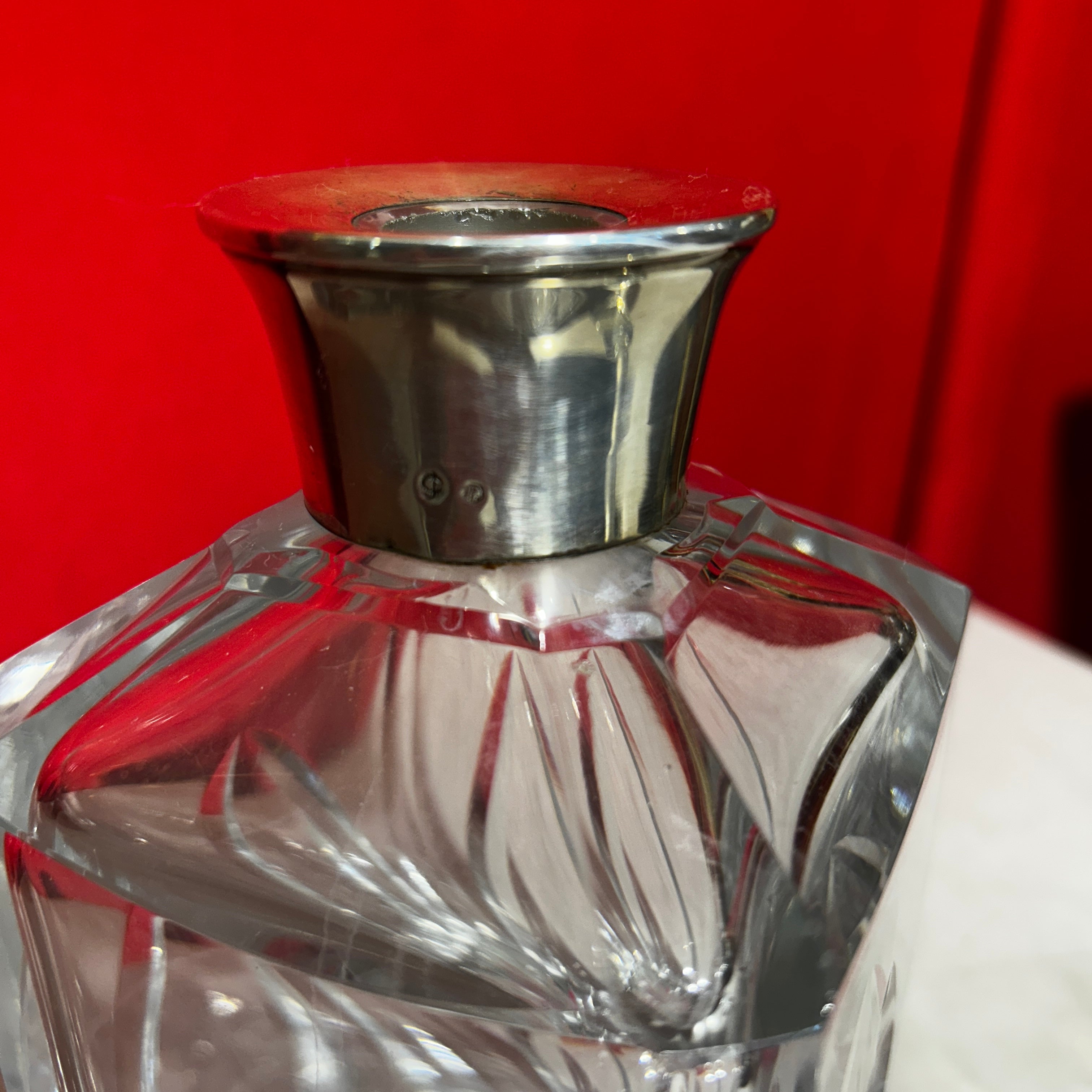 Hermosa licorera de cristal rectangular con goyete de plata y tapa cuadrada.
