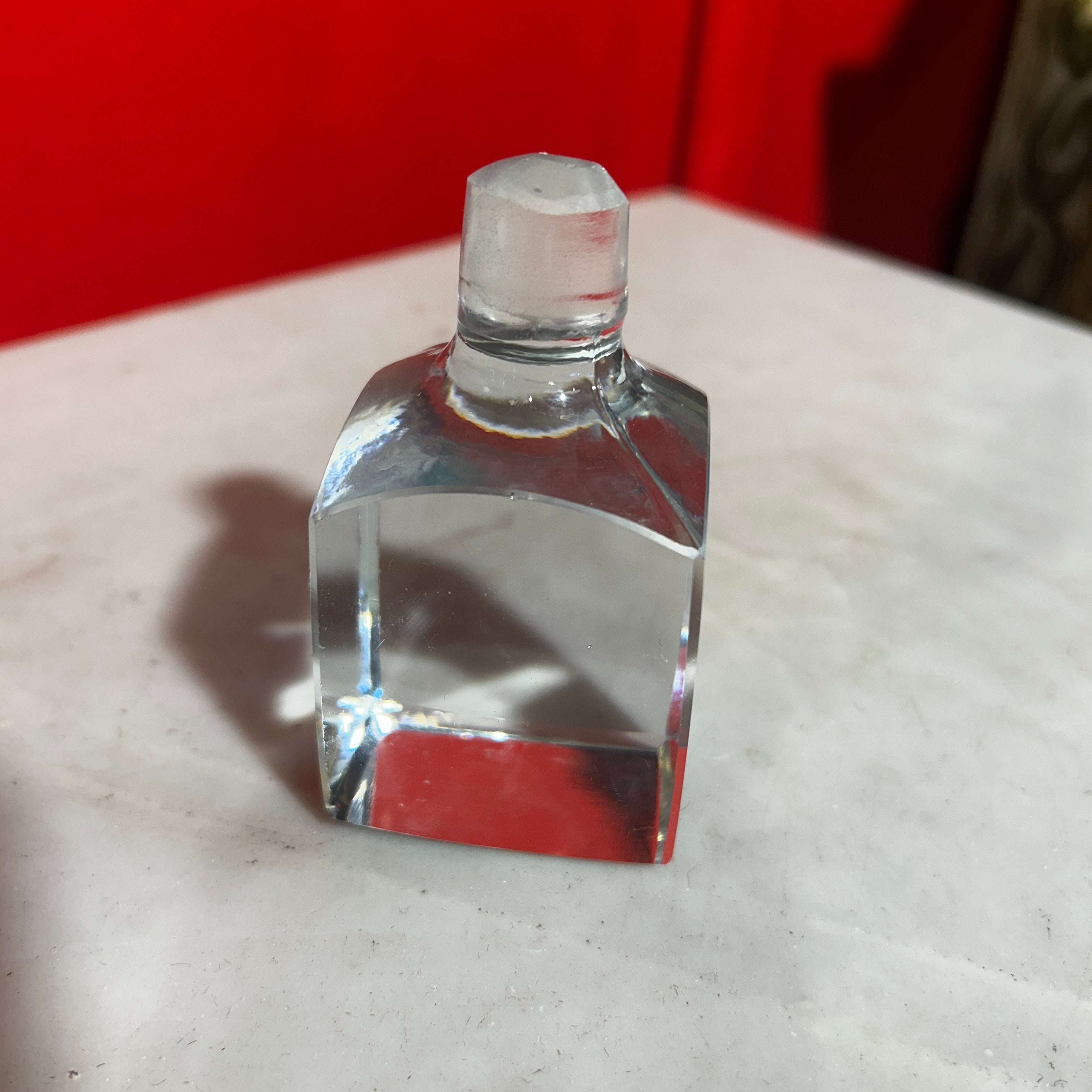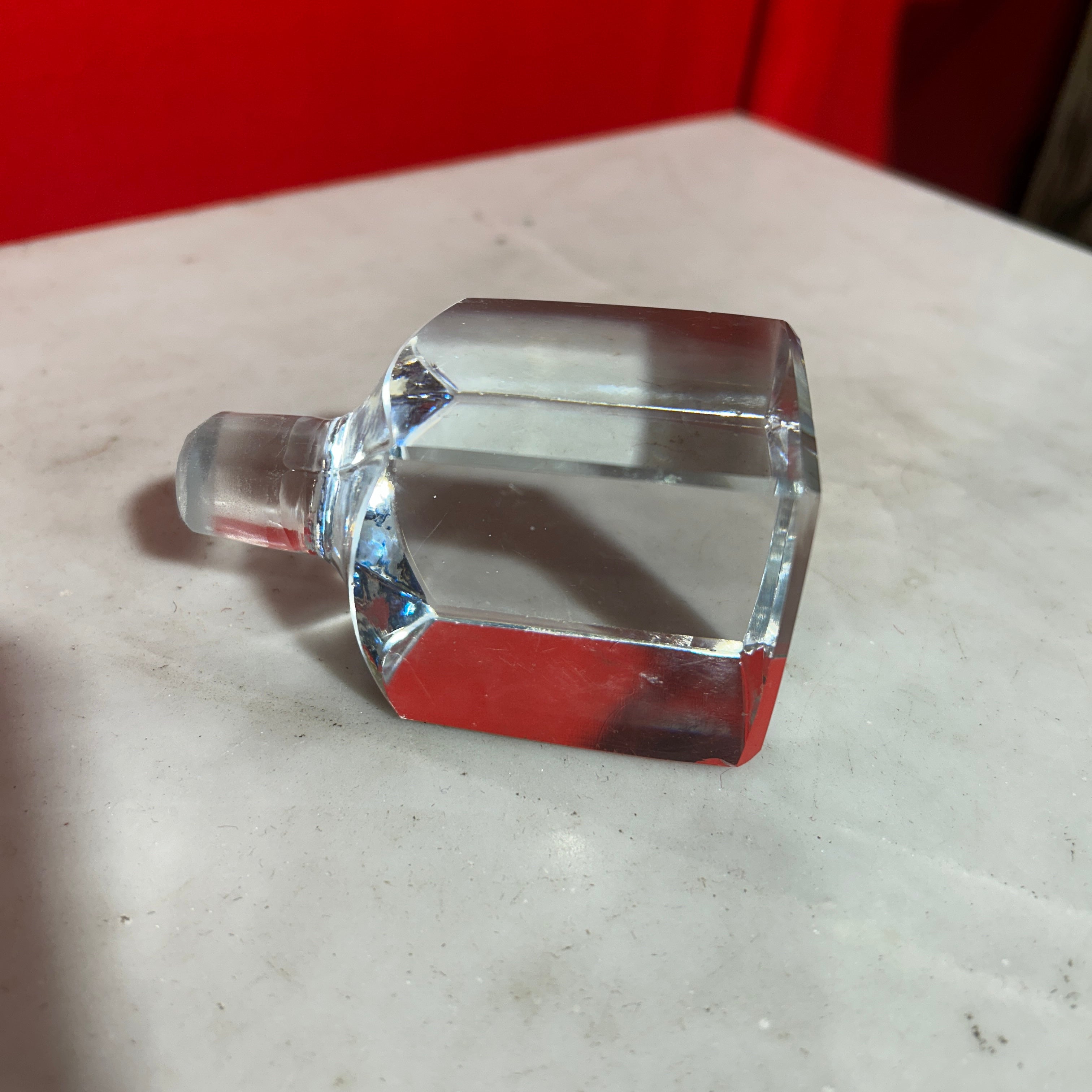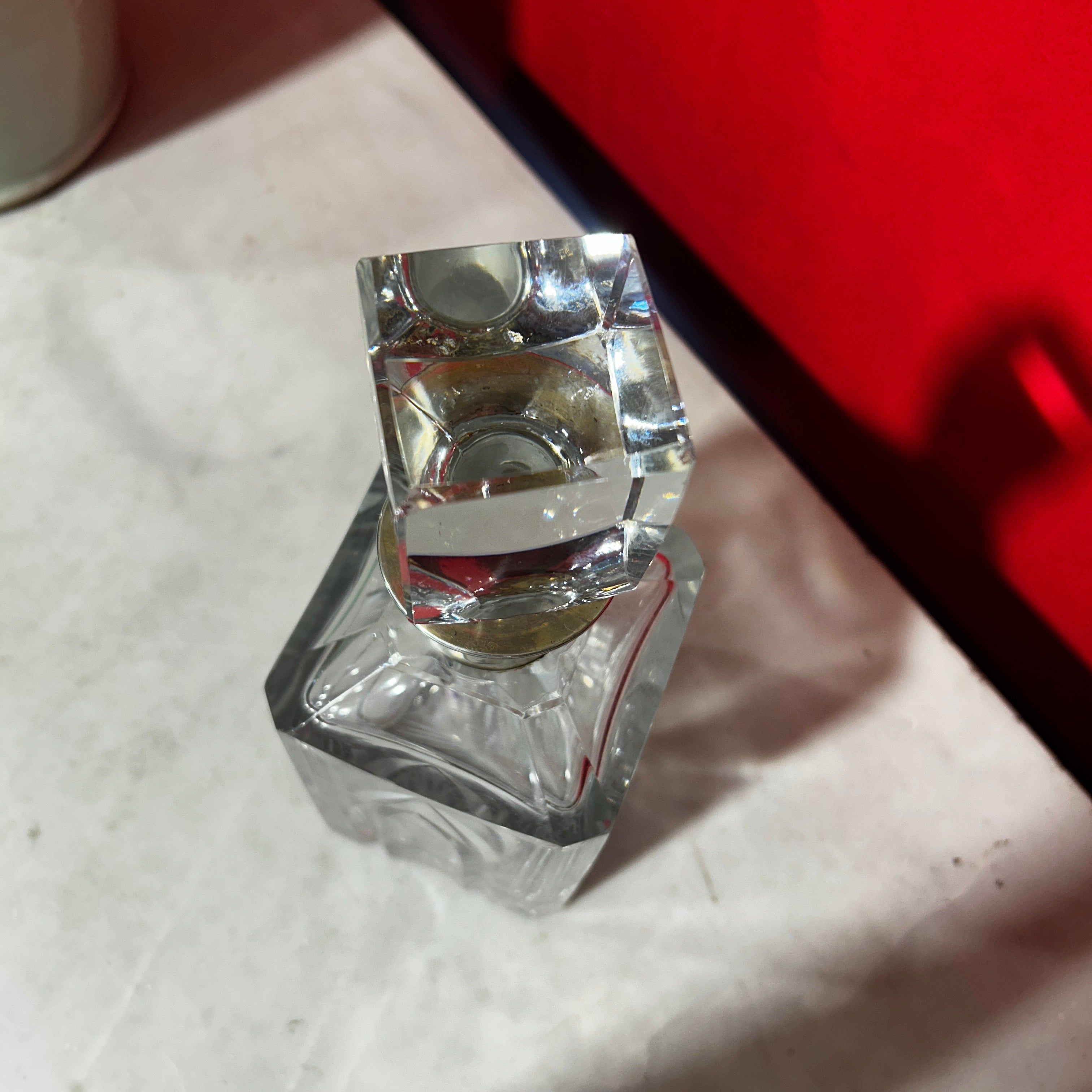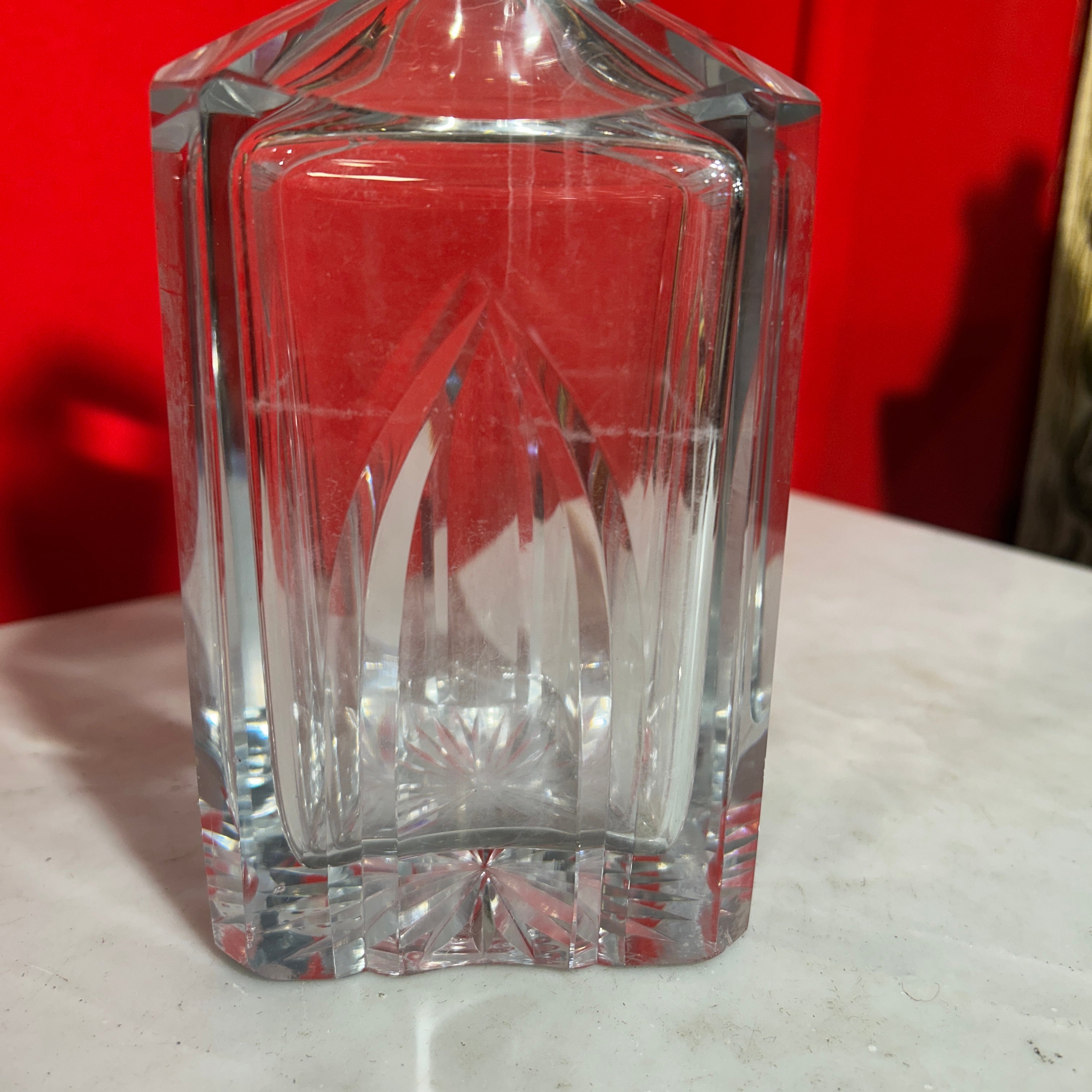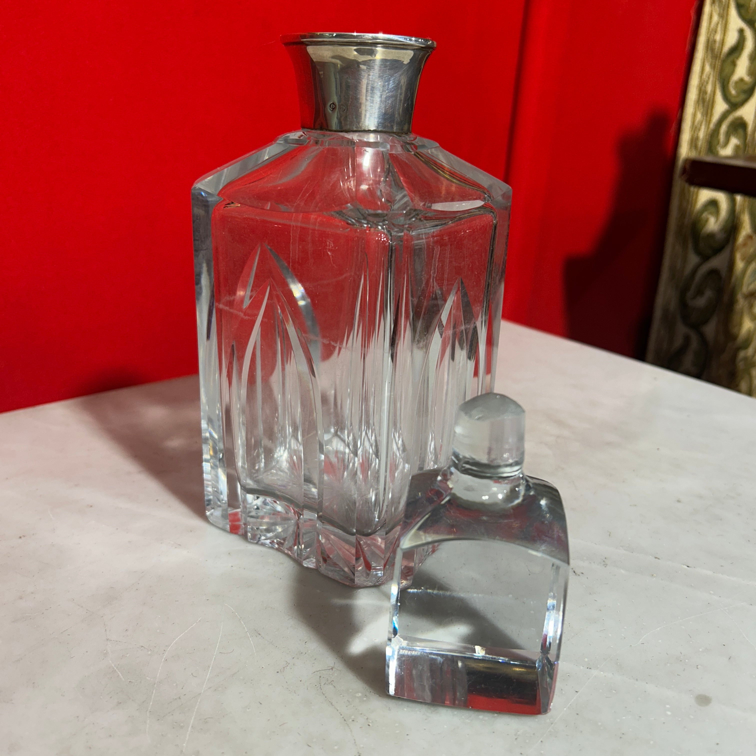 Hermosa licorera de cristal rectangular con goyete de plata y tapa cuadrada.