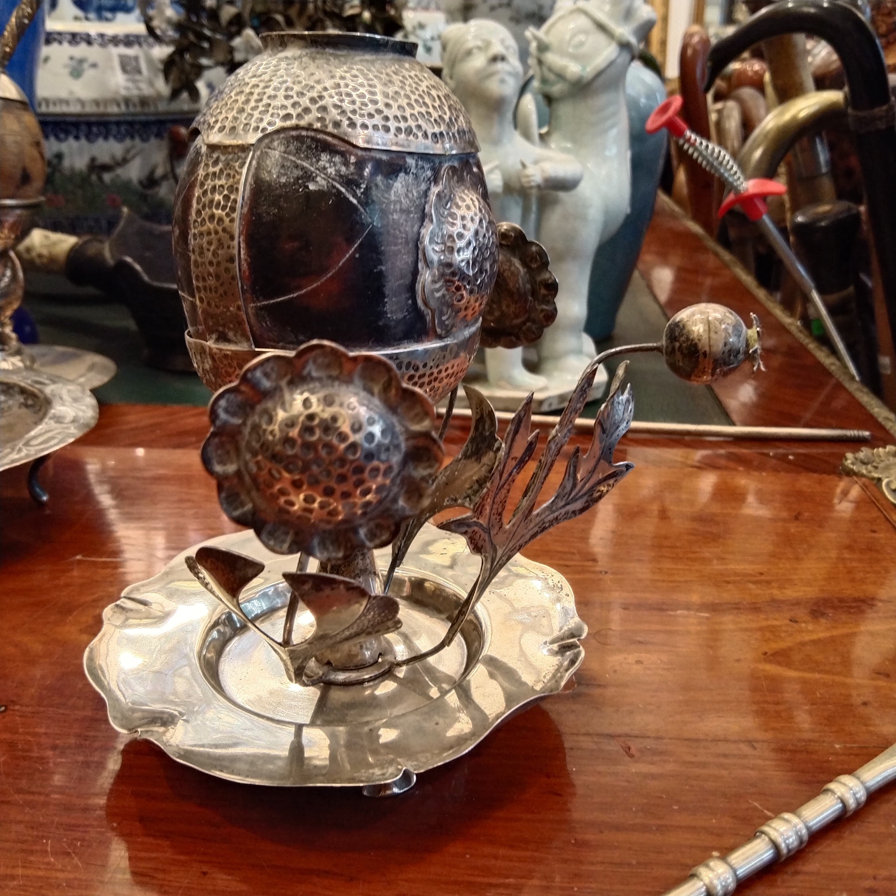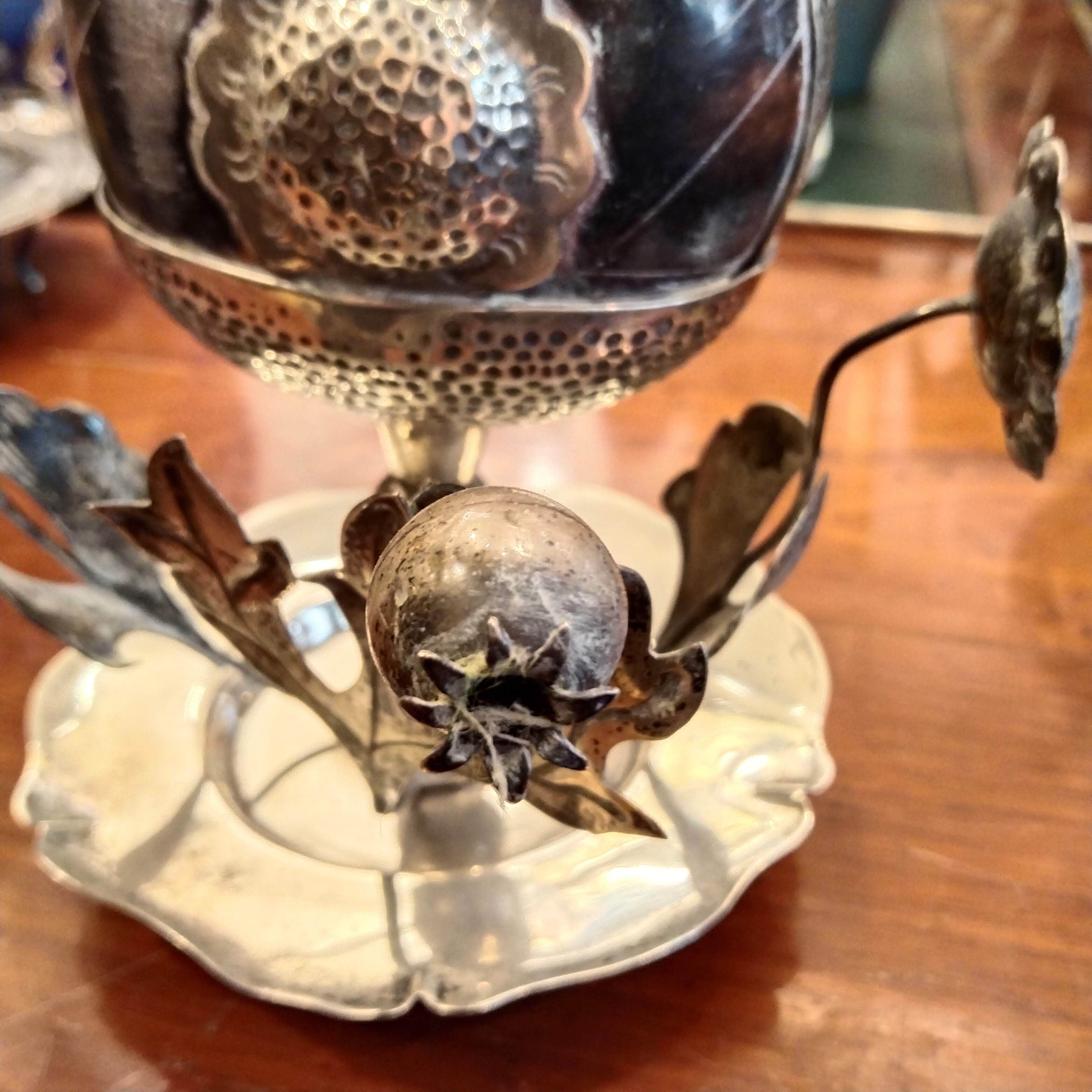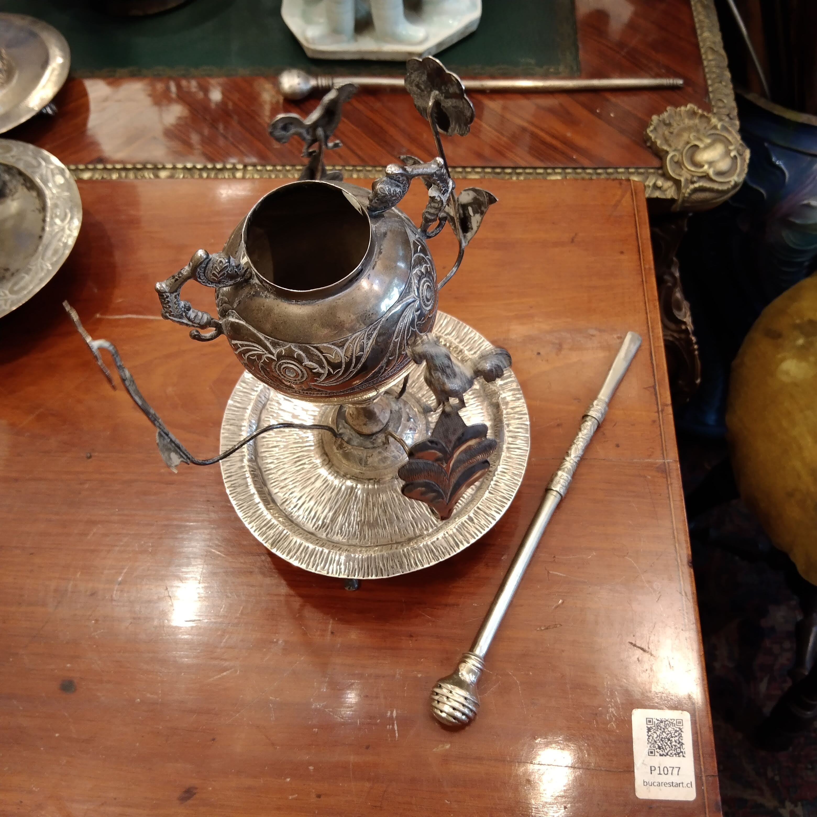 Bellísimo mate de plata antiguo con centro de calabaza y diseños tallados a mano, dándole una particula textura en relieve a la pieza, junto a aplicaciones con forma girasoles y granadas a su alrededor.