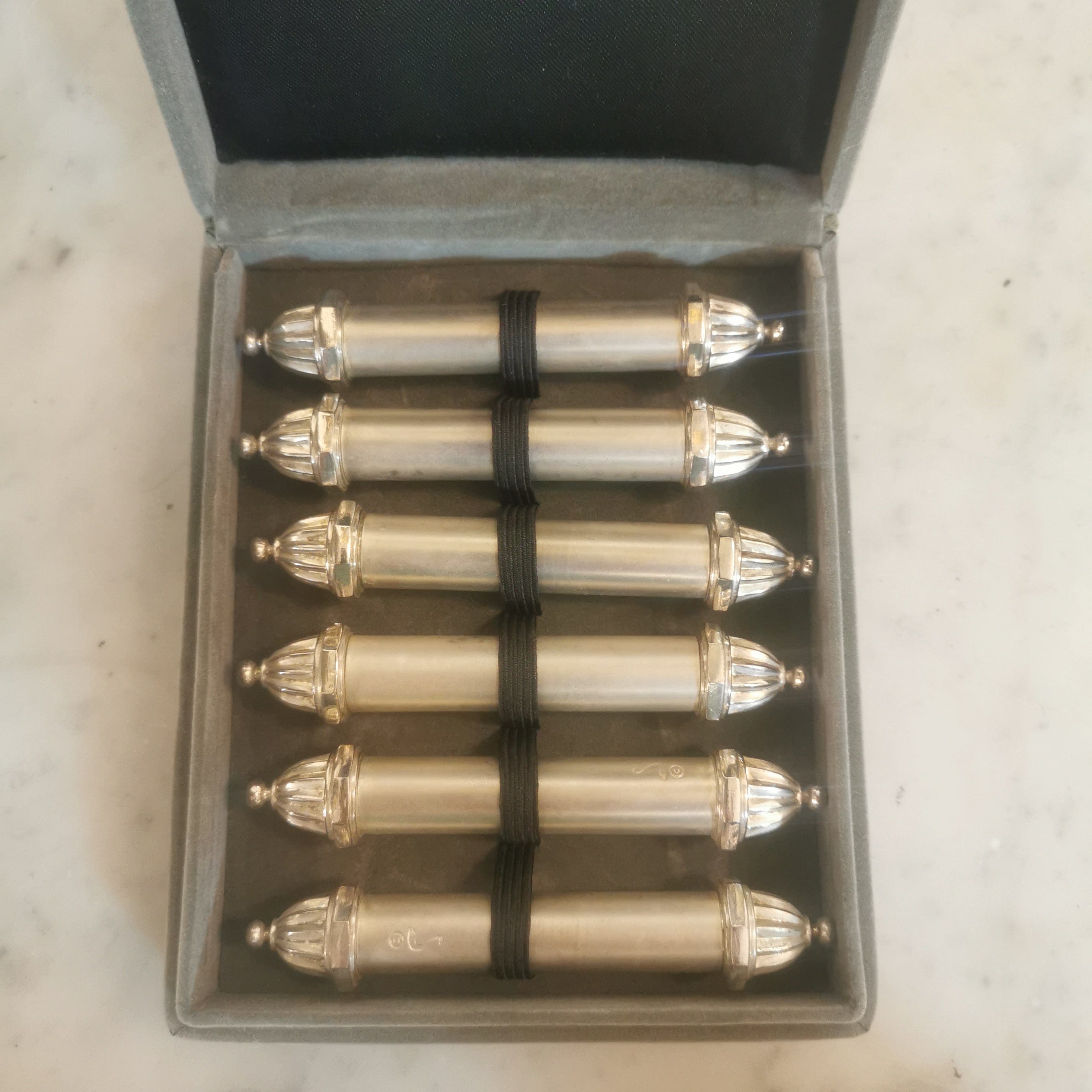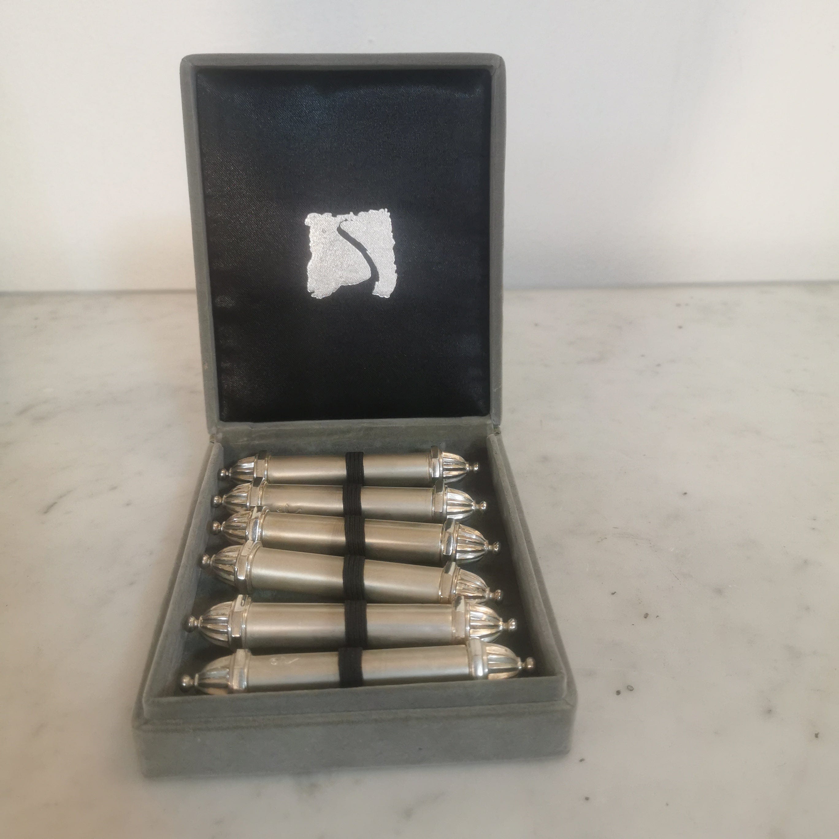 Set de seis posa cubiertos de metal plateado Silea. Especial accesorio para adornar la mesa. El set viene en una cajita de felpa gris.