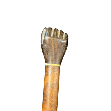 Bello bastón de madera de jacarandá con diseño de mano empuñada en su mango y aplicación en hueso animal. La madera tiene vetas bicolor que arman un bello diseño.