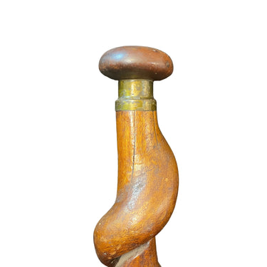 Llamativo bastón de madera tallada en una sola pieza, con diseño curvo y grueso, con vetas notorias, dándole un acabado rústico. El mango redondo tiene una pieza de bronce que lo separa del resto del bastón. Se trata de una pieza que mezcla lo funcional y lo escultórico. Su taco es de plomo.