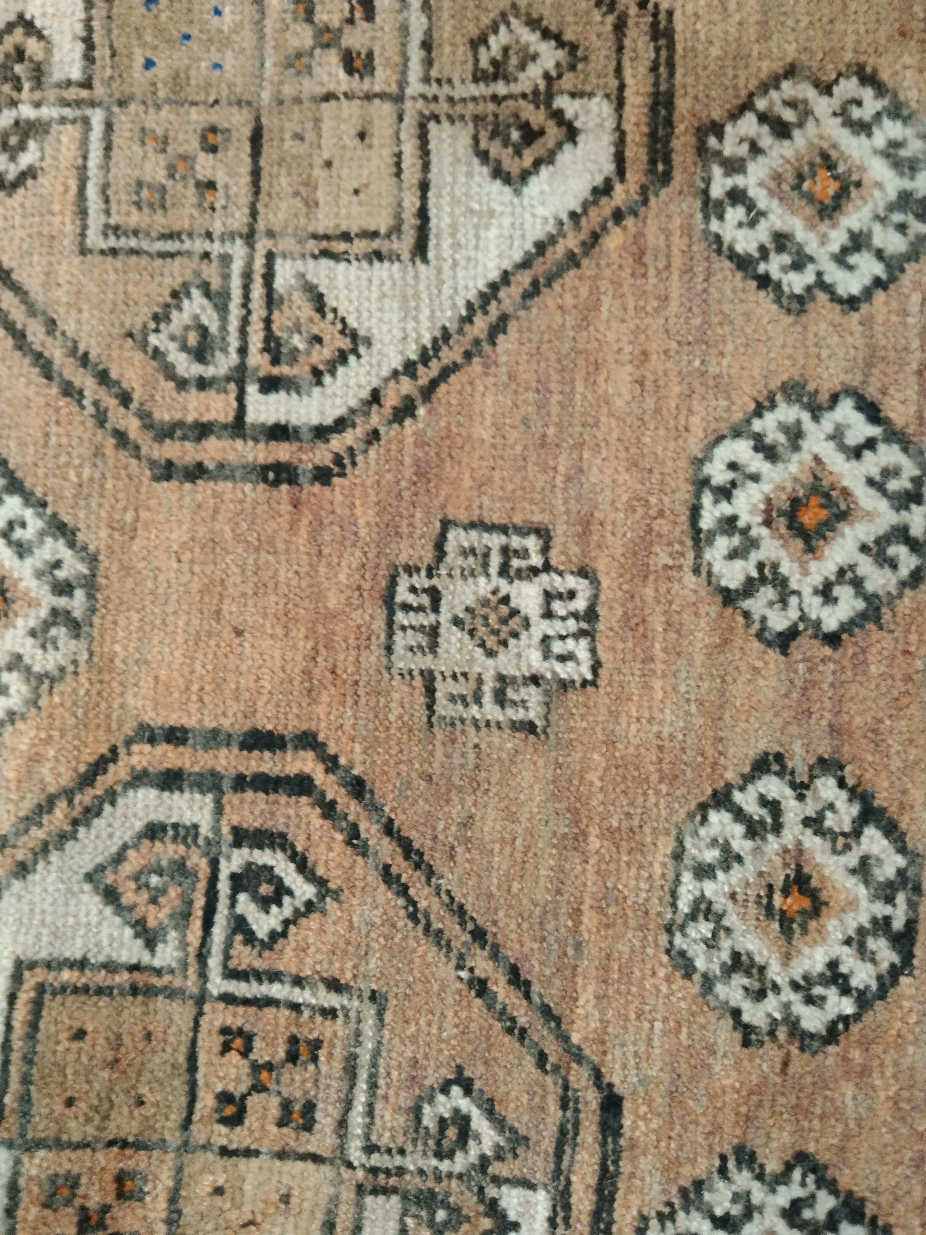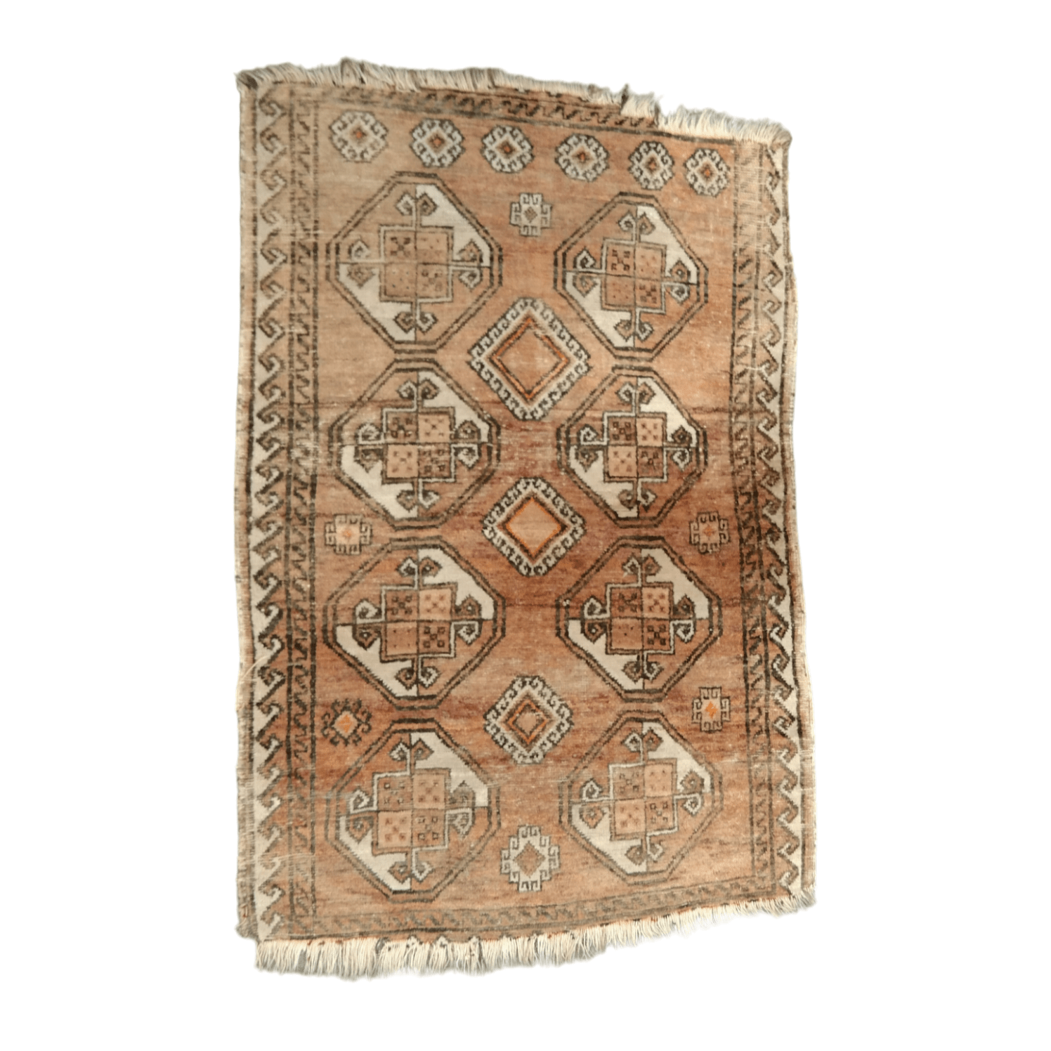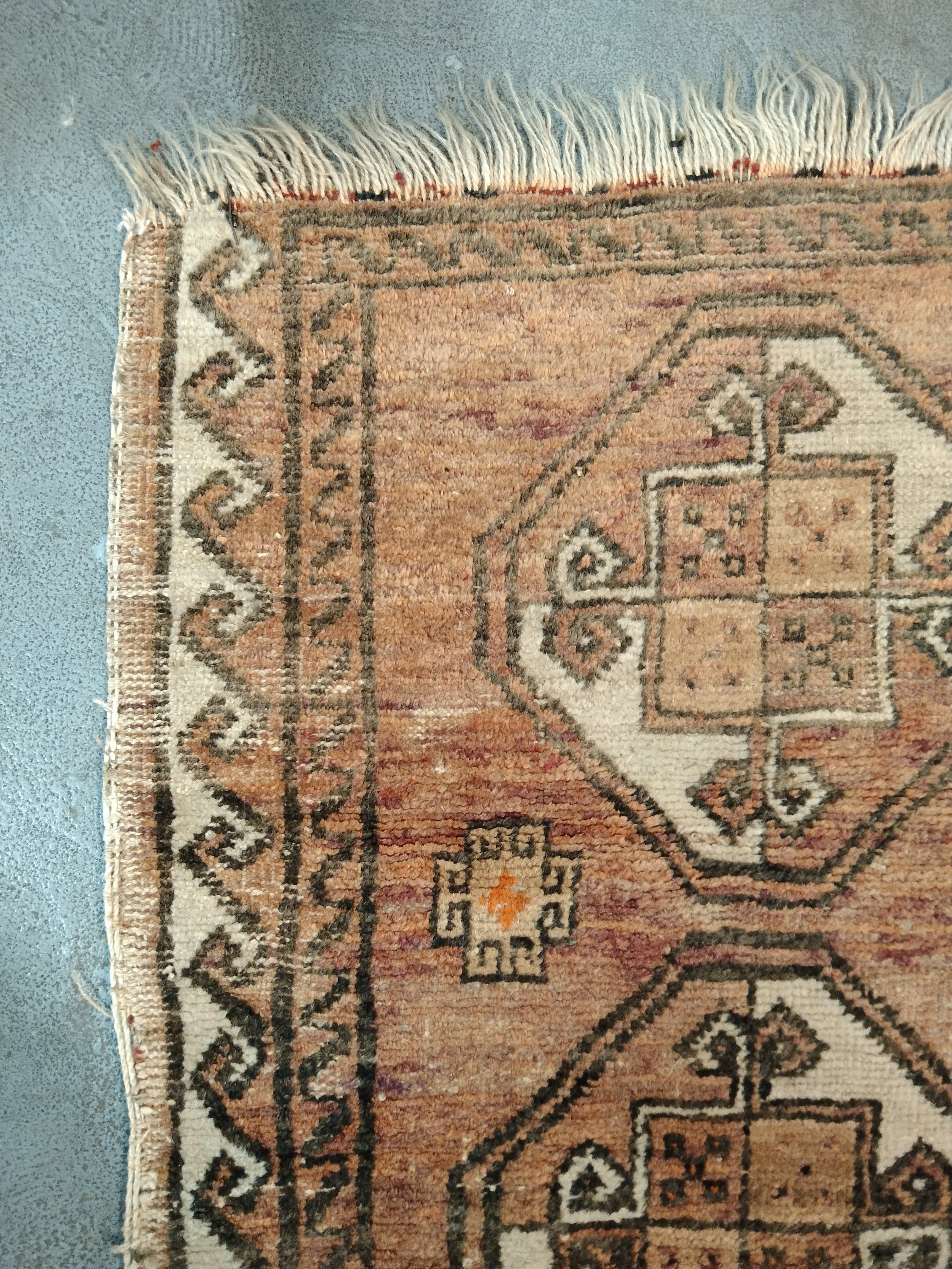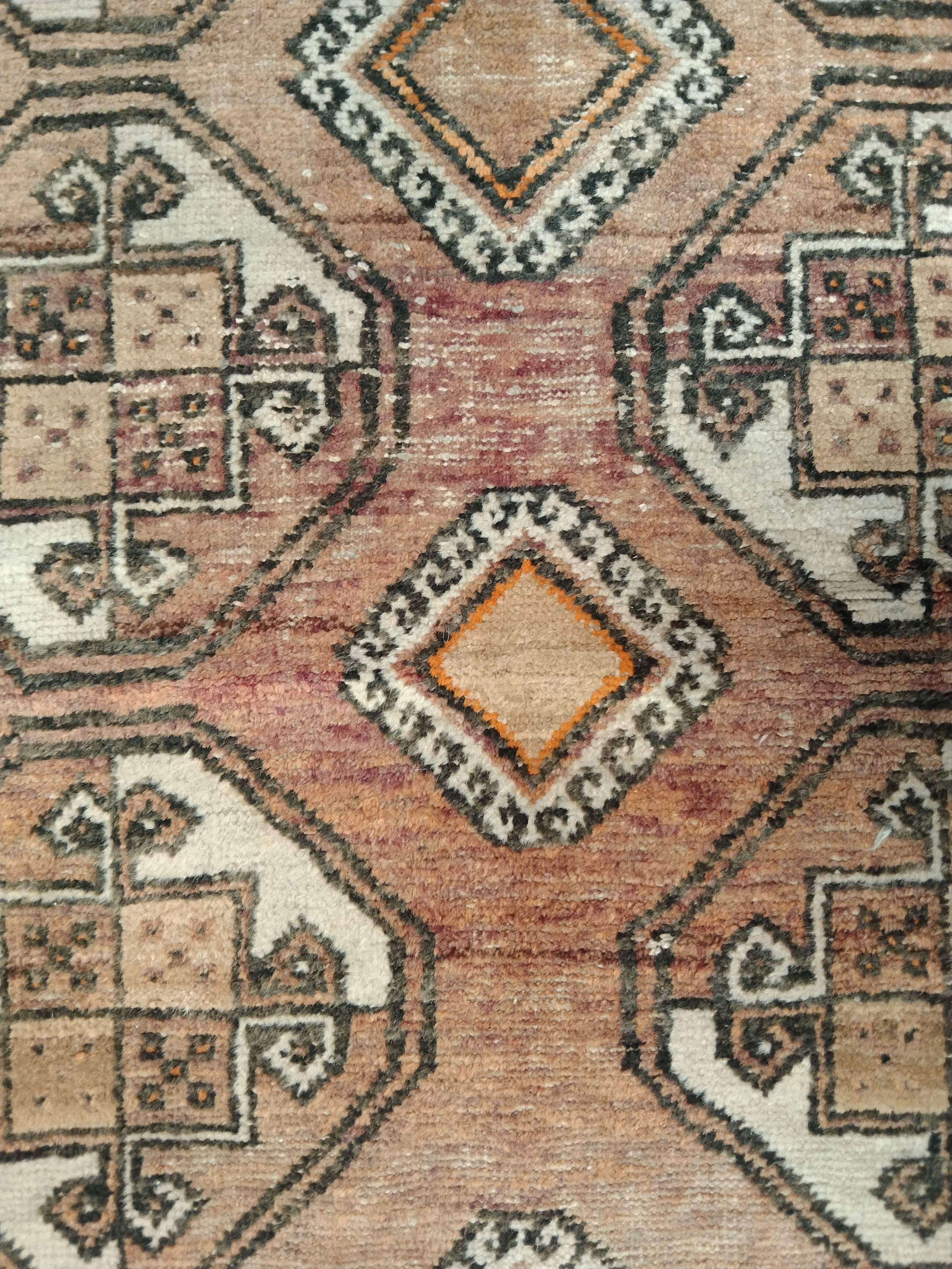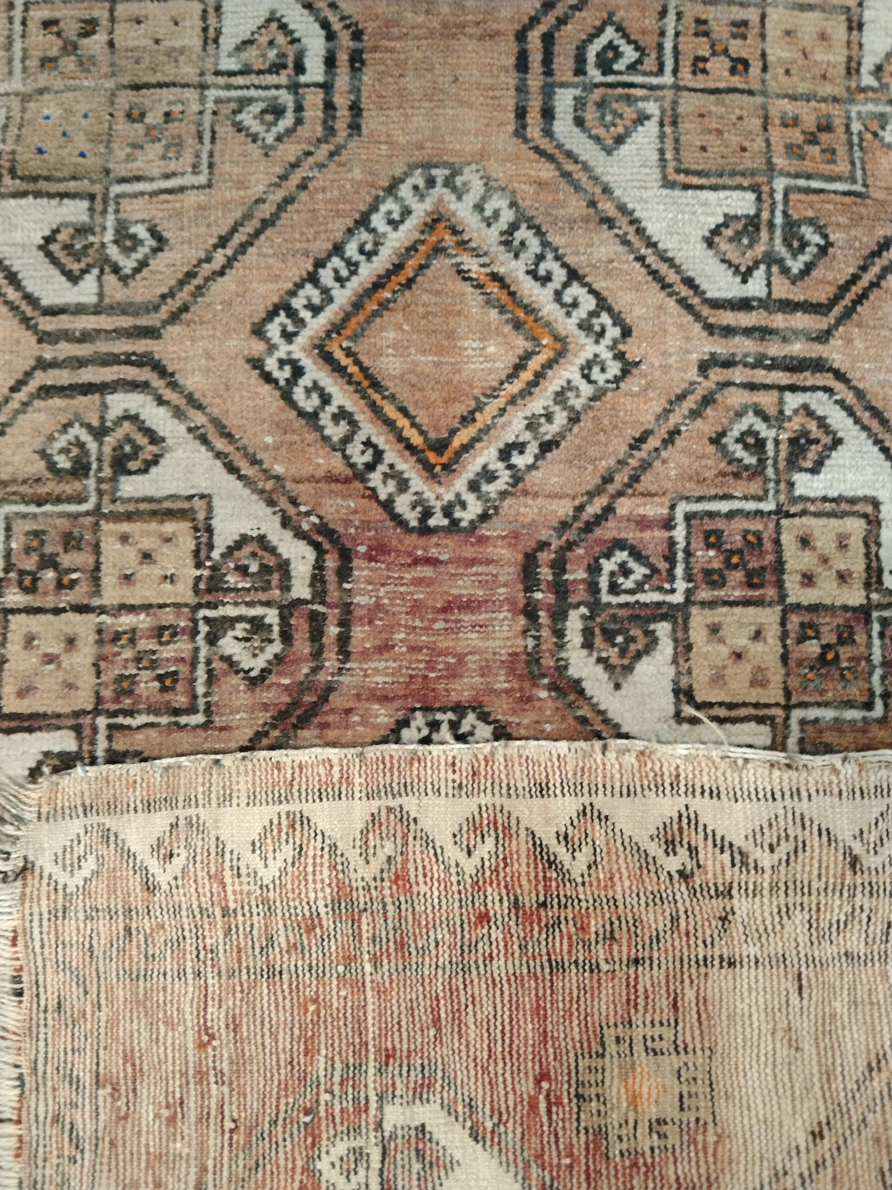 Ligera alfombra tribal de origen persa, región caucásico, anudada a mano. Diseños geométricos de flores y figura central en tonos naranjos y blancos.