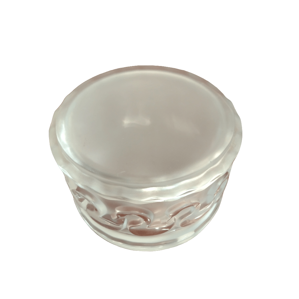 Bella algodonera de cristal de la reconocida marca francesa Lalique. La pieza tiene una tapa en opalescencia y relieves con forma de cisne en toda su superficie, hechos a través de la técnica de molde. En su base, tiene la firma de Lalique Francia.