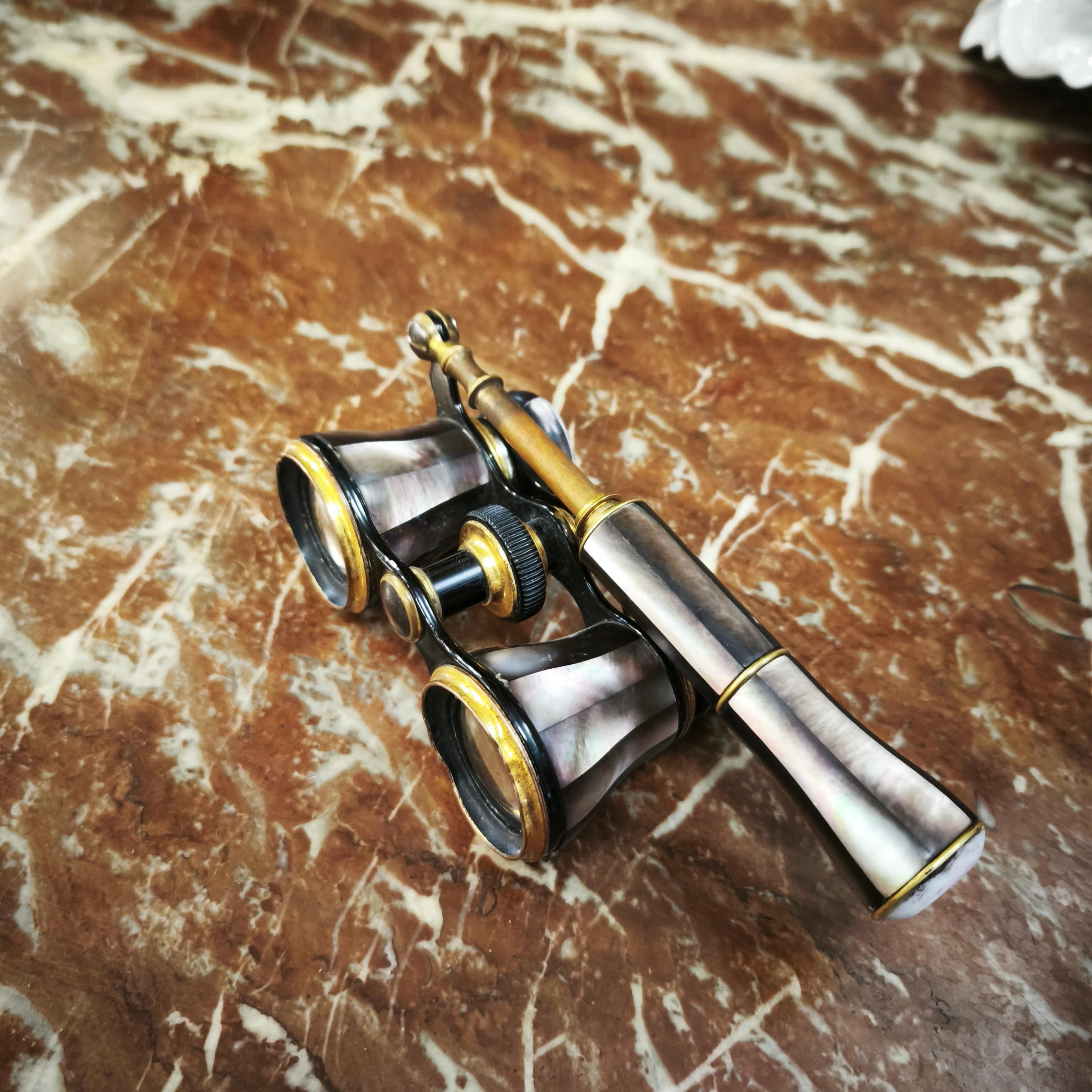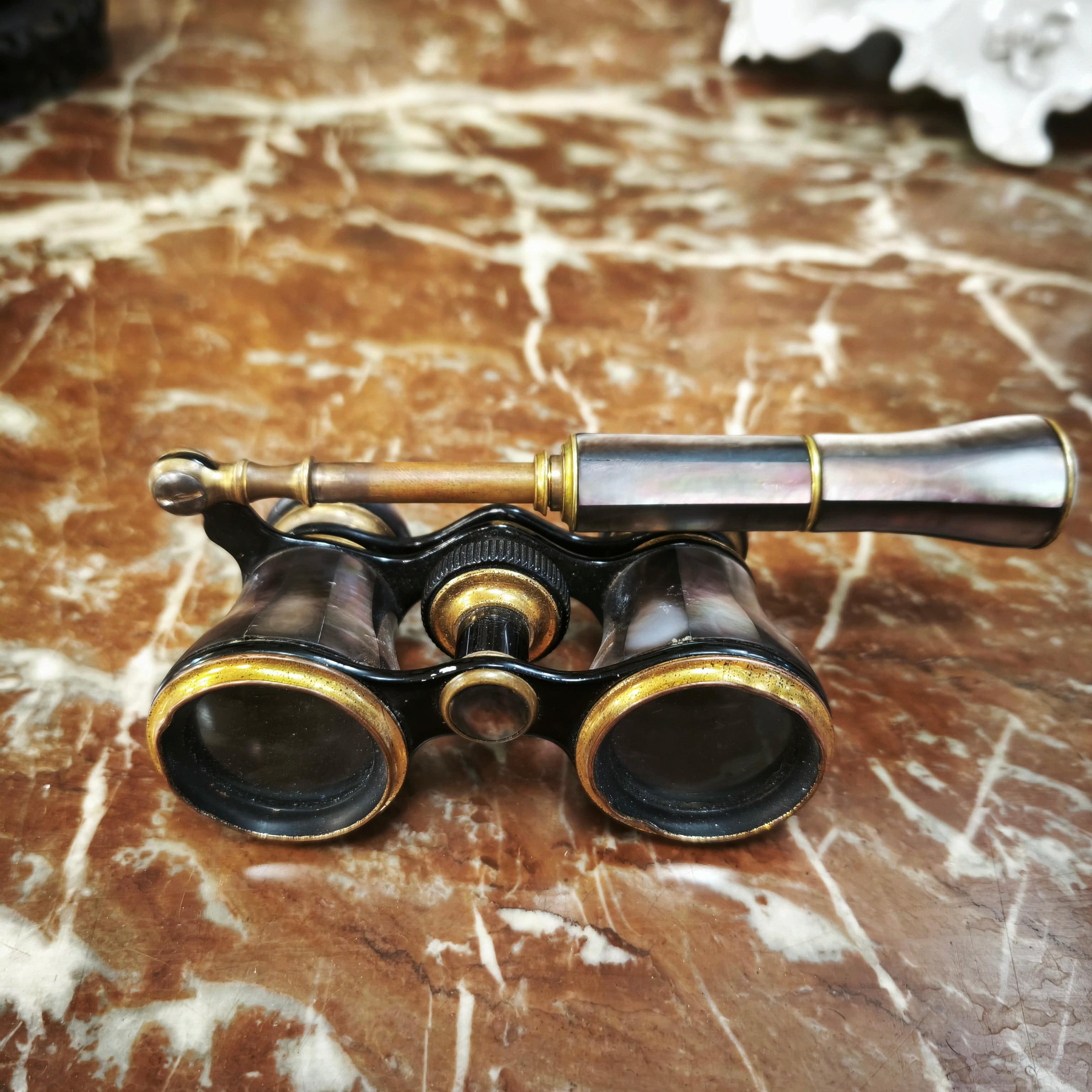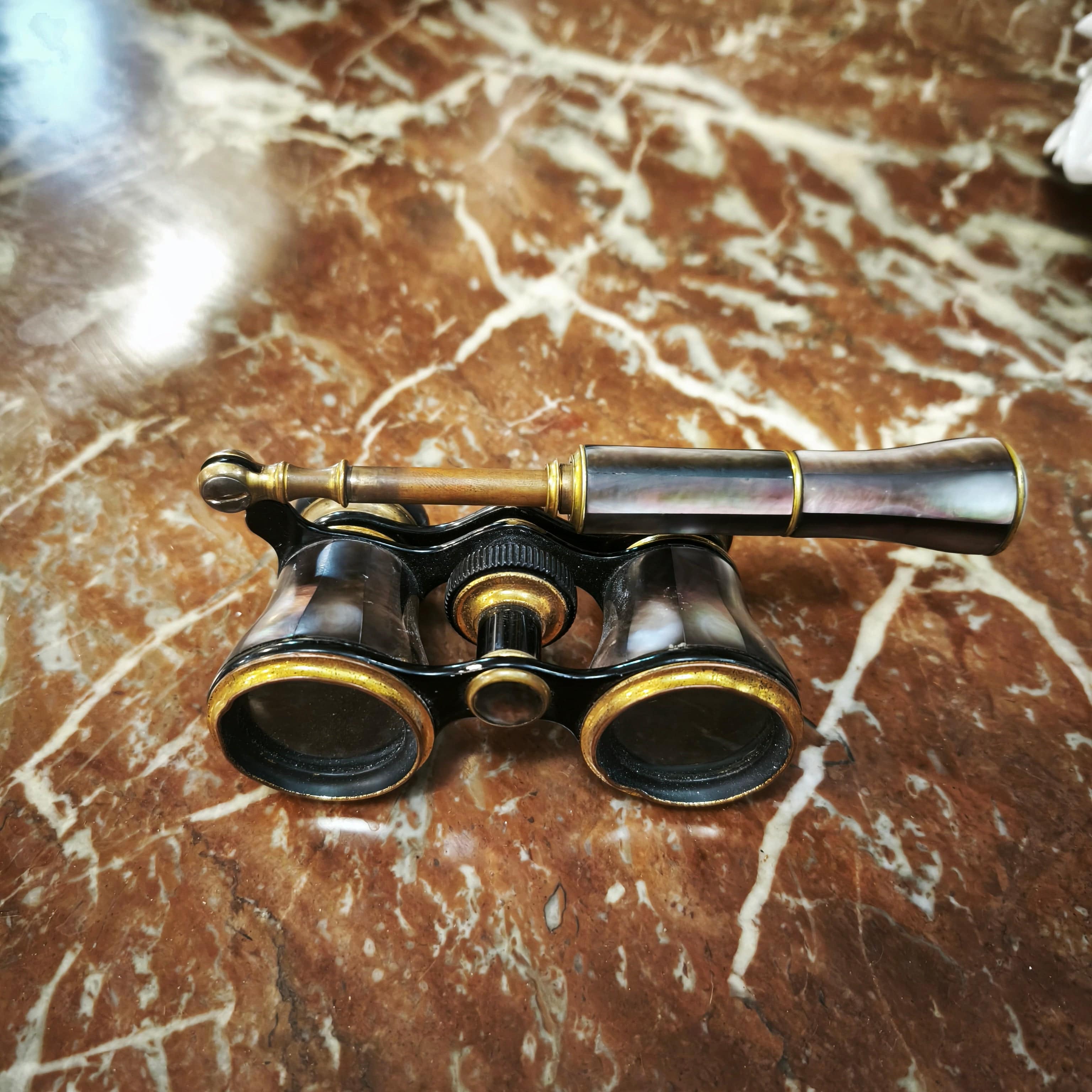 Binoculares de teatro antiguos de bronce y madera nacarados