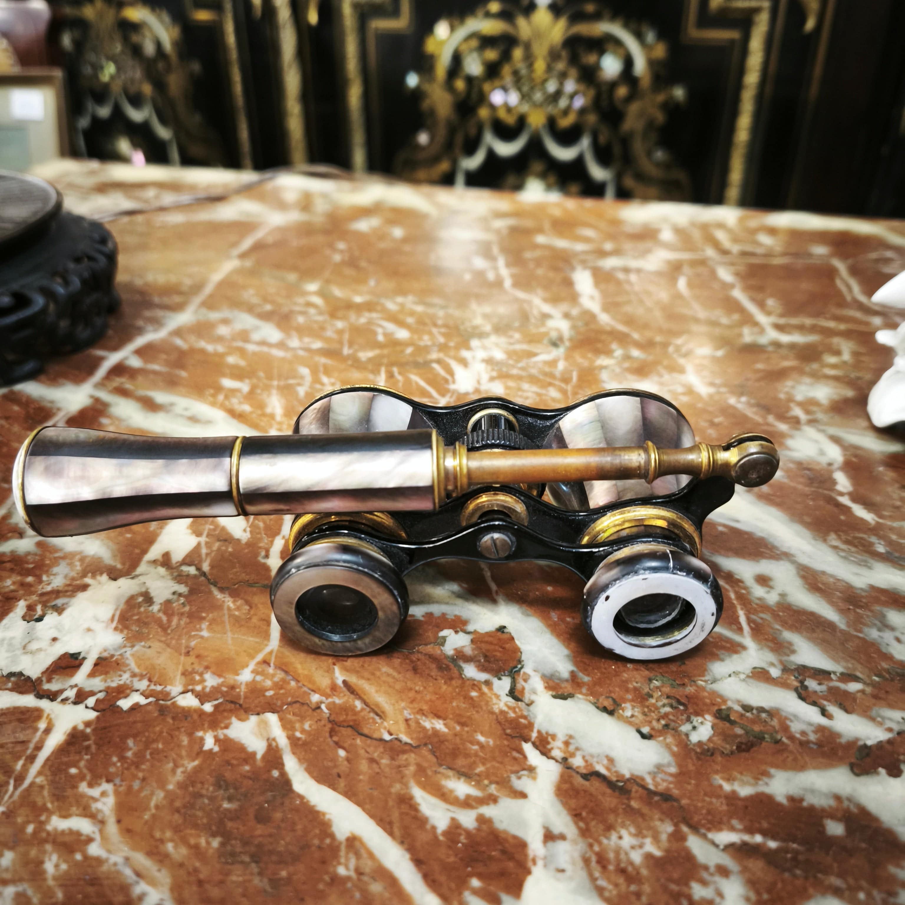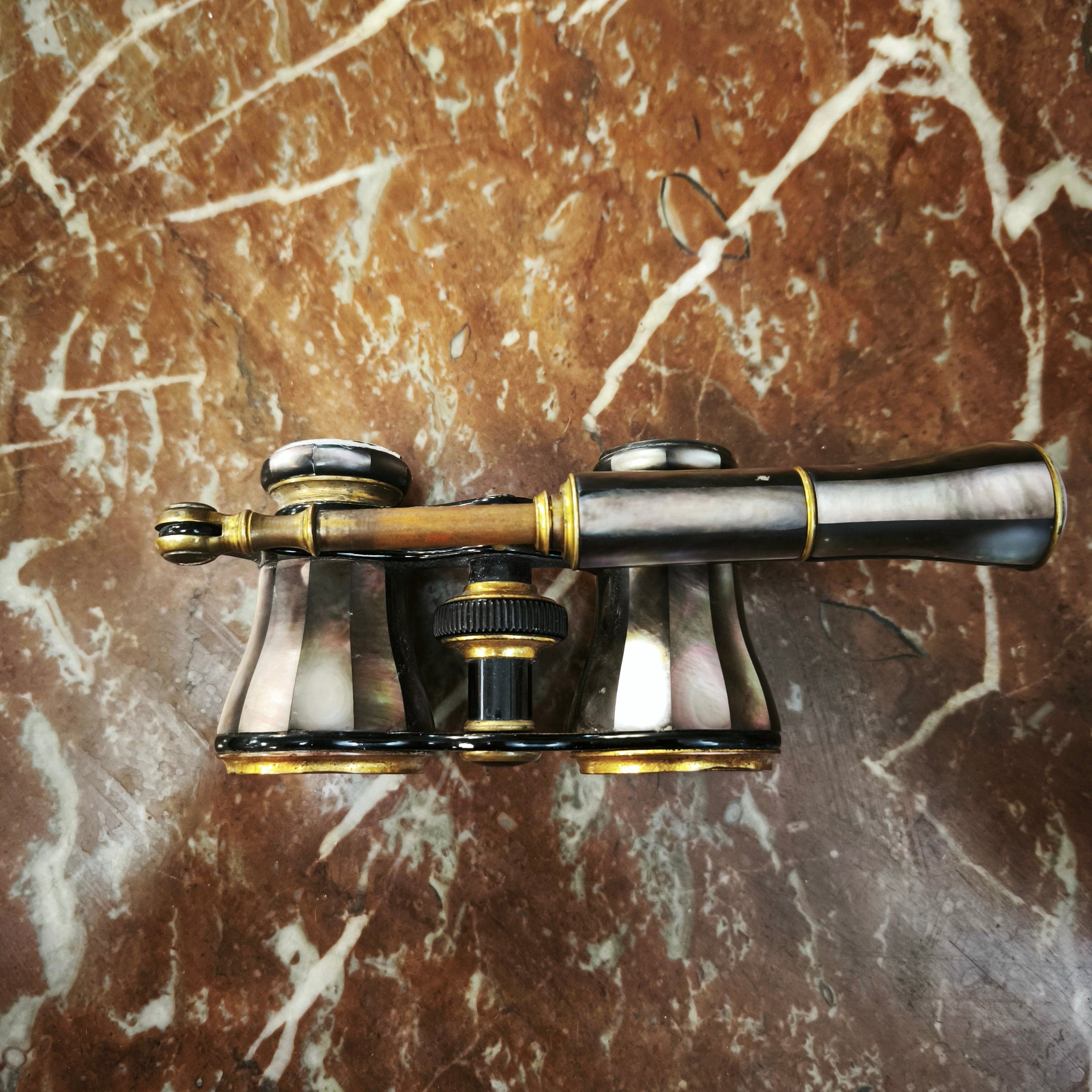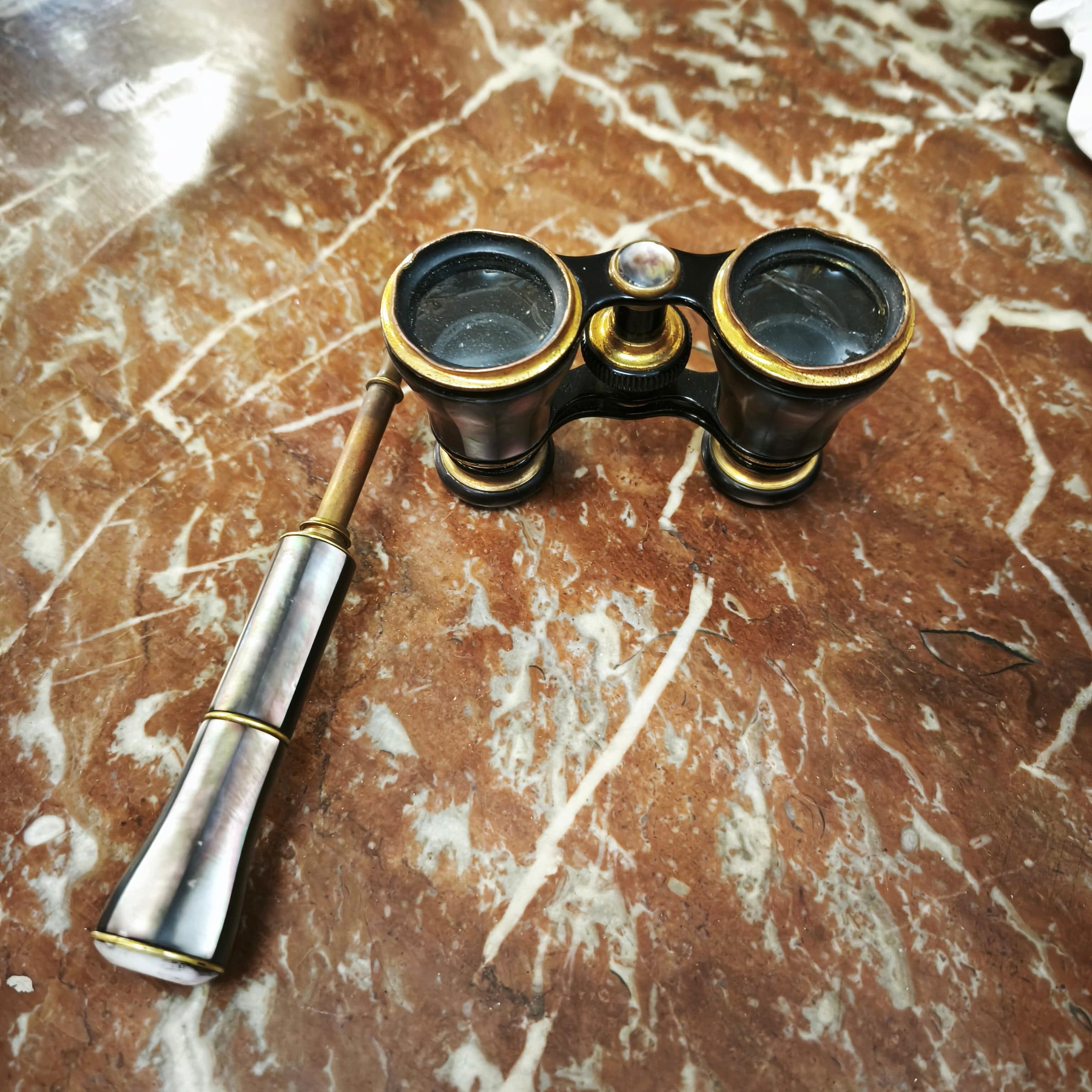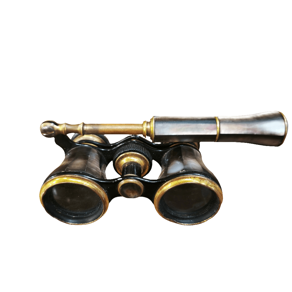 Hermosos binoculares antiguos para teatro, de bronce madera y nácar.