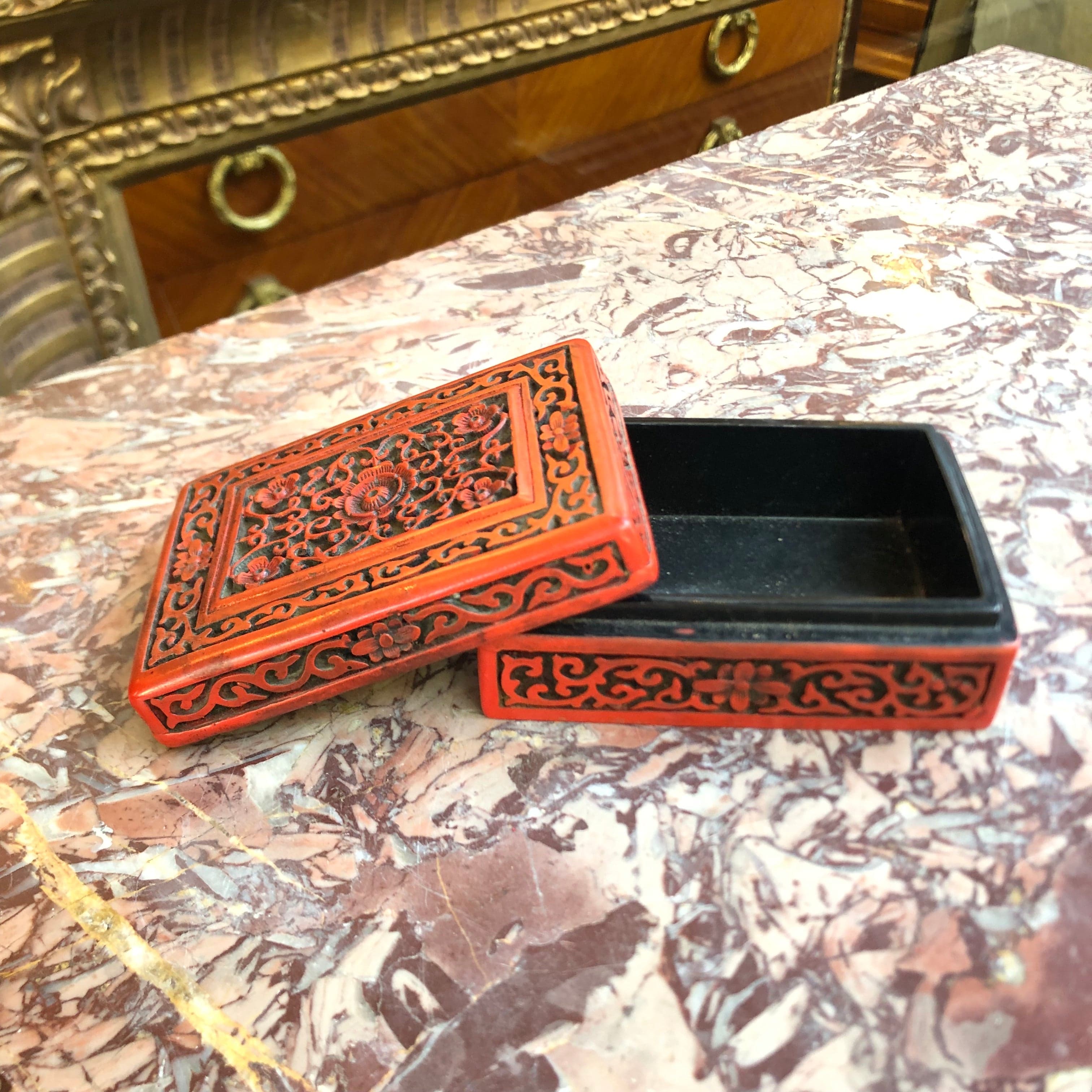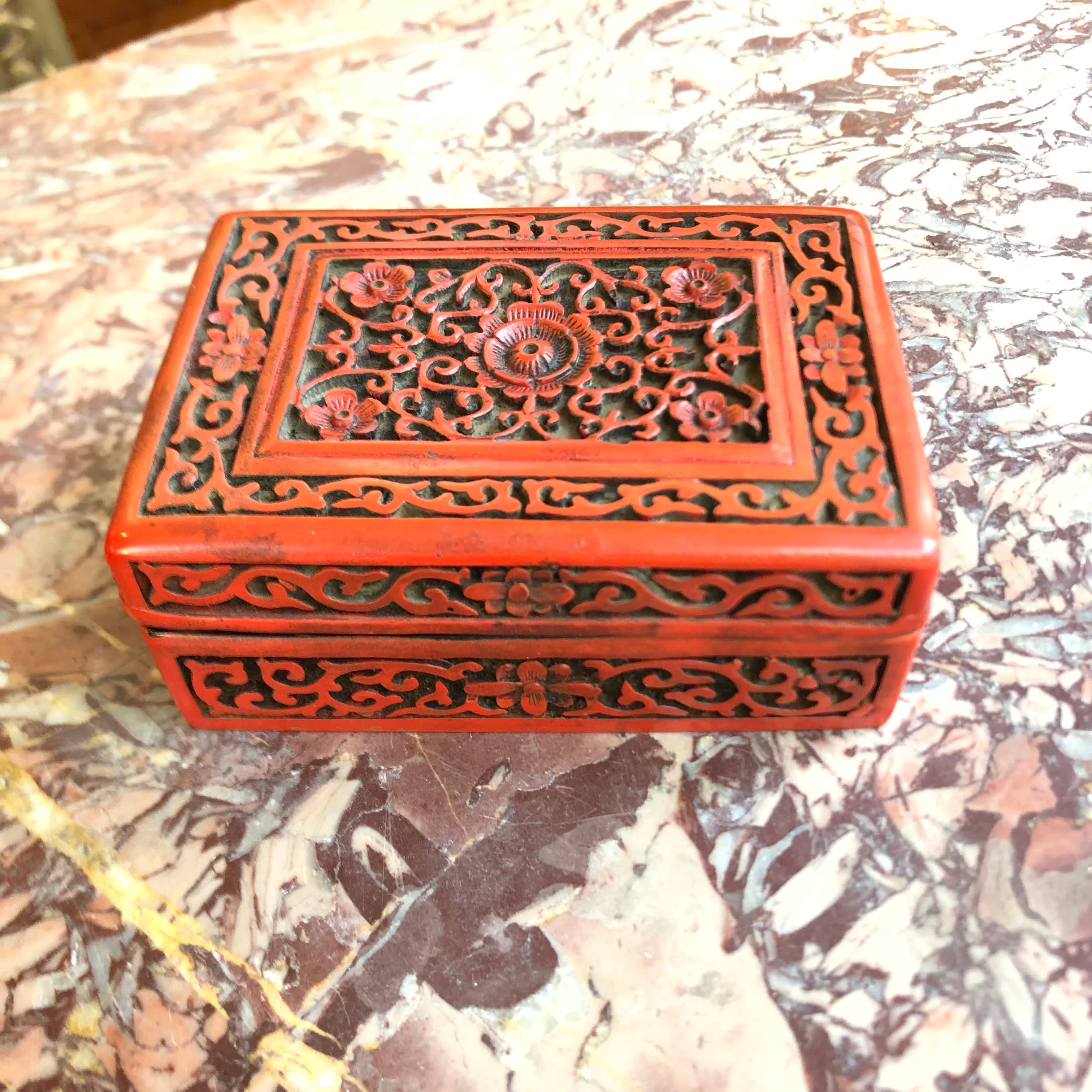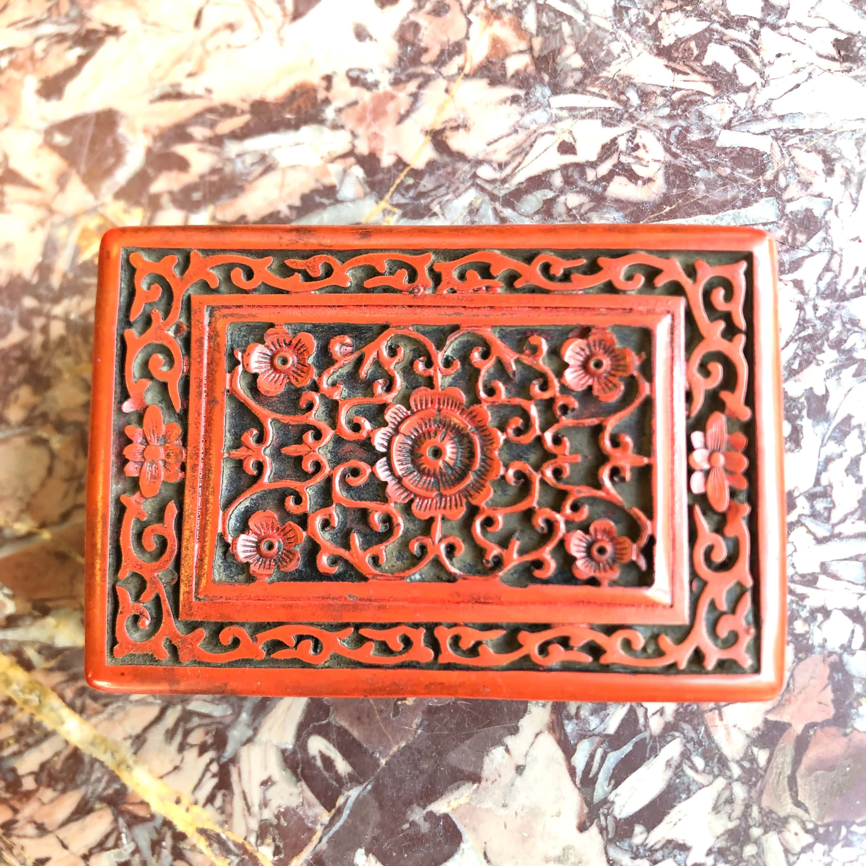 Hermosa y antigua caja rectangular china, lacada y finamente tallada.