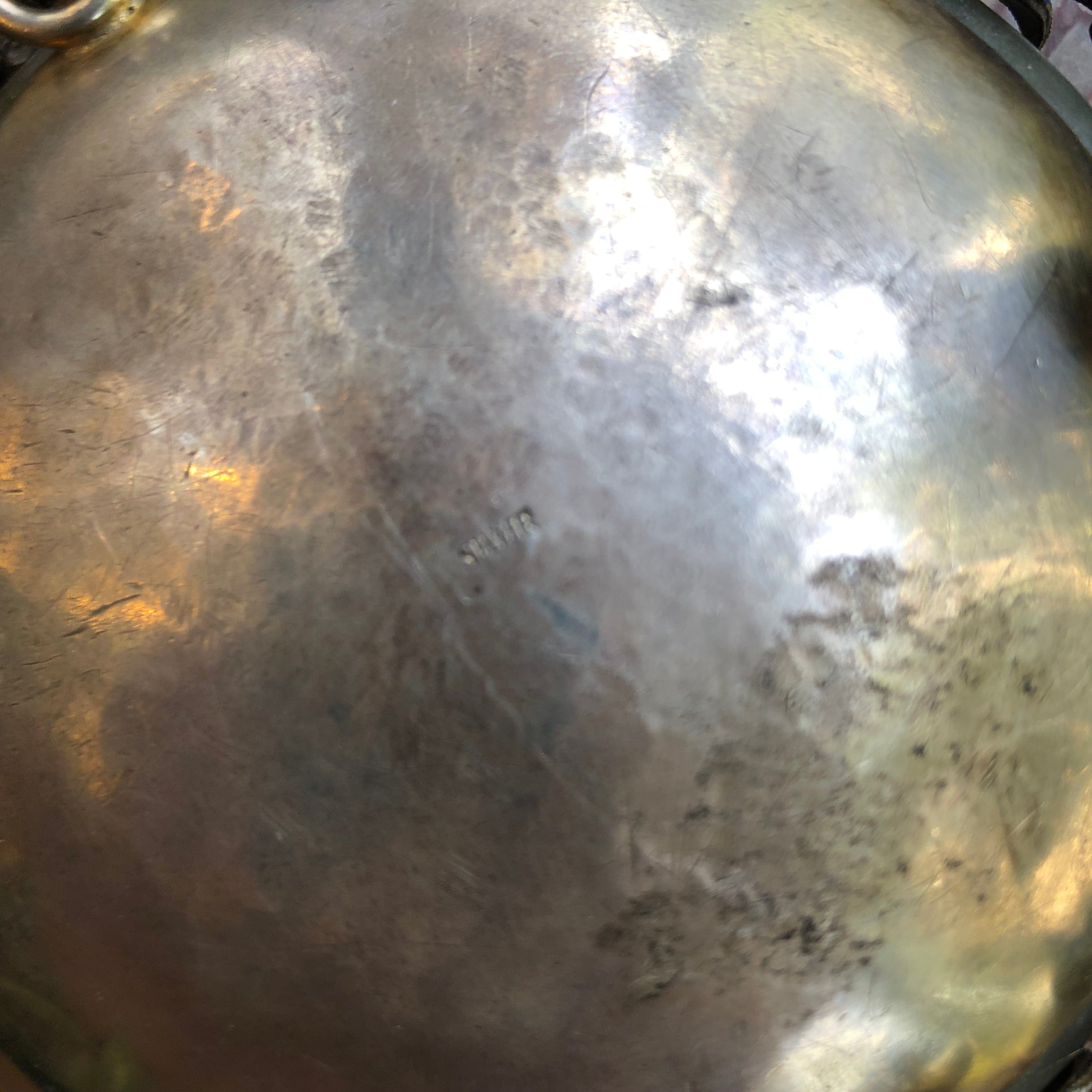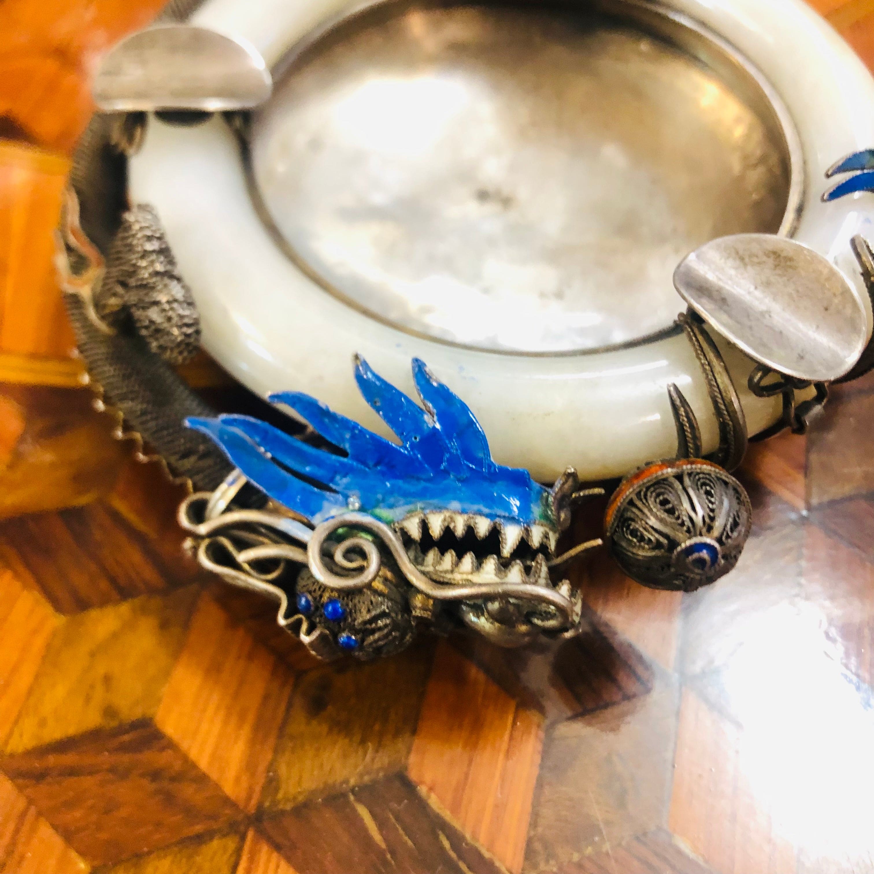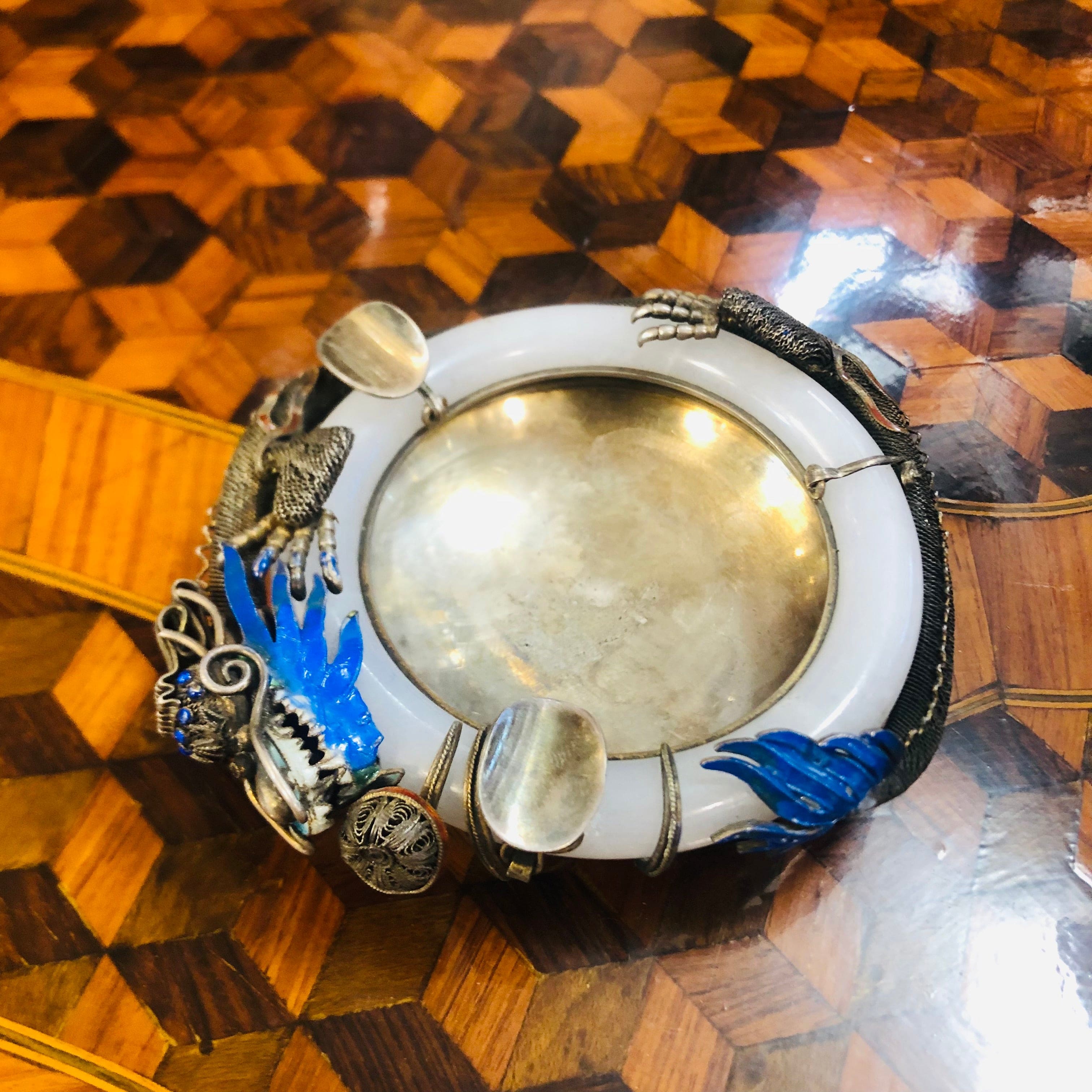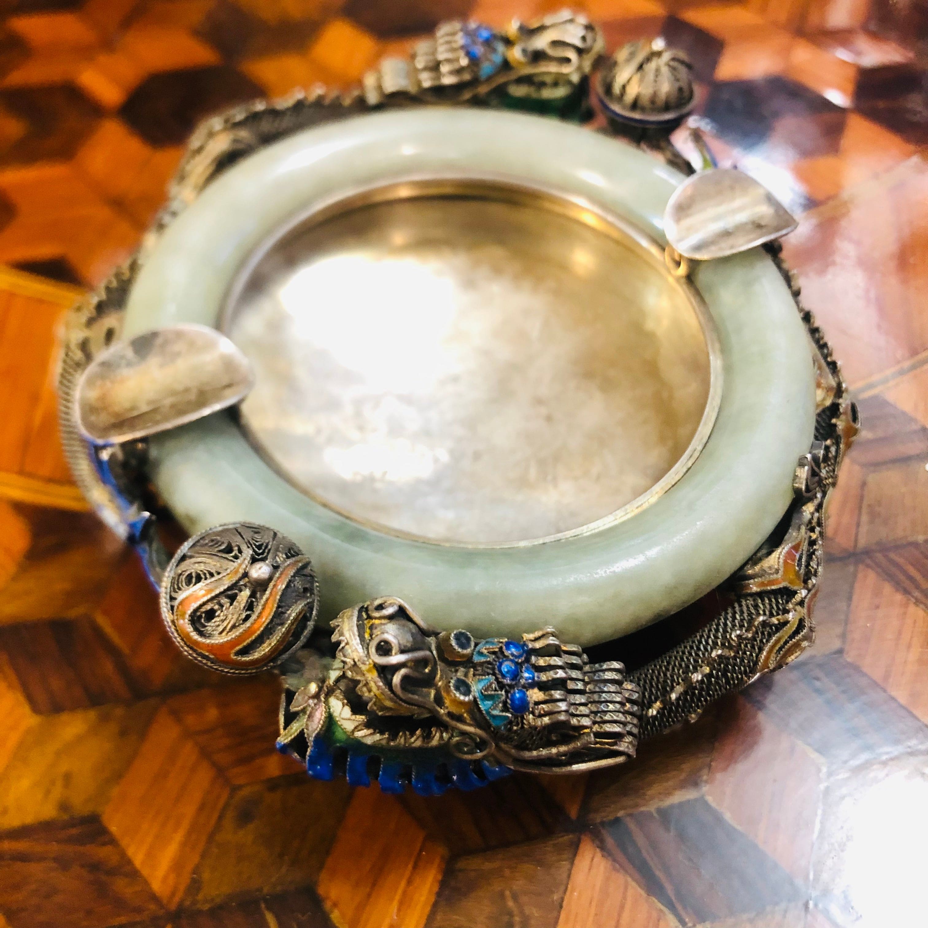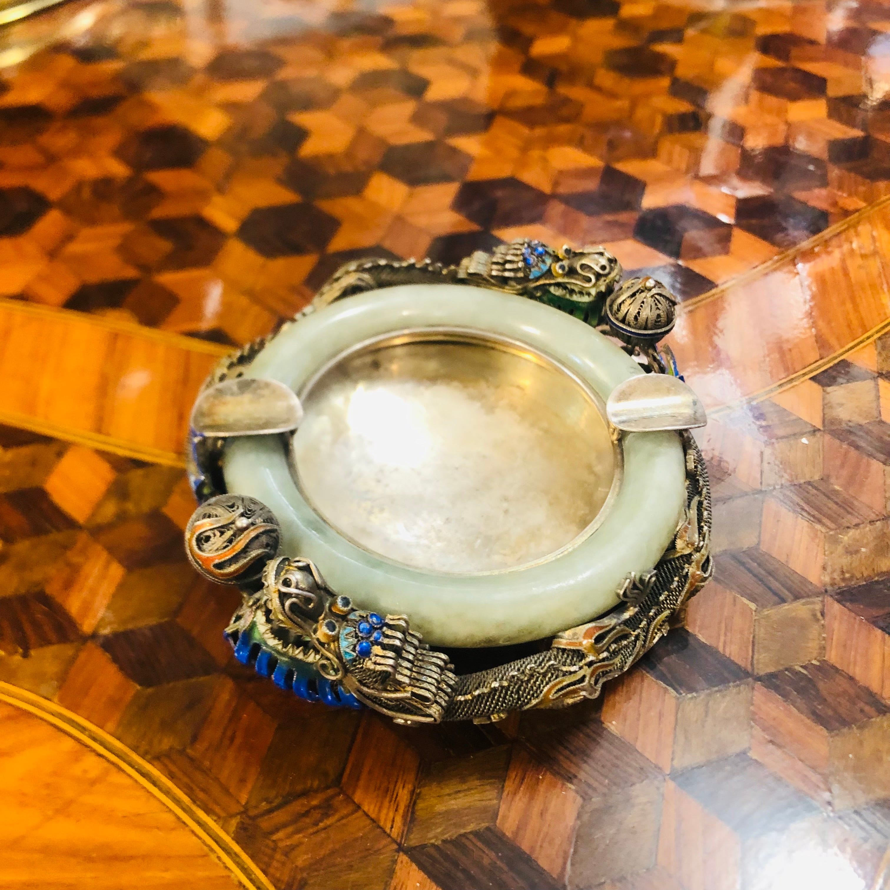 Hermosos y especiales ceniceros de metal plateado y jade, son tres, dos de ellos de igual diseño y un tercero similra pero con detalles diferentes, en el tallado y color.