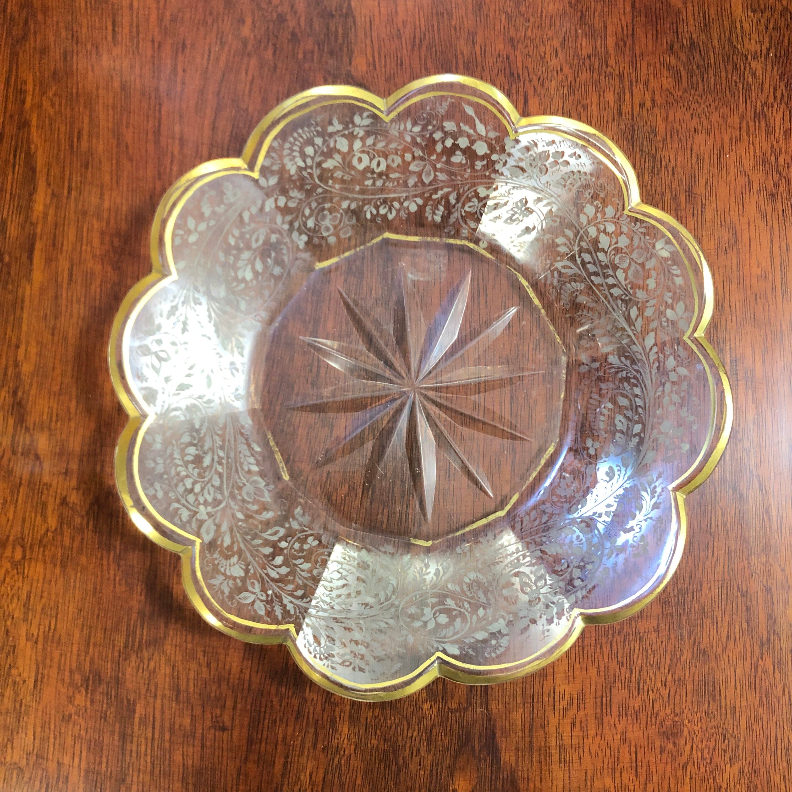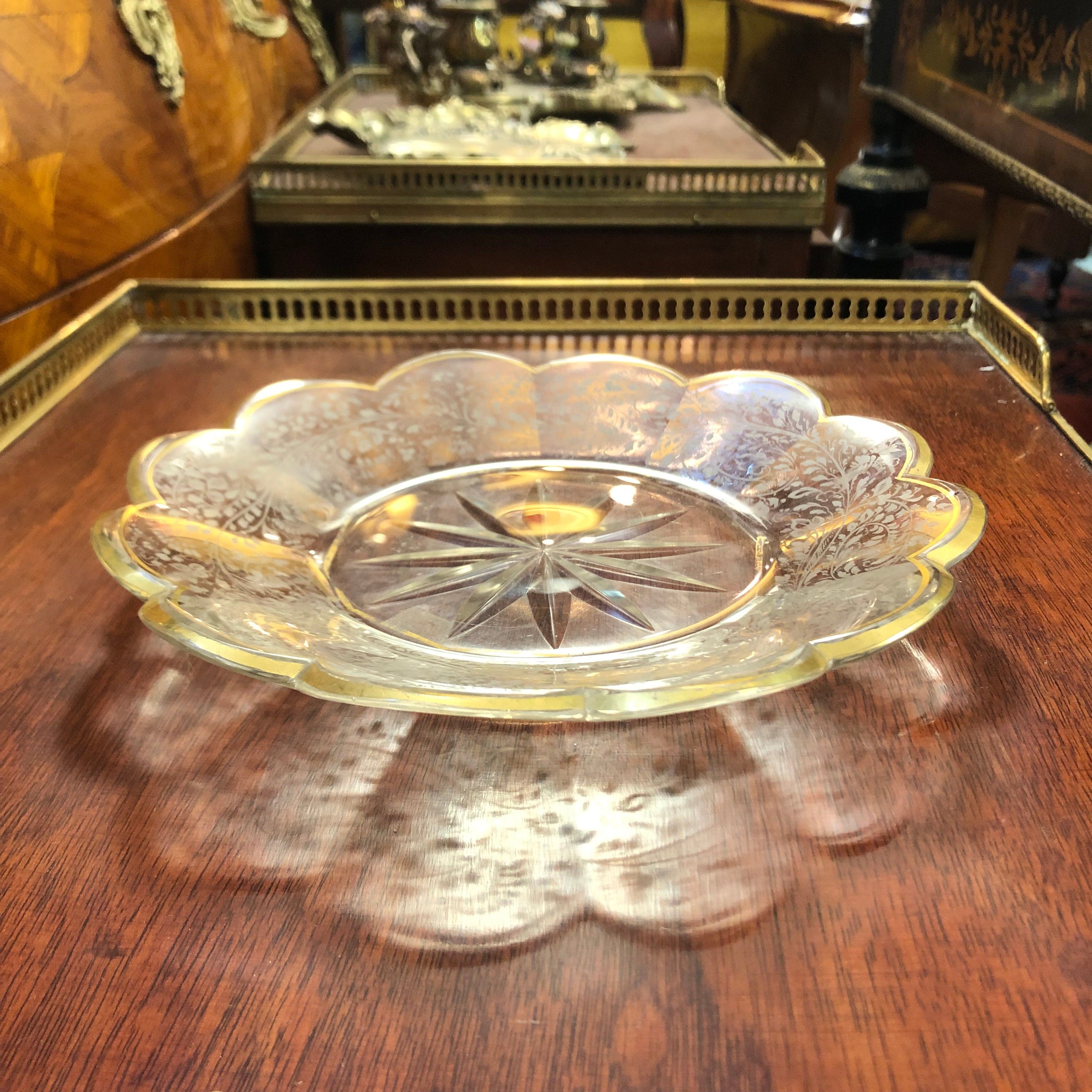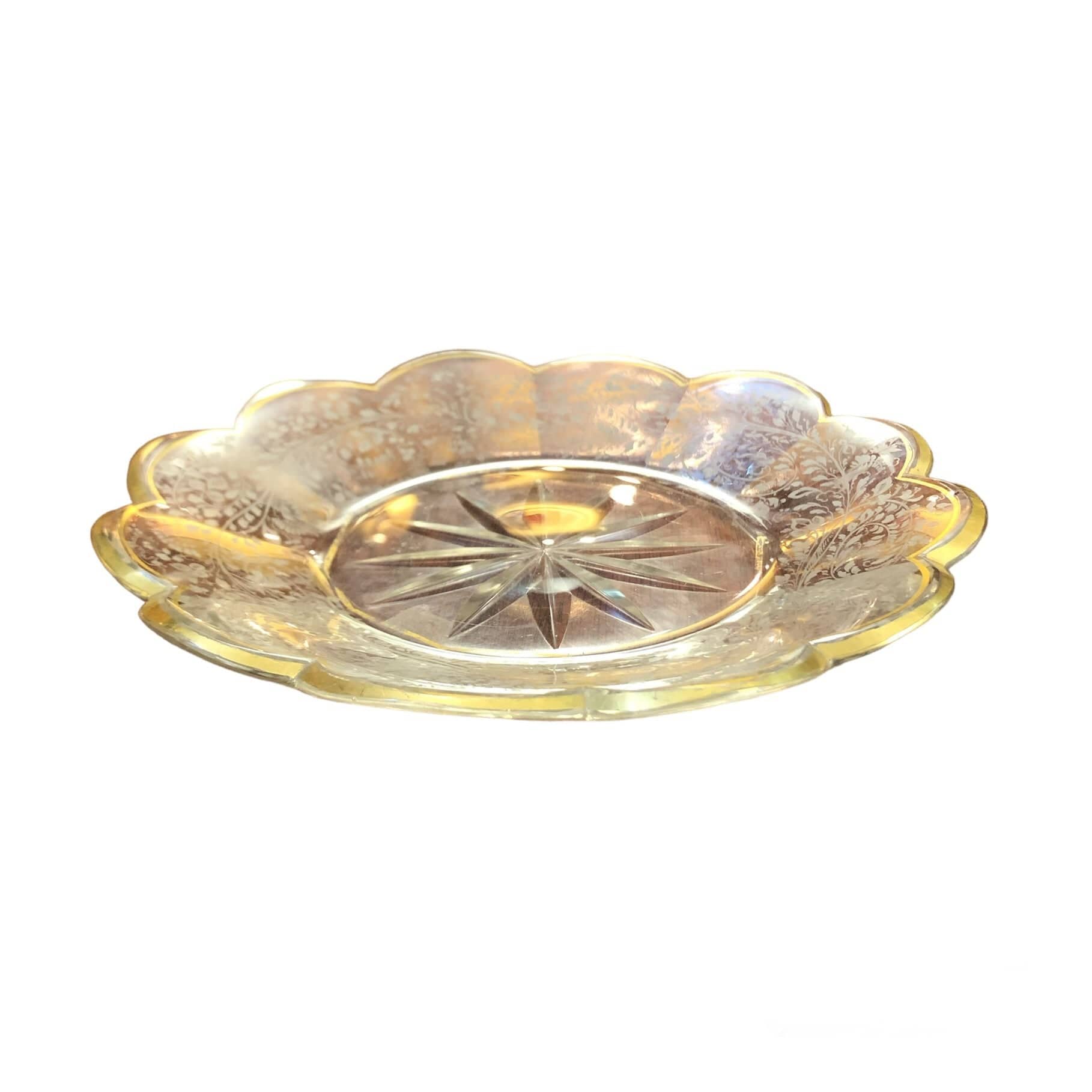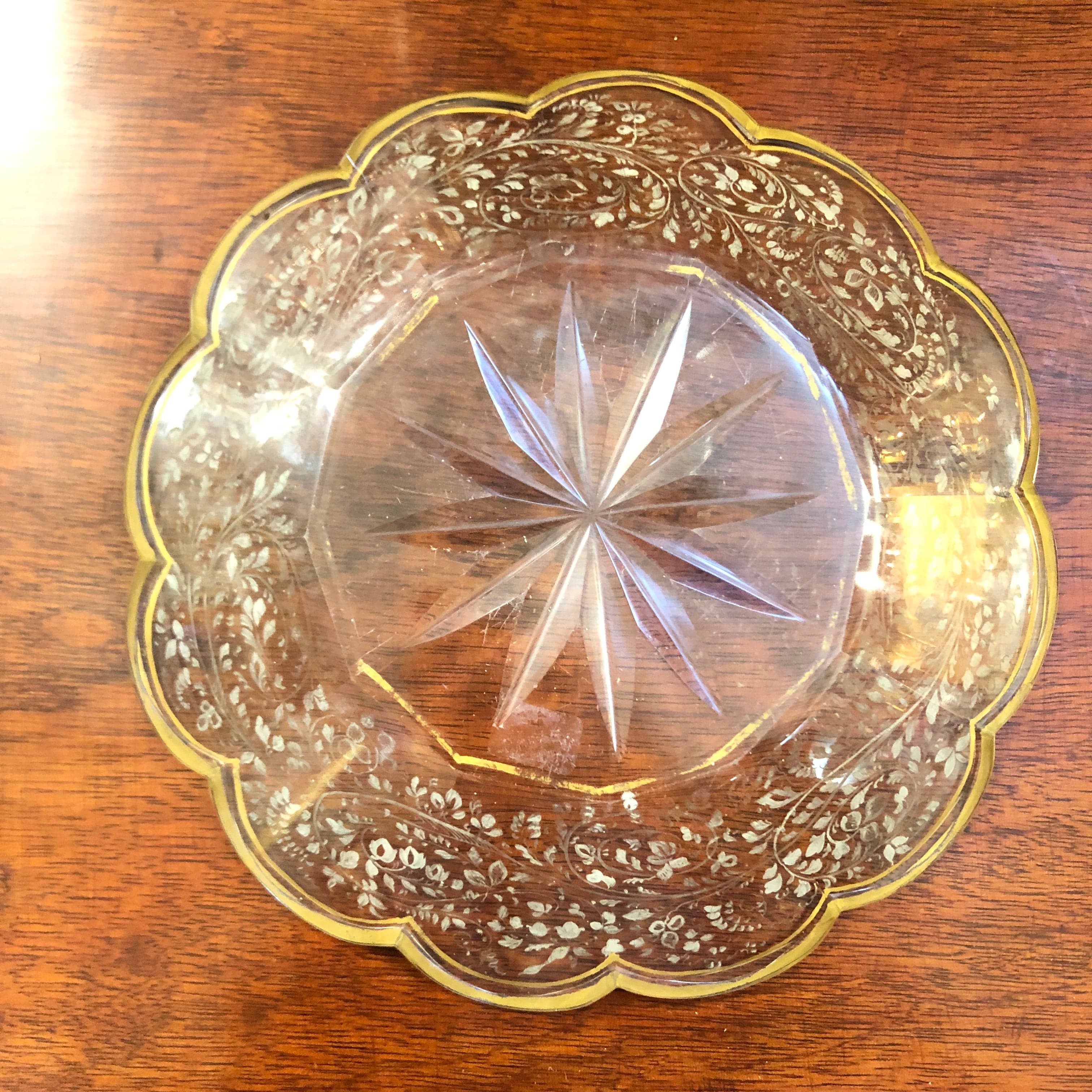 Delicado centro de mesa de cristal finamente pintado, diseño de flores blancas y bordes dorados.