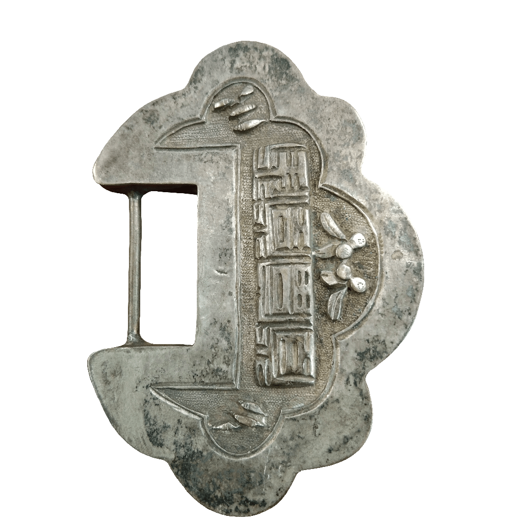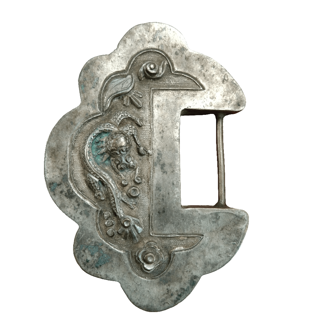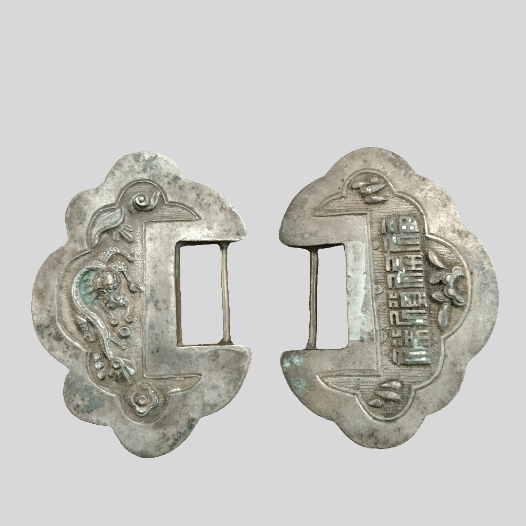 Bellos colgantes tradicionales chinos de metal, con detallados relieves con caracteres y la figura de un dragón.
