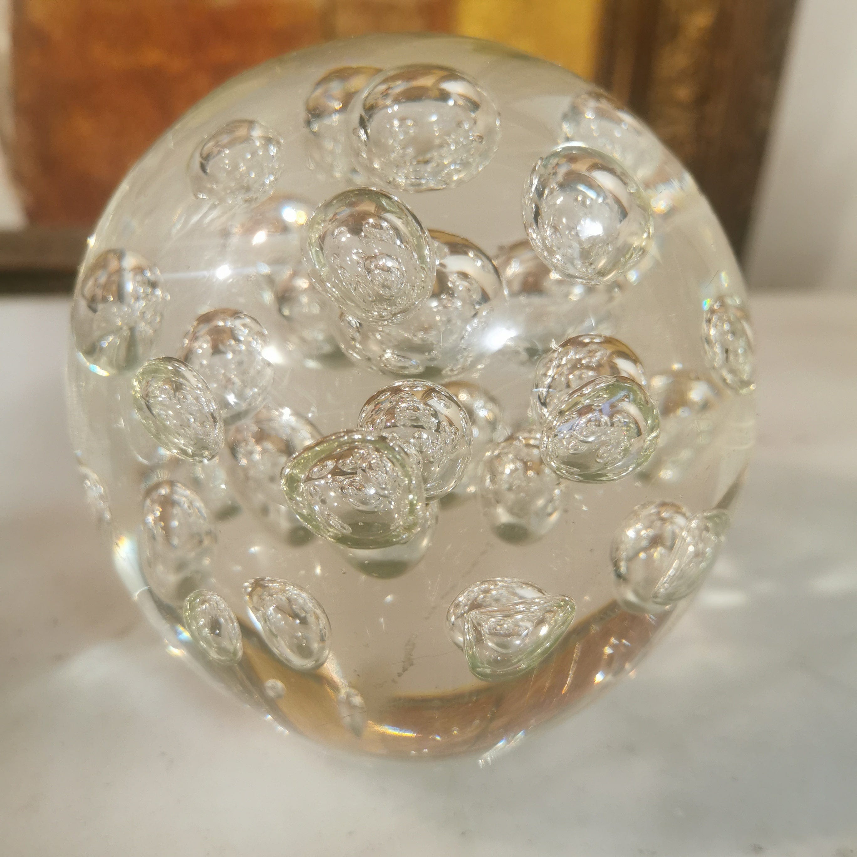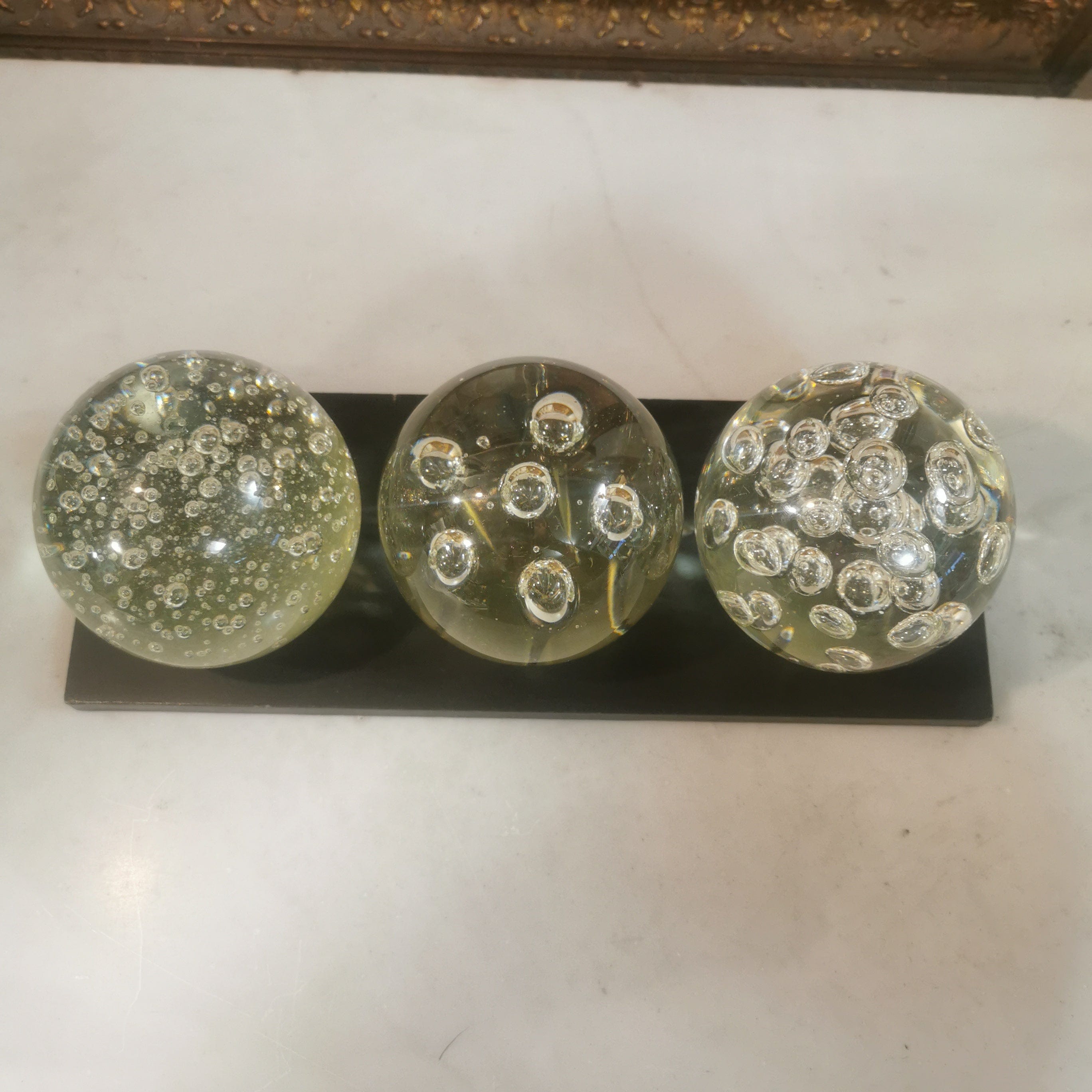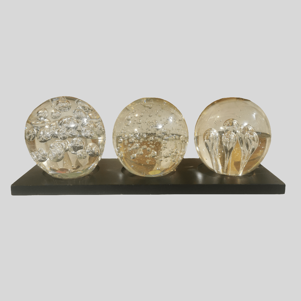 Bellísimo conjunto de tres pisapapeles de vidrio soplado transparente con diferente diseño cada uno. Éstos van sobre una base de madera simple.
