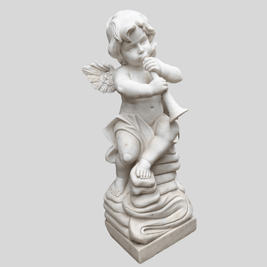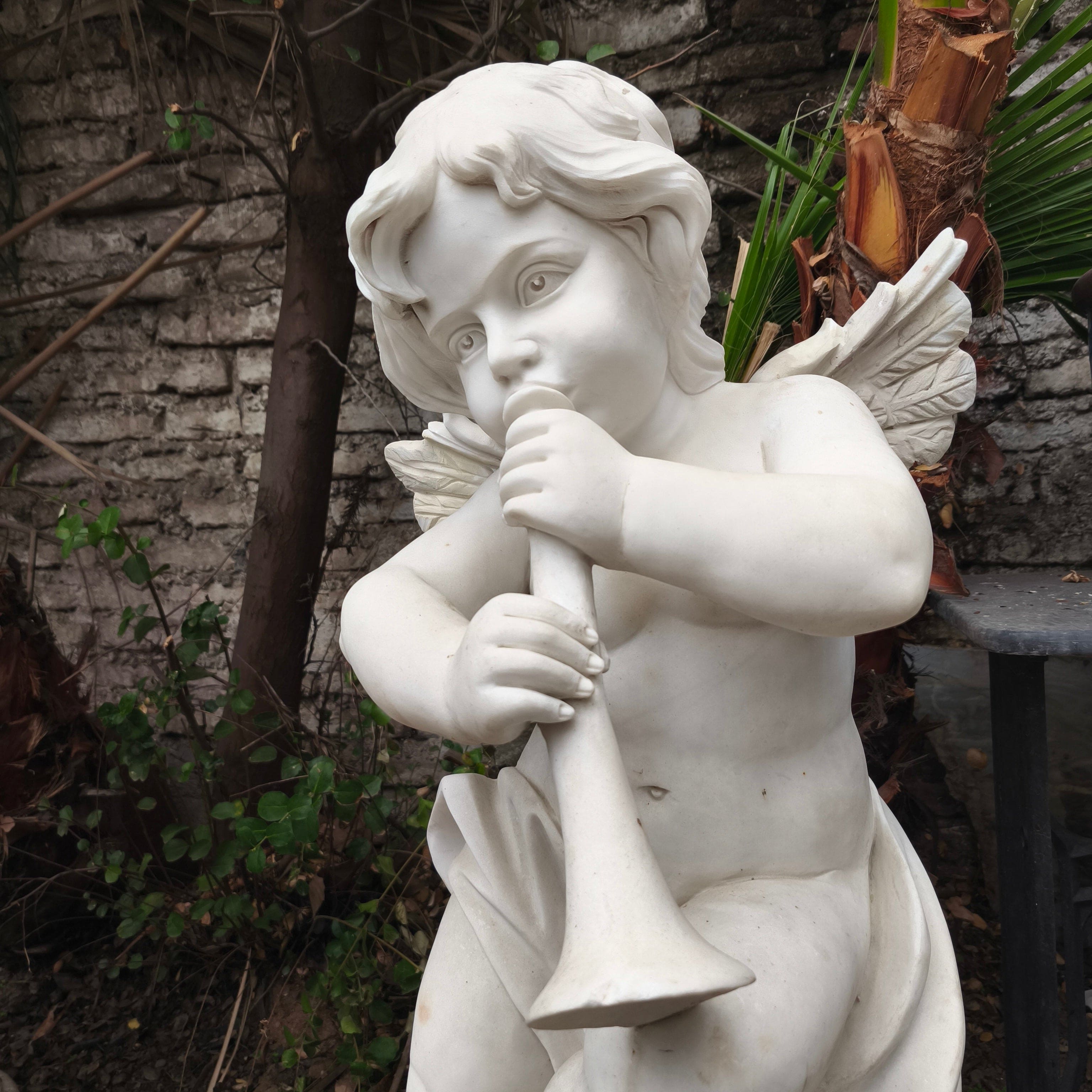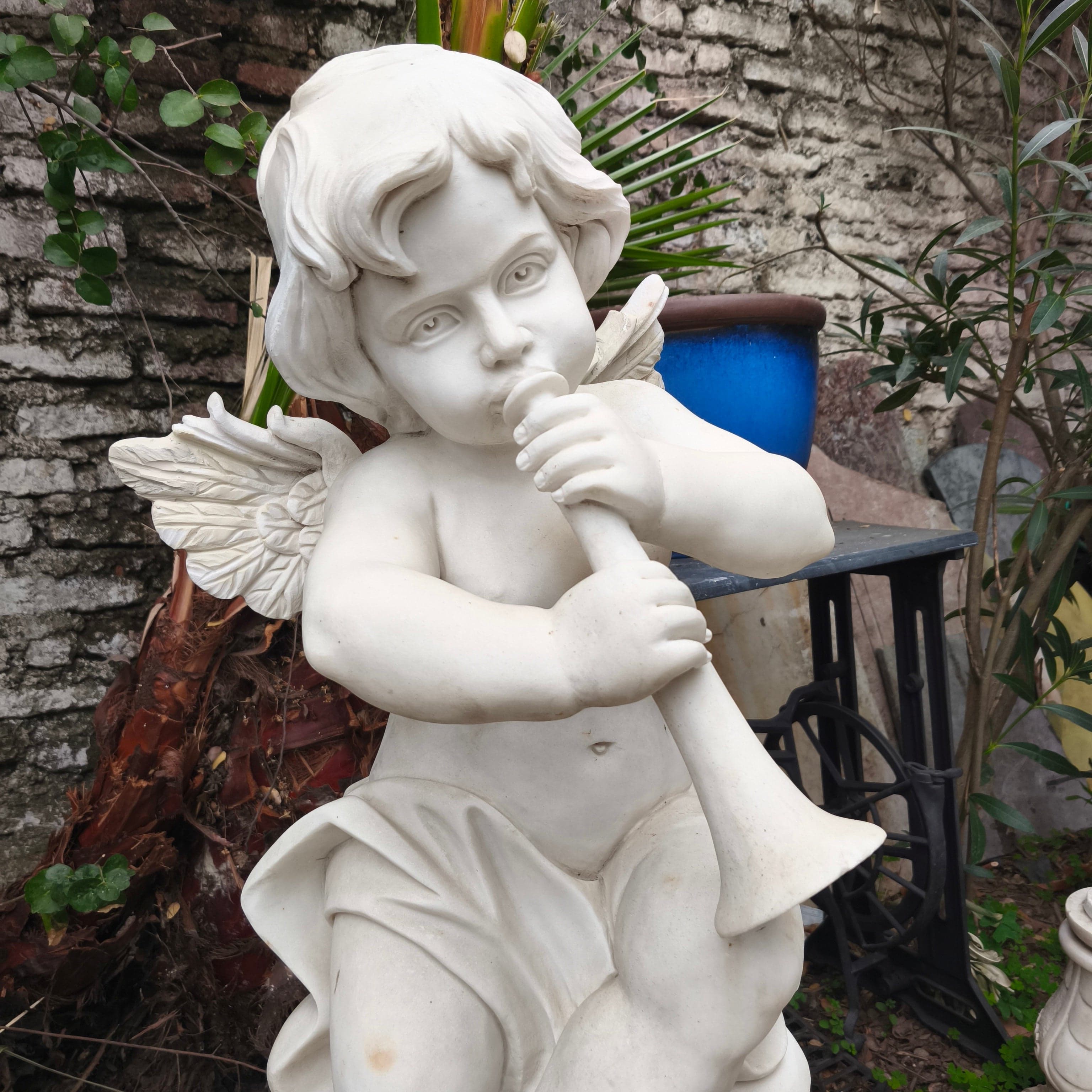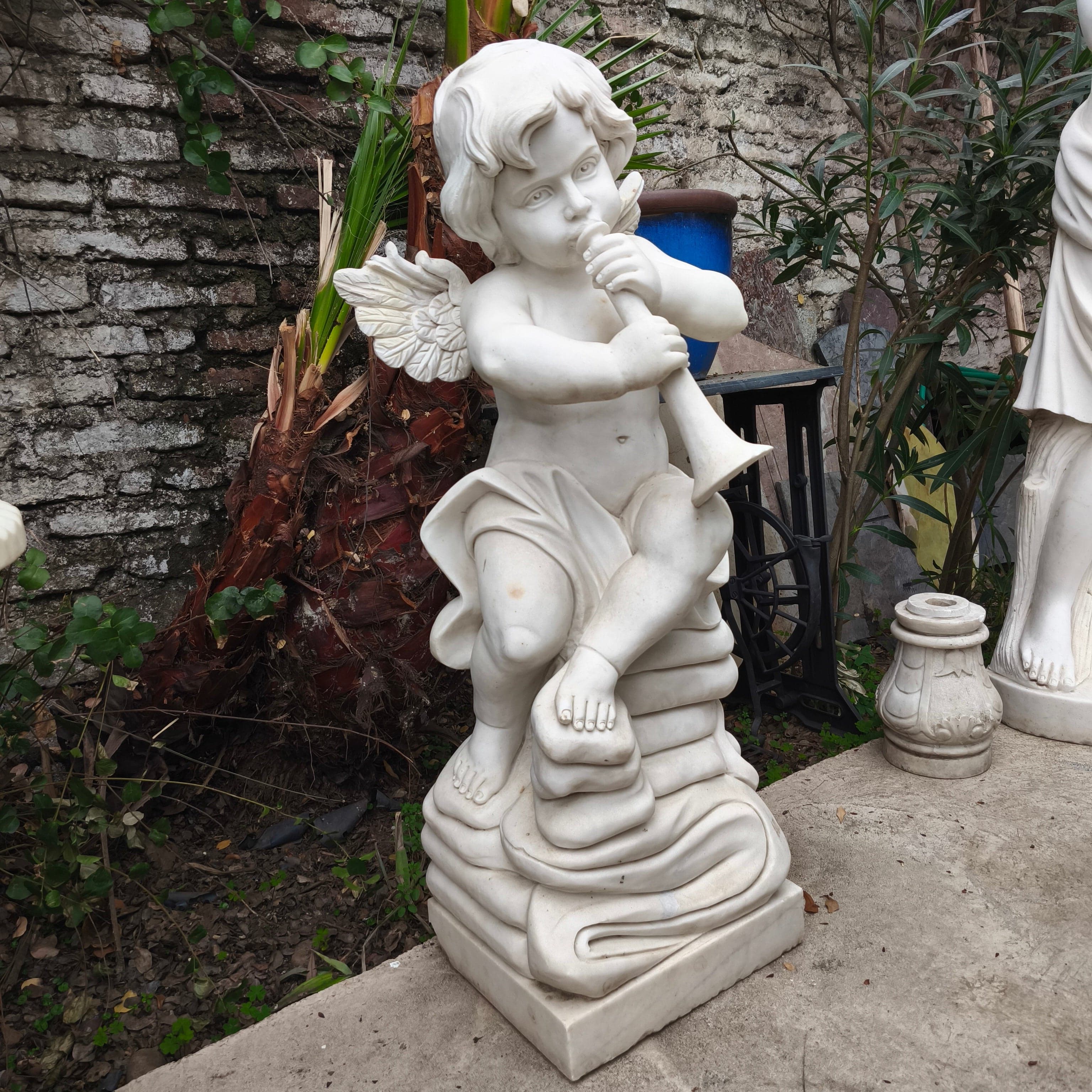 Bella escultura de pequeño ángel tocando la trompeta, de piedra de mármol esculpido y tallado.
