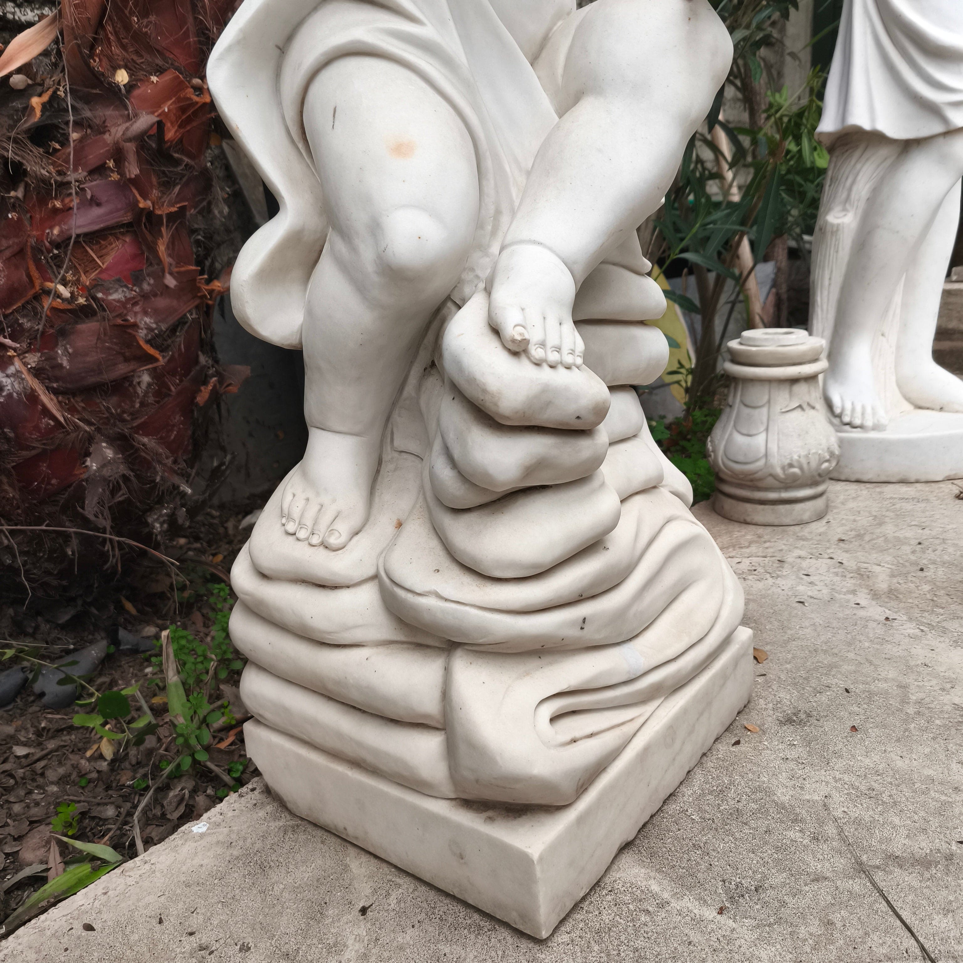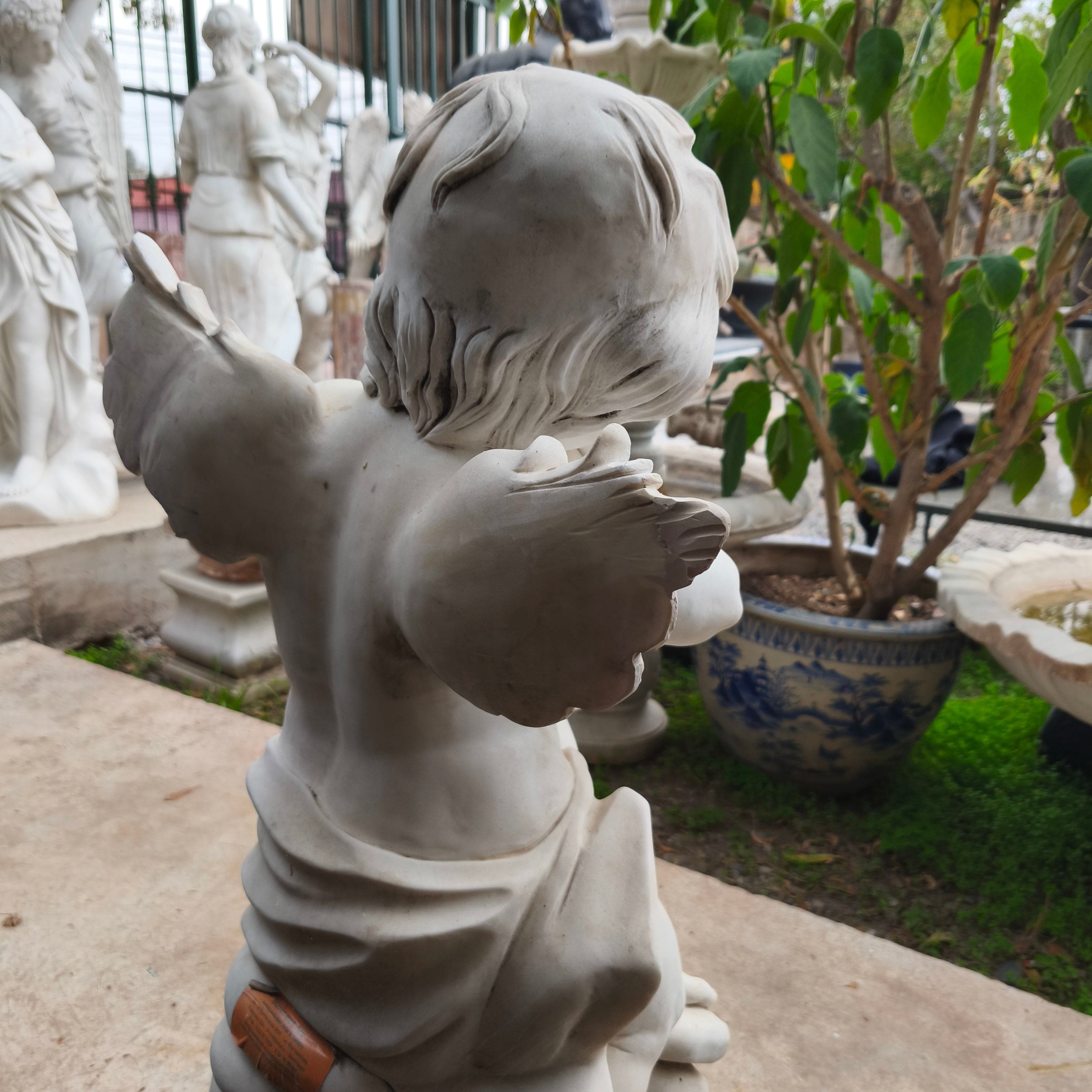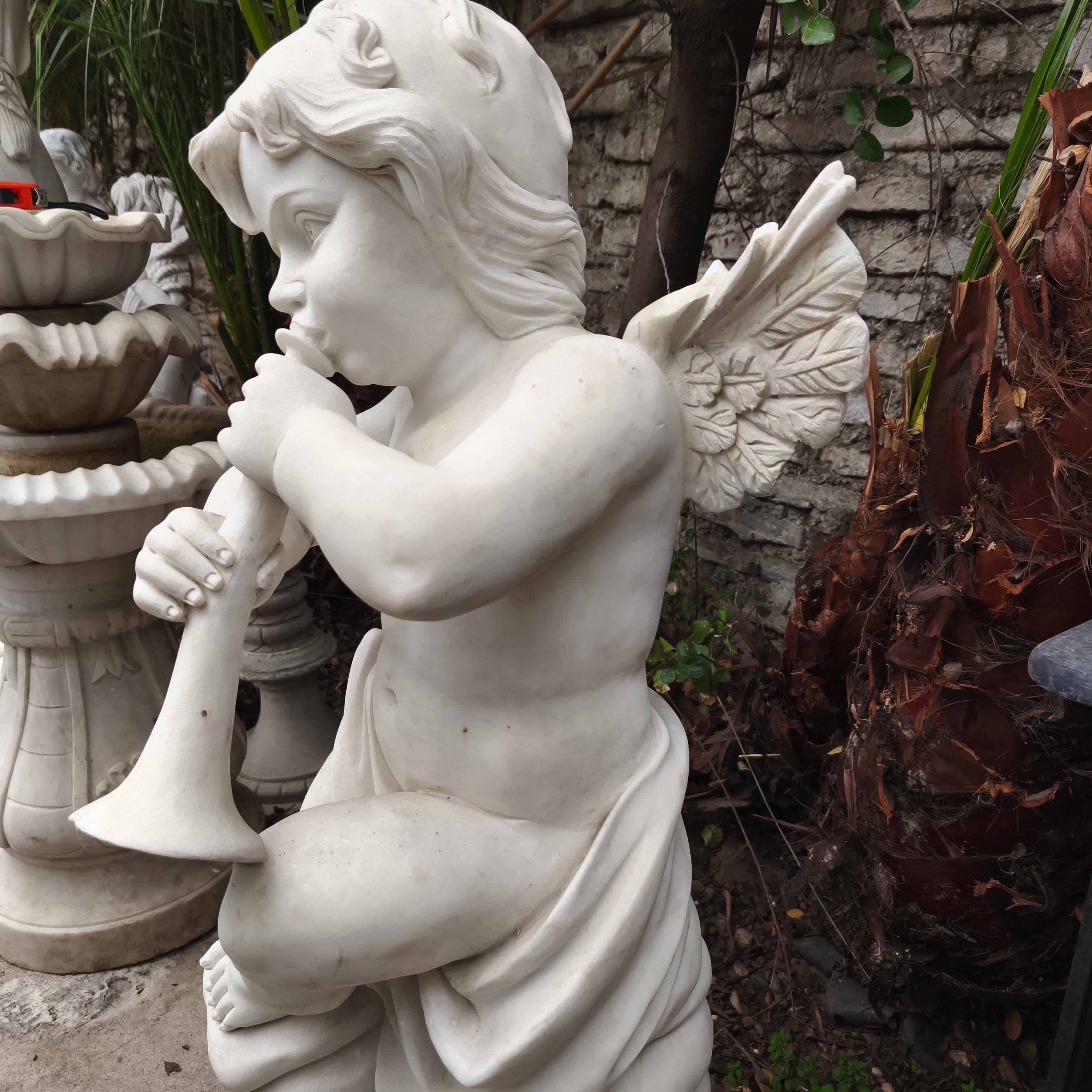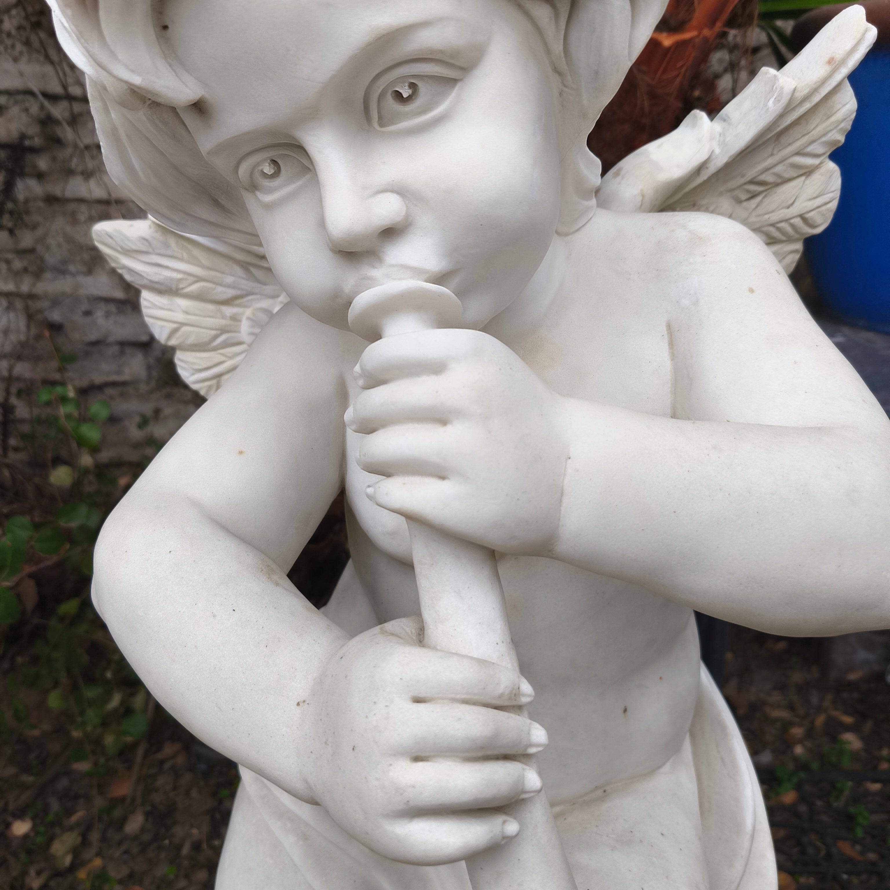 Bella escultura de pequeño ángel tocando la trompeta, de piedra de mármol esculpido y tallado.