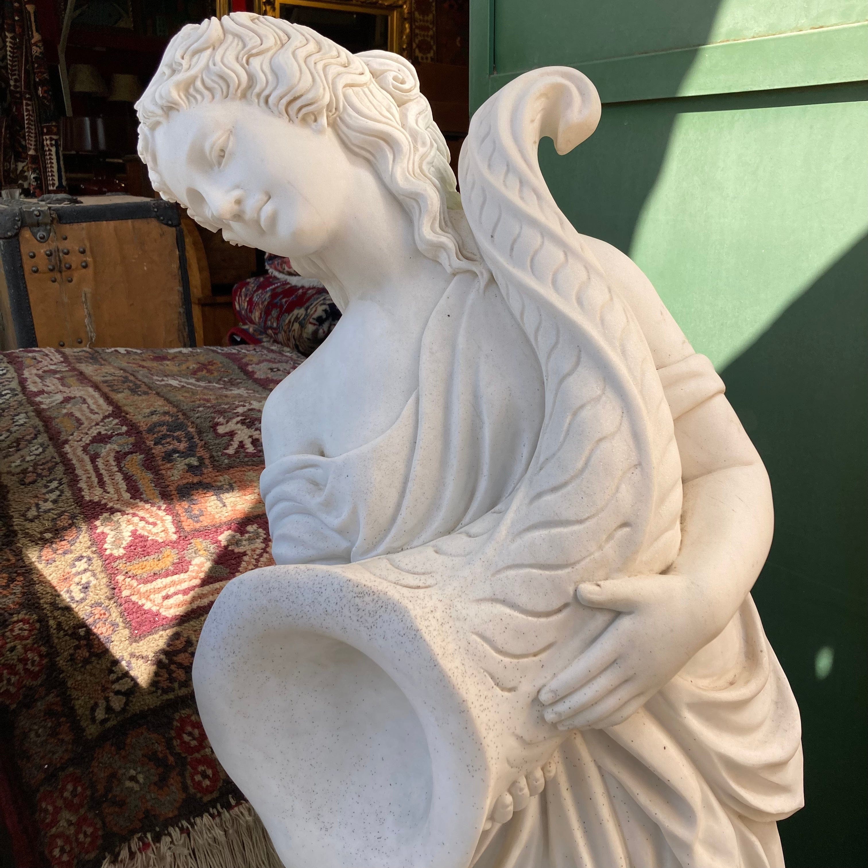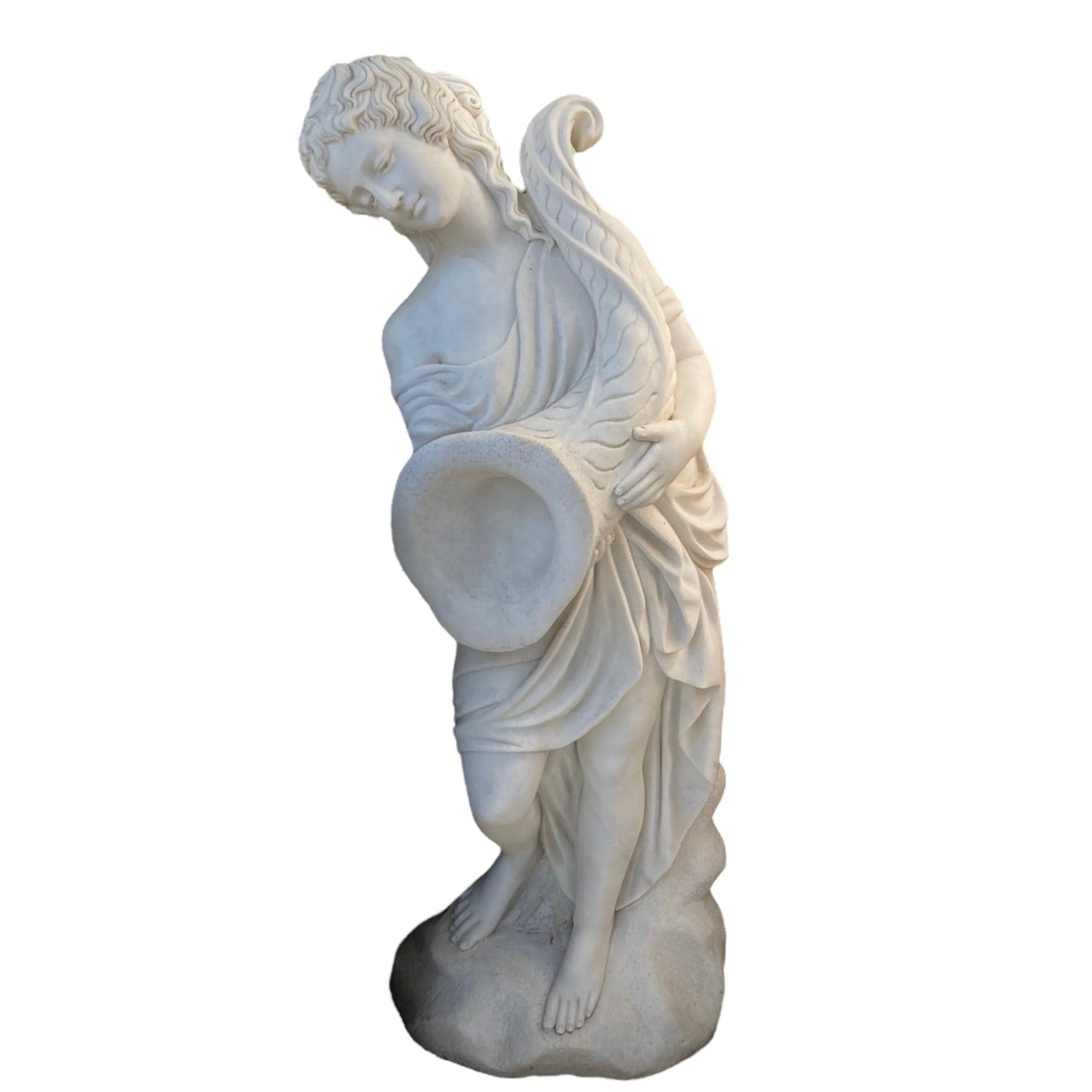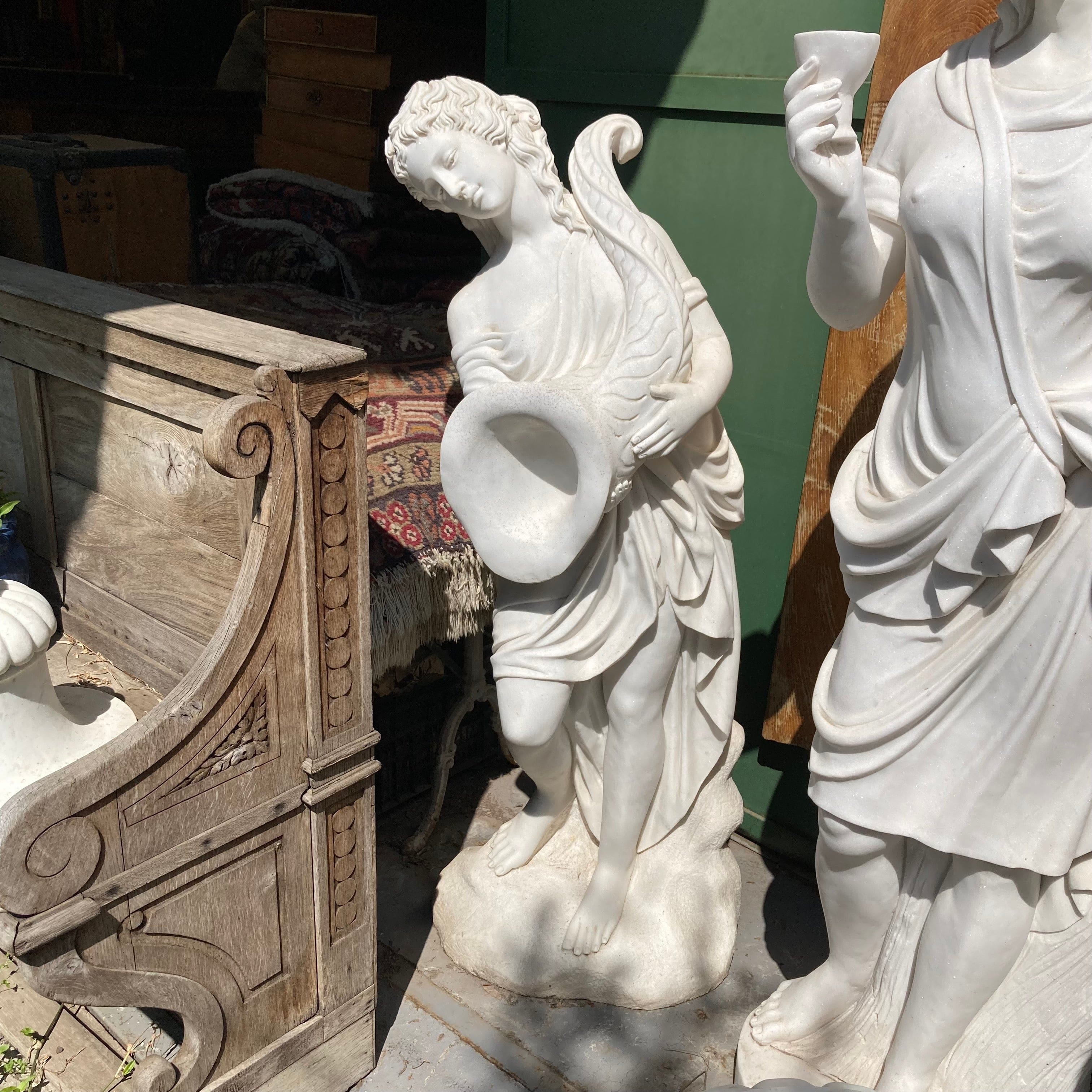 Escultura tallada en mármol de inspiración clásica, una mujer sostiene un cuerno de la abundancia en sus manos.