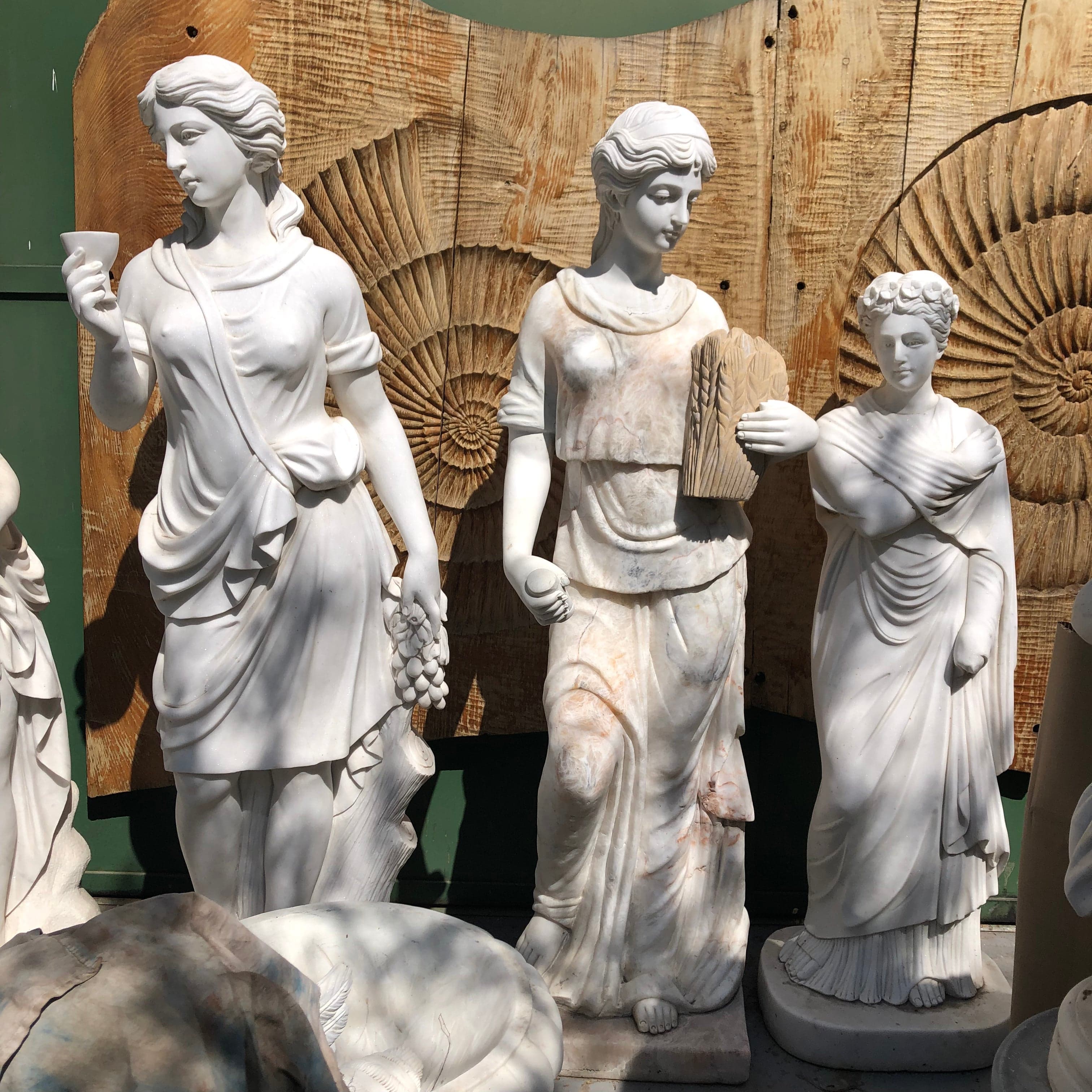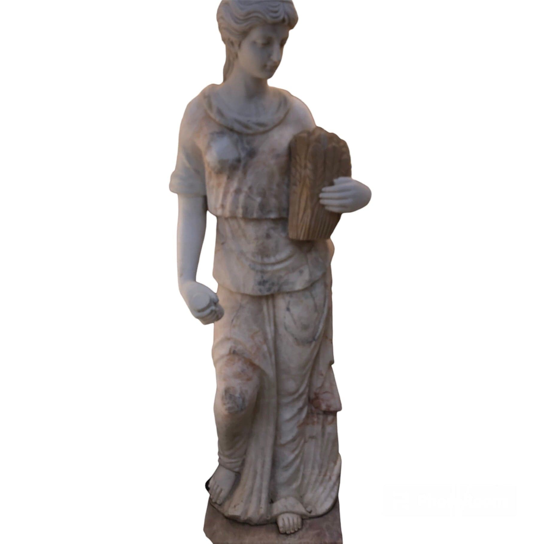 Escultura de mármol de una mujer trabajando con trigo, hecha en tres materiales diferentes, creando colores y texturas únicas.