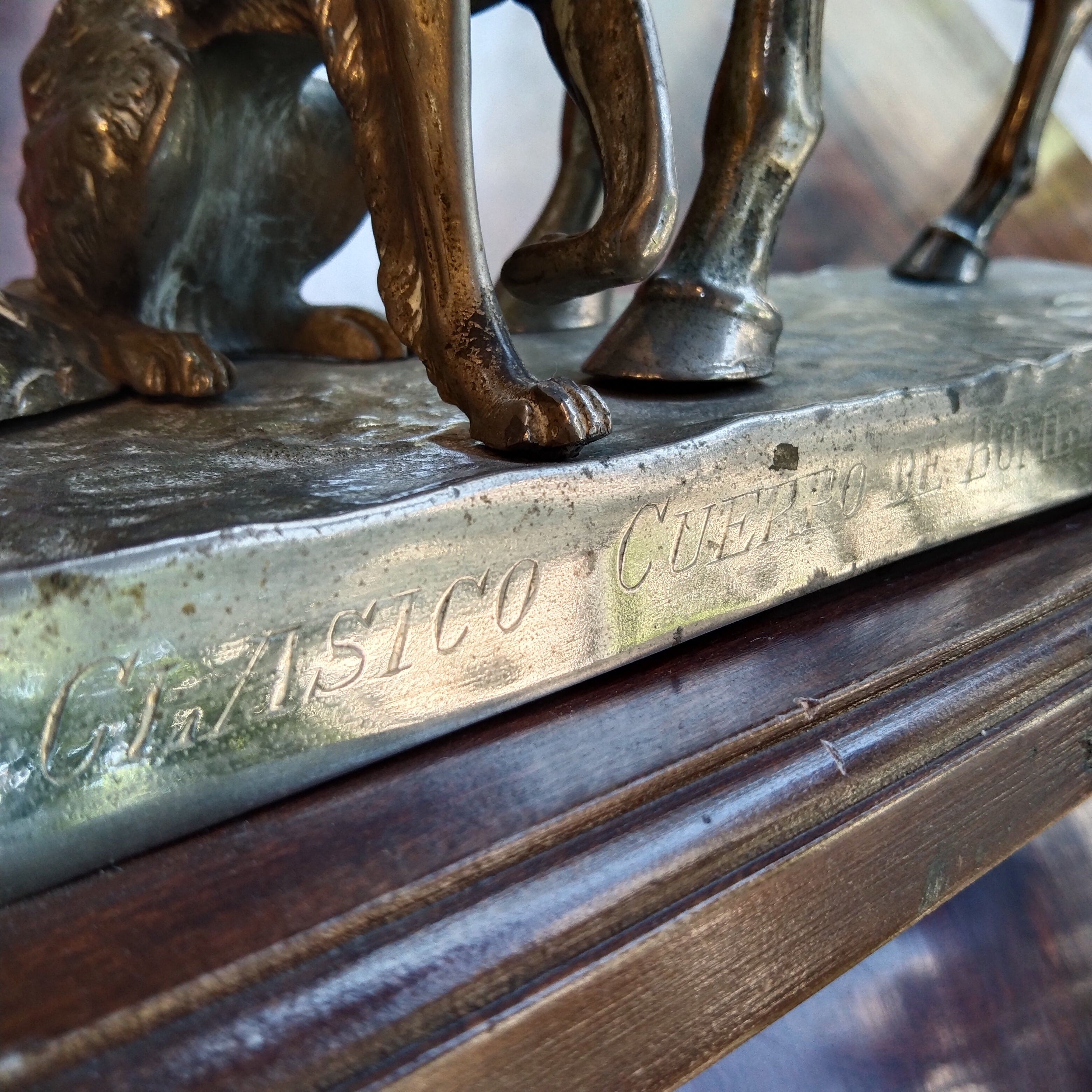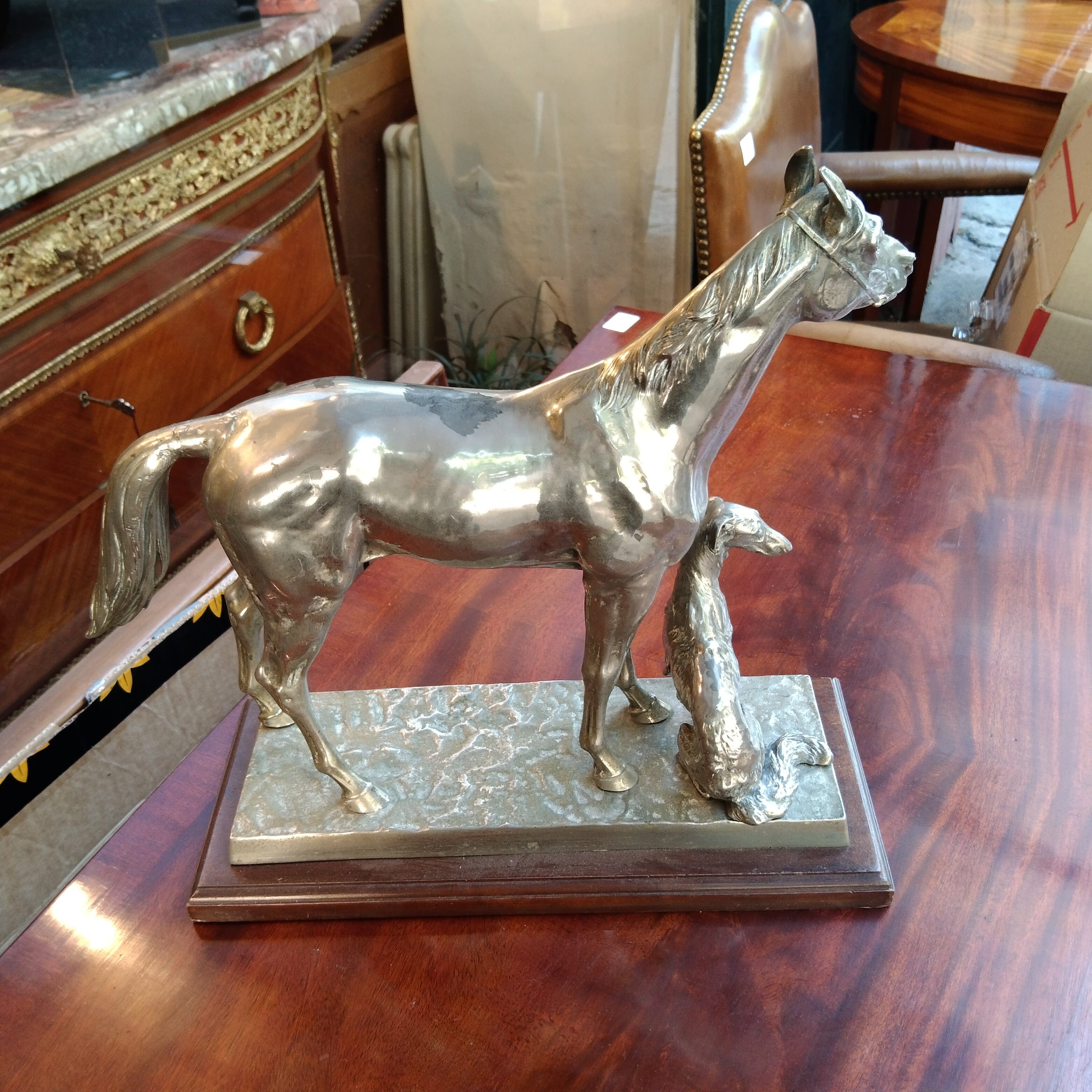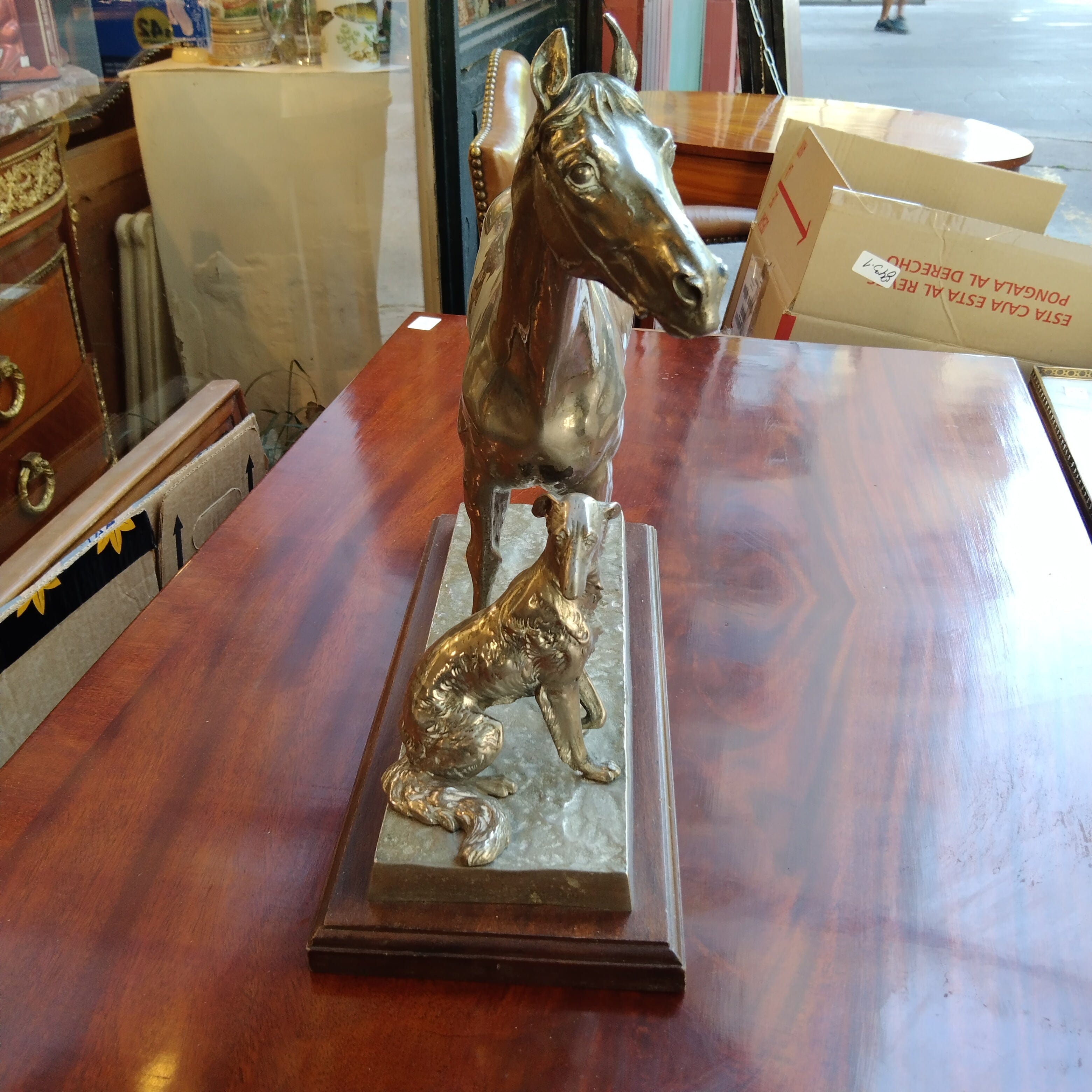 Bella figura de Peltre con base de madera, representando a un majestuoso caballo acompañado de un perro galgo. La figura tiene una inscripción correspondiente al Cuerpo de Bomberos de Punta Arenas y data del año 1938.