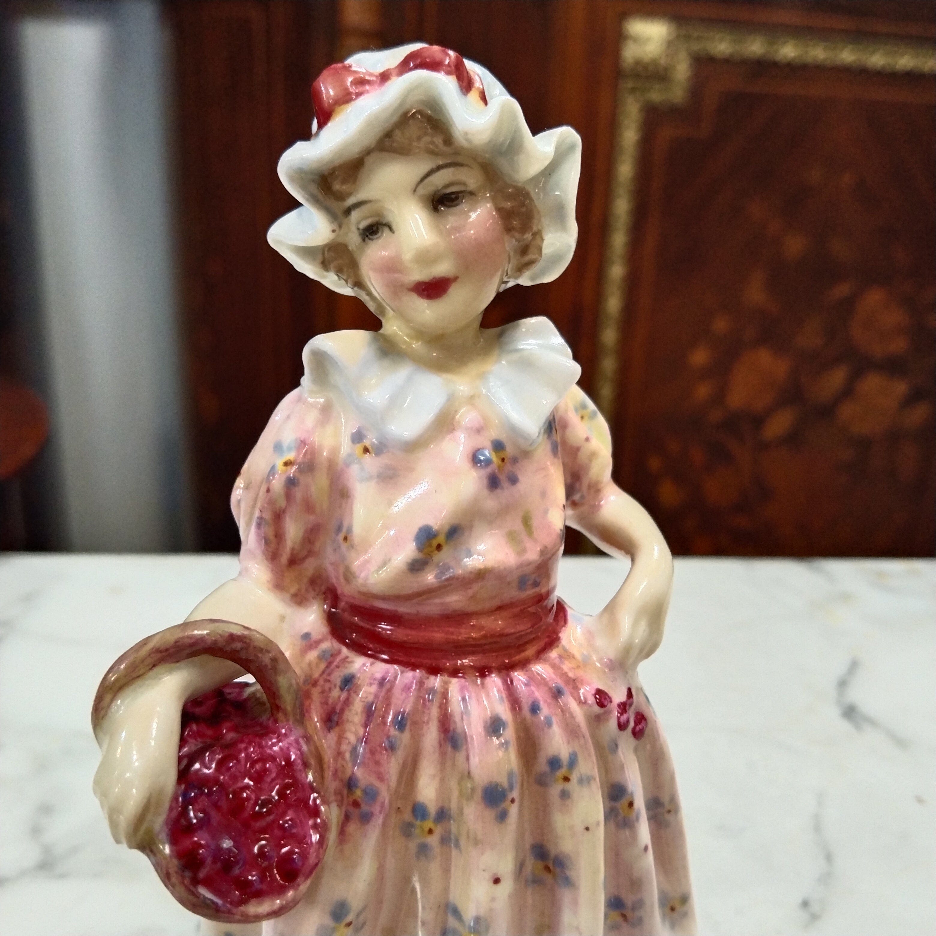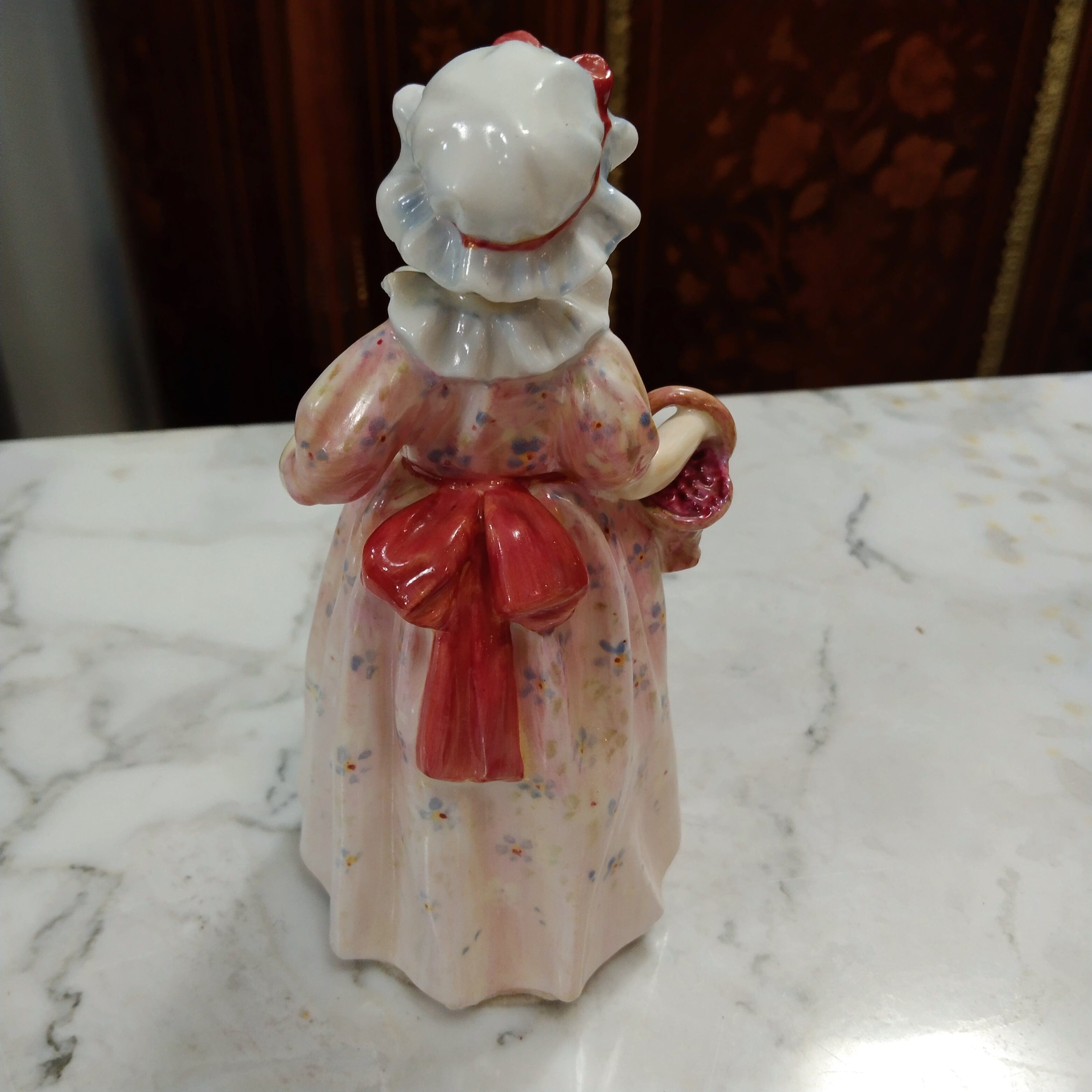 Linda figurita de porcelana inglesa de la marca Royal Doulton, llena de finos detalles pintados a mano. La figura representa a una niña campesina con un vestido floreado y una cesta con pétalos rojos bajo uno de sus brazos.