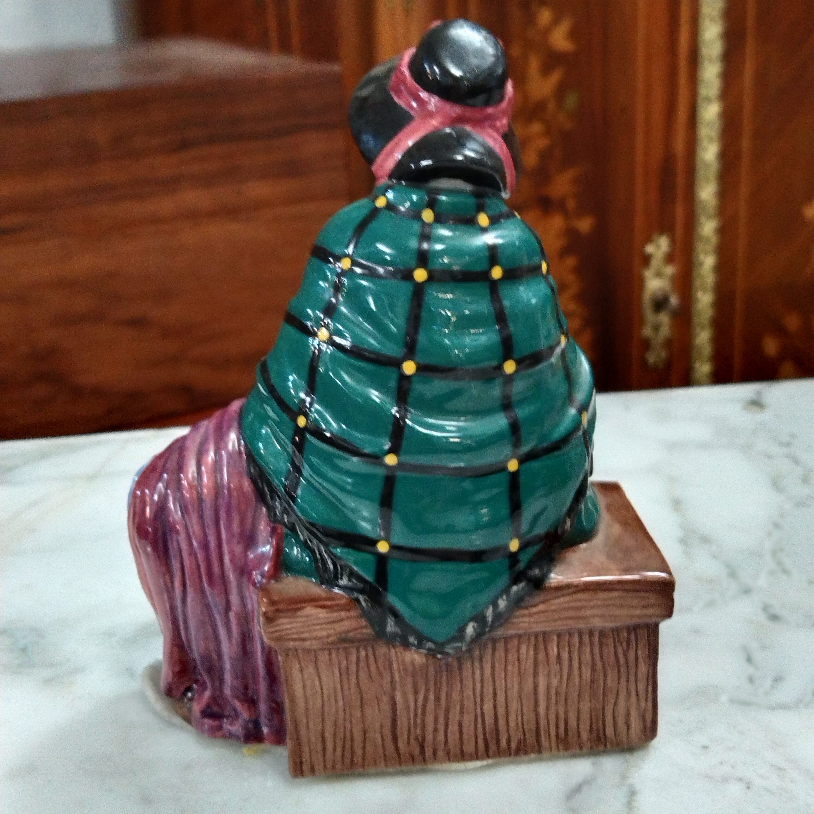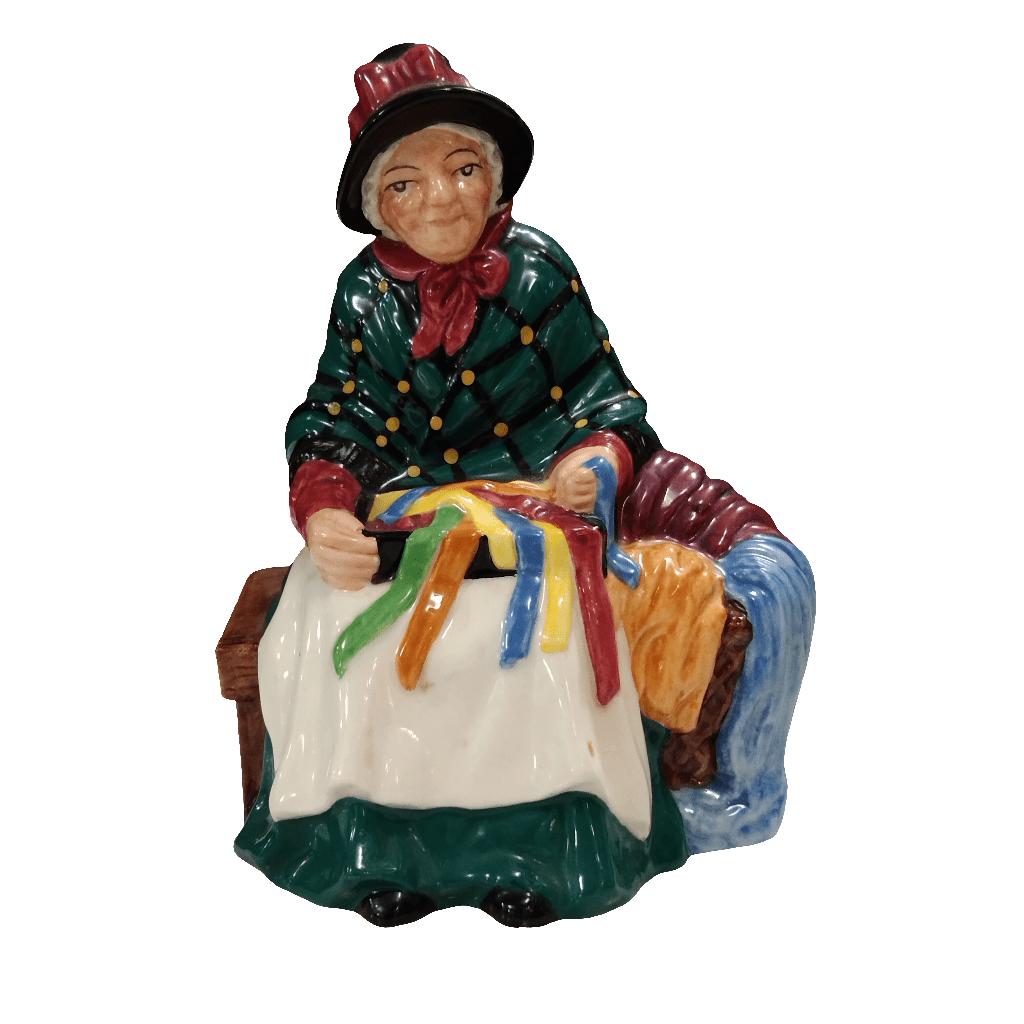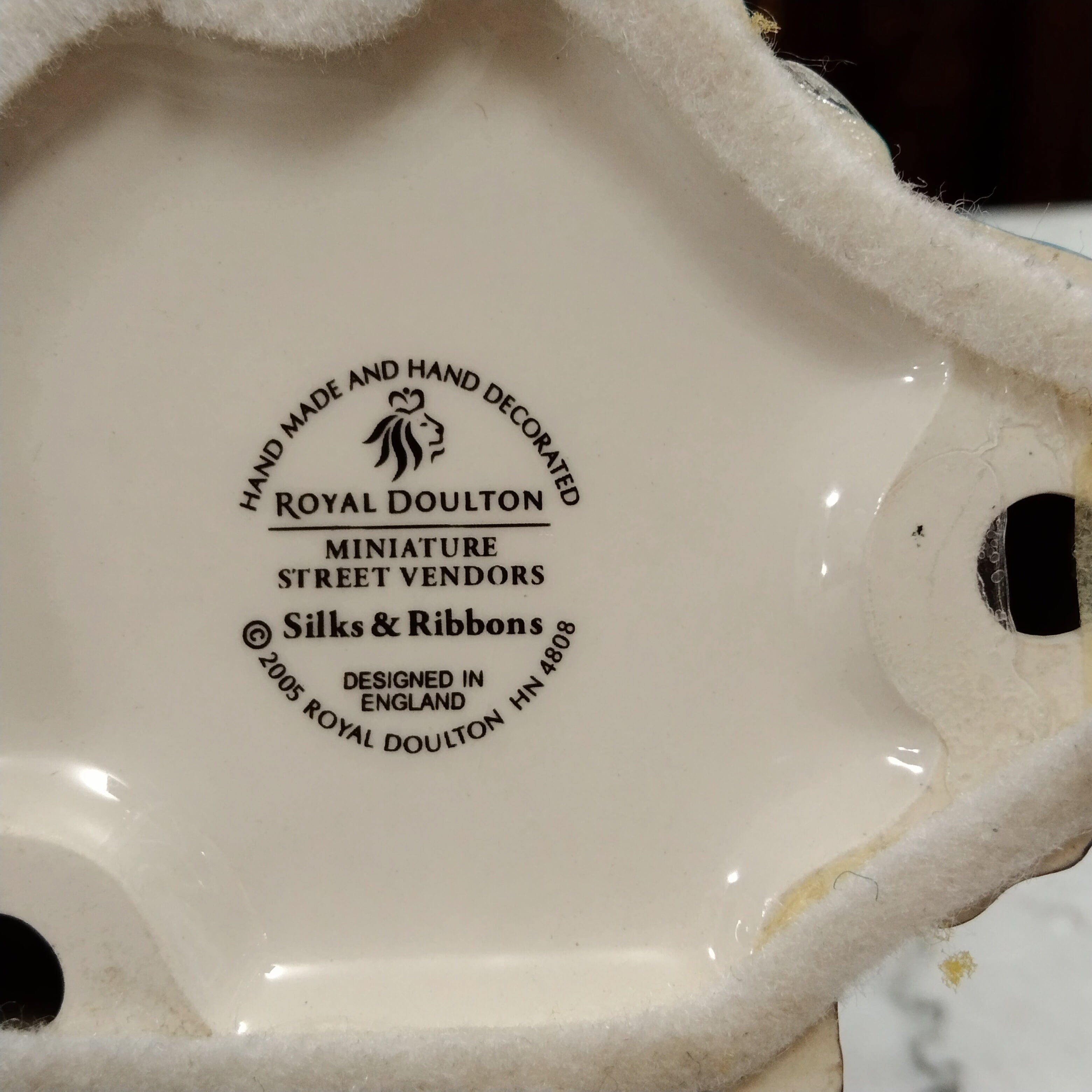 Bella figura de porcelana de la reconocida marca inglesa Royal Doulton, fabricado y pintado a mano en 2005. La figura corresponde a una edición de miniaturas hechas por la marca en base a antiguas figuras clásicas de la marca. La pieza representa a una vendedora de cintas y cordeles.