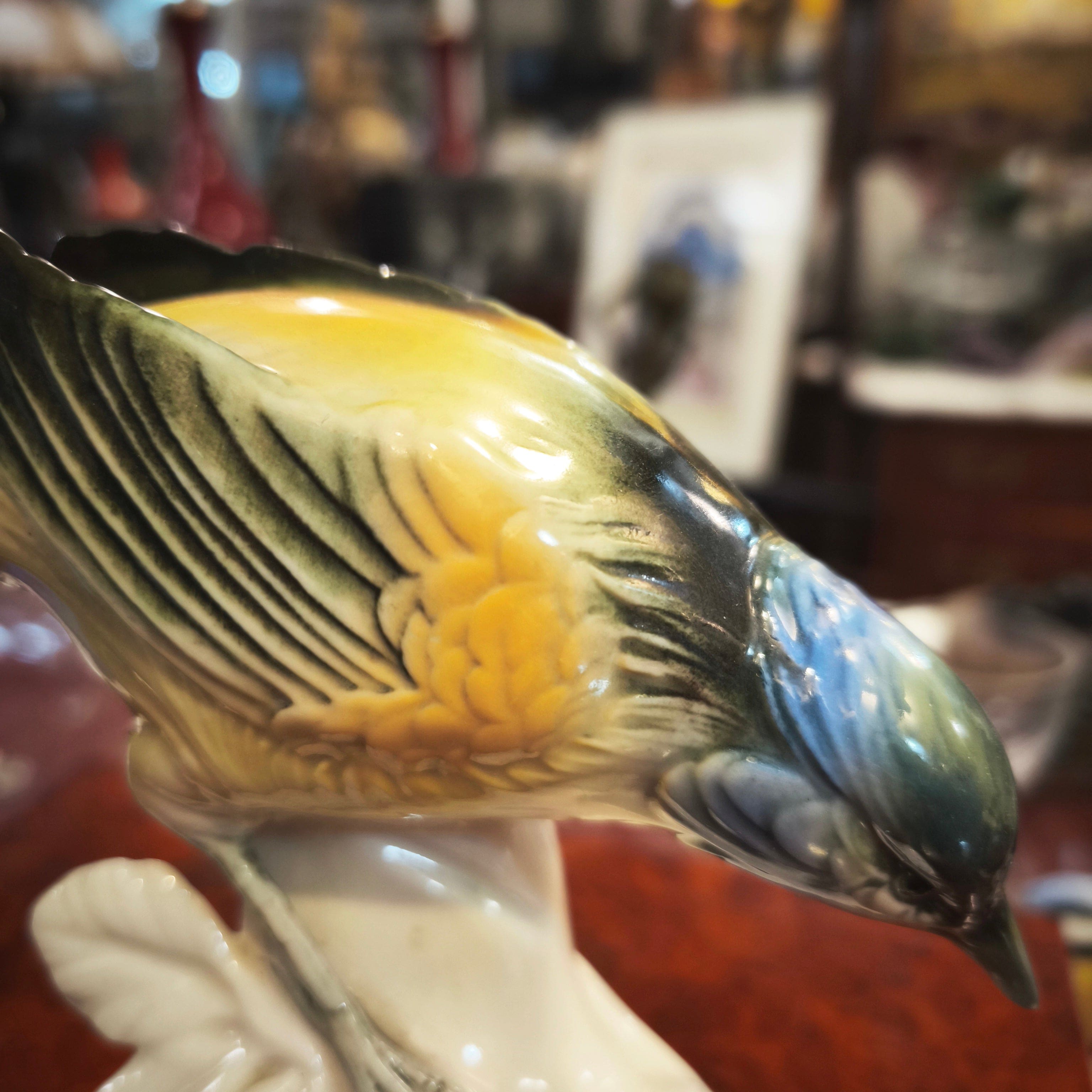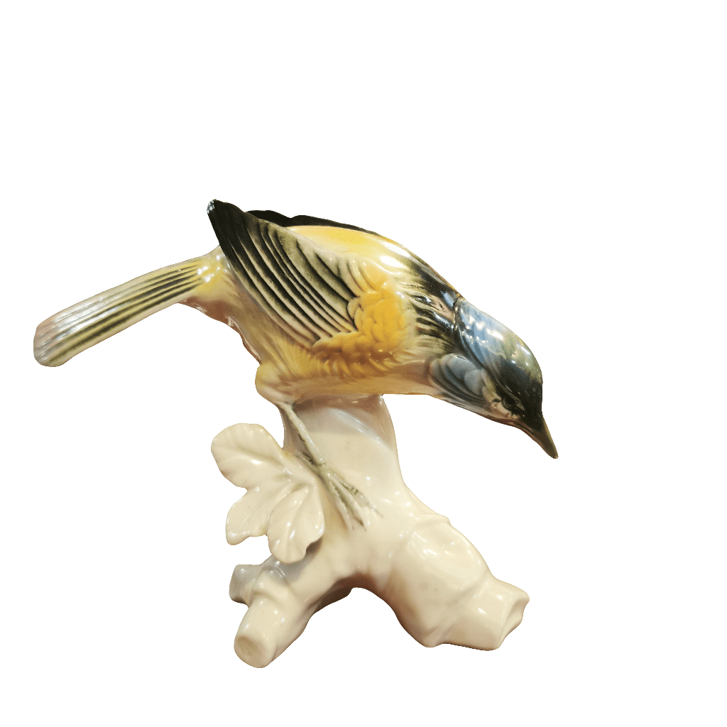 Bellísima figura hecha de porcelana de origen alemán, de la reconocida firma de porcelana Karl Ens, fundada a finales del siglo 19. La figura representa a un pajarito con coloridos plumajes, pintados delicadamente a mano, en amarillo, azul, verde, blanco y negro. El ave está parada sobre una rama, también de porcelana blanca, y está mirando hacia abajo, como si estuviera en una rama de gran altura.