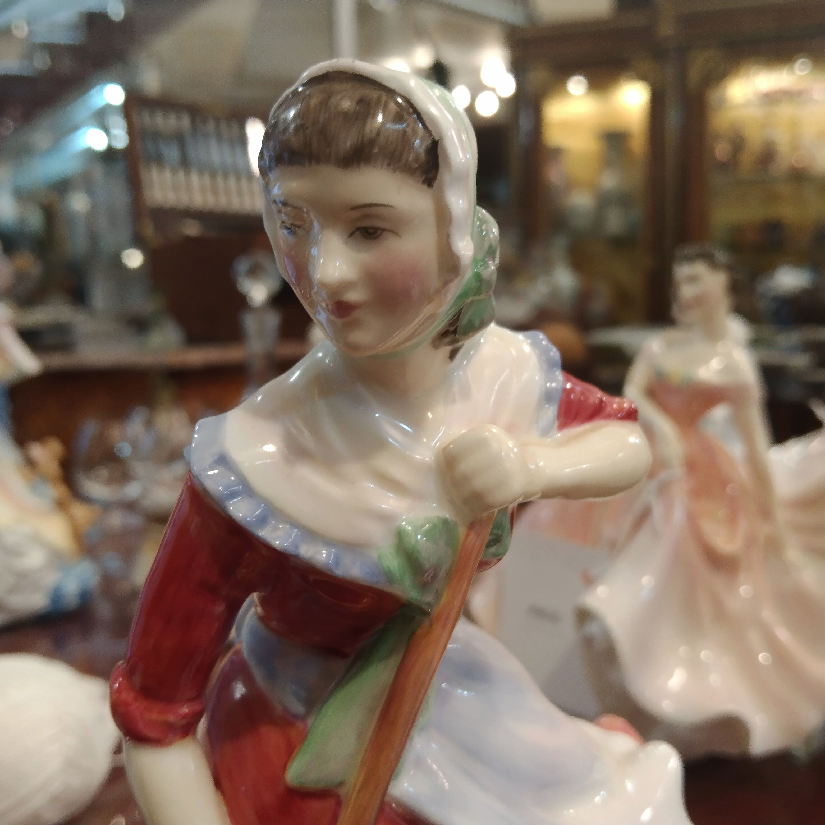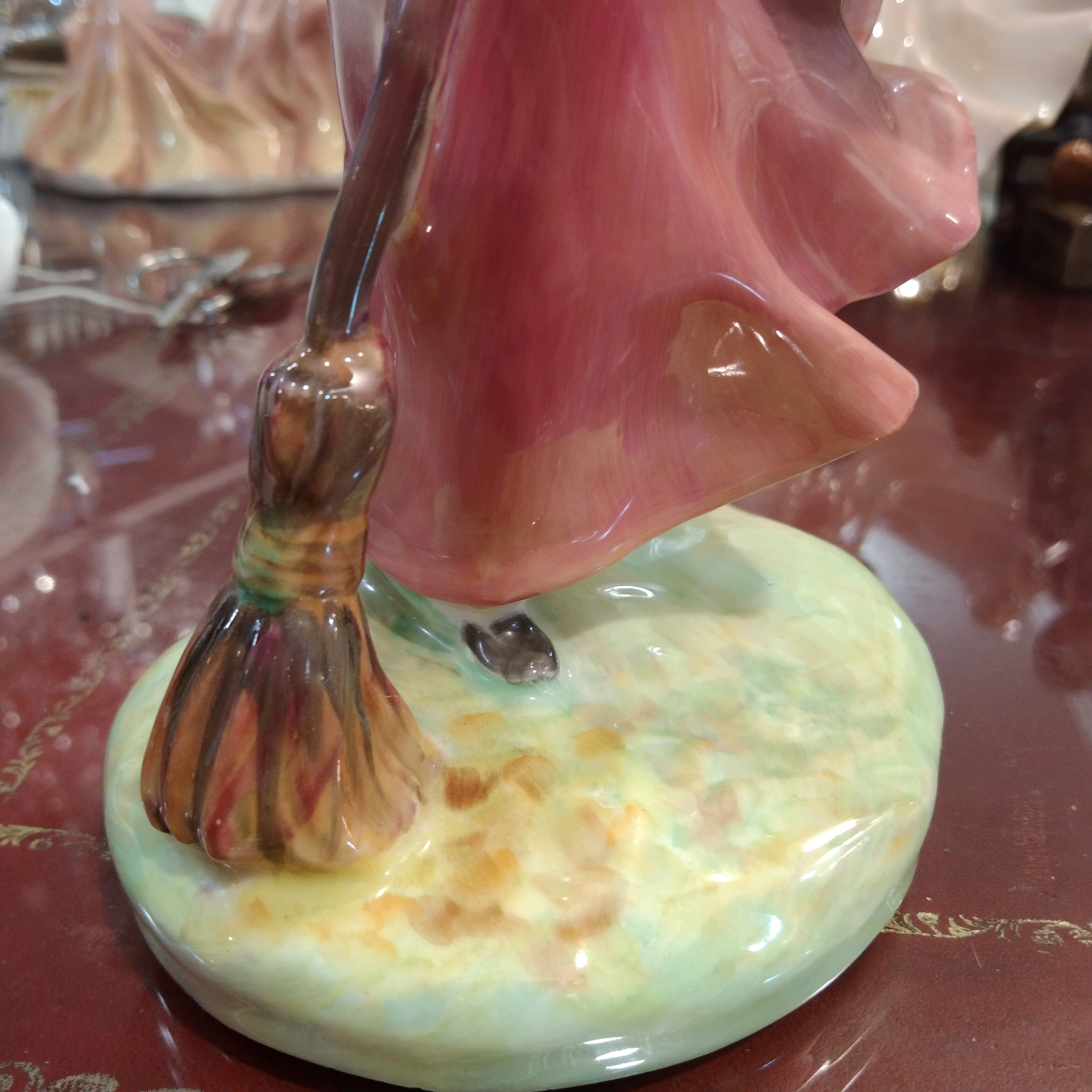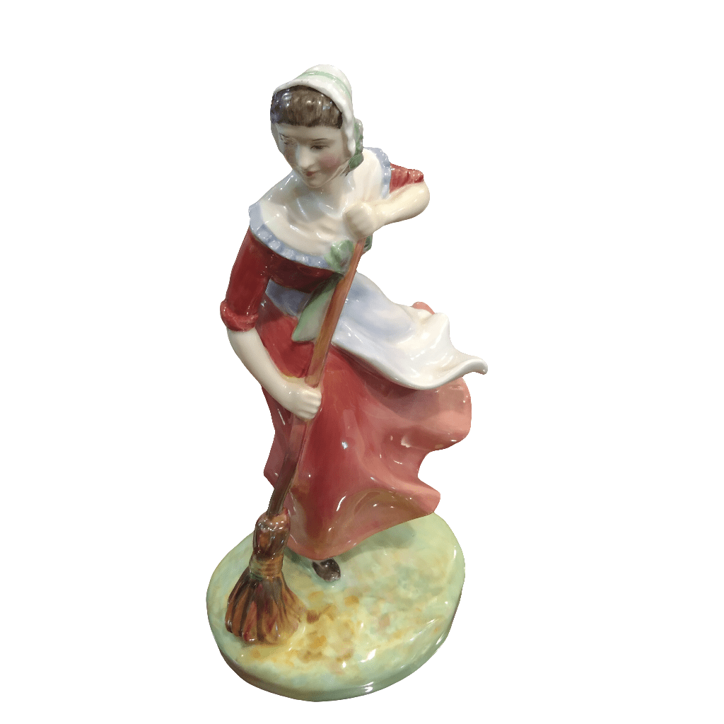 Linda figura de porcelana antigua de la marca inglesa Royal Doulton, fabricada y pintada a mano en 1951. La figura representa a una mujer campesina con una escoba, barriendo las hojas otoñales.