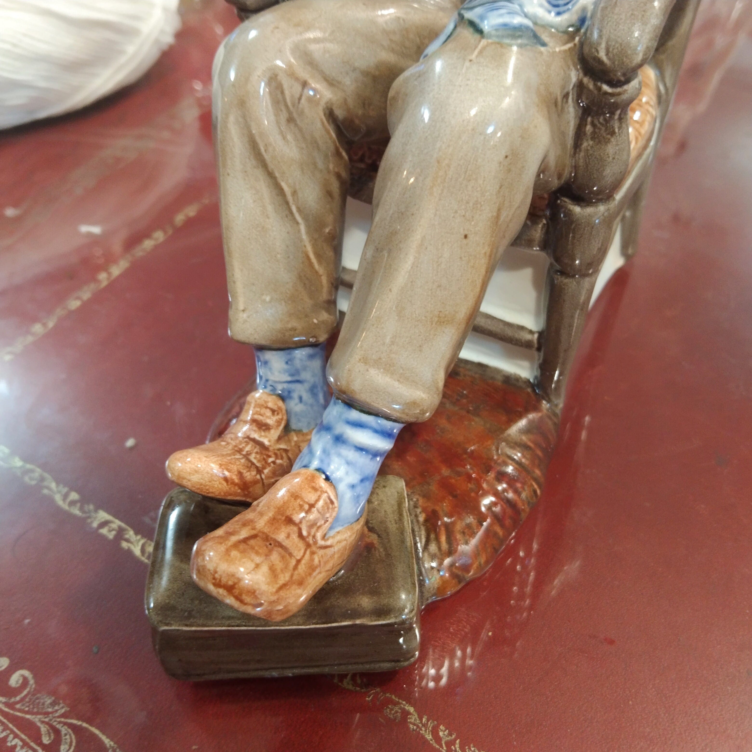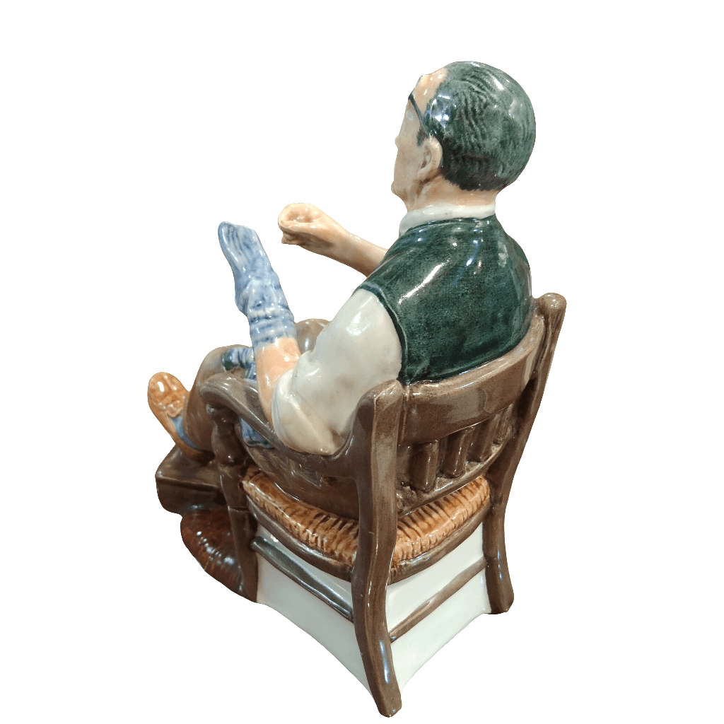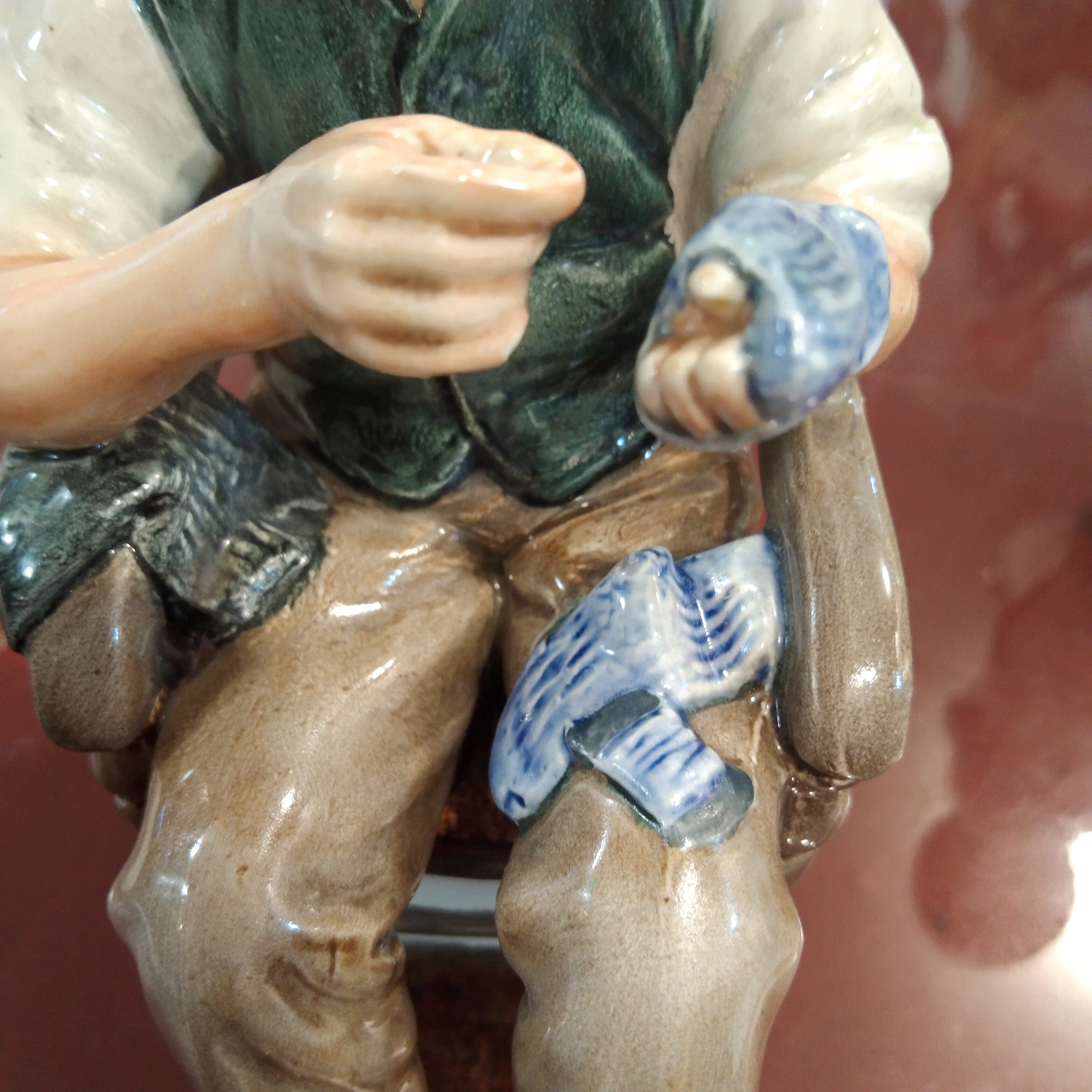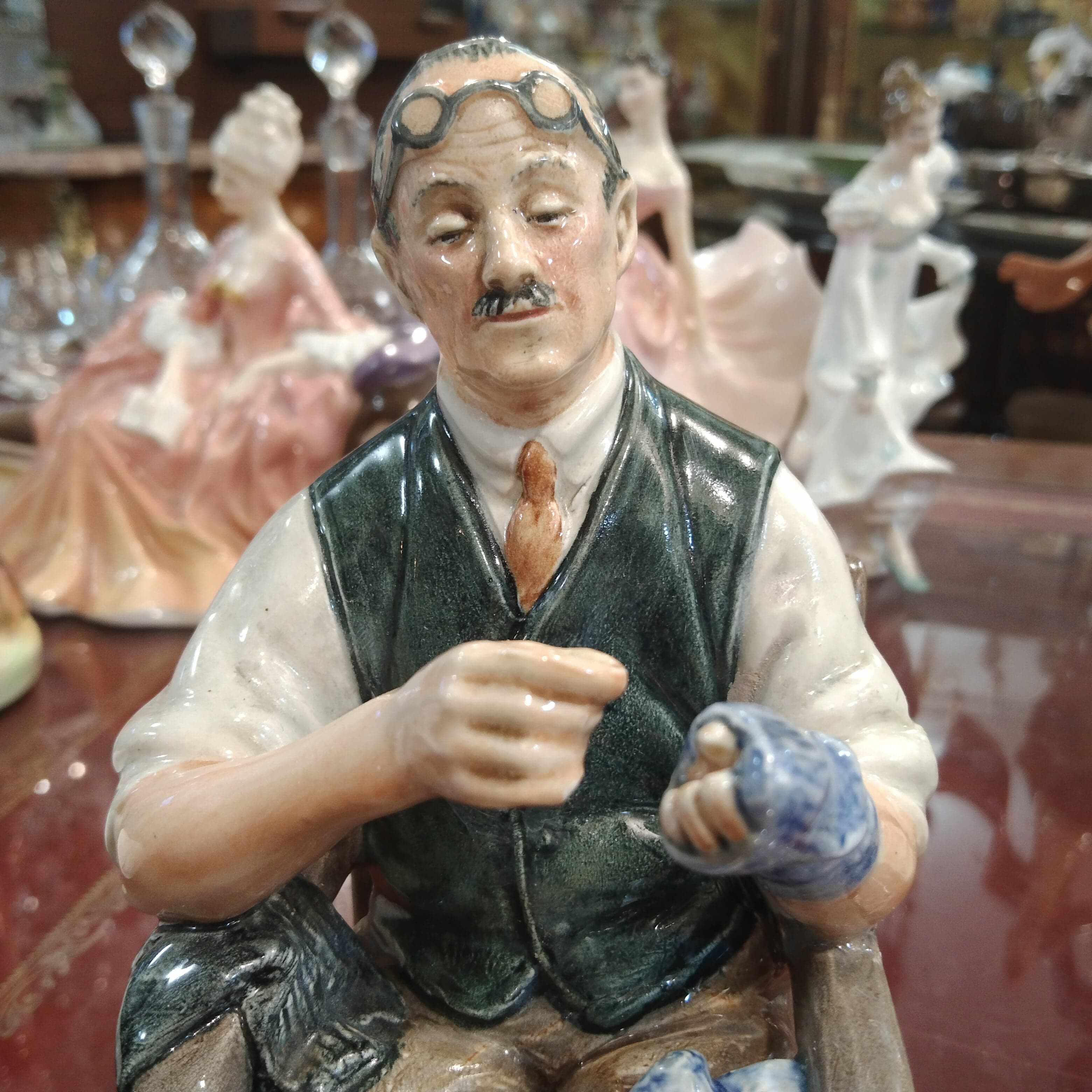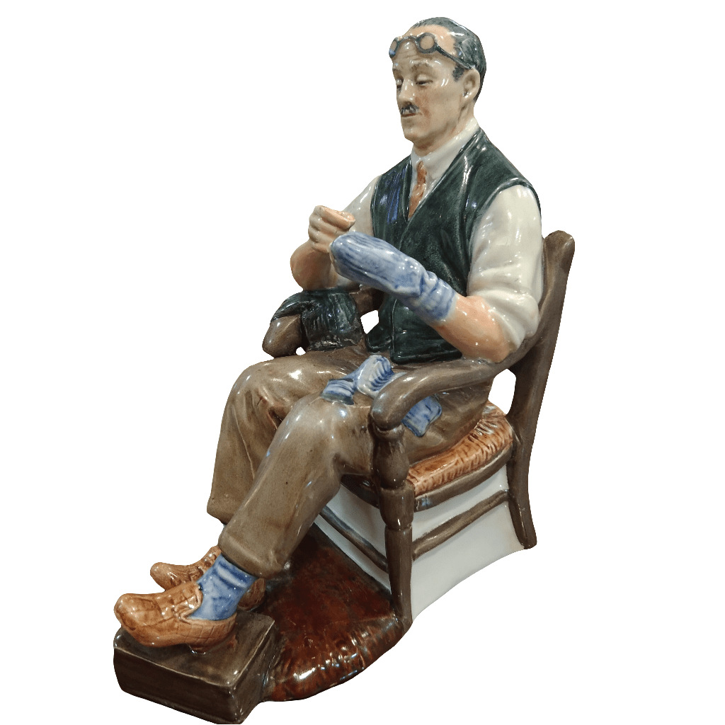 Linda figura de porcelana antigua de la marca inglesa Royal Doulton, fabricada y pintada a mano en 1963. La figura representa a una un hombre concentrado surciendo sus calcetines.