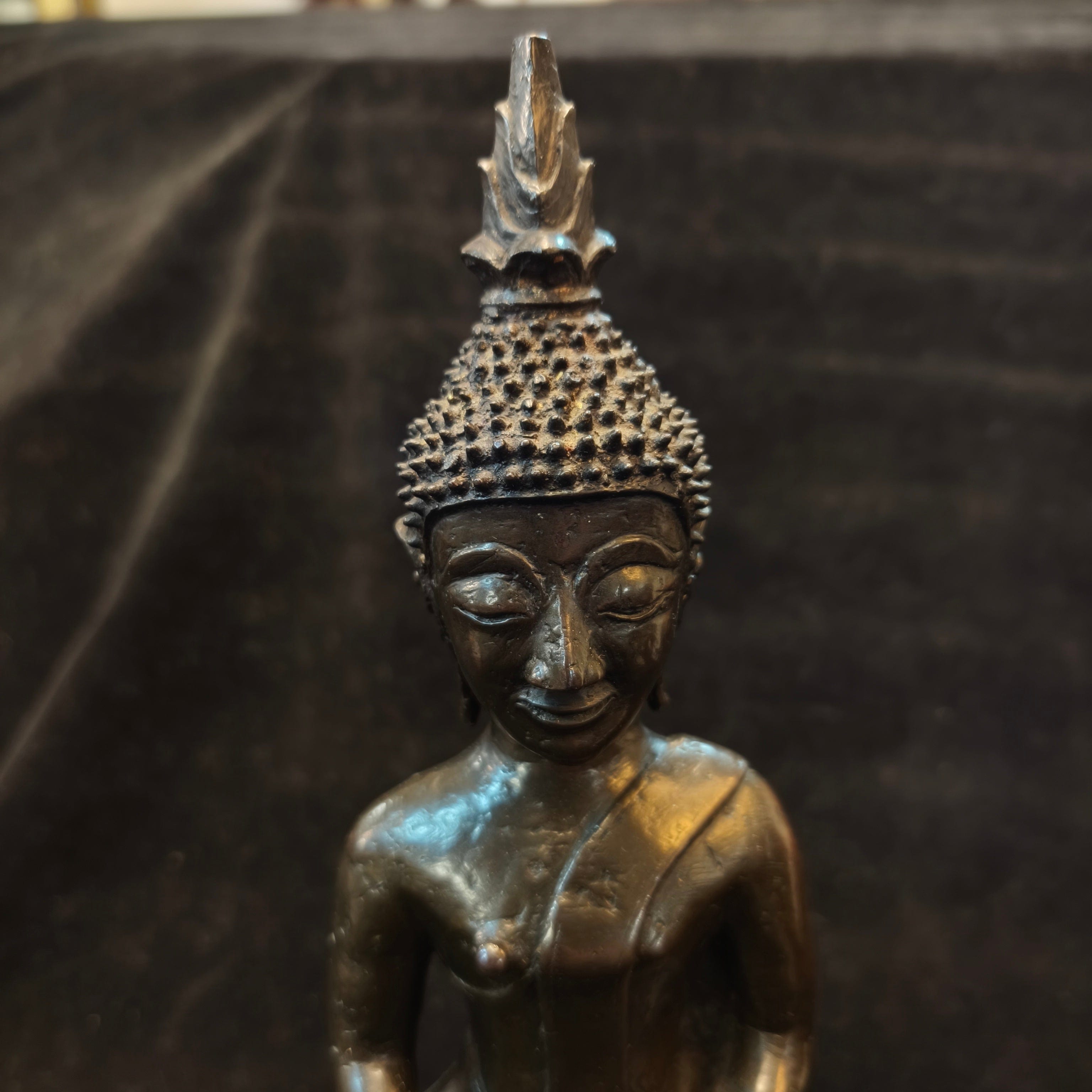 Bella figura tailandesa en bronce, representando a Buda en posición de loto, realizando un mudra sobre un gran pedestal.