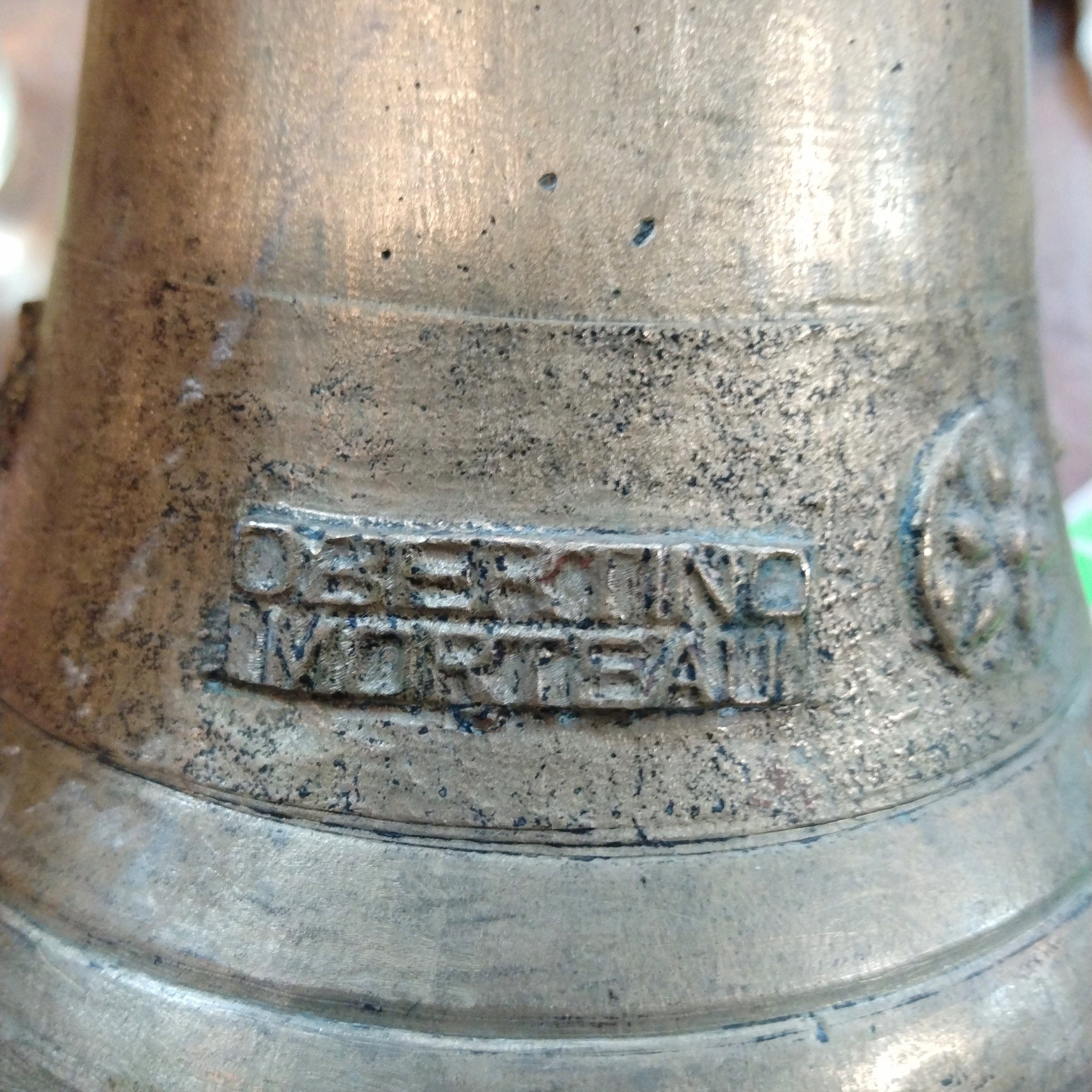Bellísima campana de bronce de gran tamaño, de la reconocida marca de campanas francesas Obertino Morteaux, con asa de fierro fundido y bellos relieves en su superficie.